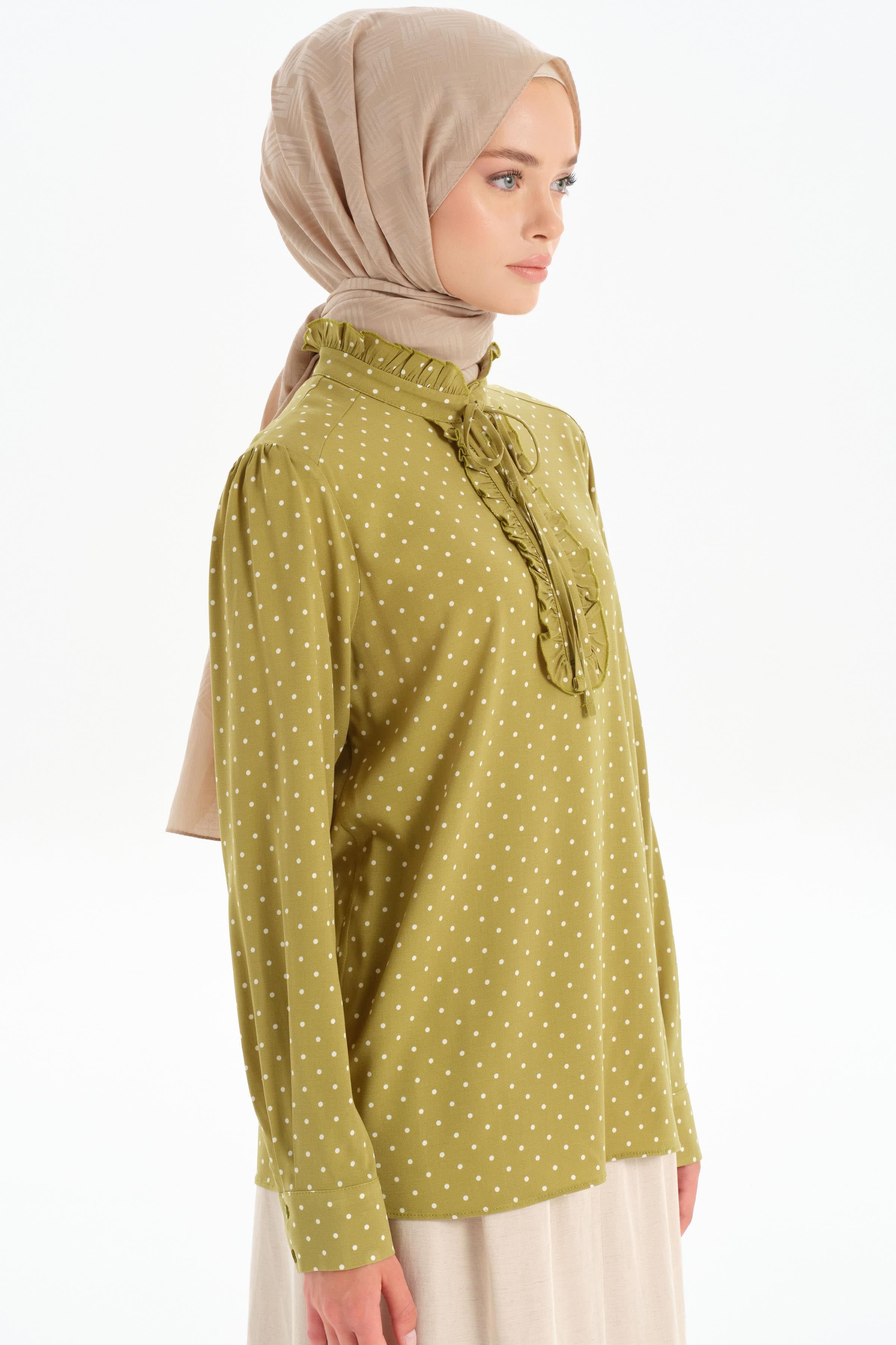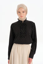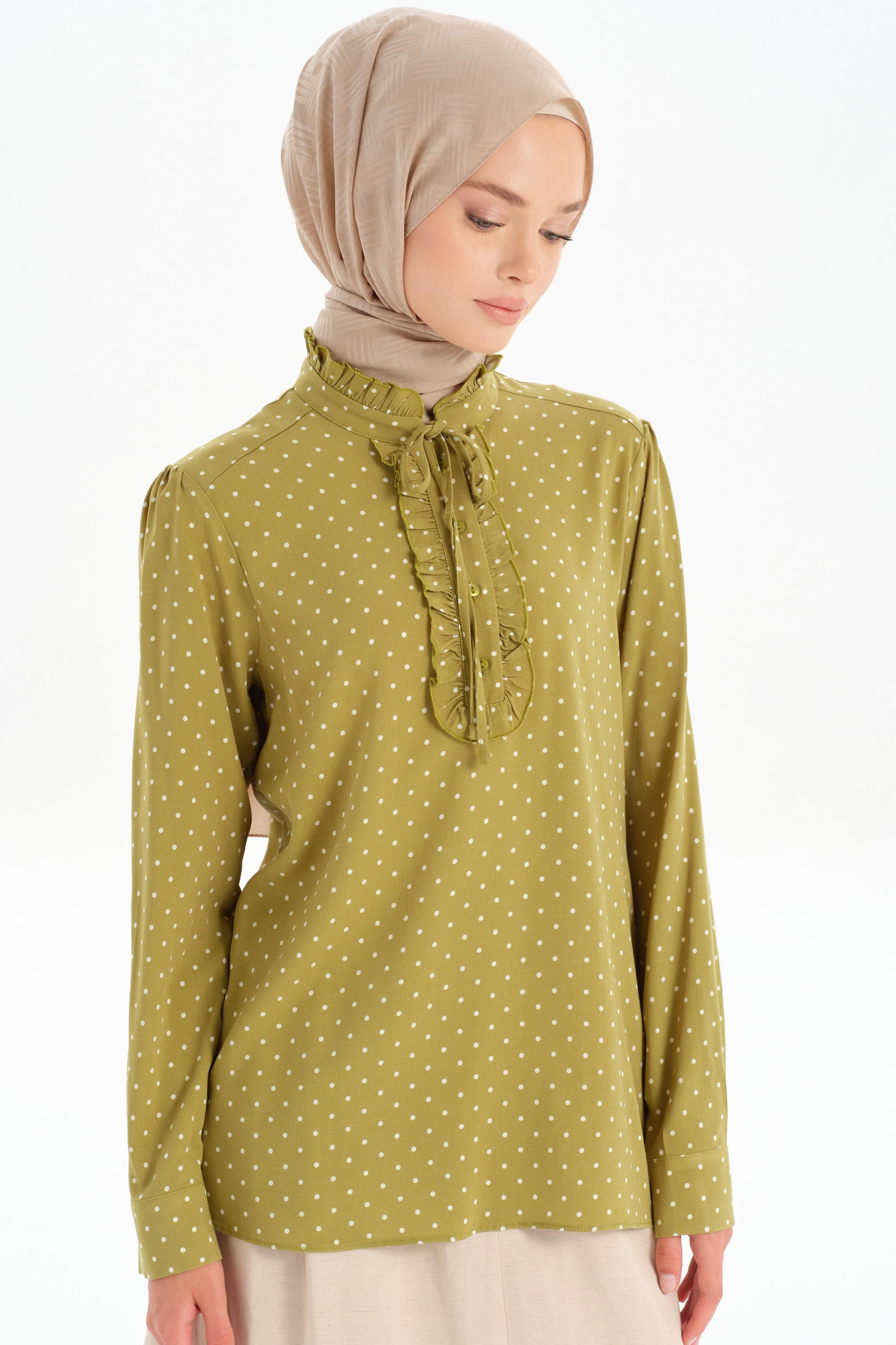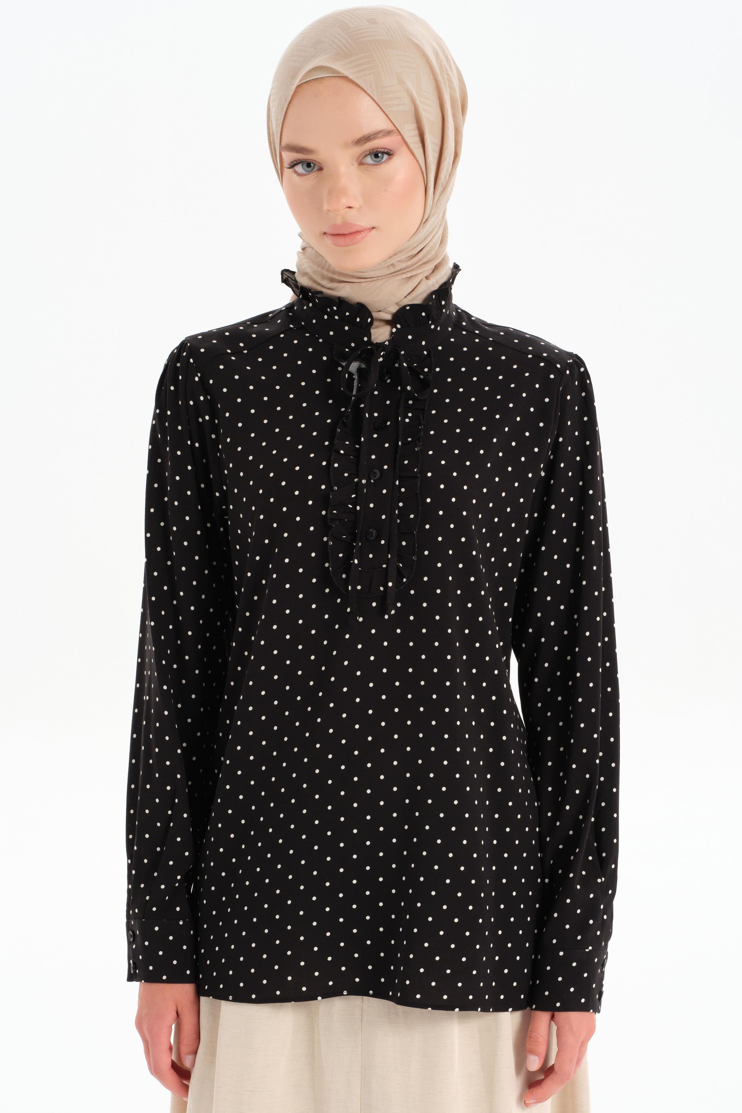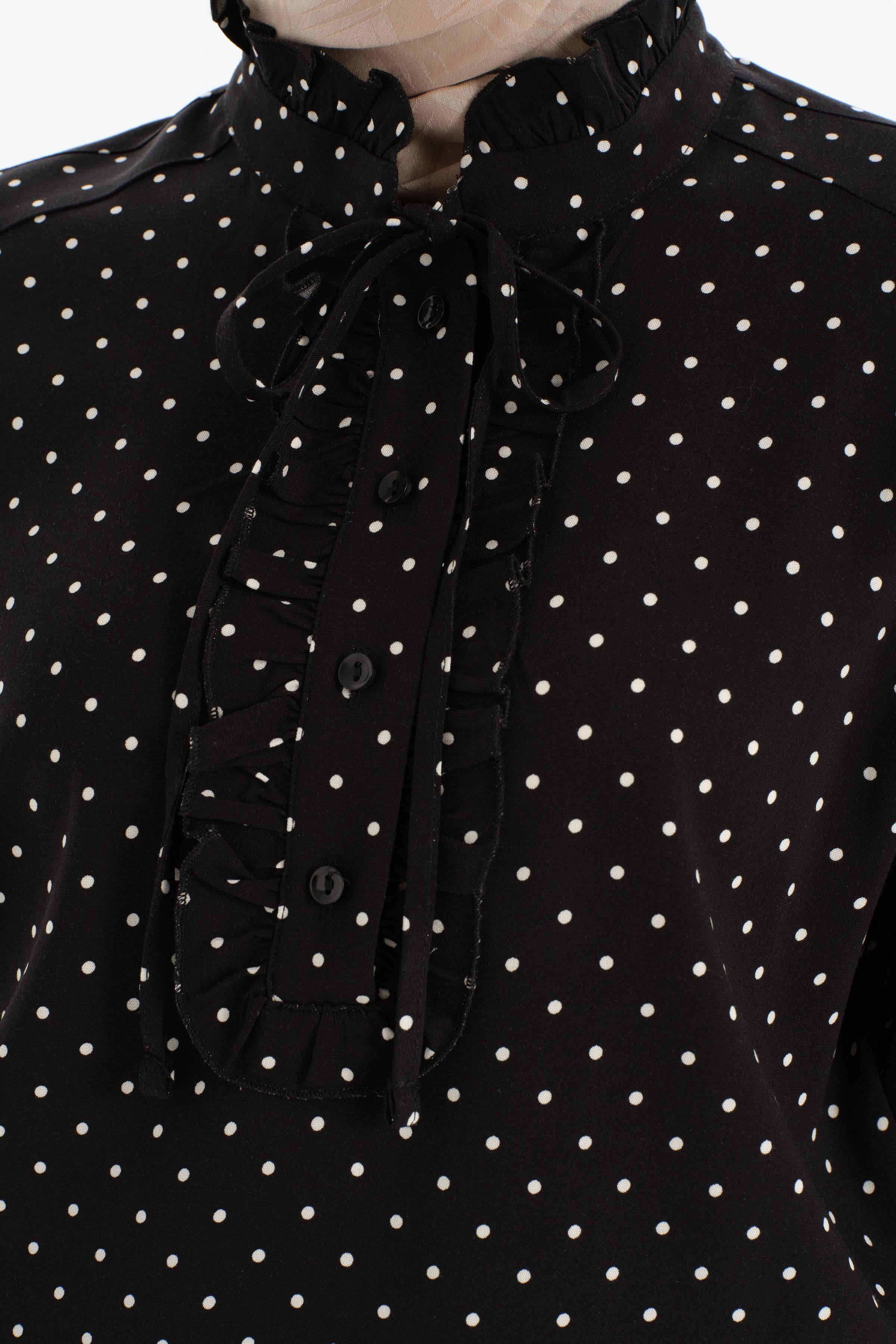 Ruffle details add a romantic touch to the blouse's overall style, while the polka dot pattern creates a modern and energetic look.