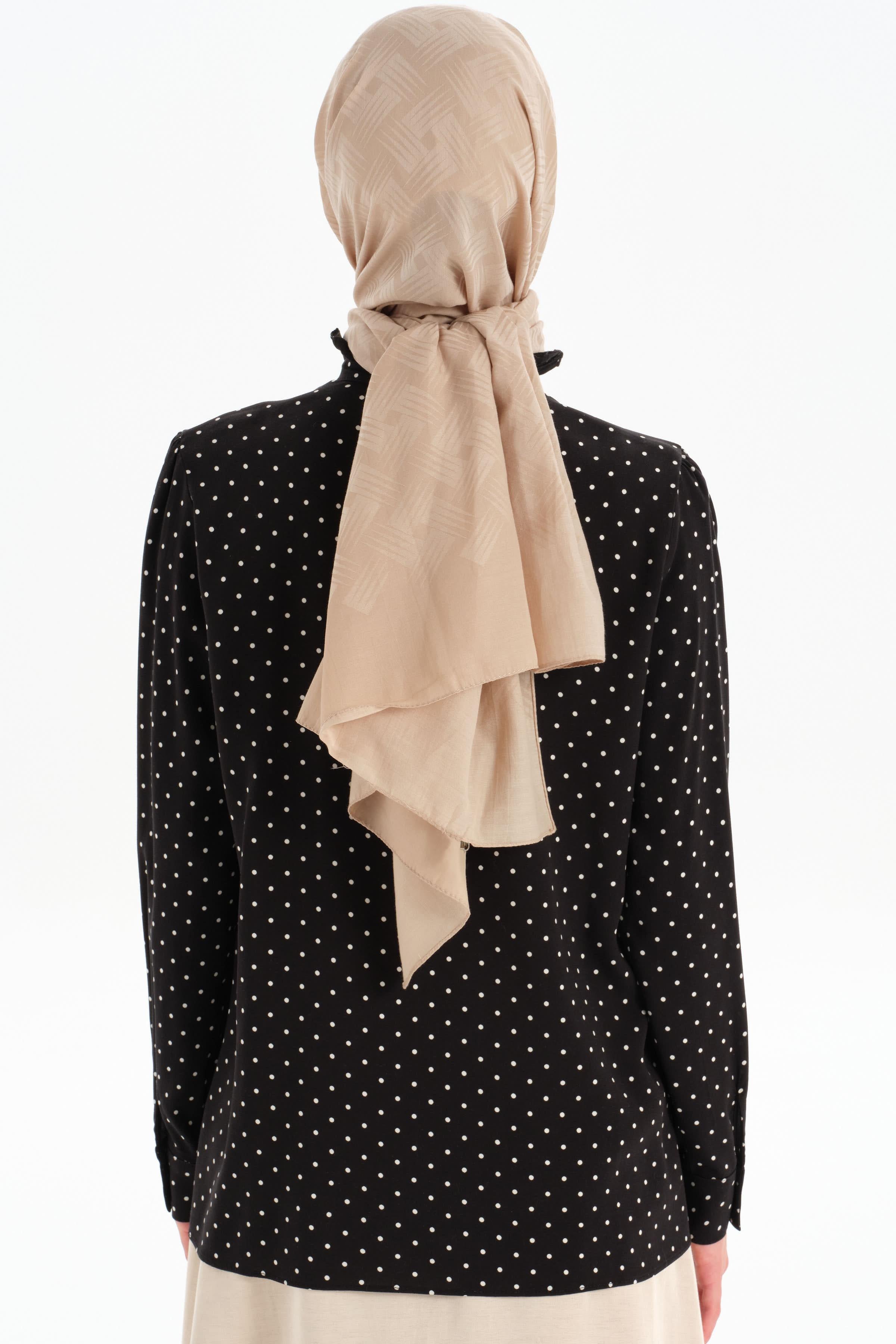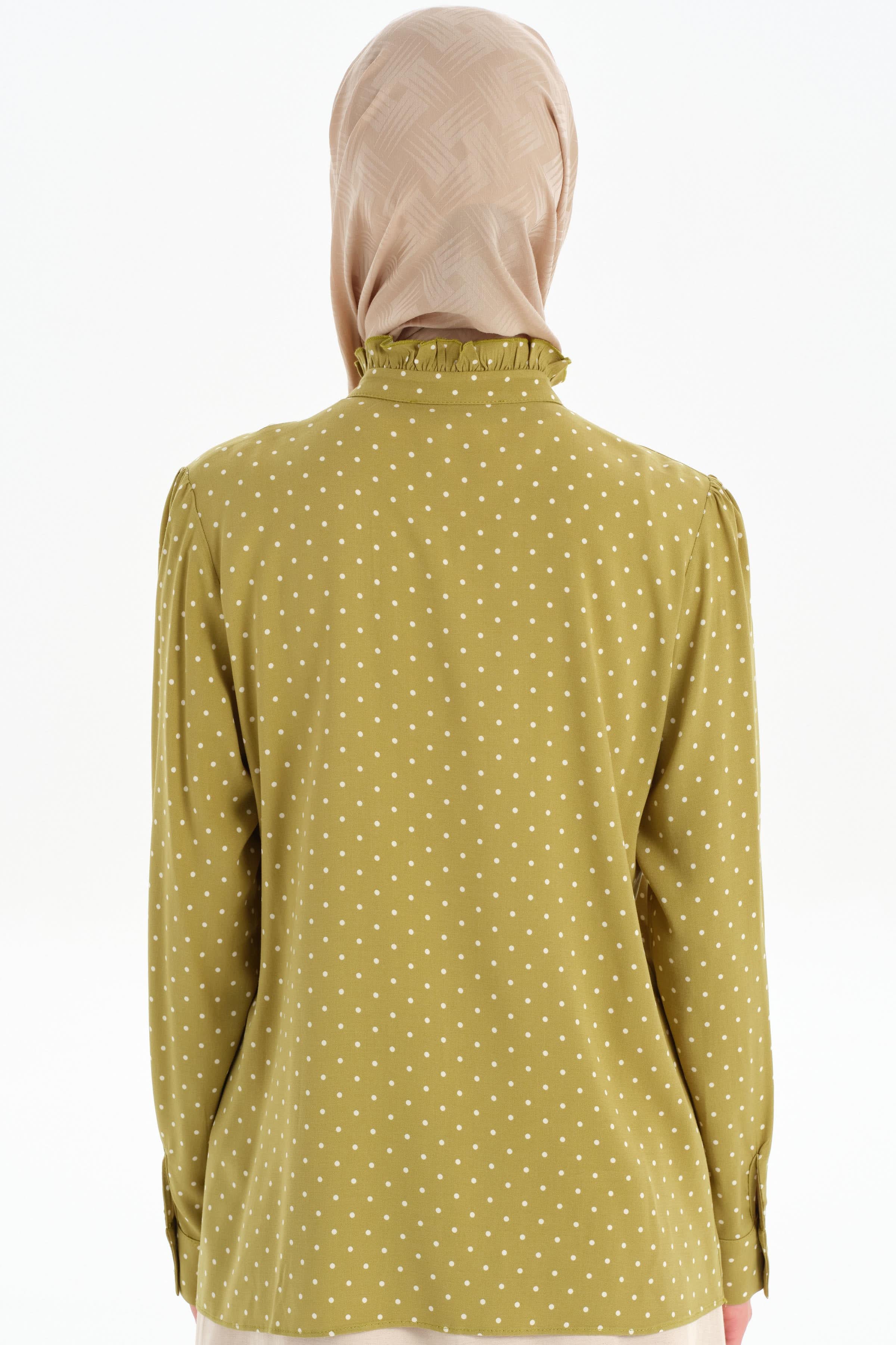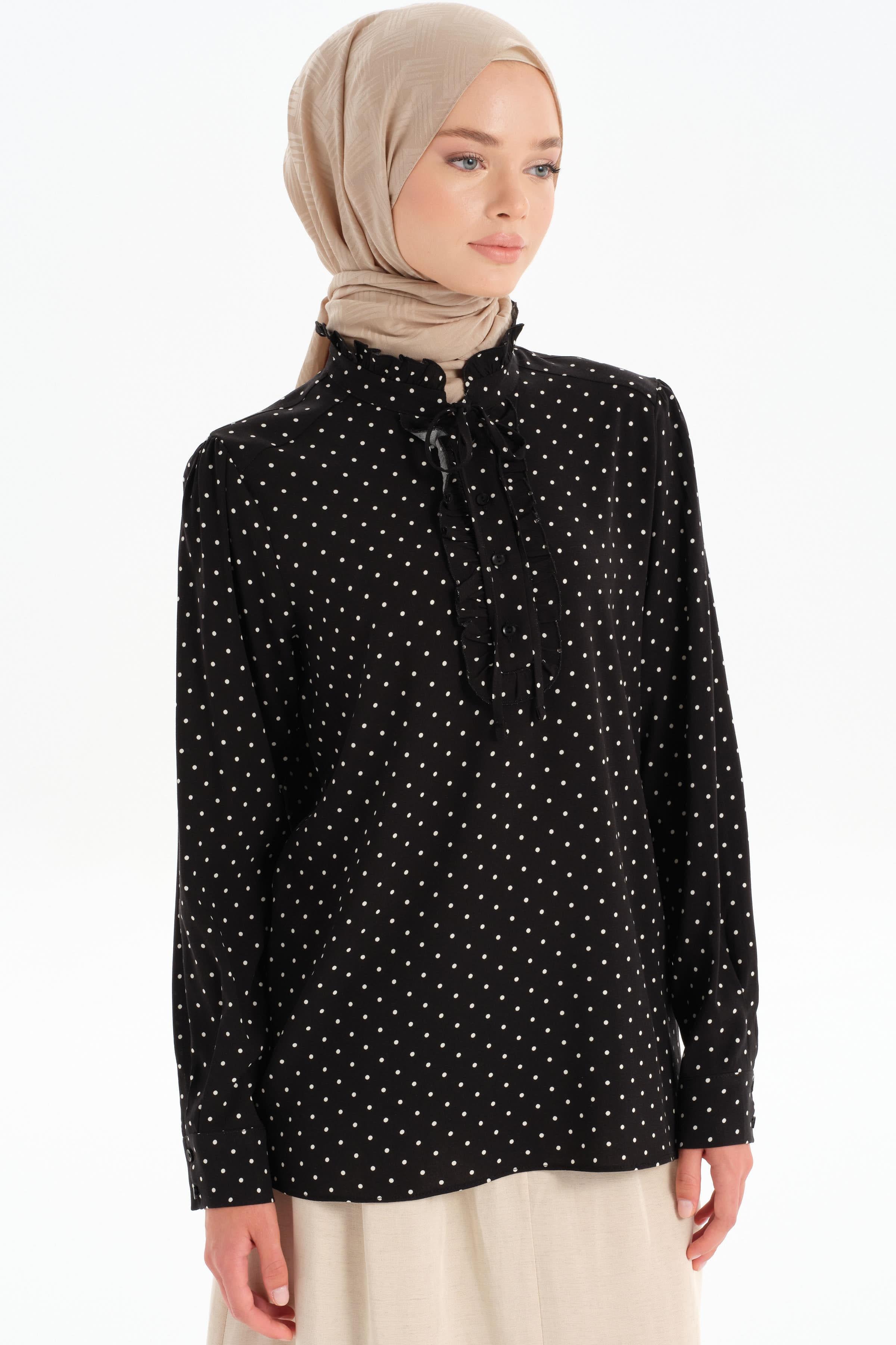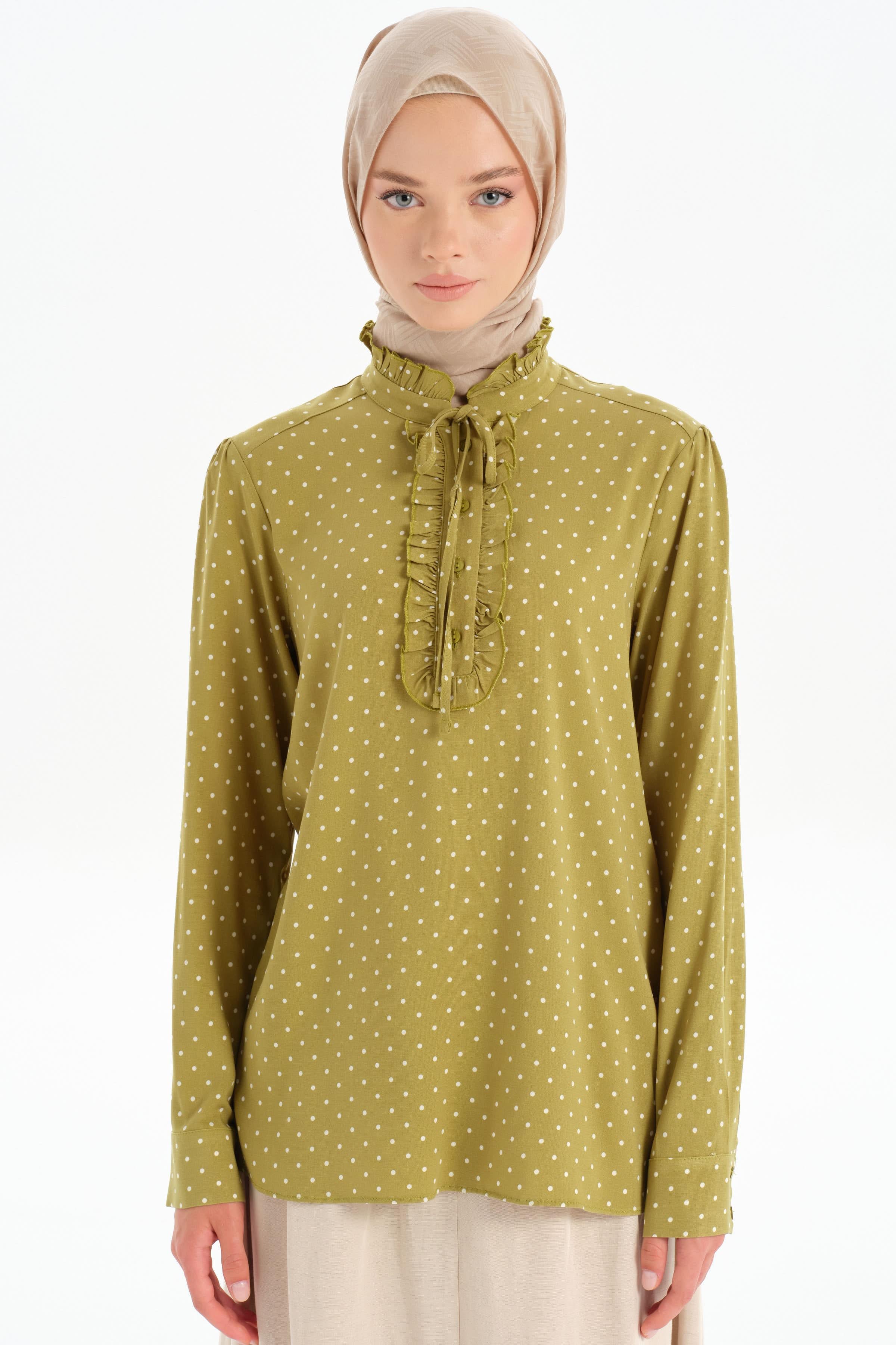 Ruffle details add a romantic touch to the blouse's overall style, while the polka dot pattern creates a modern and energetic look.