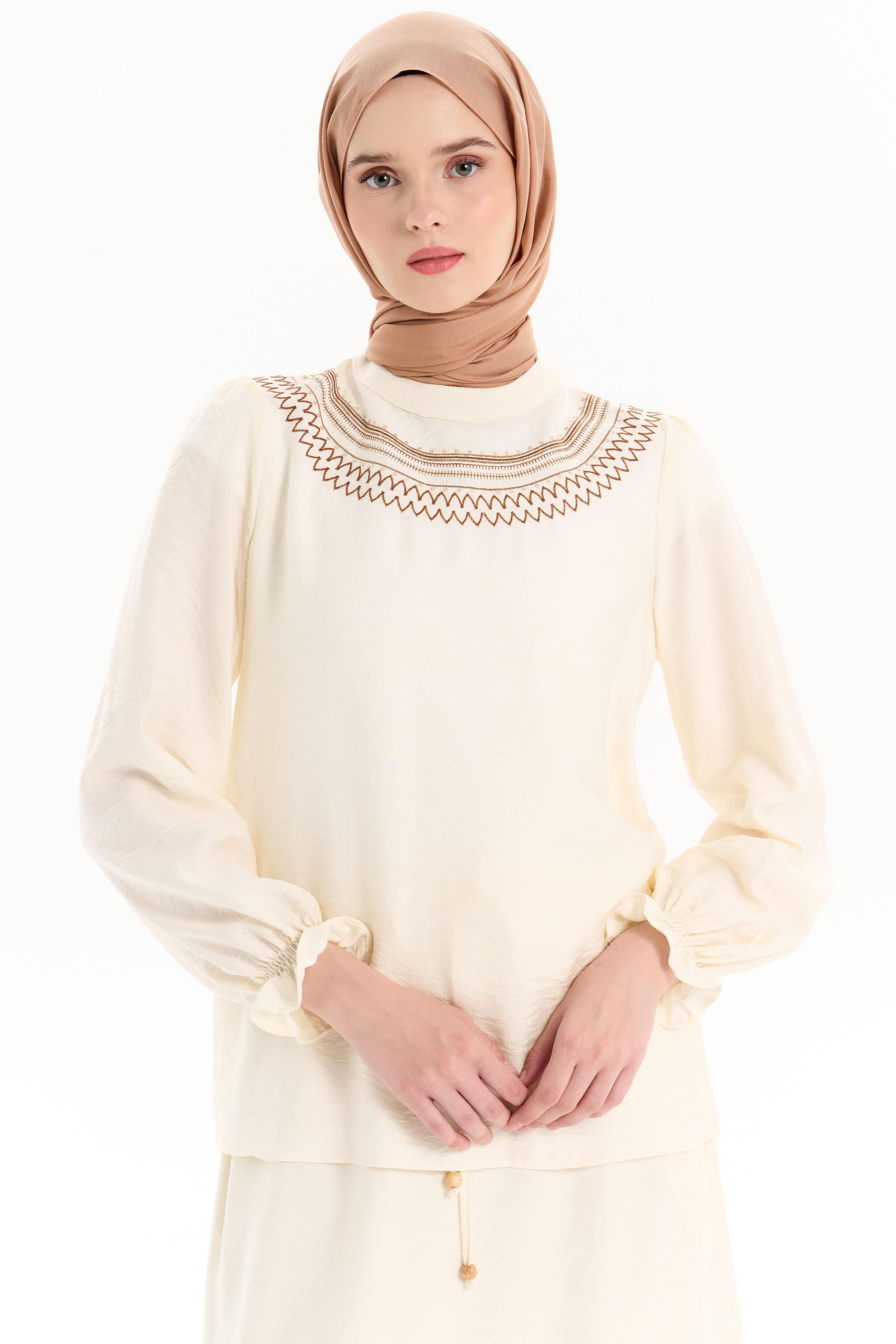 The Embroidered Blouse and Skirt Set is a design that combines elegance and style. The delicate embroidery details on the blouse add a sophisticated touch to the set, while the skirt creates a chic silhouette in harmony with the blouse.