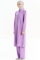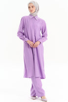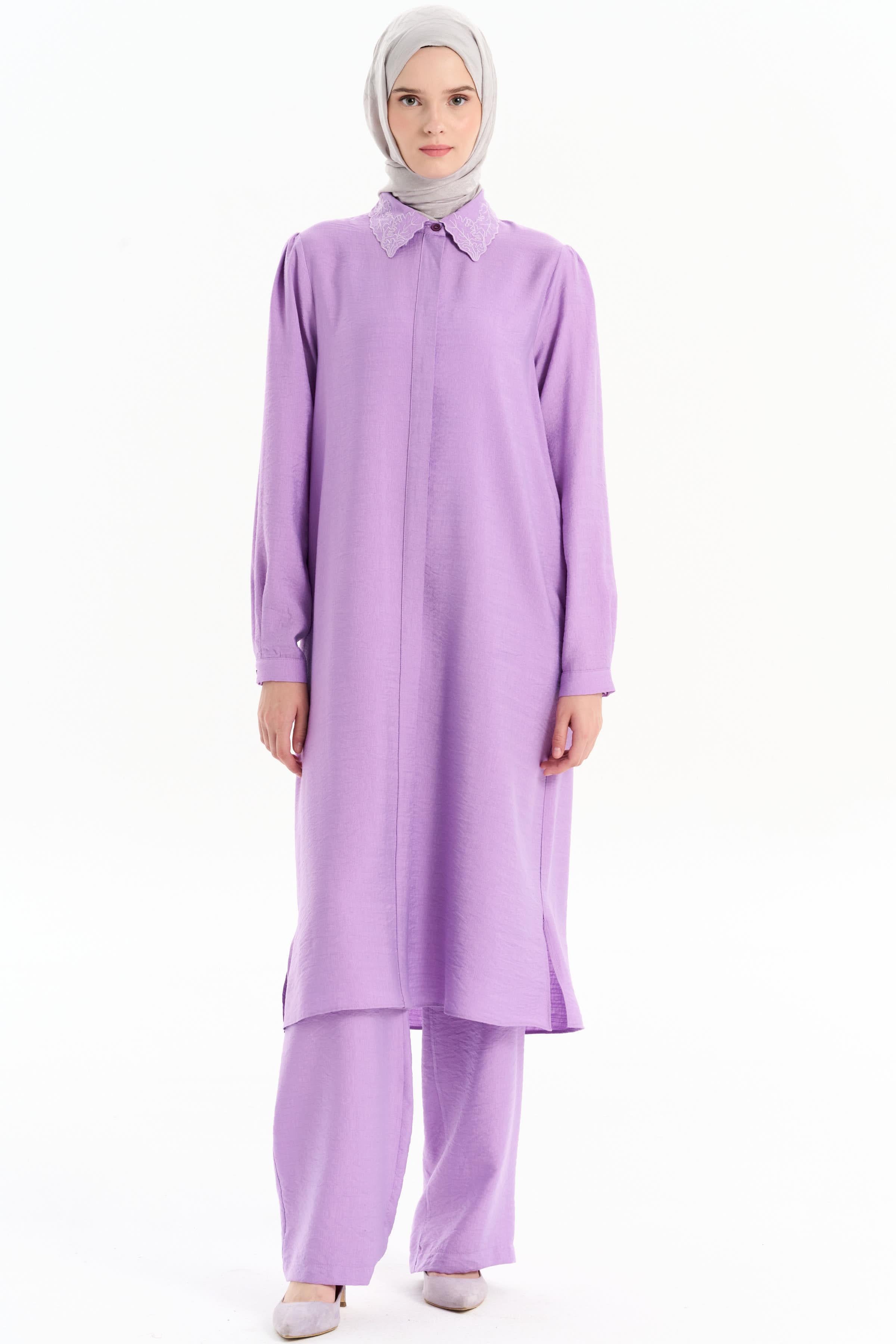 The Embroidered Collar Tunic and Pants Set offers a stylish combination that stands out with its elegant details. The embroidered collar adds a sophisticated touch to the tunic, creating a striking style.