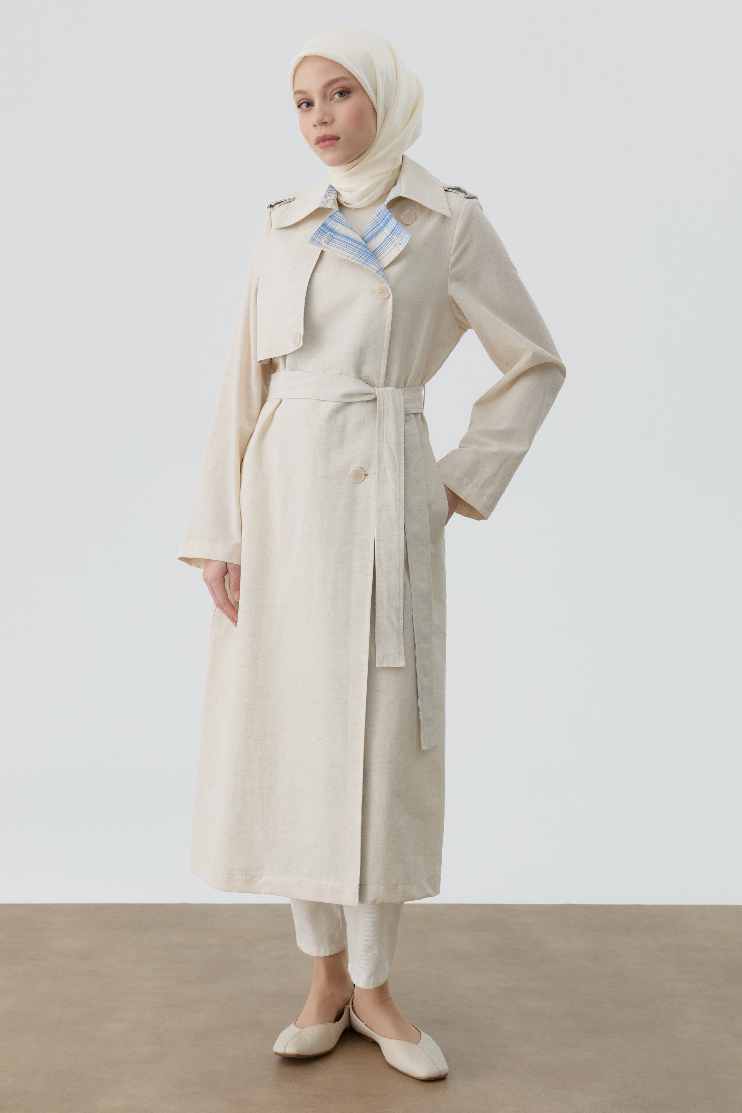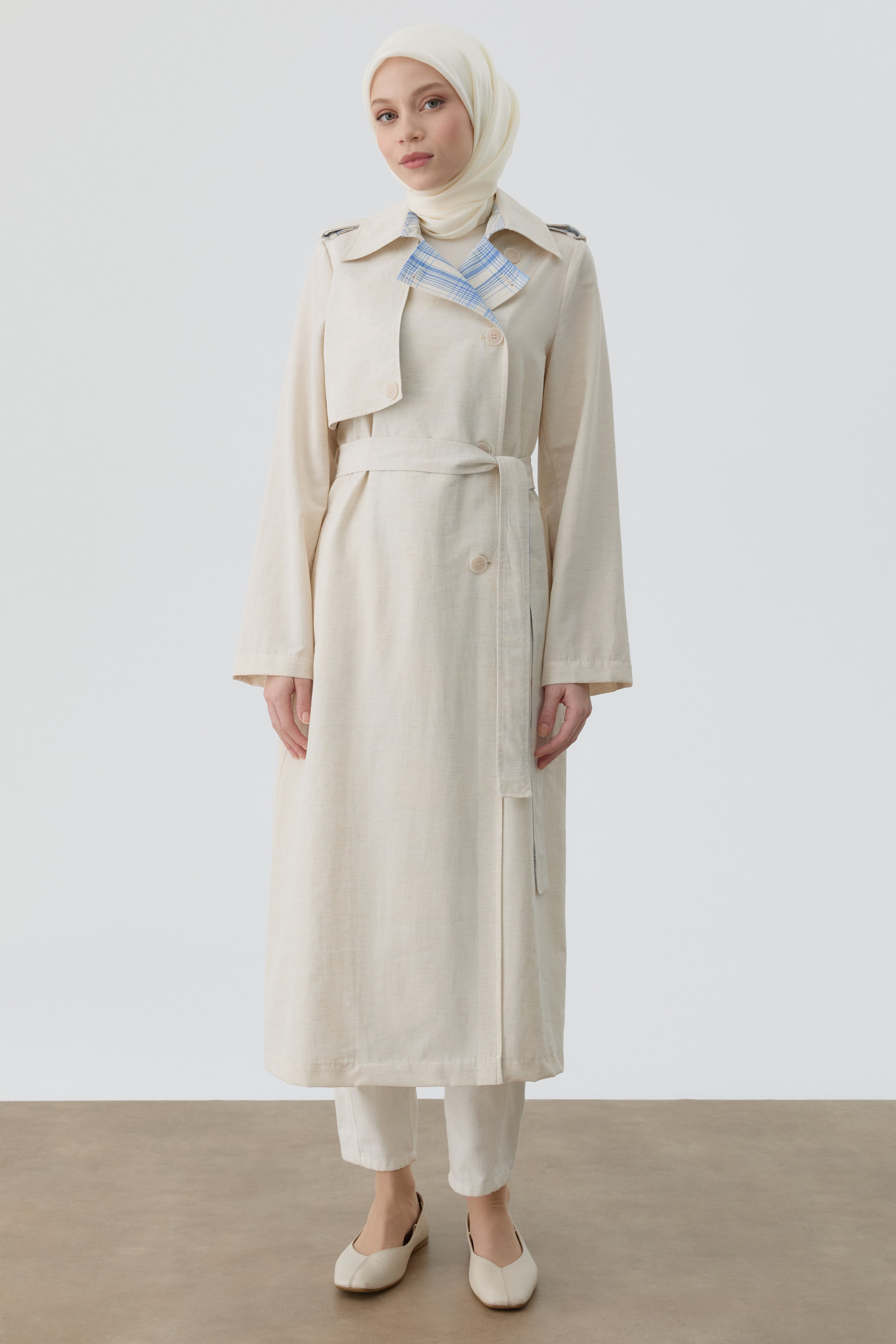 This belted trench coat, enlivened by its plaid pattern details, offers a strong and stylish look.