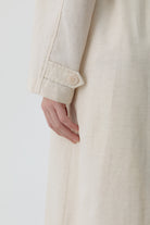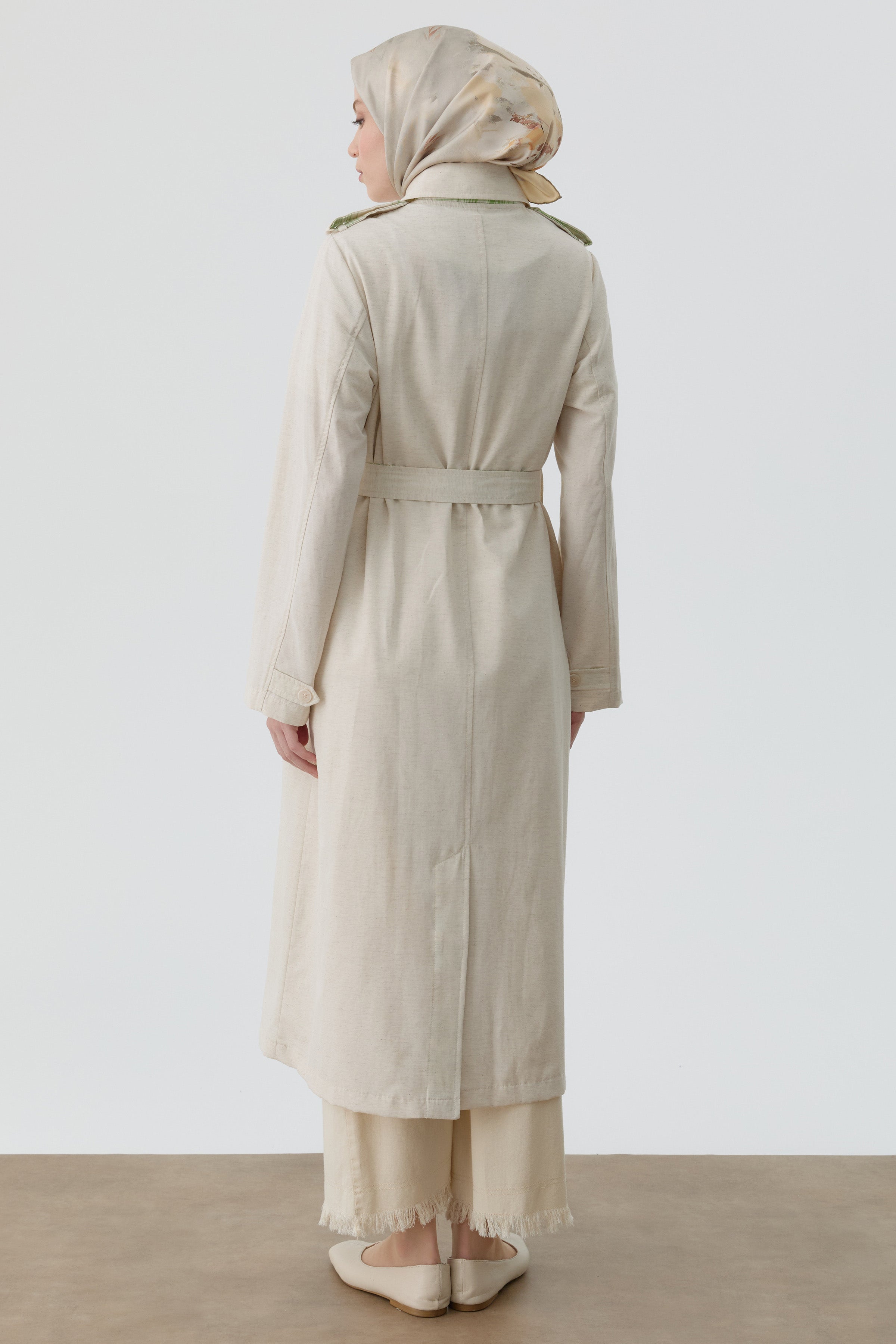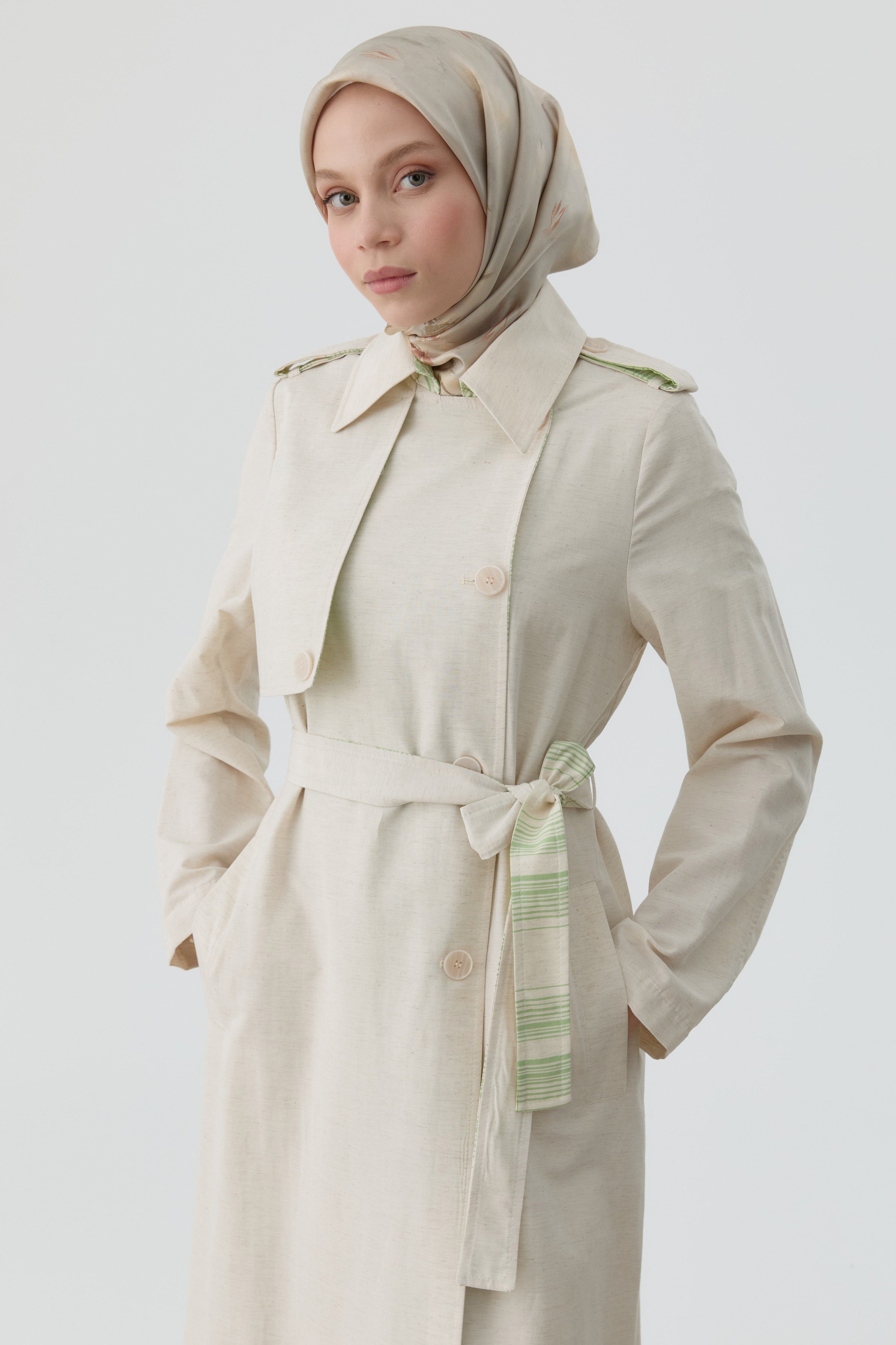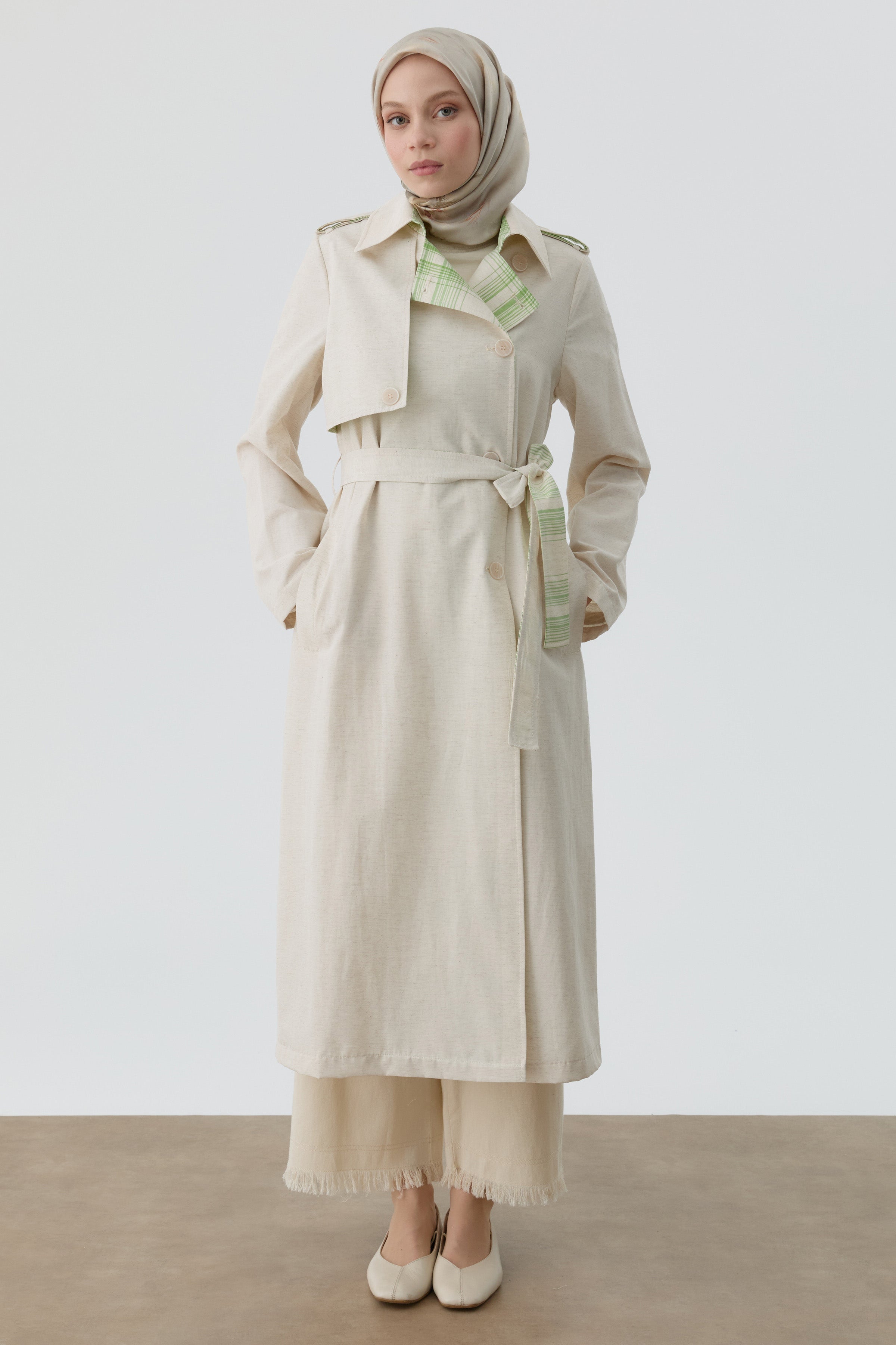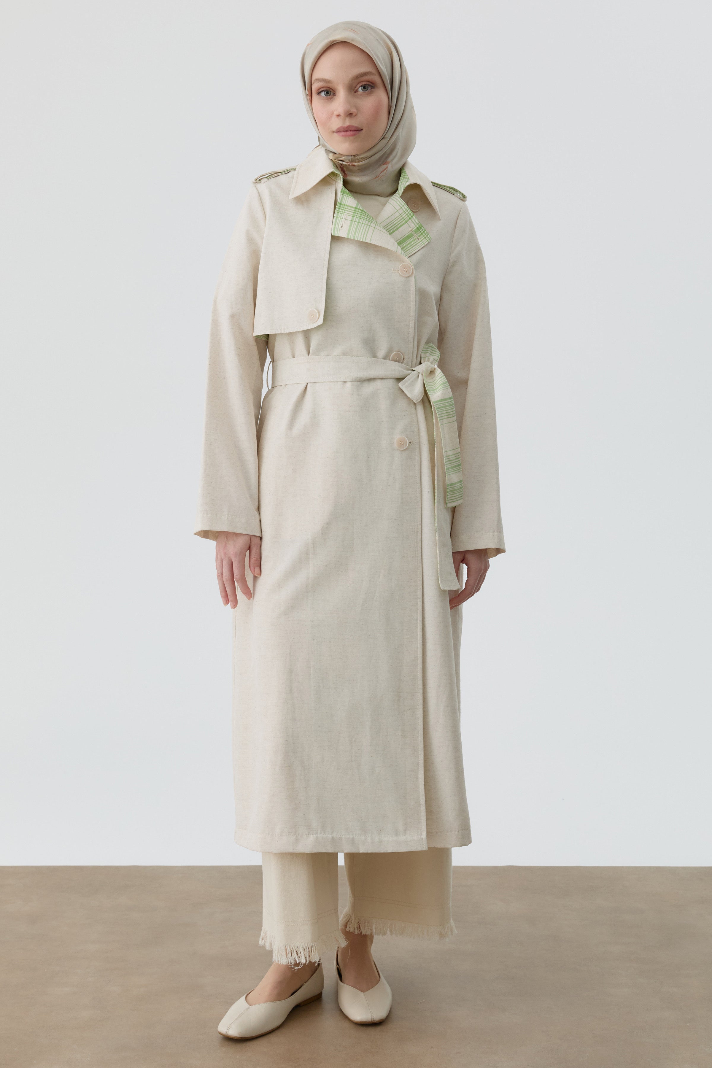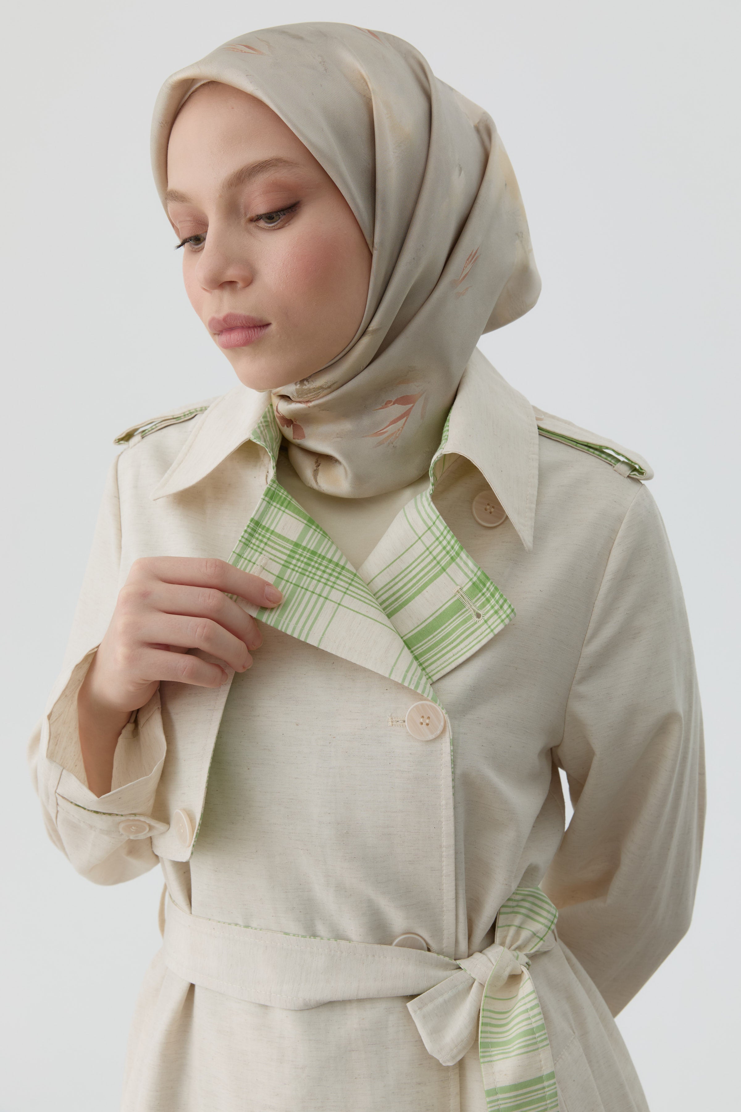 This belted trench coat, enlivened by its plaid pattern details, offers a strong and stylish look.