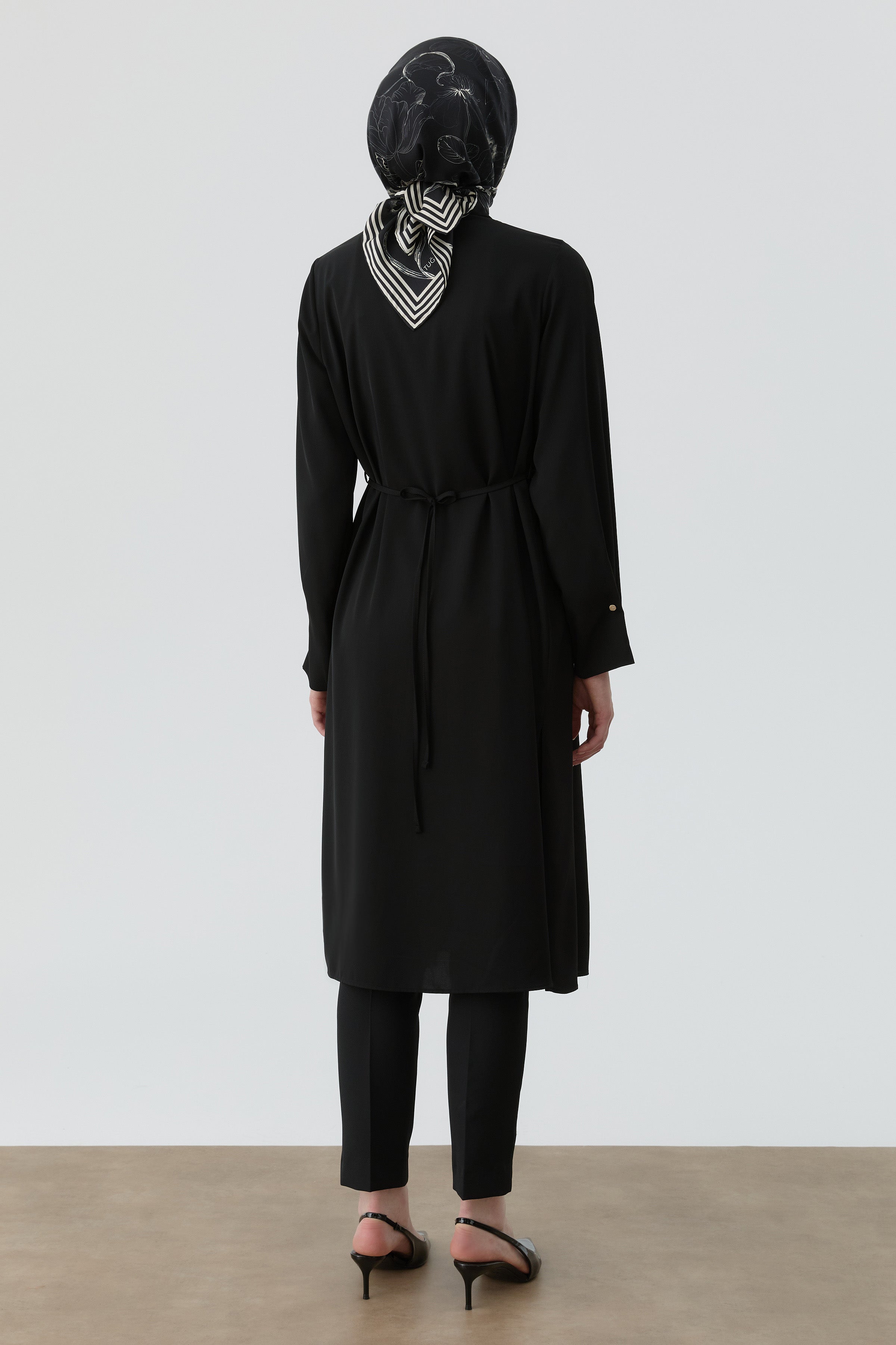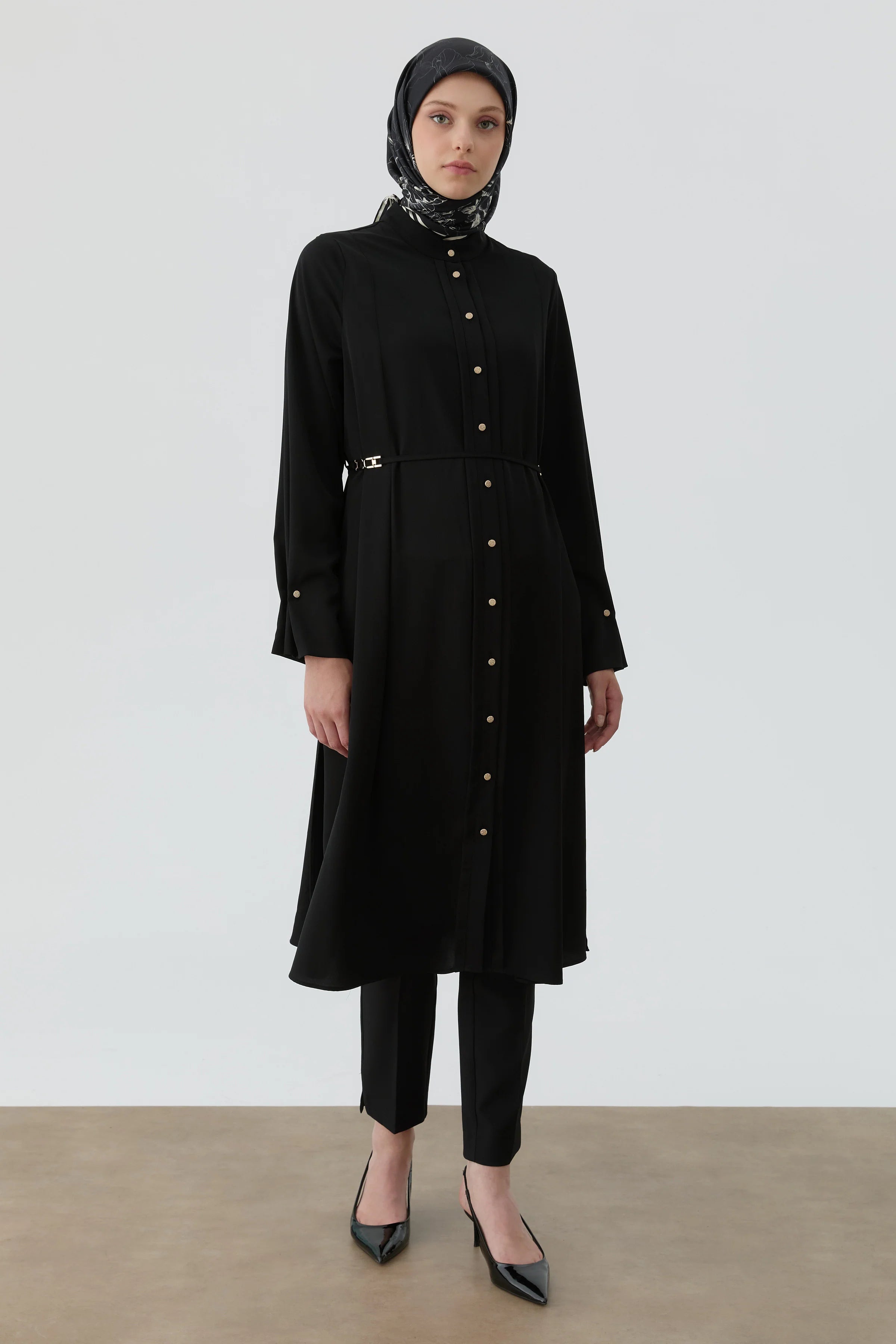 This tunic, which adds subtle touches to classic elegance with its pleat and button details on the ankles, offers a striking look despite its simple design.