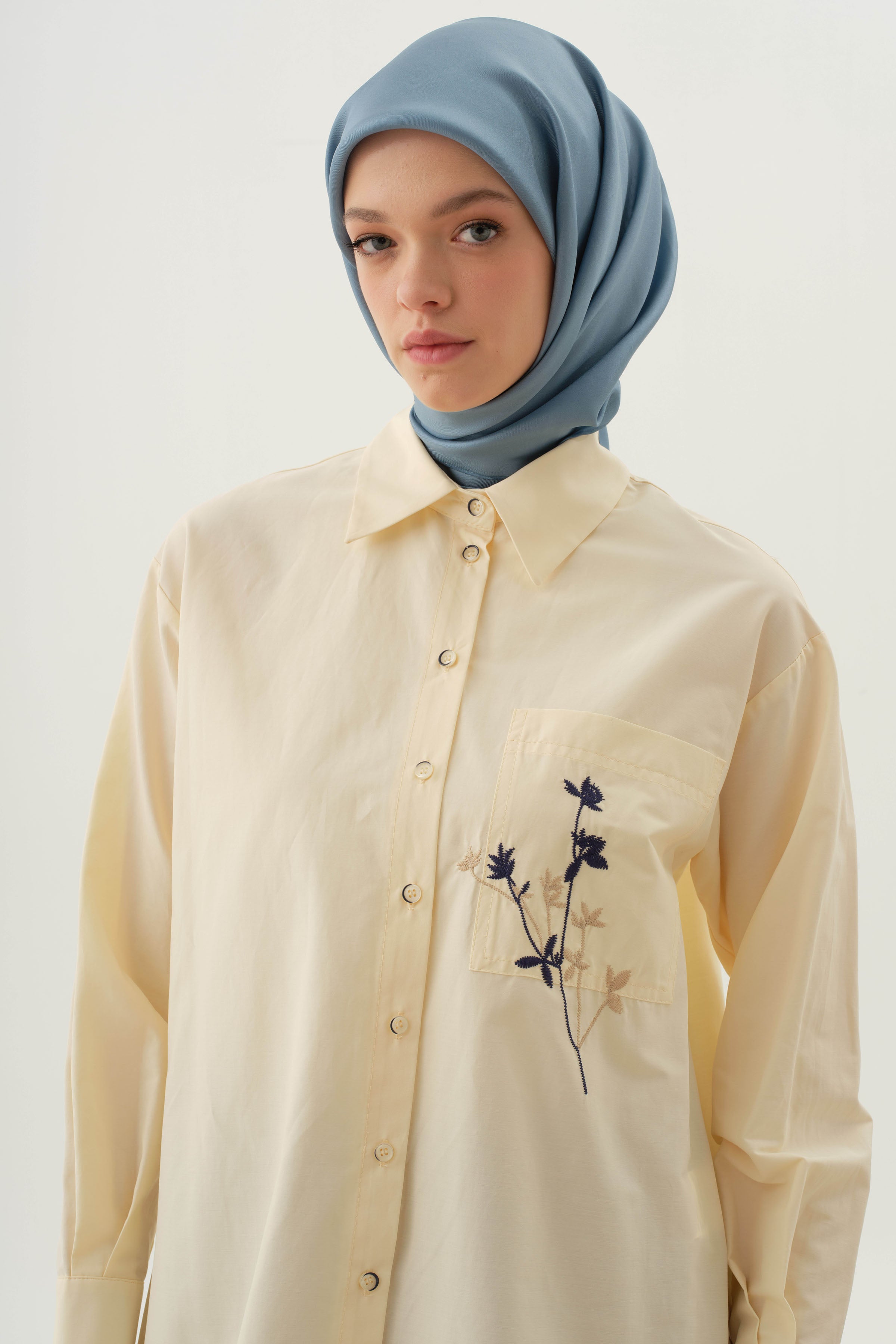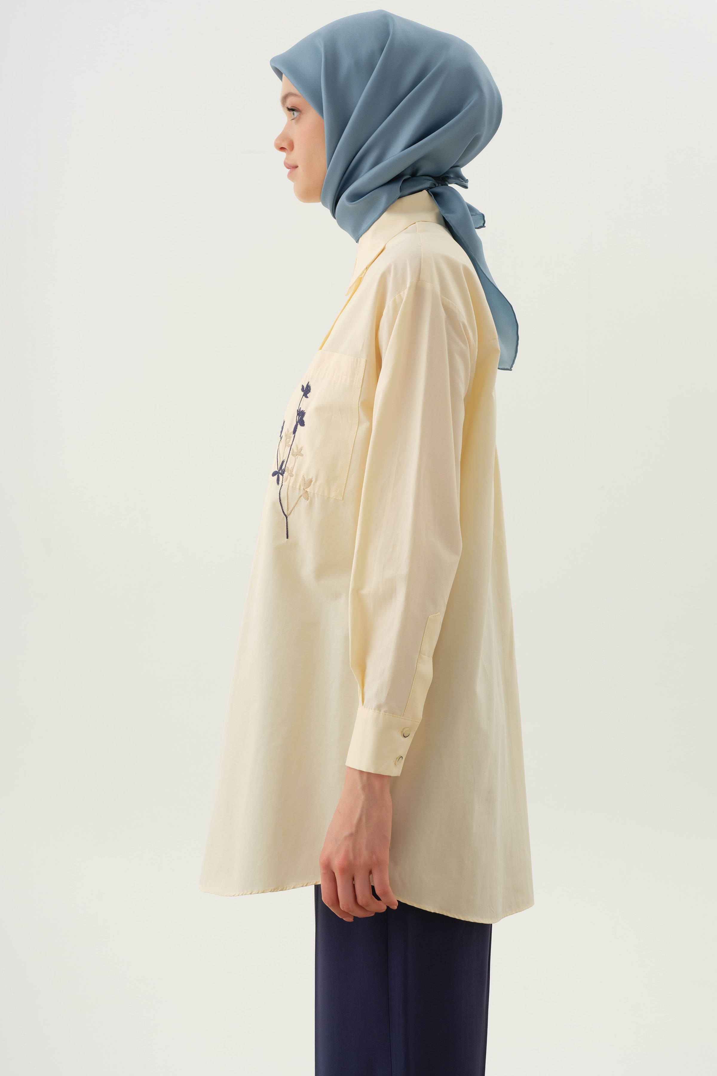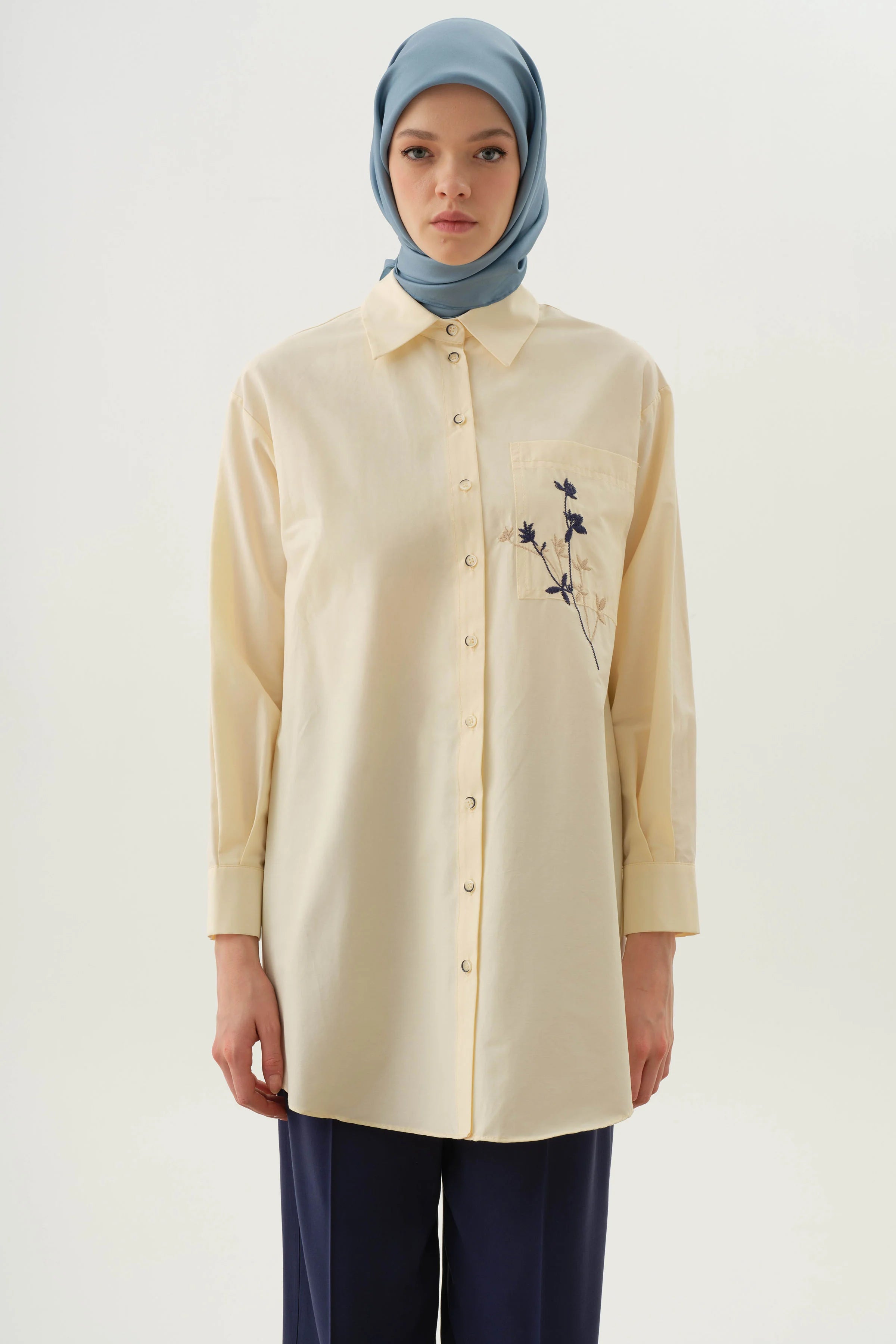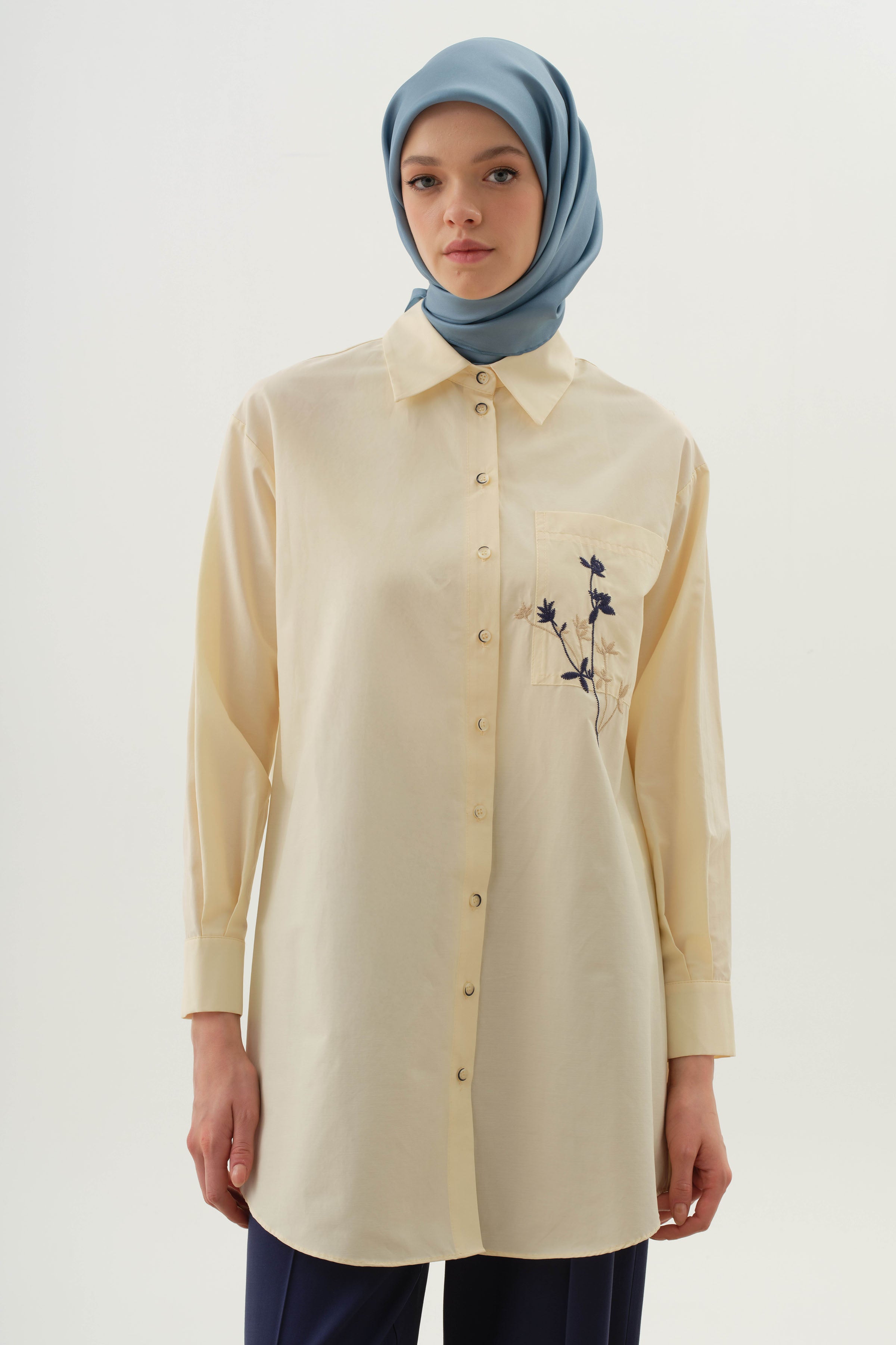 The pocket embroidery detailed tunic, which combines daily elegance with details, completes its simple design with elegant embroidery. While it offers comfortable use all day long thanks to its comfortable cut, it adds a sophisticated air to your style with its finely crafted embroidery details.