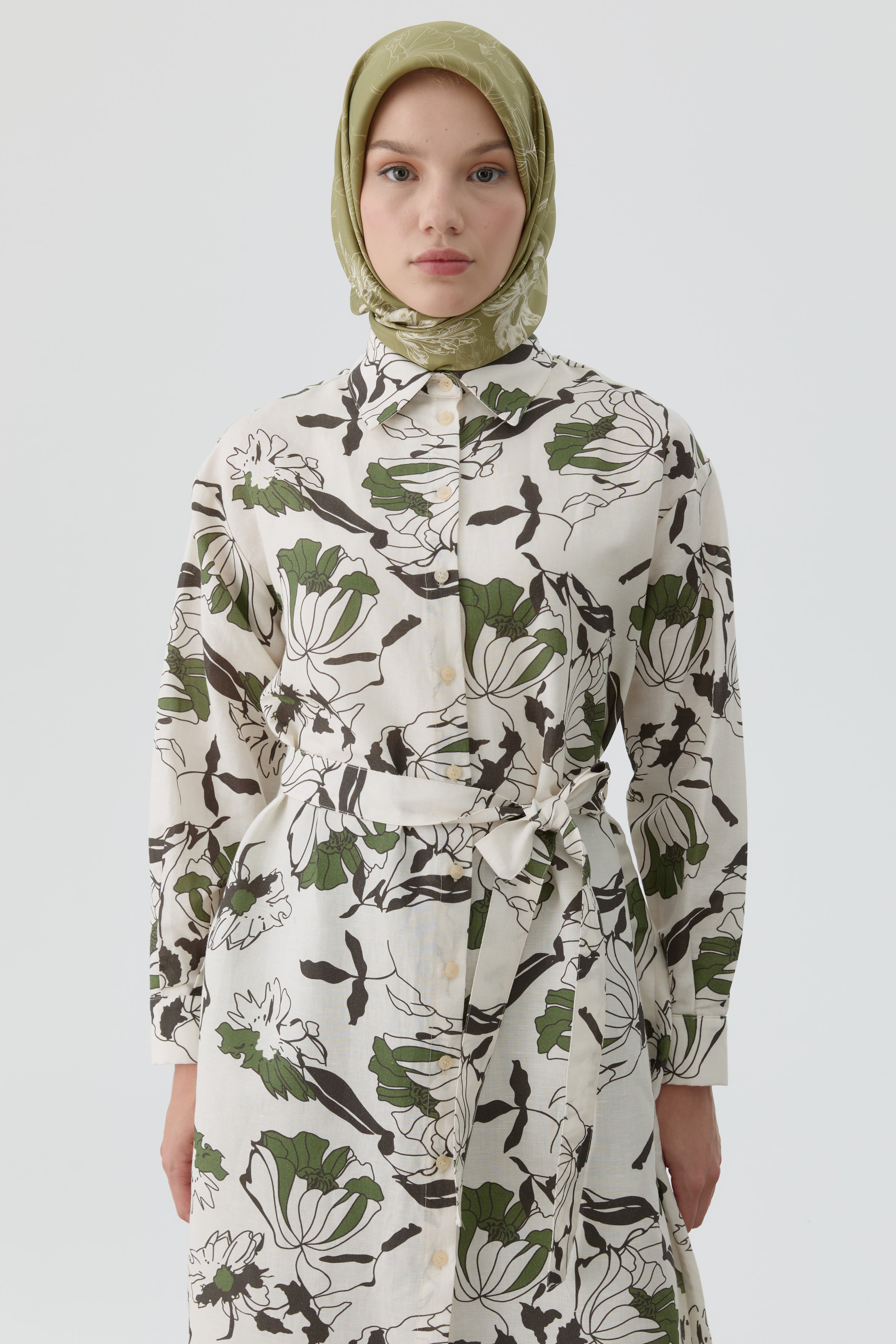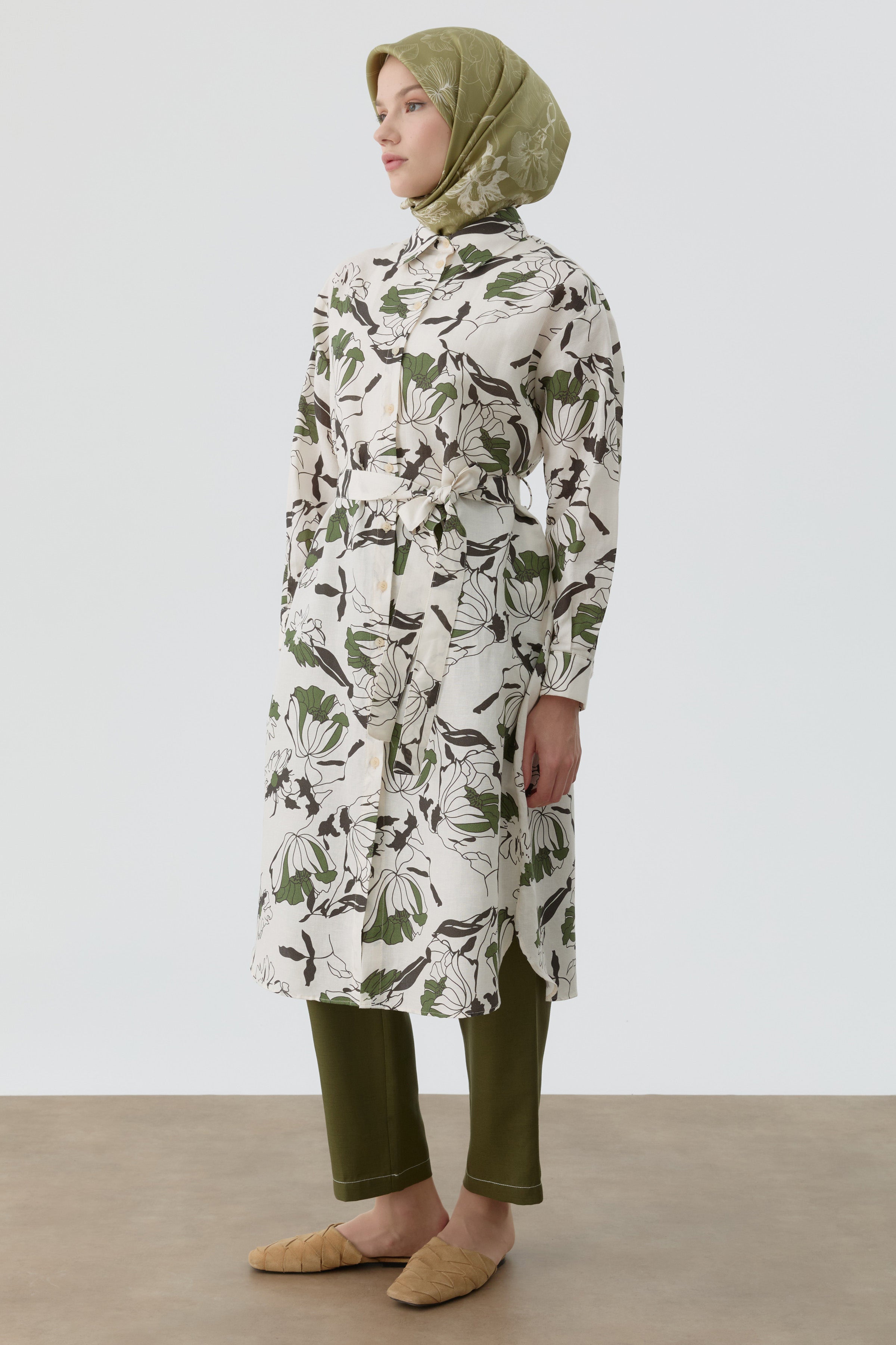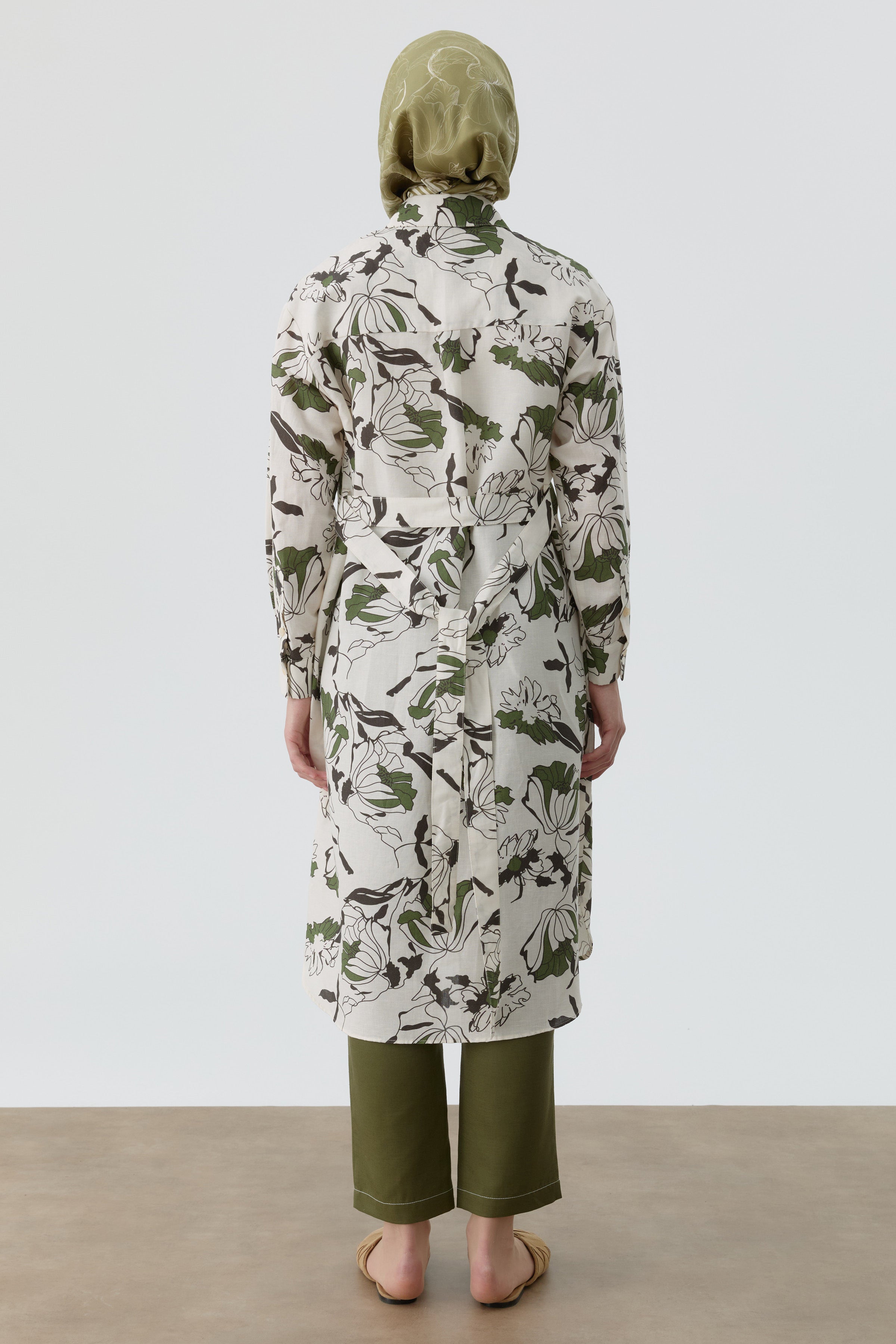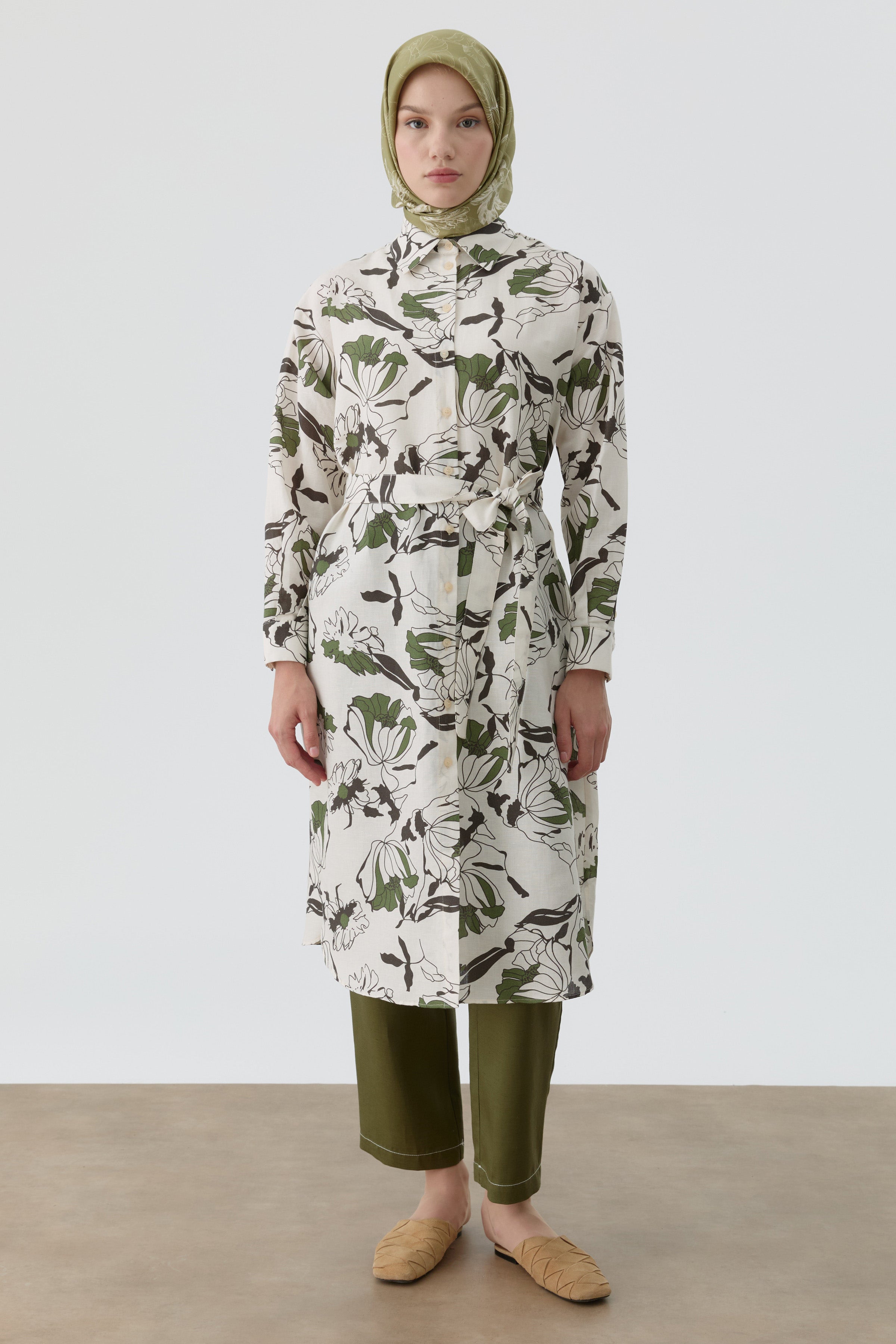 Offering a romantic atmosphere with floral patterns in soft tones, this tunic elegantly emphasizes the body form with its detachable belt detail at the waist.
