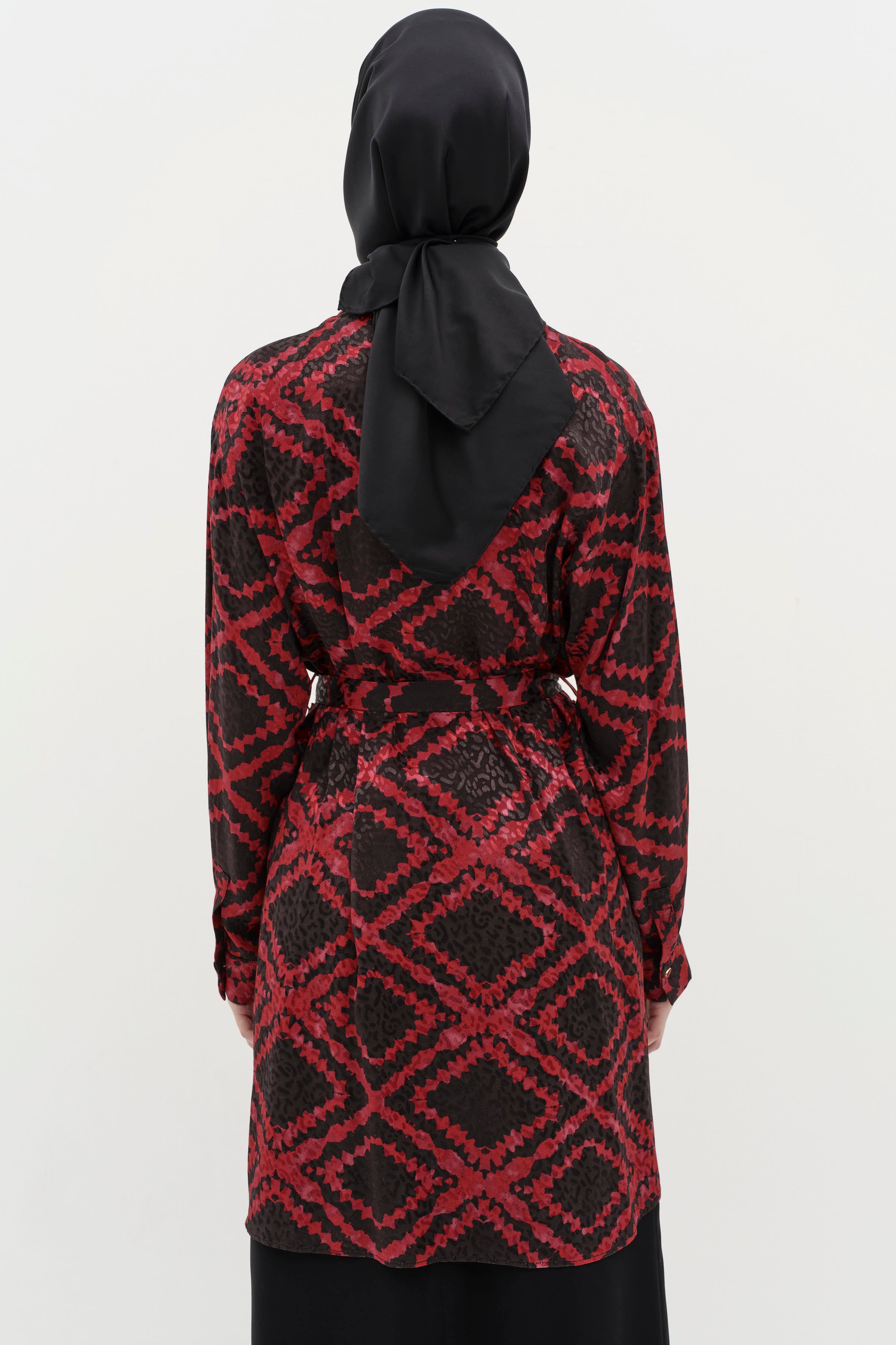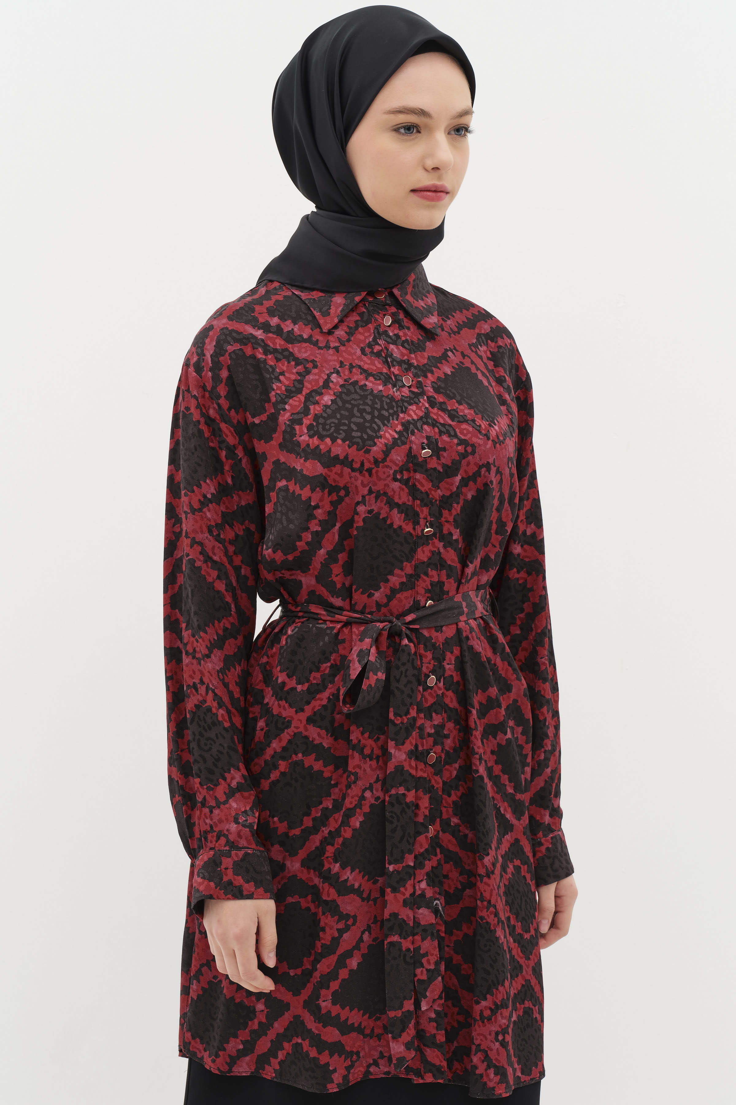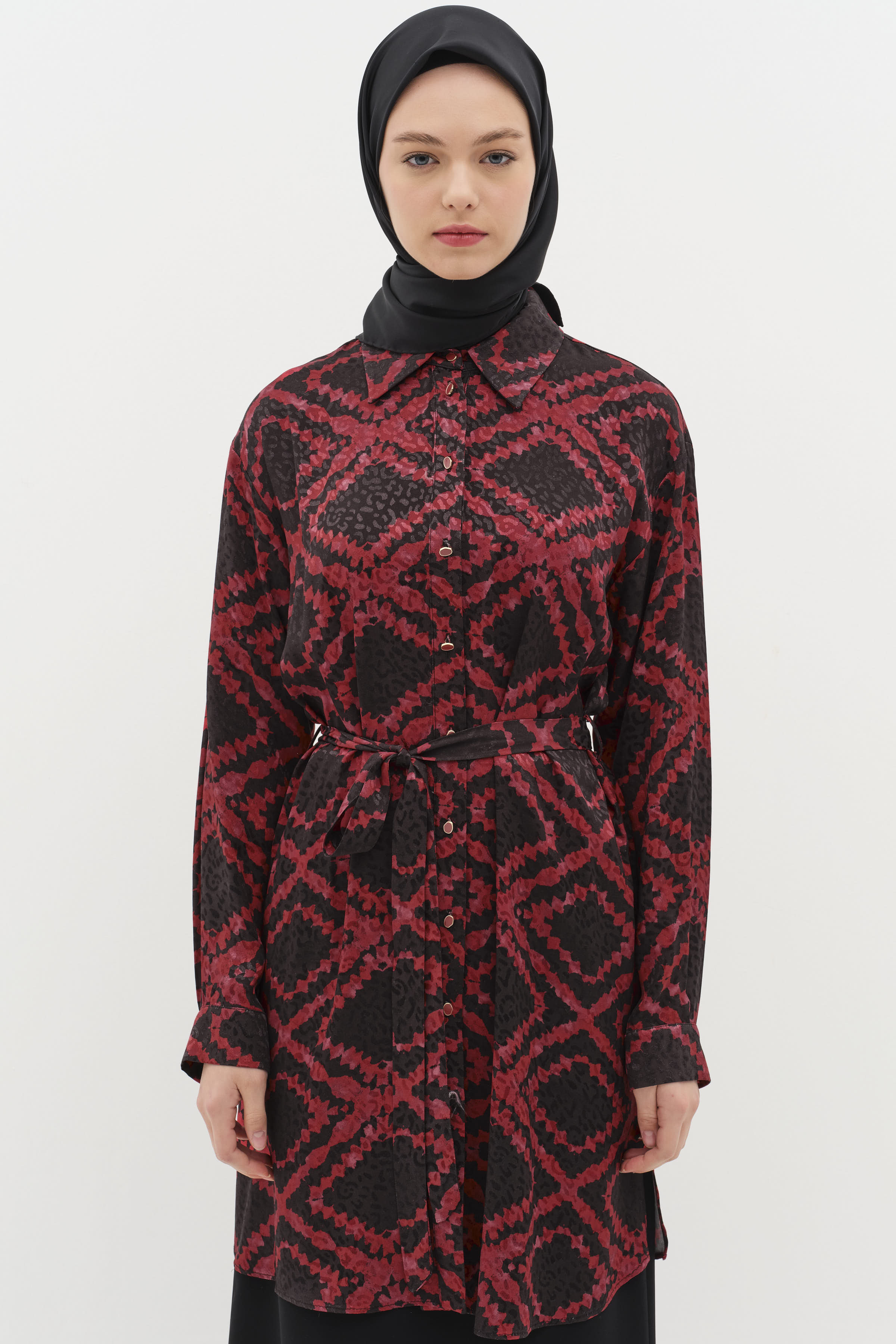 Belted Slit Detailed Patterned Tunic - Claret Red