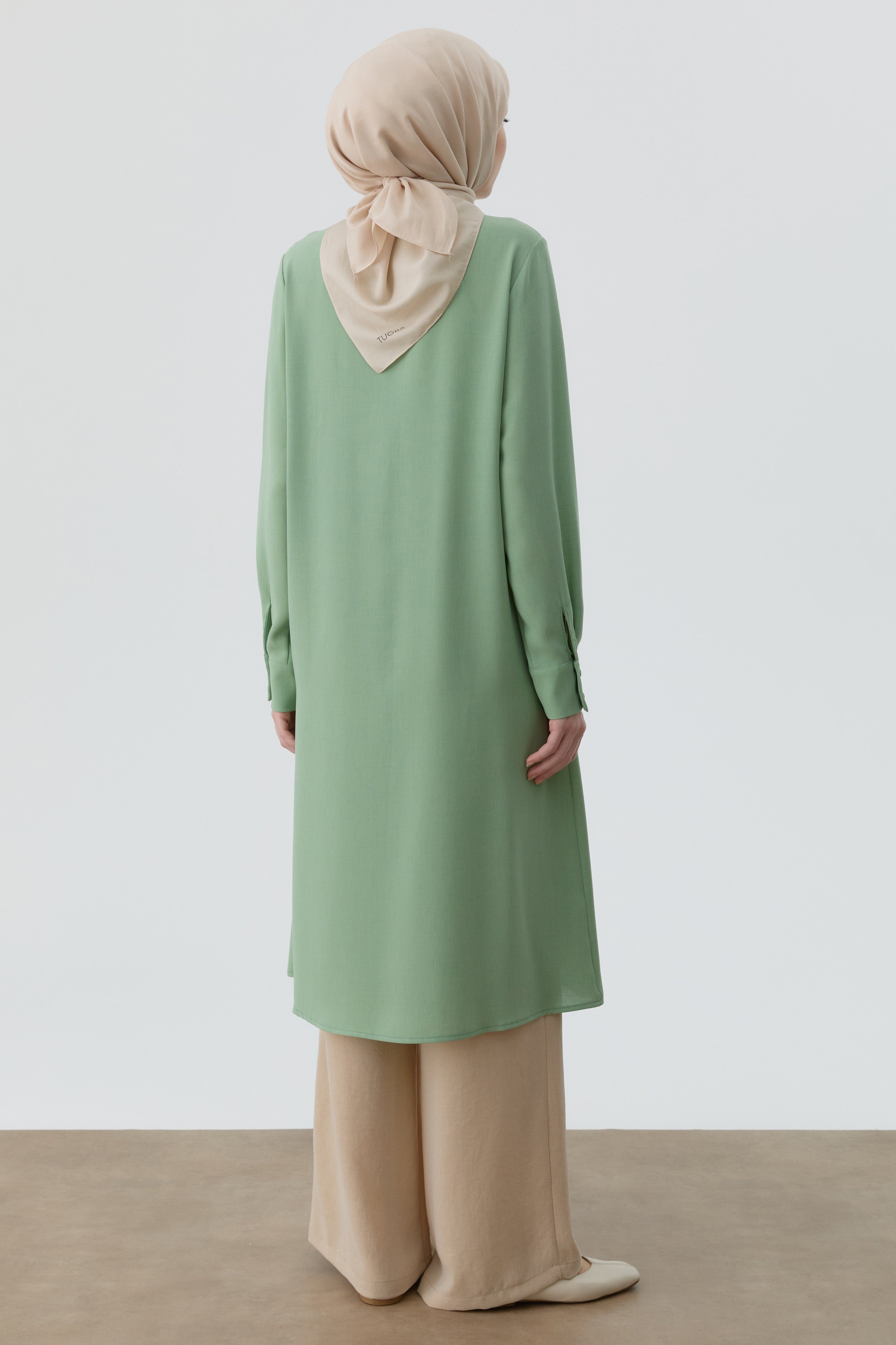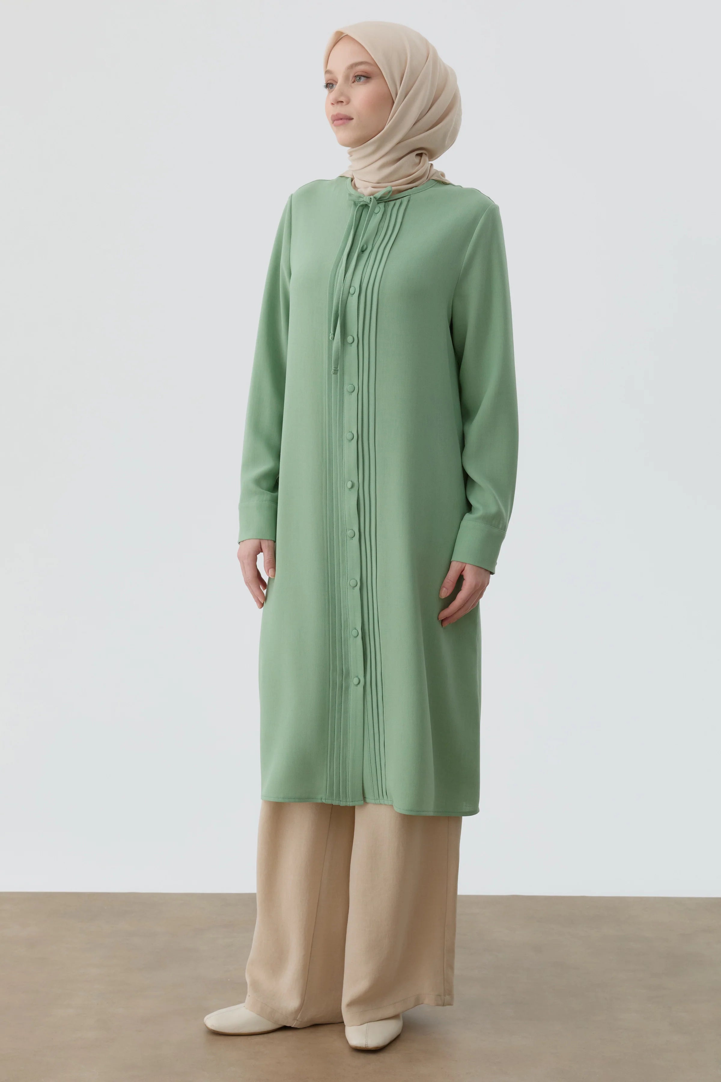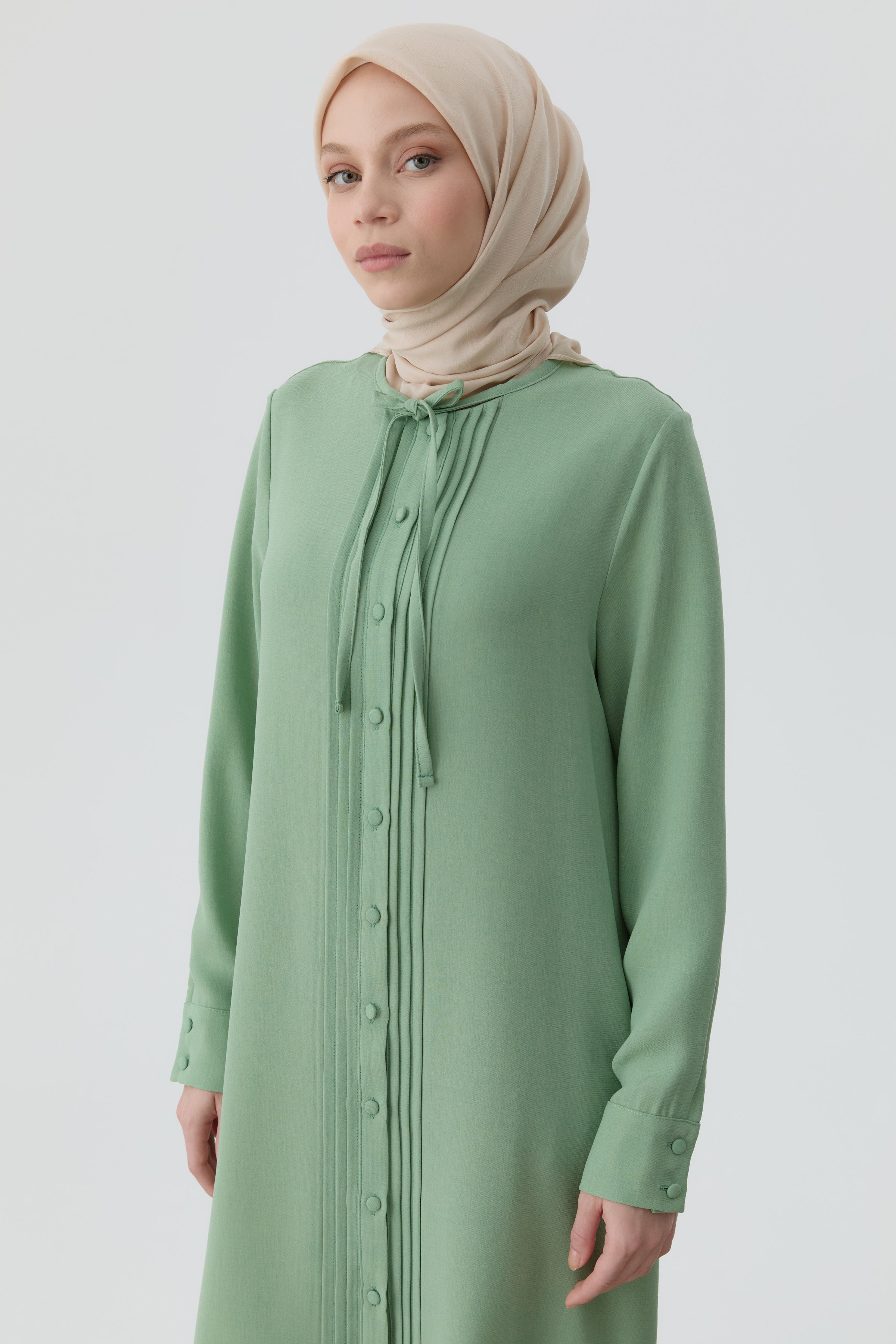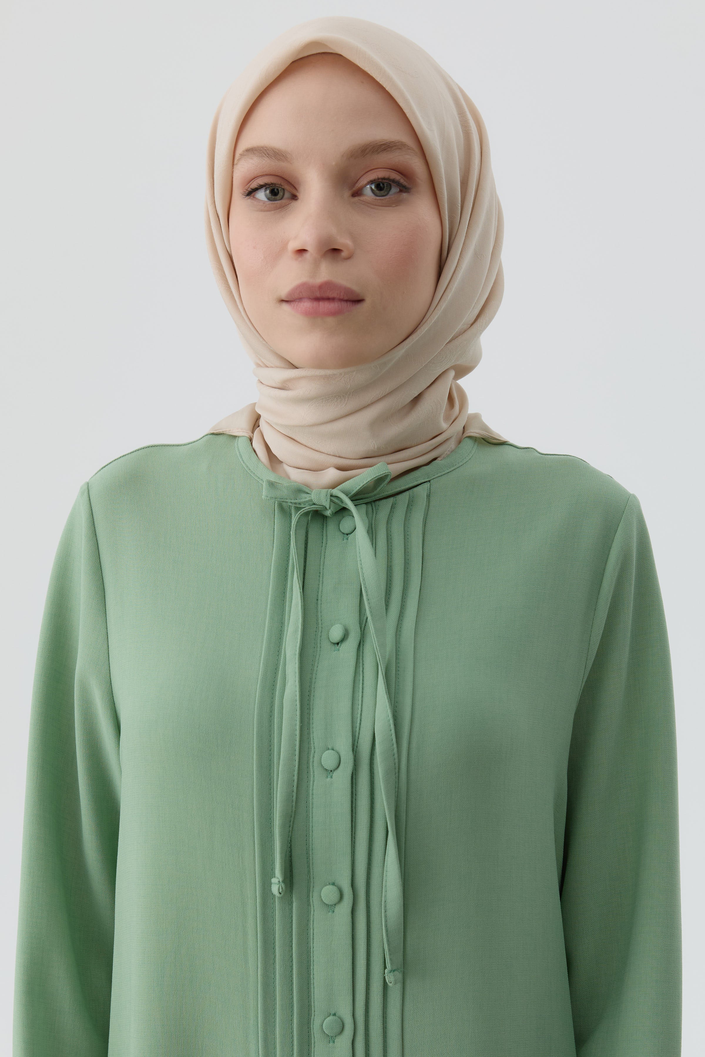 Pleated Tunic with Tie Collar - Aqua Green