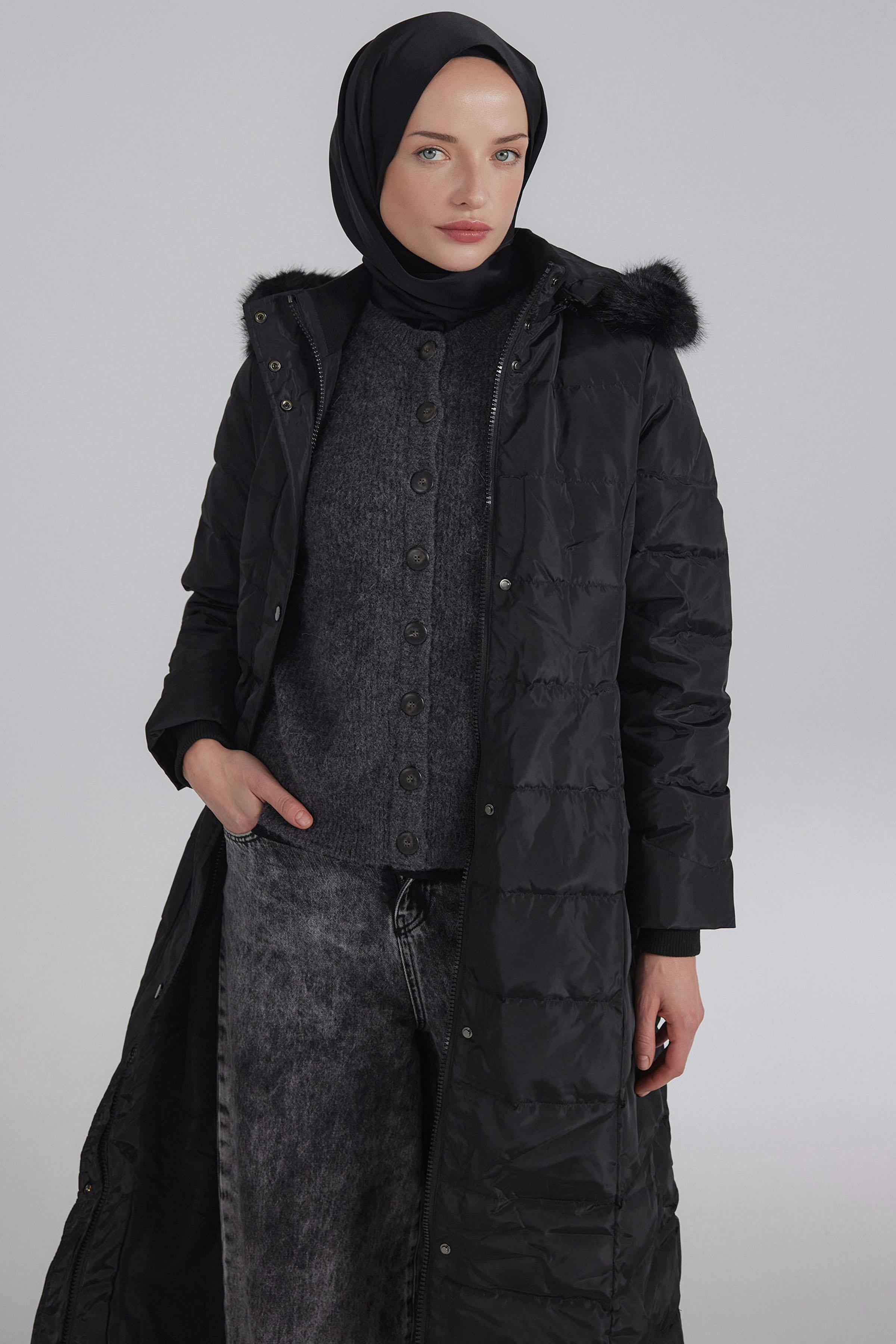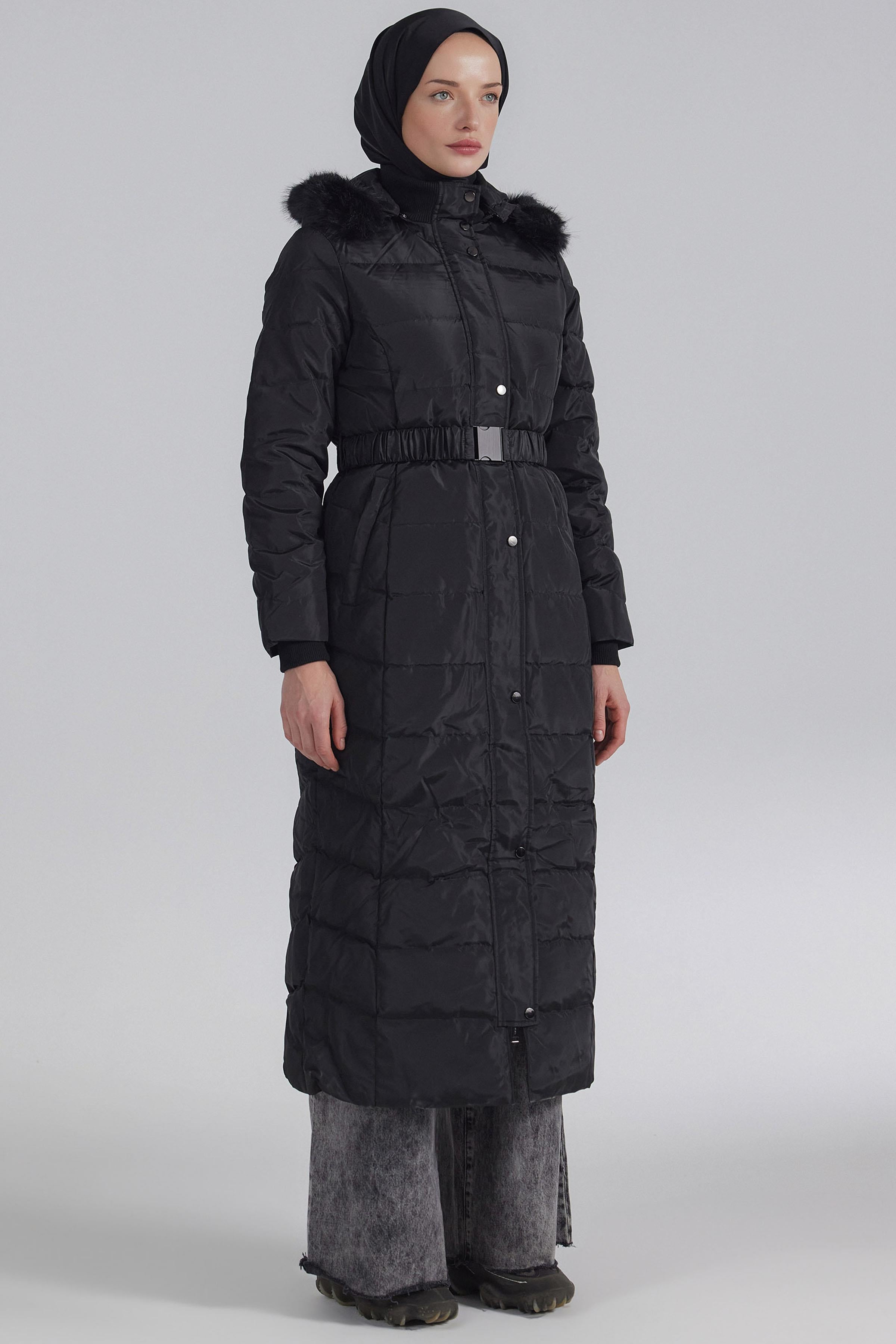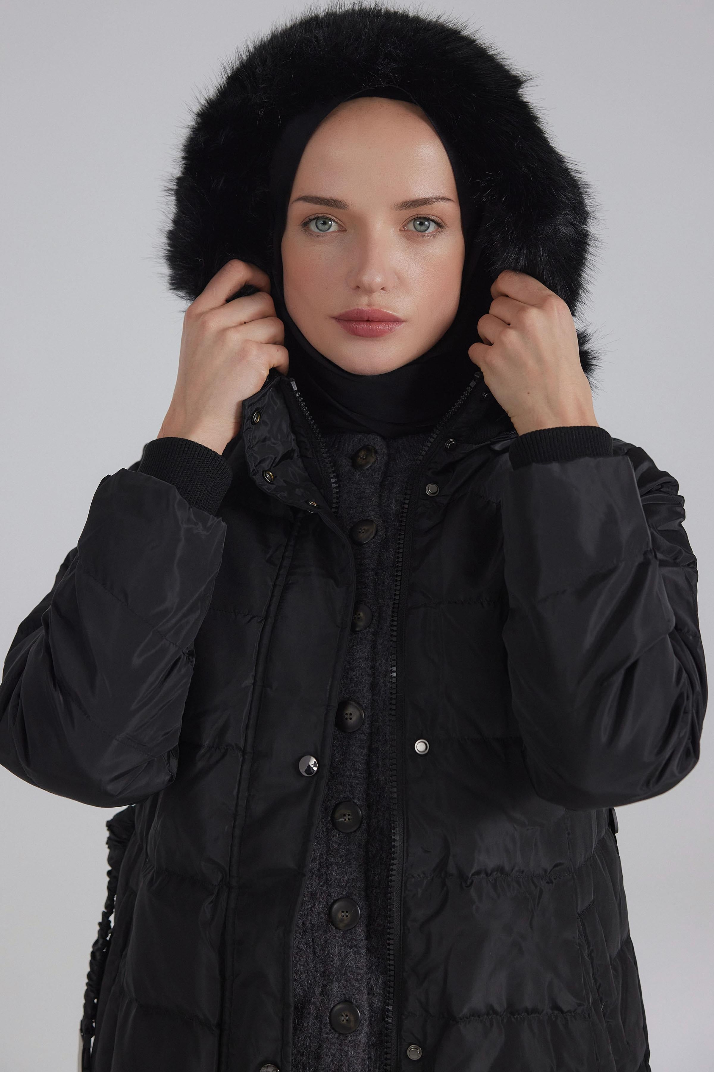 The Down Jacket with Elastic Waistband is a winter piece that stands out with its elegant design. The elastic waistband detail provides a stylish look while hugging the body and retaining warmth.