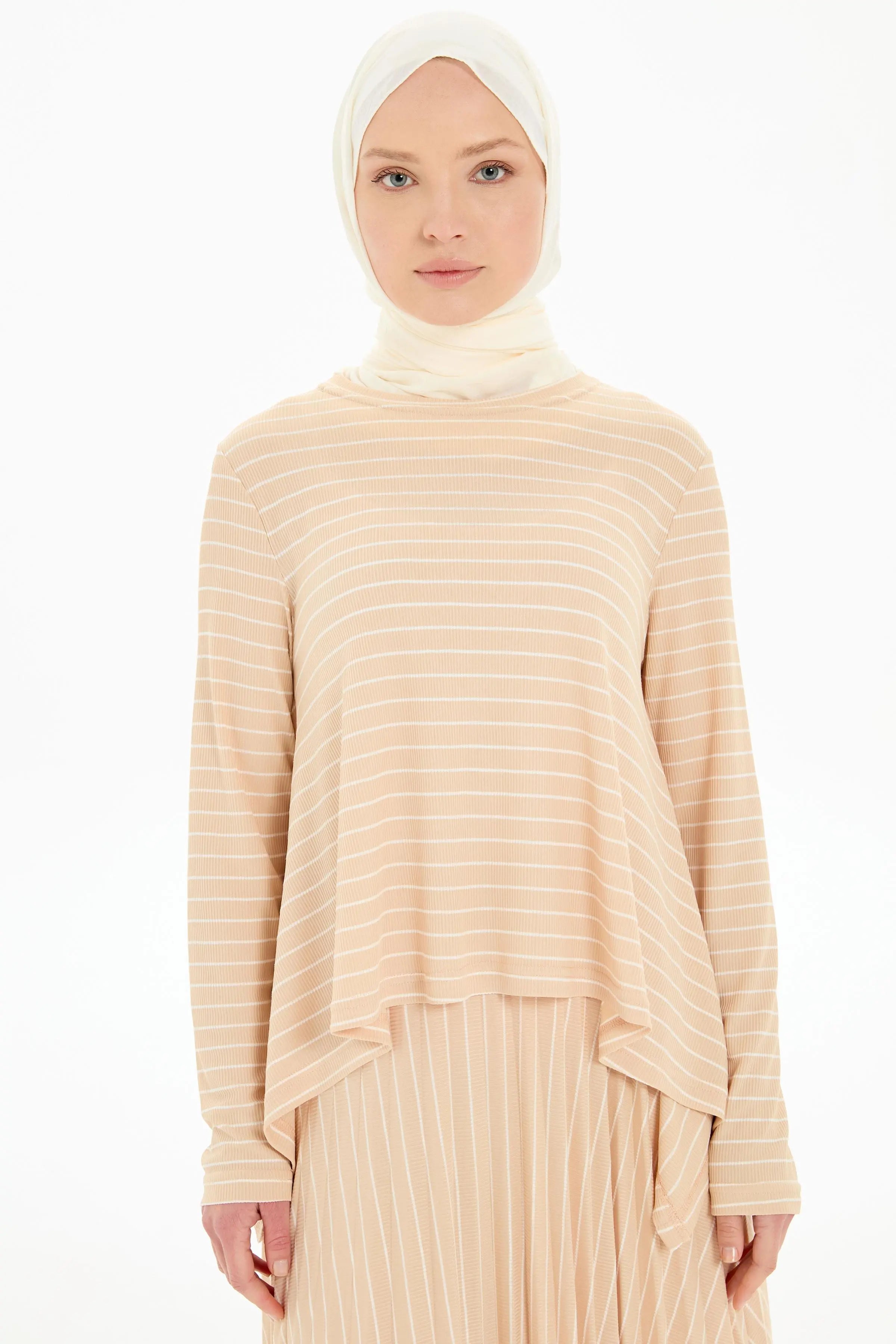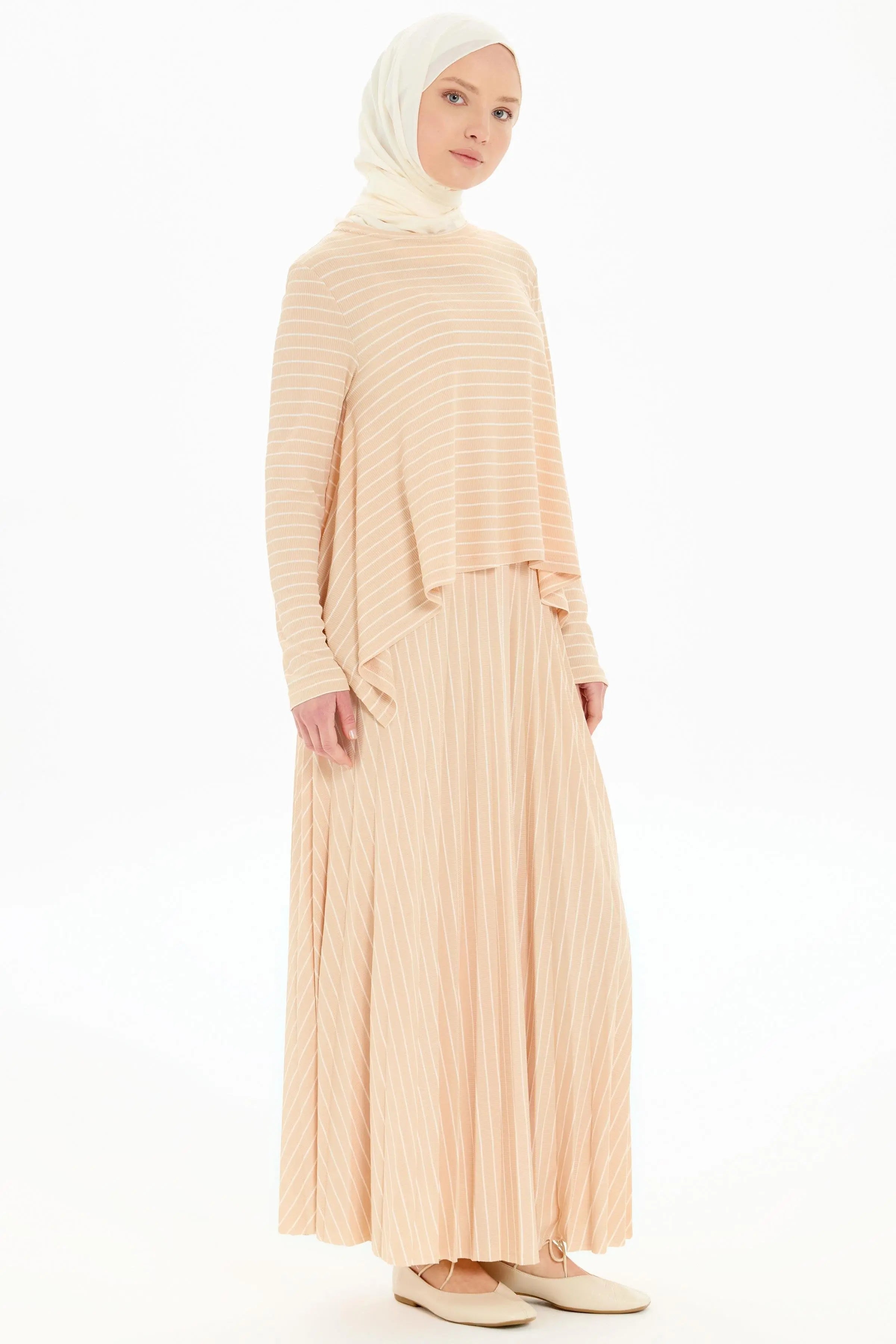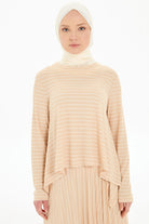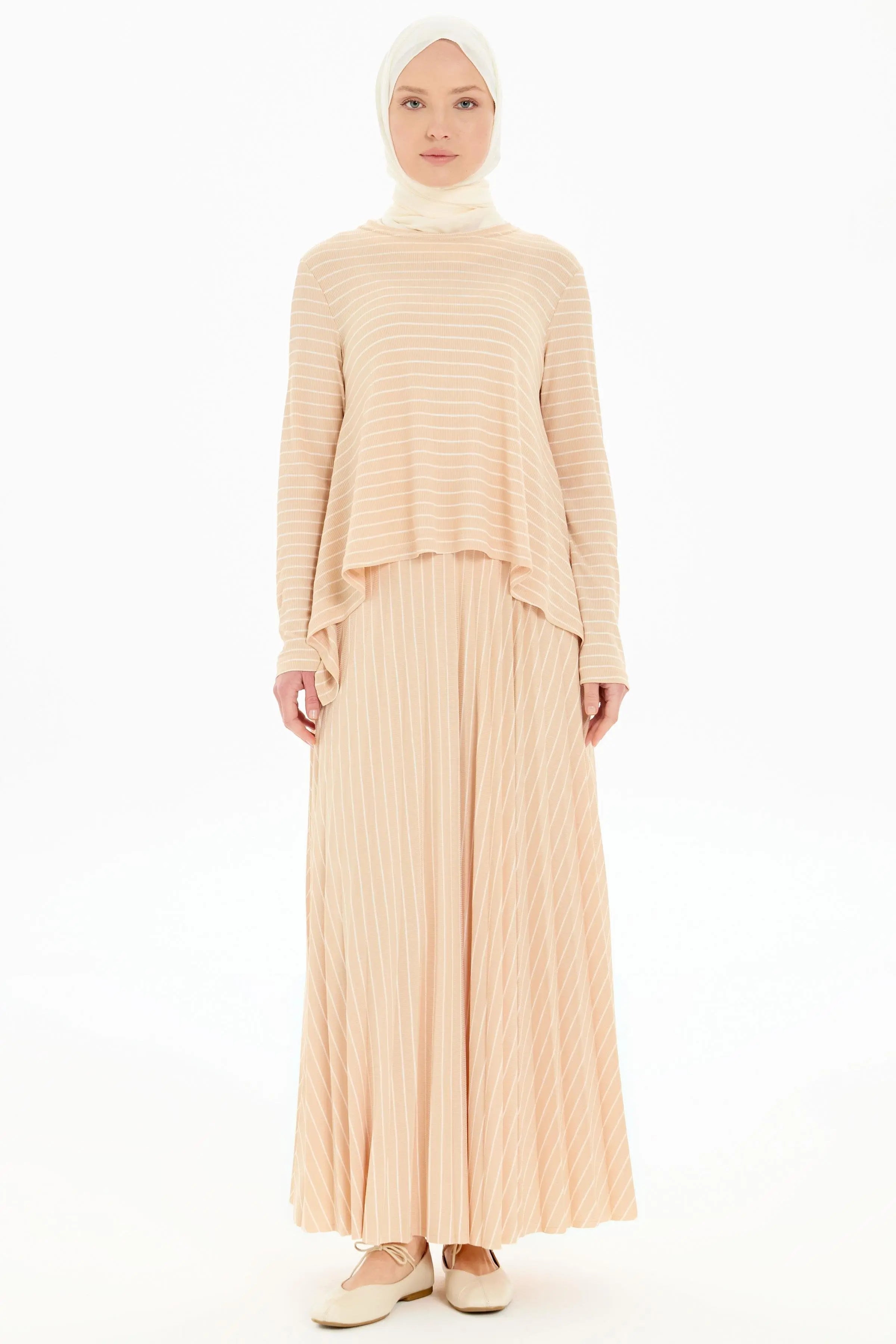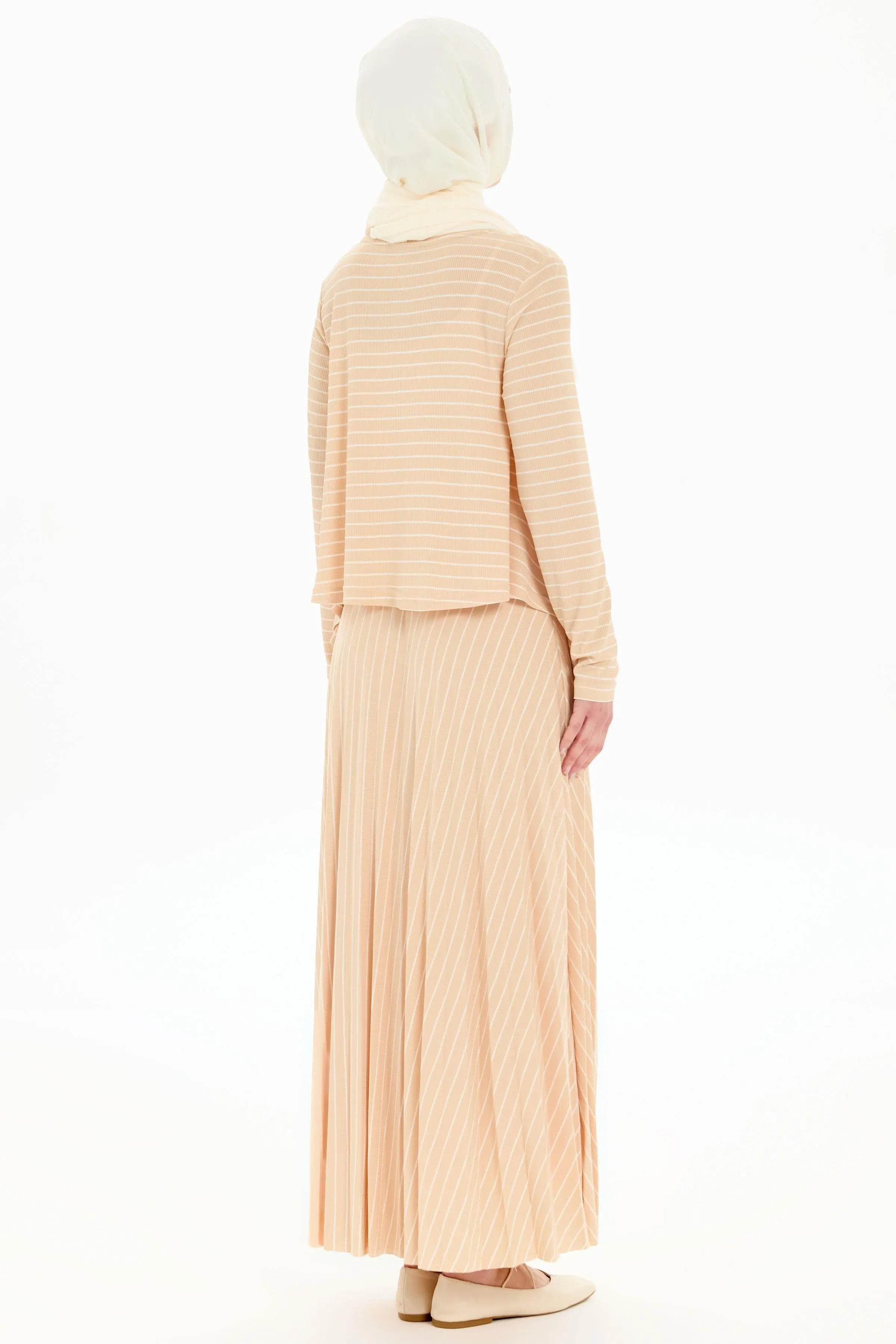 Asymmetric Cut Blouse Striped Suit with Pleated Skirt - Beige