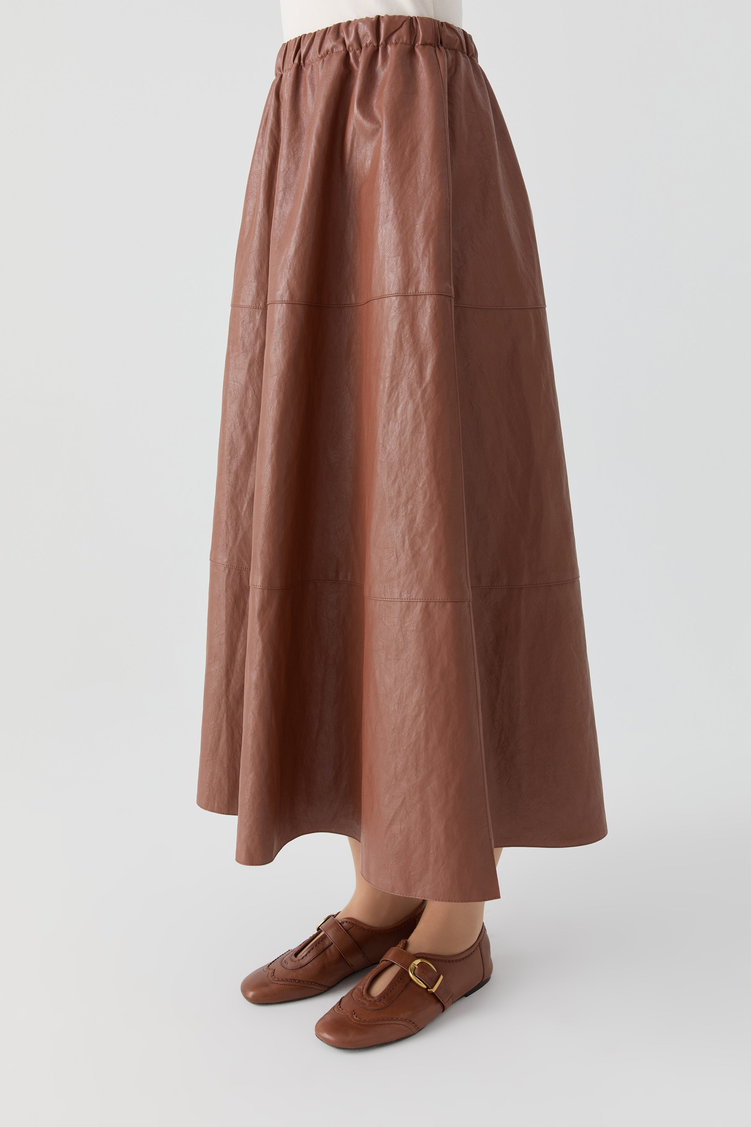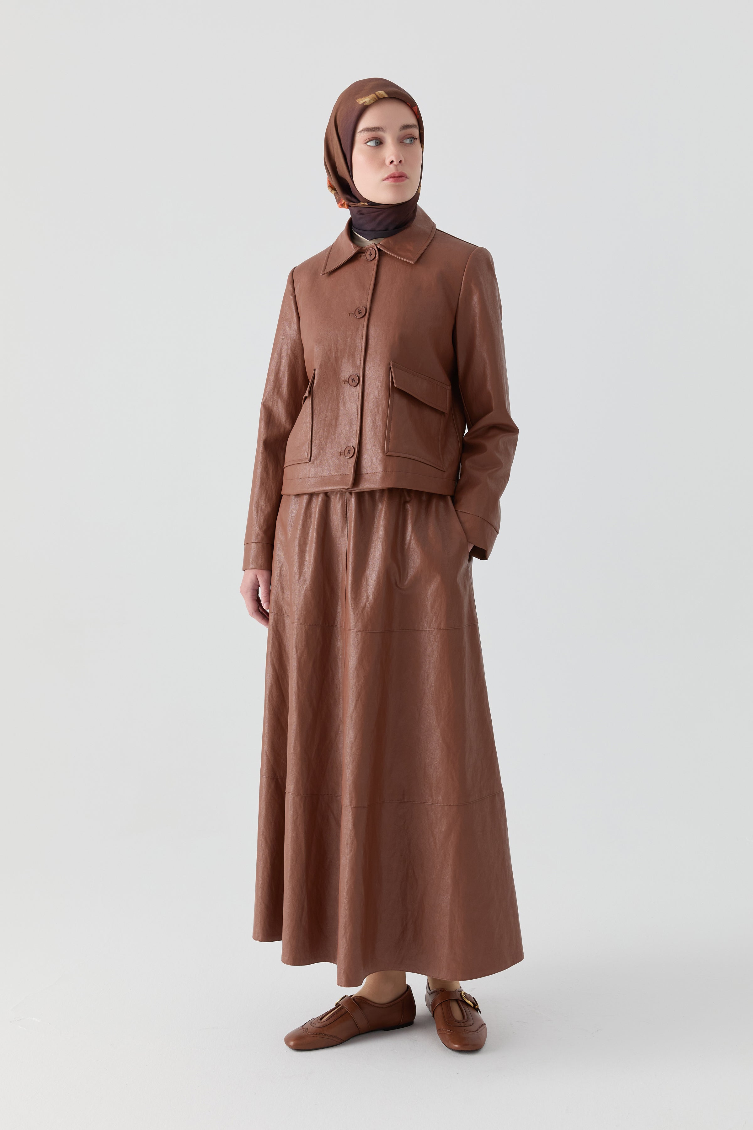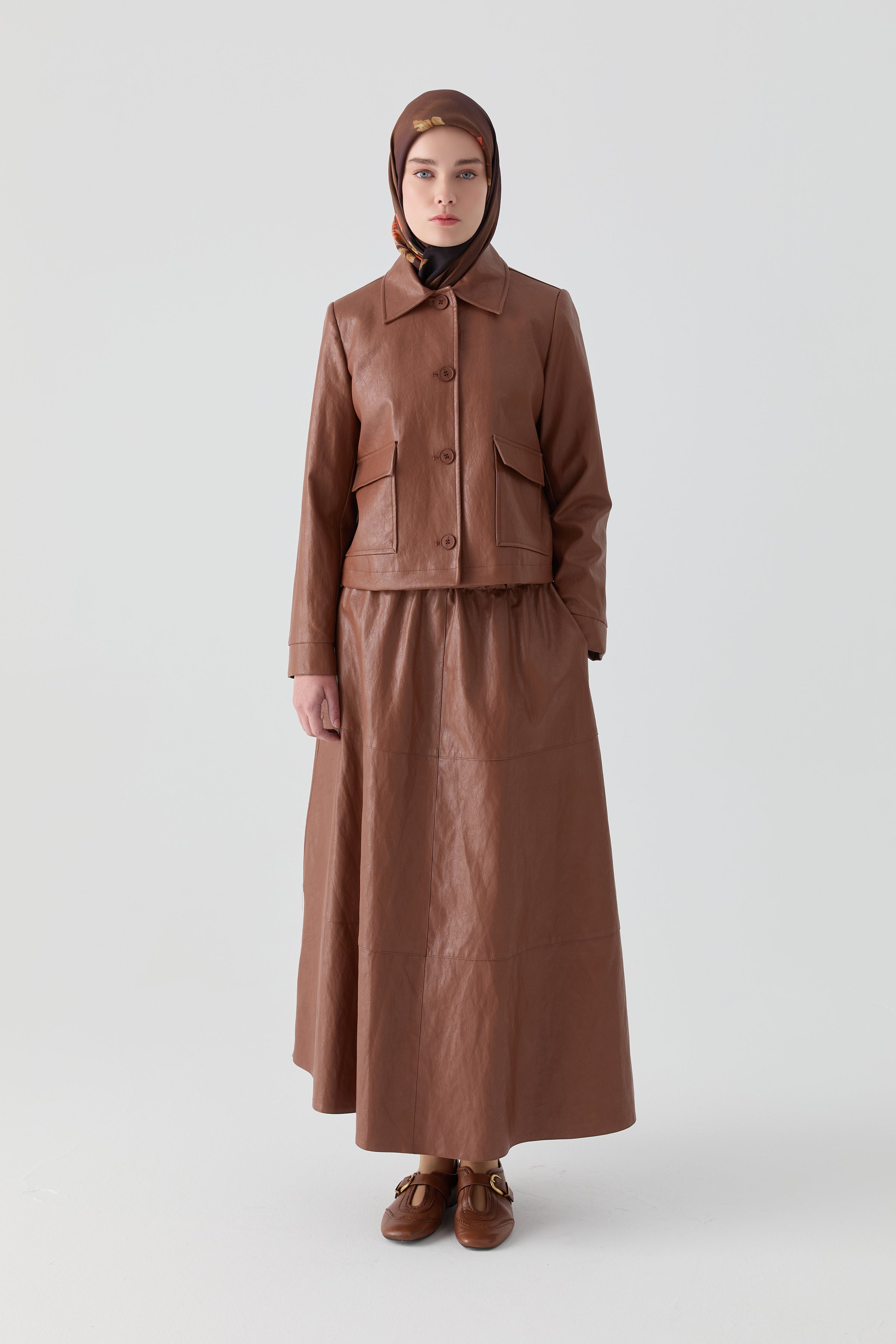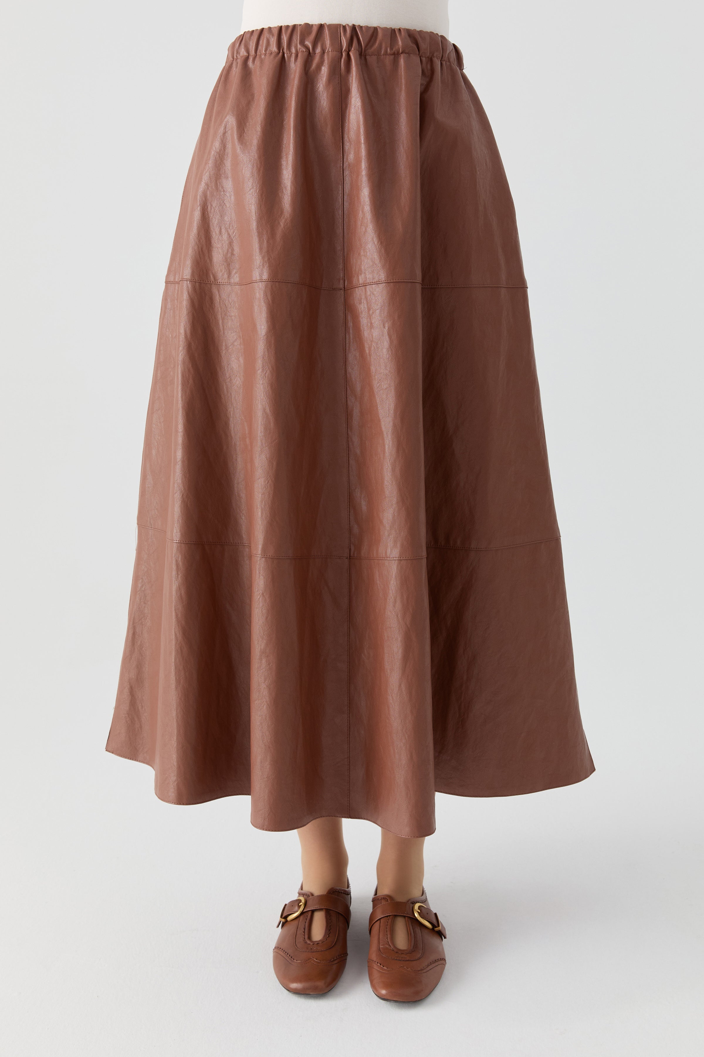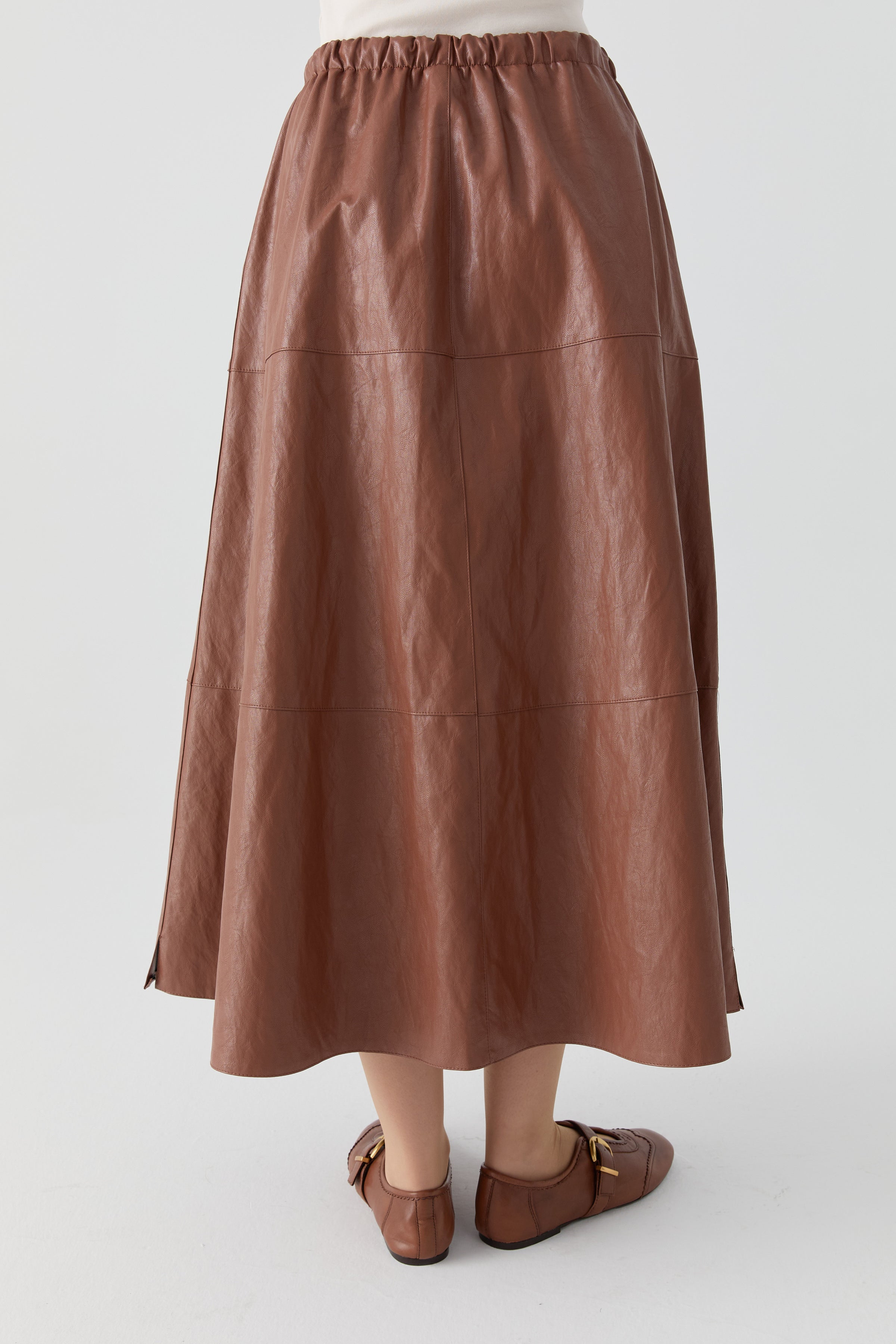 This skirt, with its modern and bold style, adds a bold character to the classic leather look with its lace-up design. Its elegant fit offers a feminine silhouette, while its glossy texture highlights its elegance.