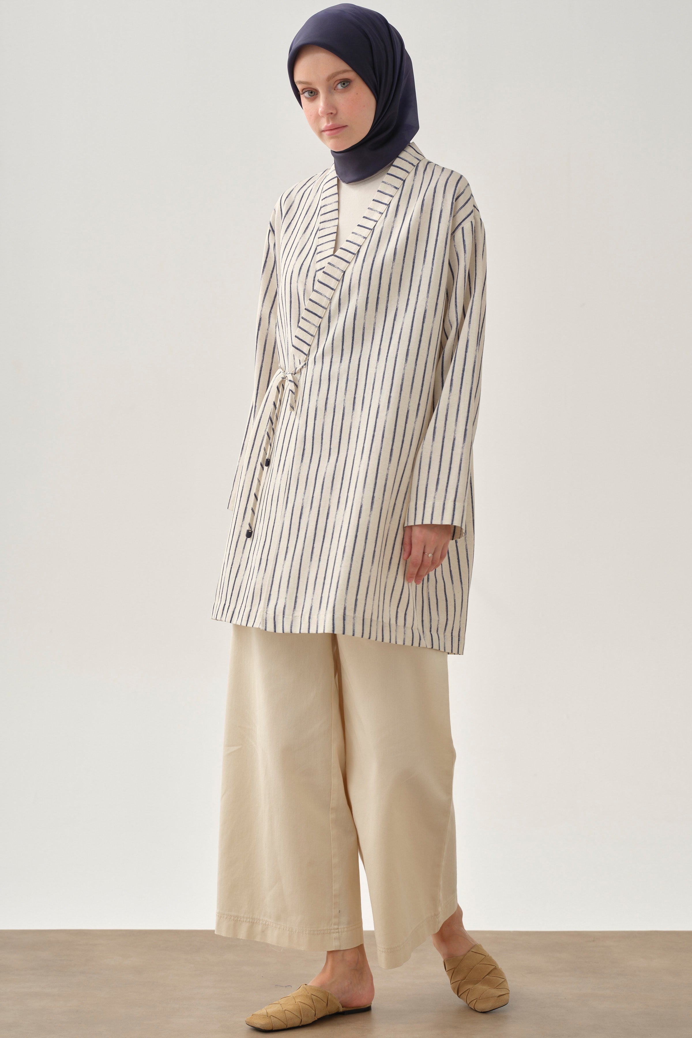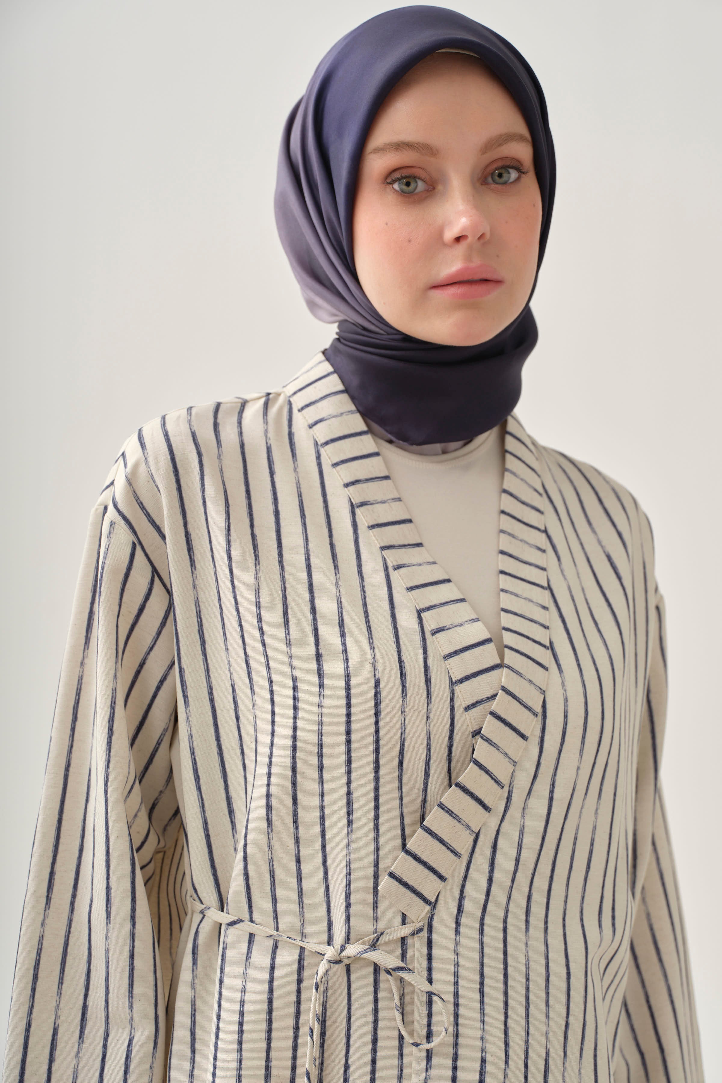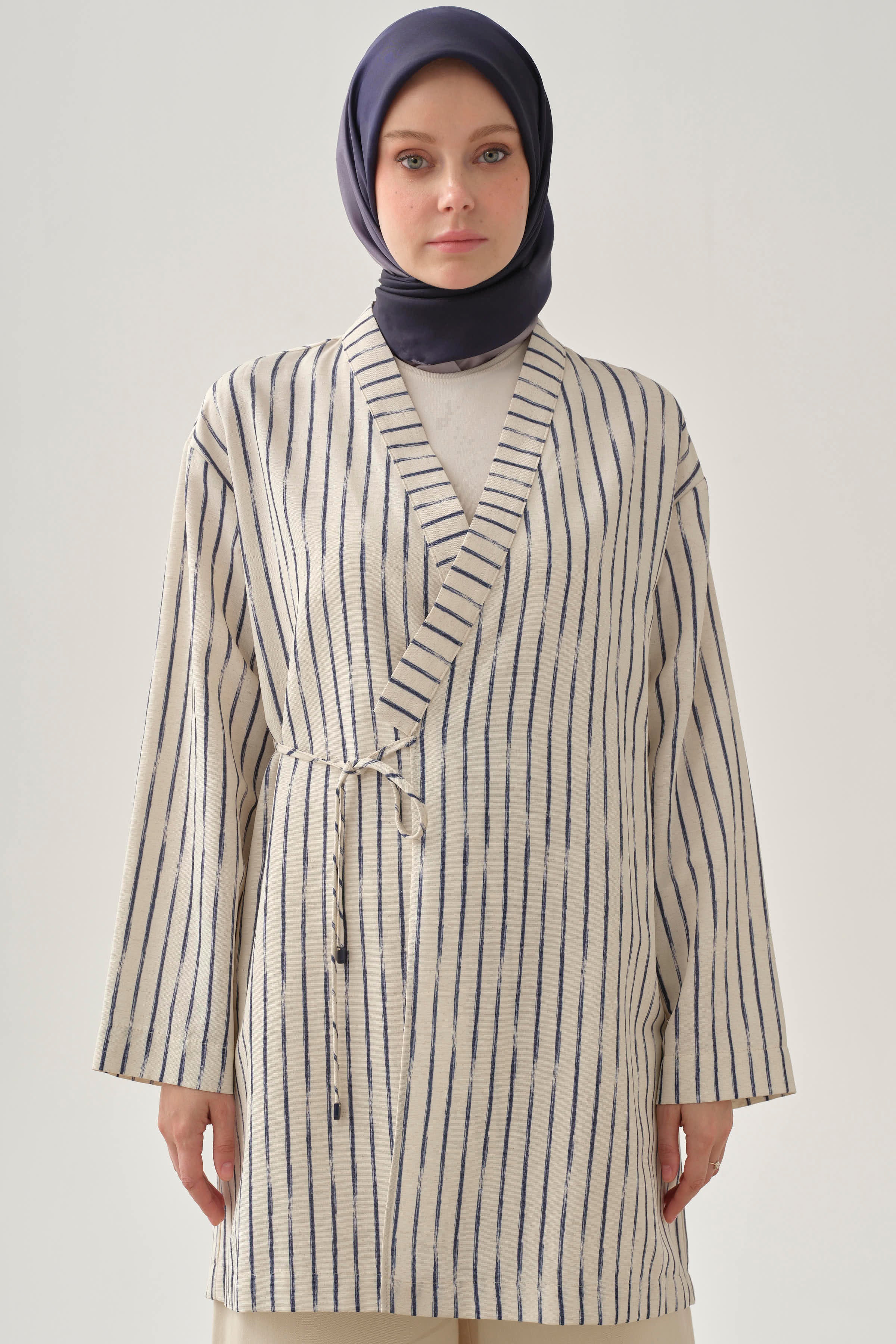 This kimono, which gains dynamism with its striped pattern, gives an elegant form to the body with its binding detail. It is an ideal and stylish complement for layered looks.