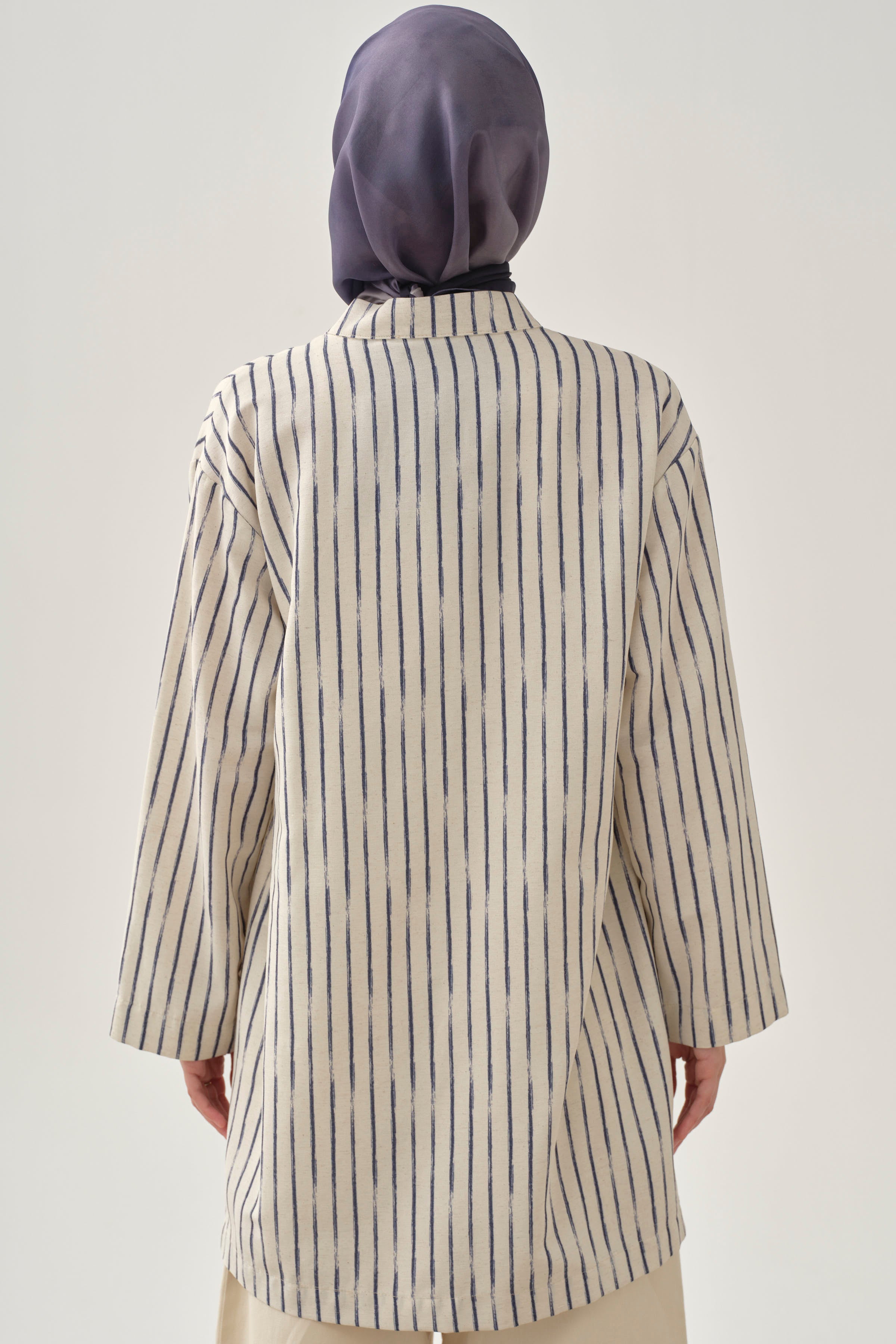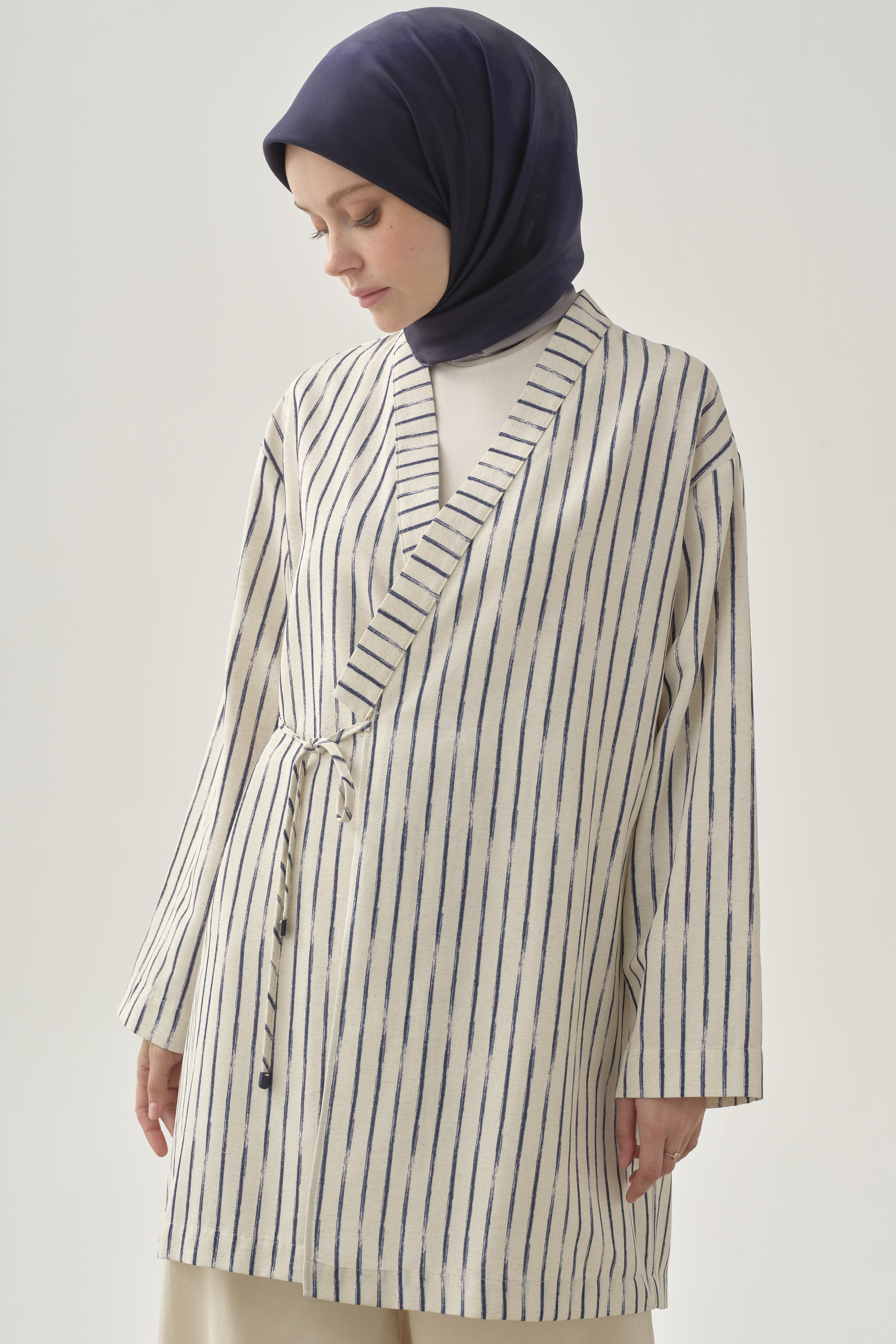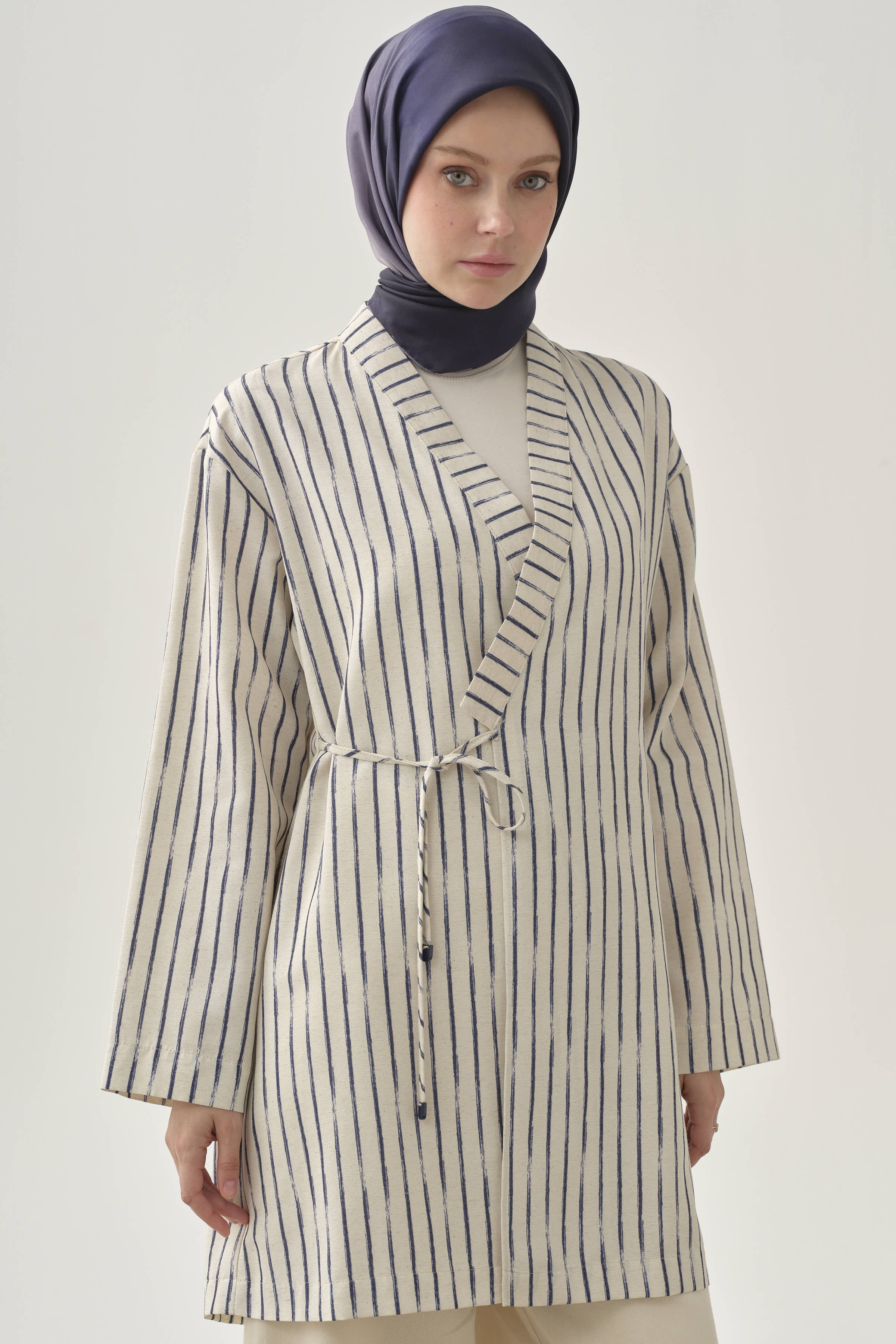 This kimono, which gains dynamism with its striped pattern, gives an elegant form to the body with its binding detail. It is an ideal and stylish complement for layered looks.
