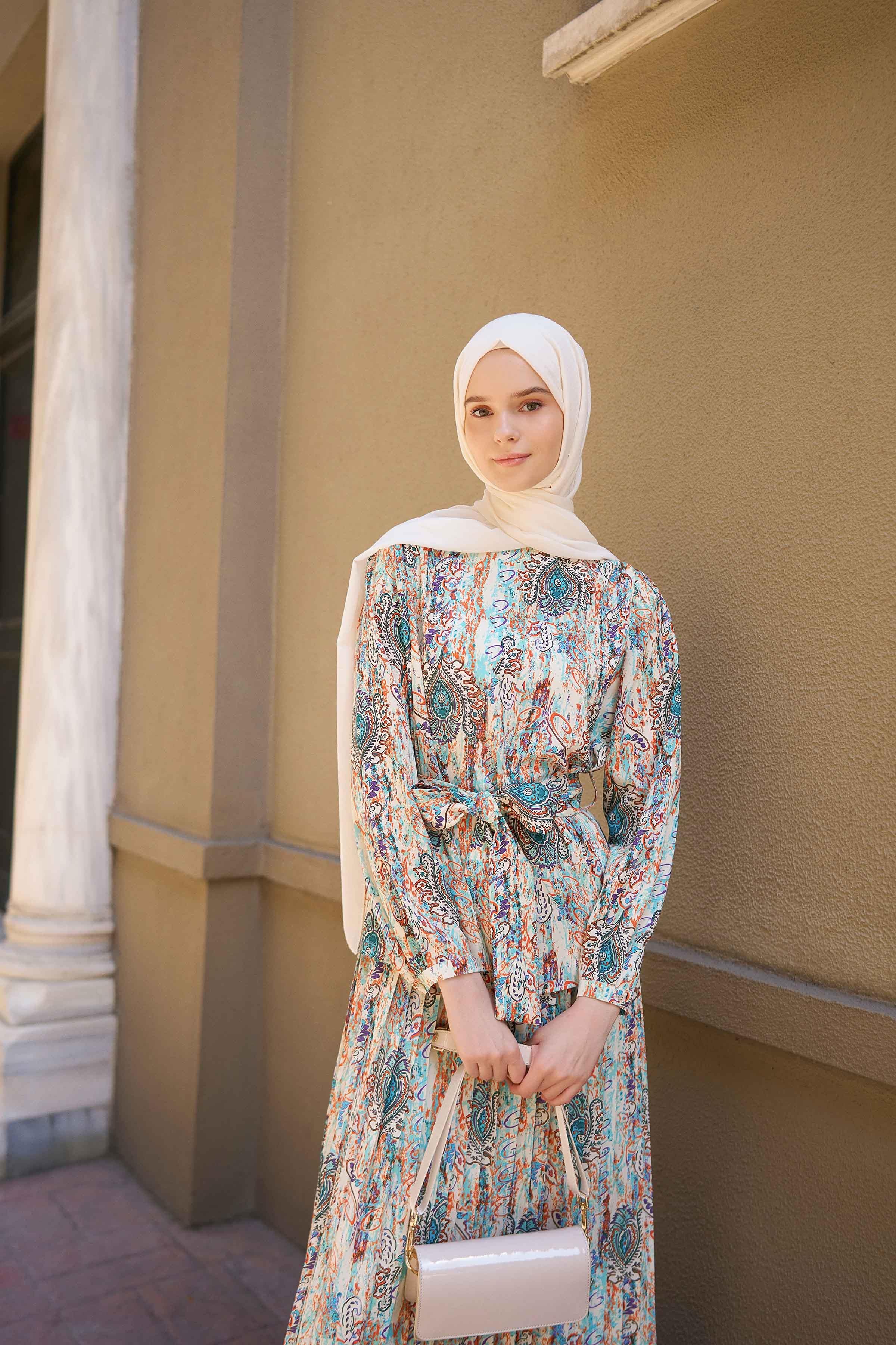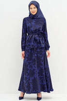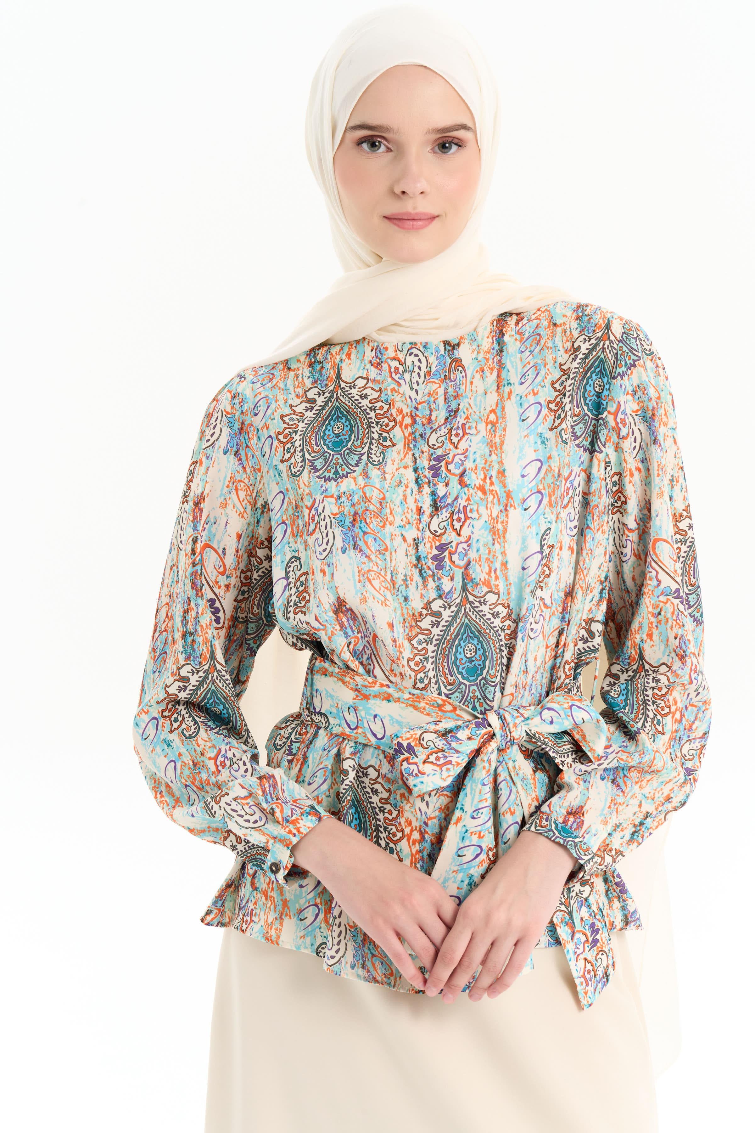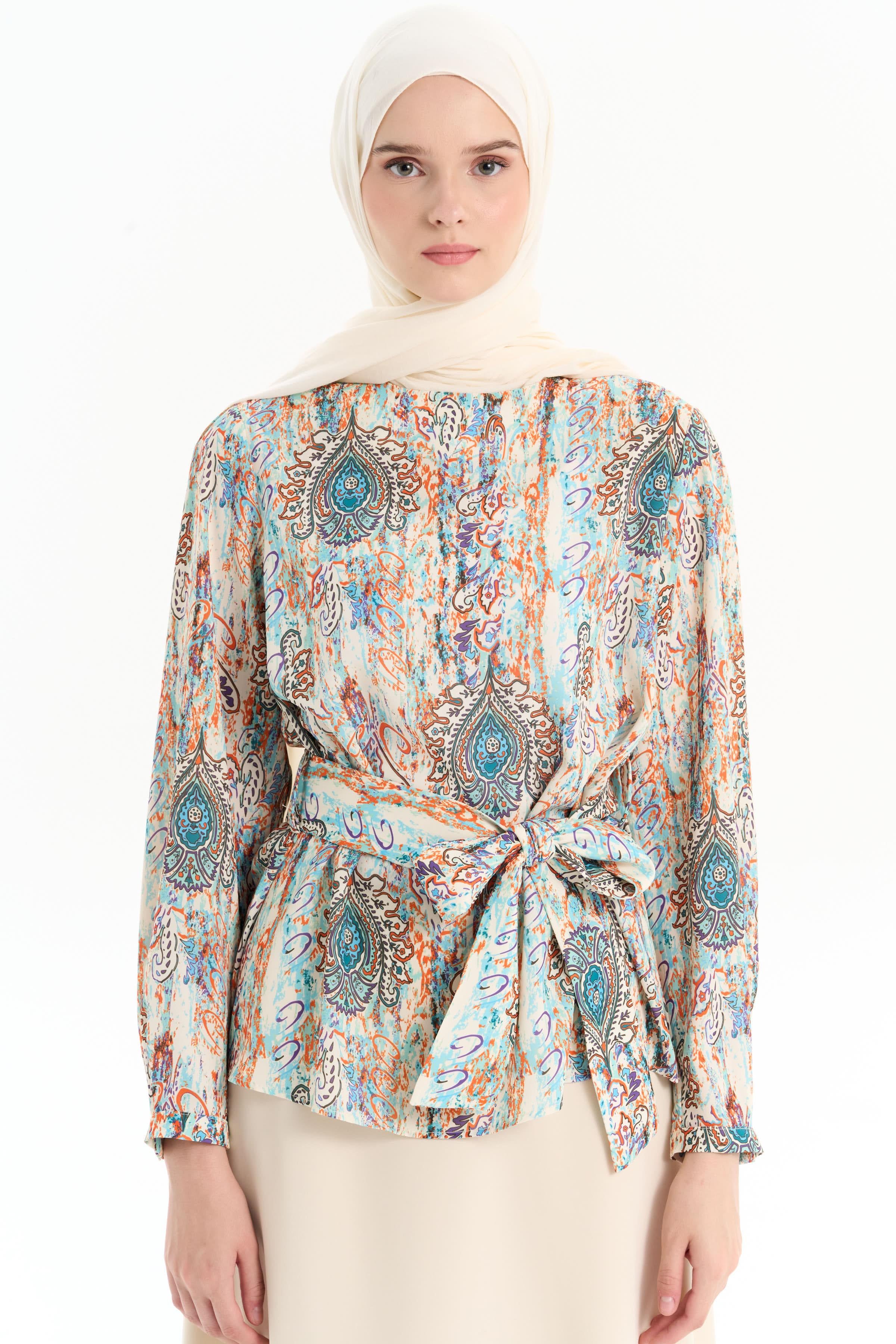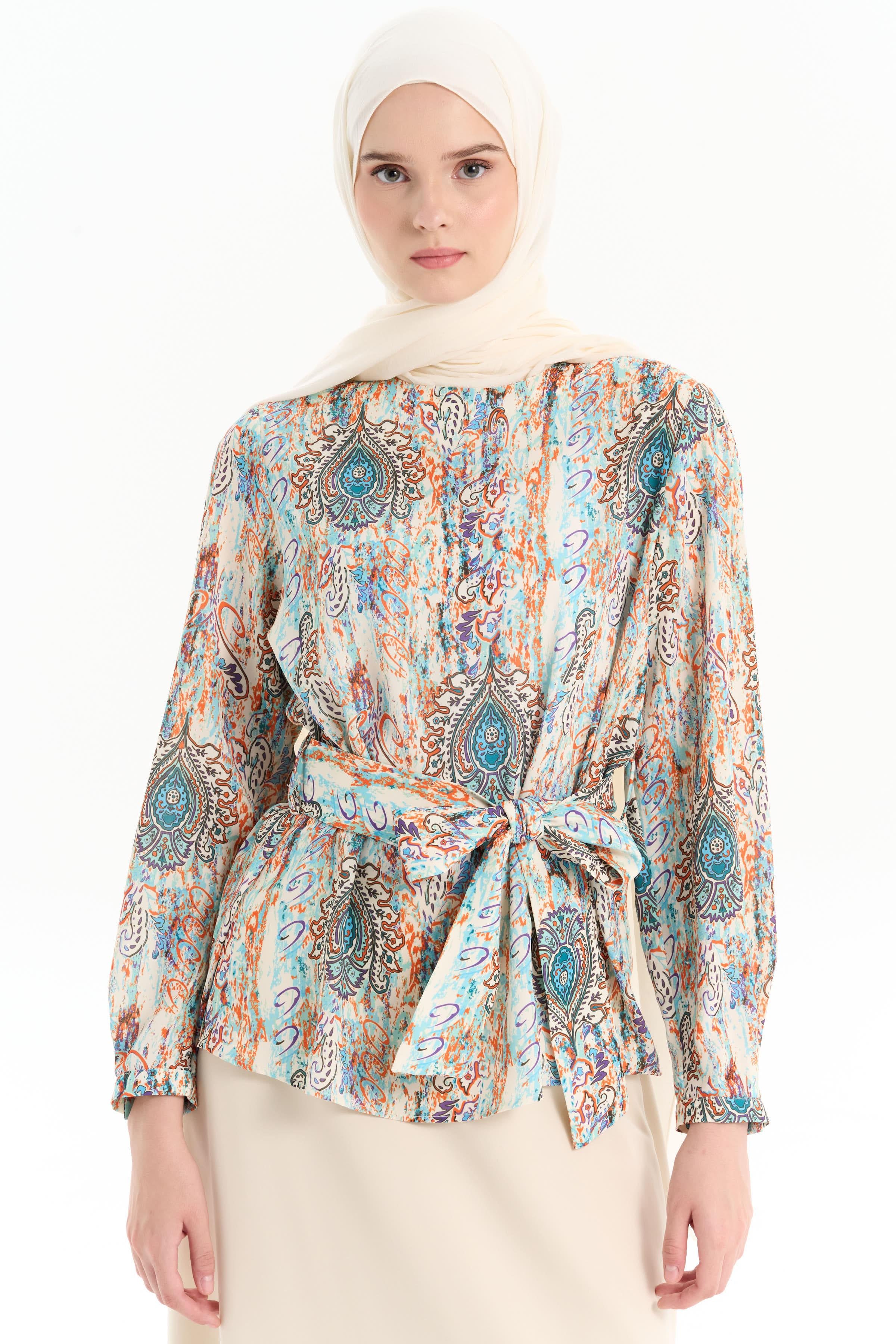 This set, consisting of a belted blouse and a matching skirt, offers an elegant and stylish look with its patterned texture. The flowing cut and belt detail gracefully accentuate figure curves while providing comfortable wear.