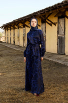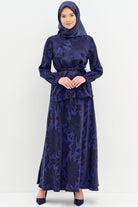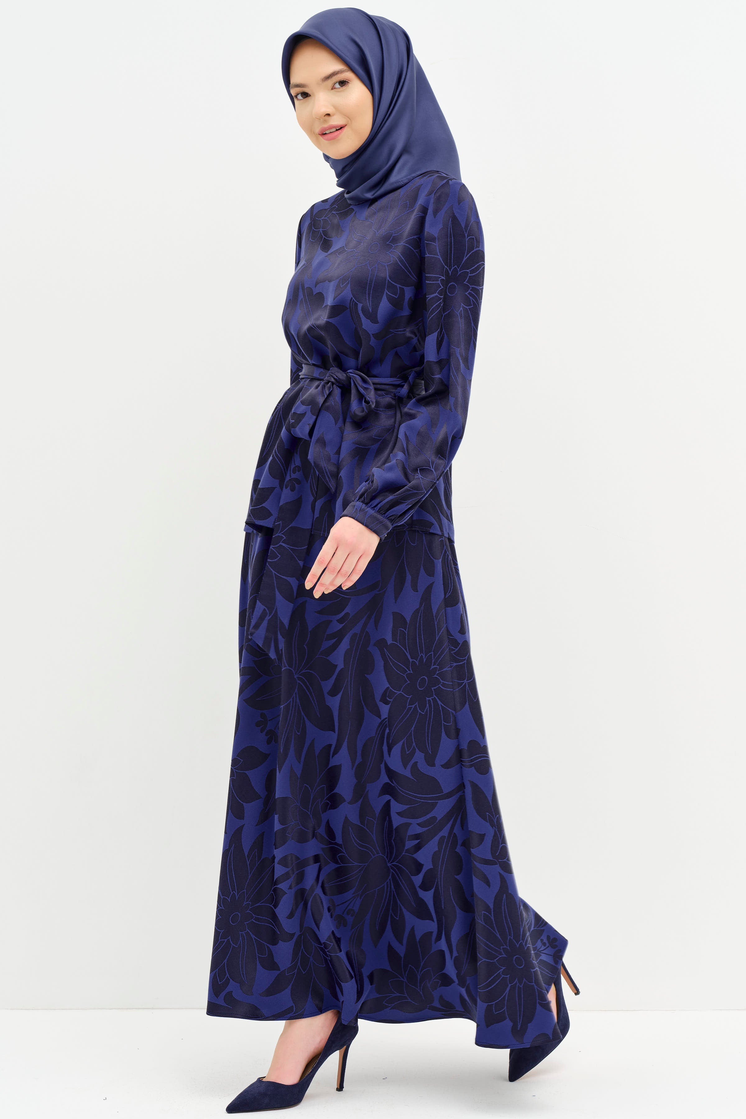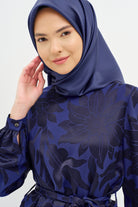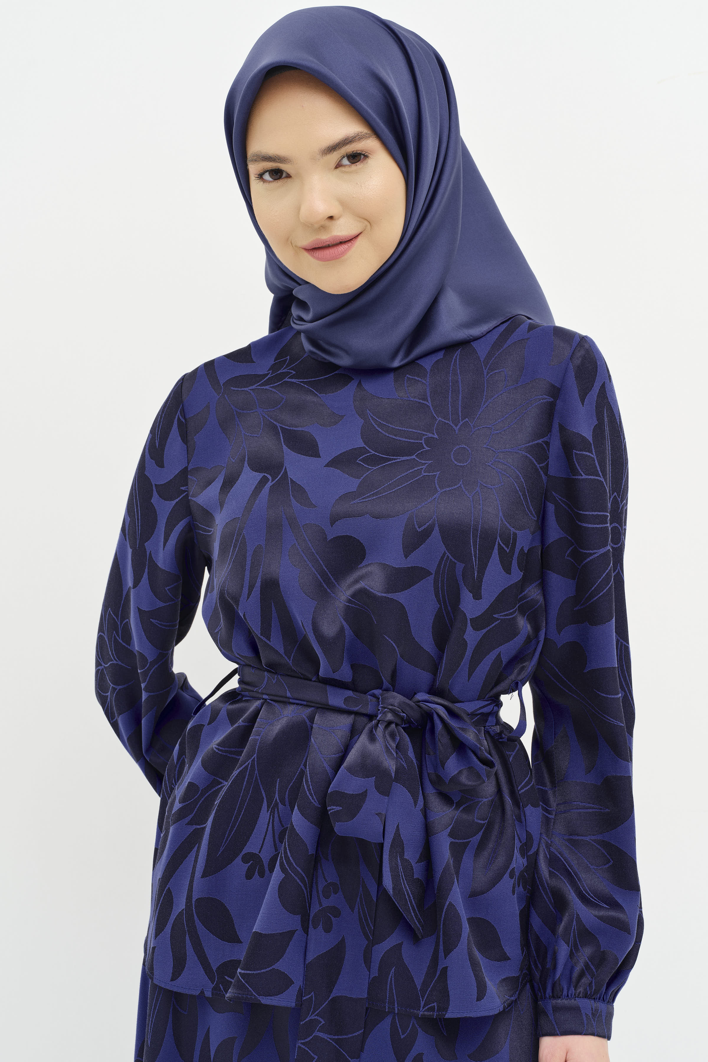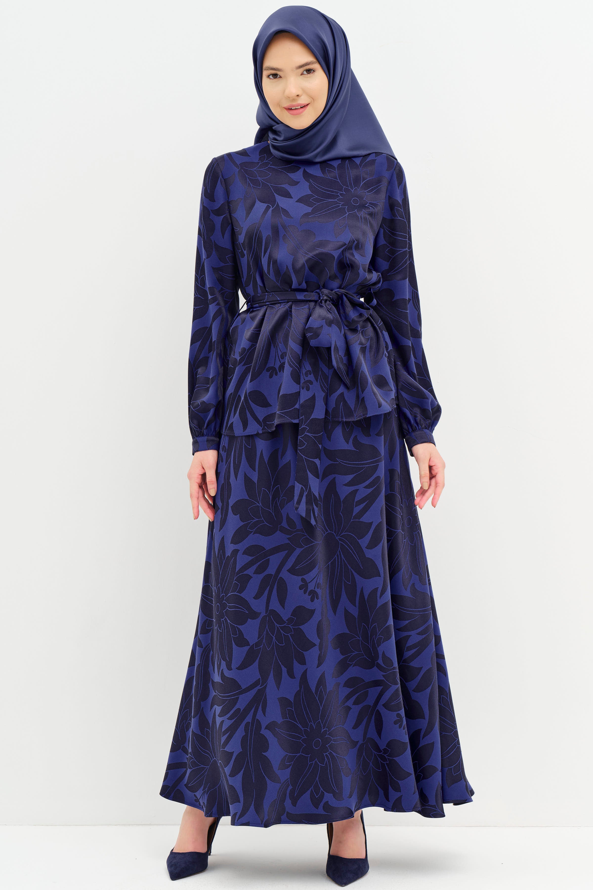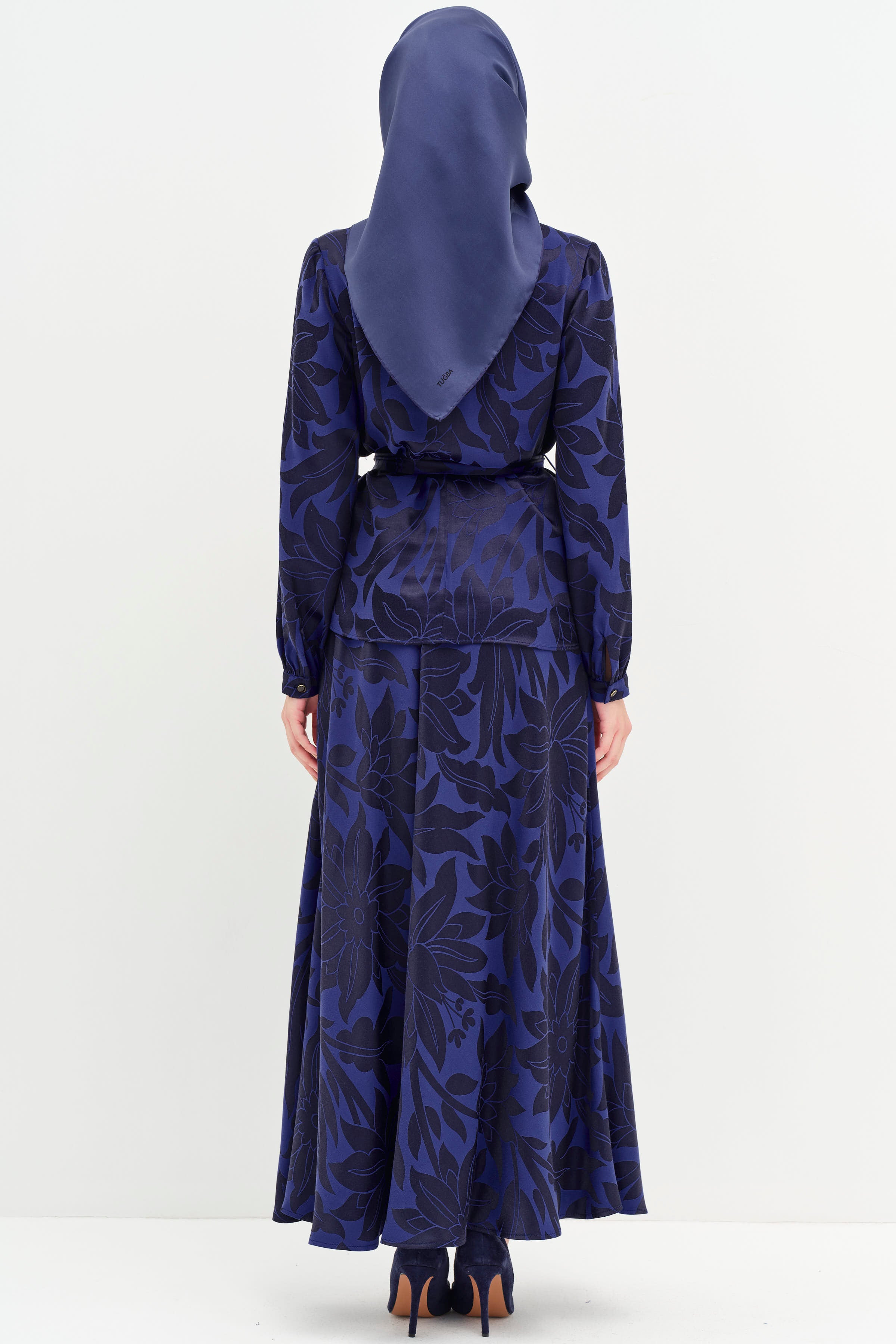 Waist Belted Patterned Blouse Skirt Set - Indigo