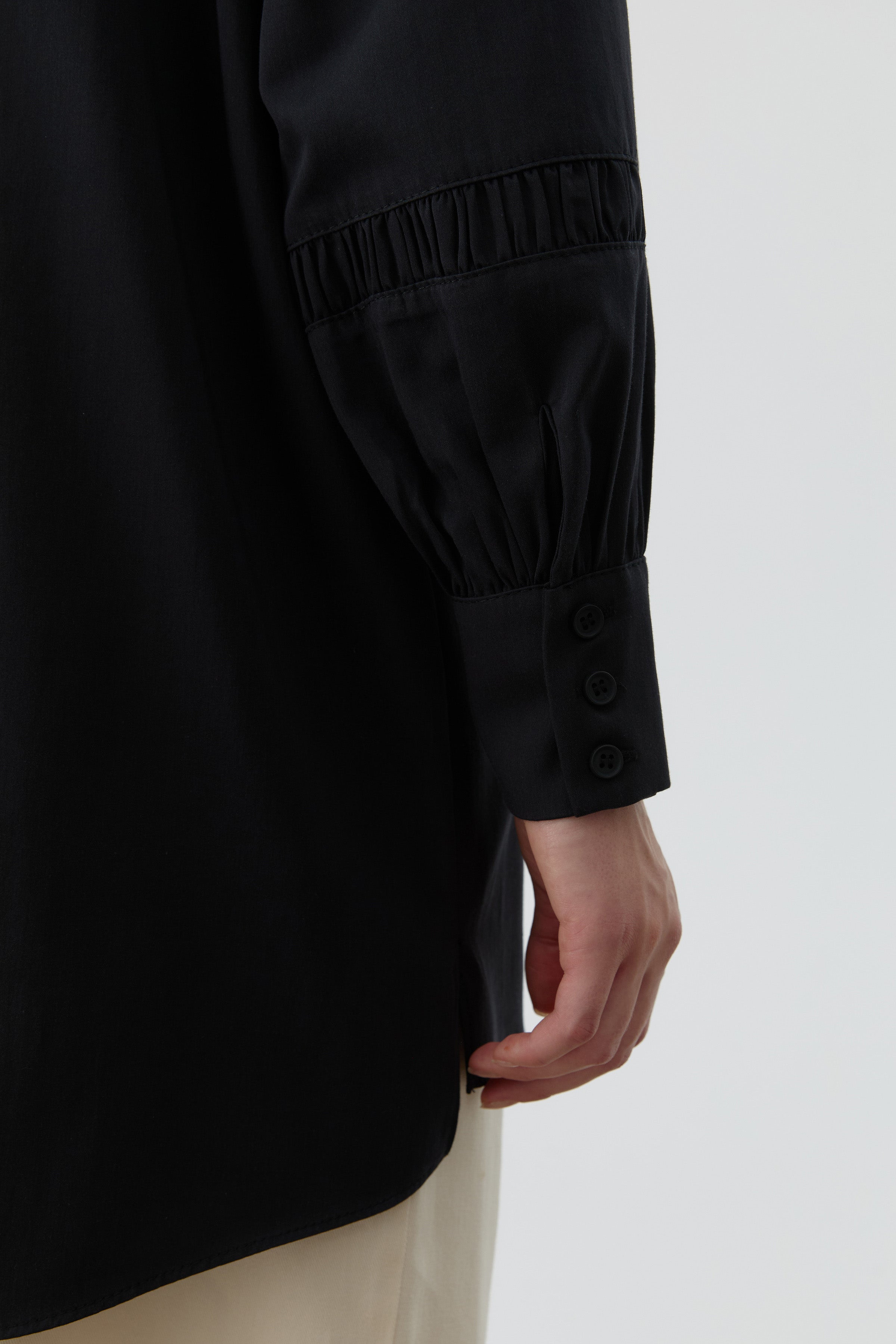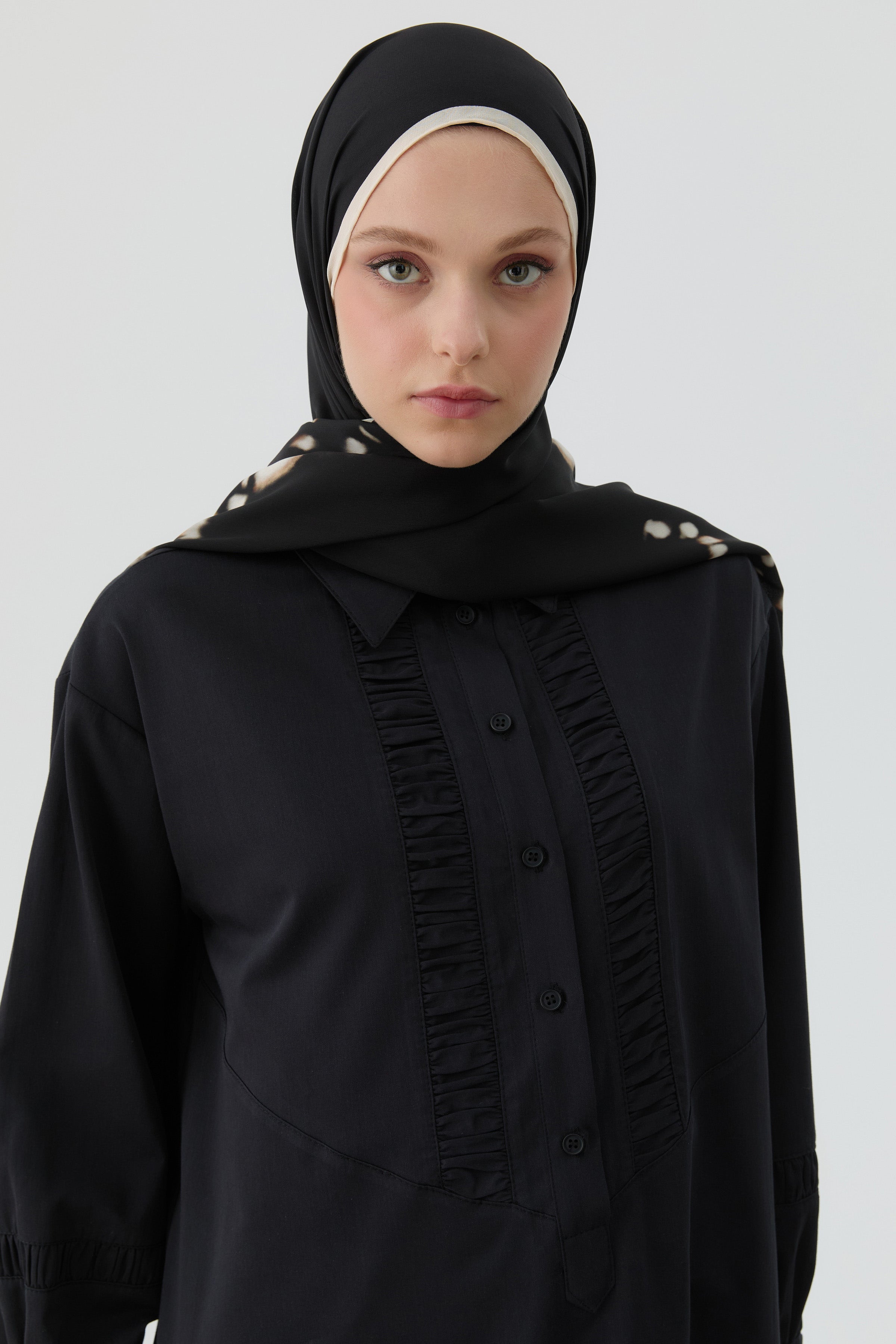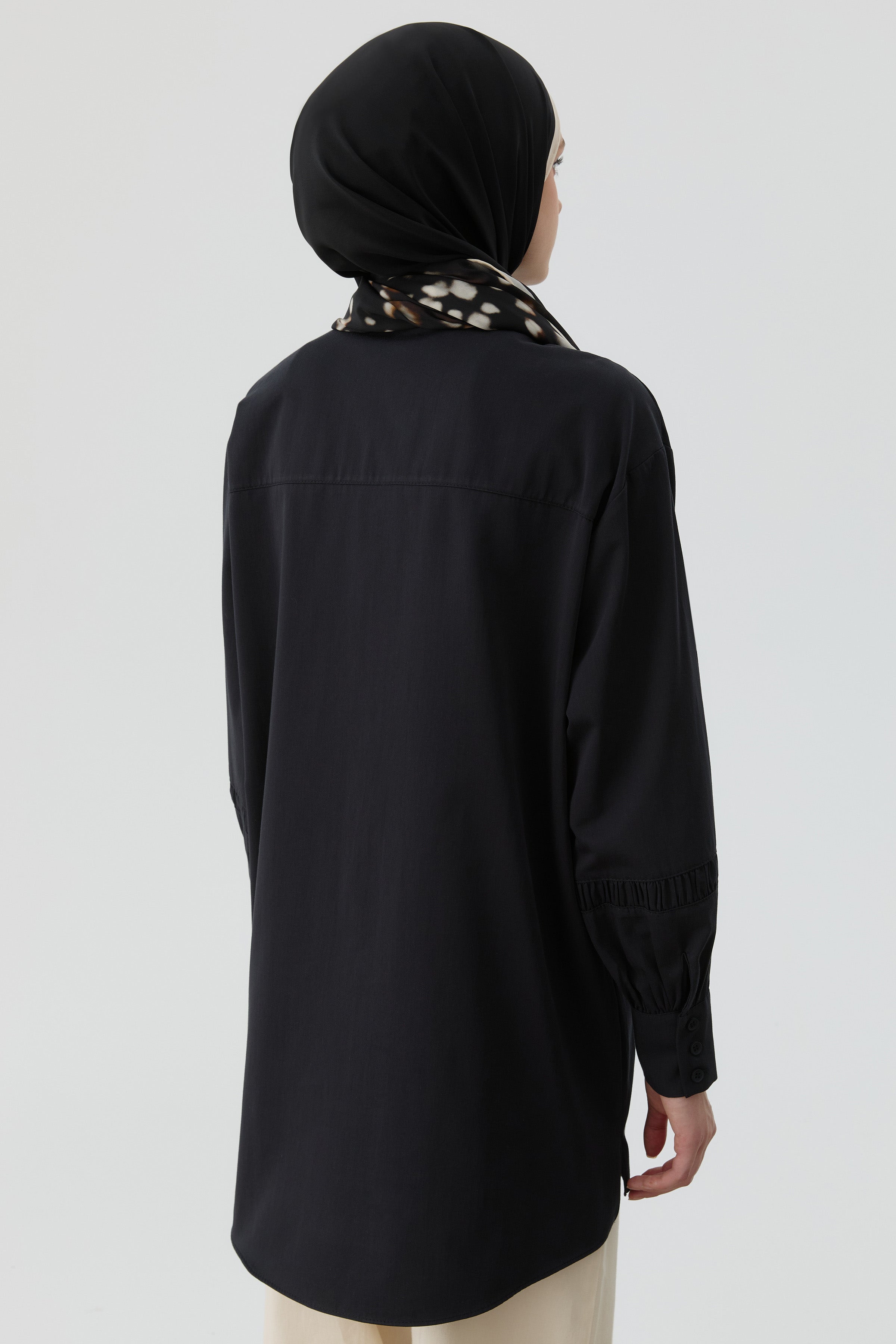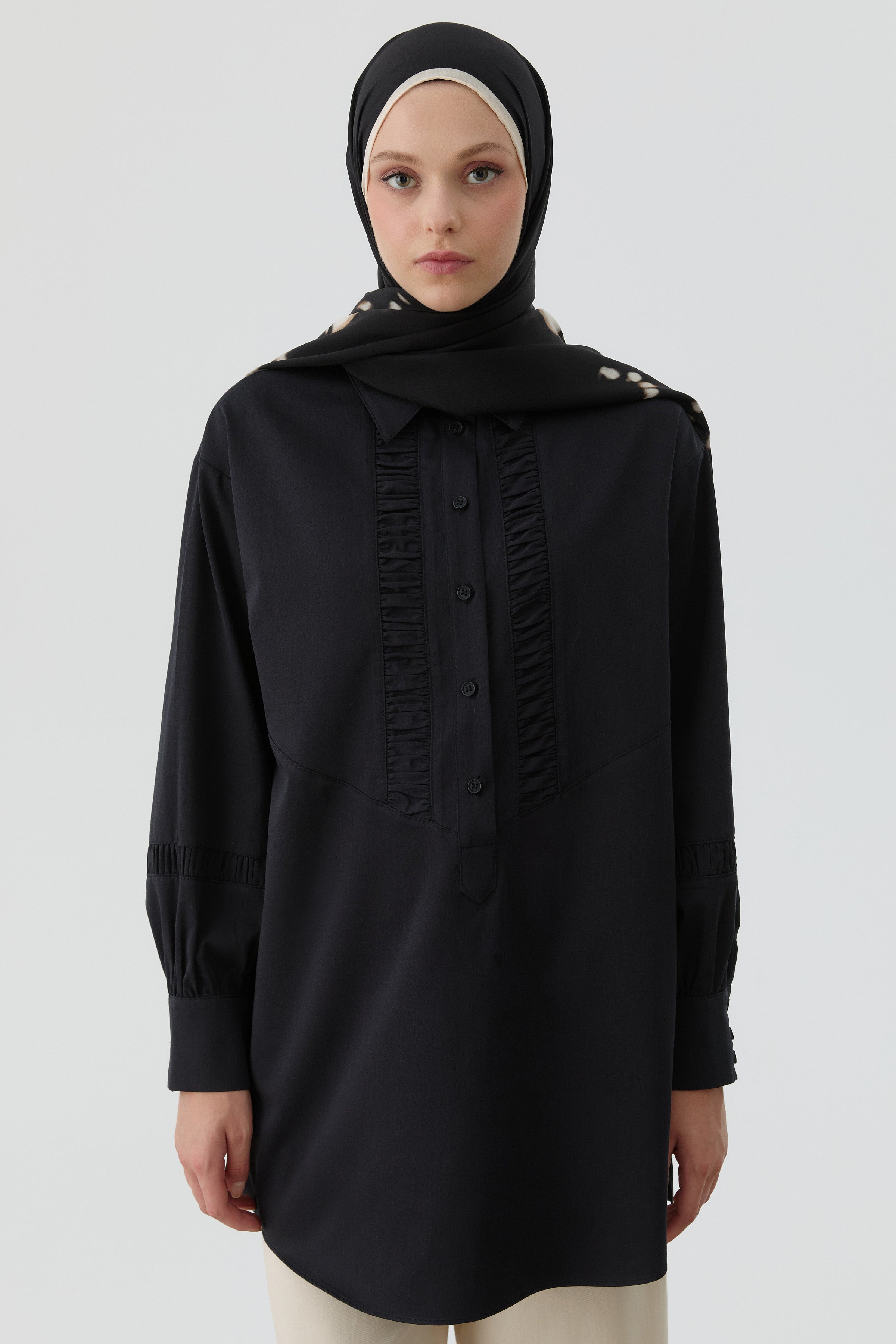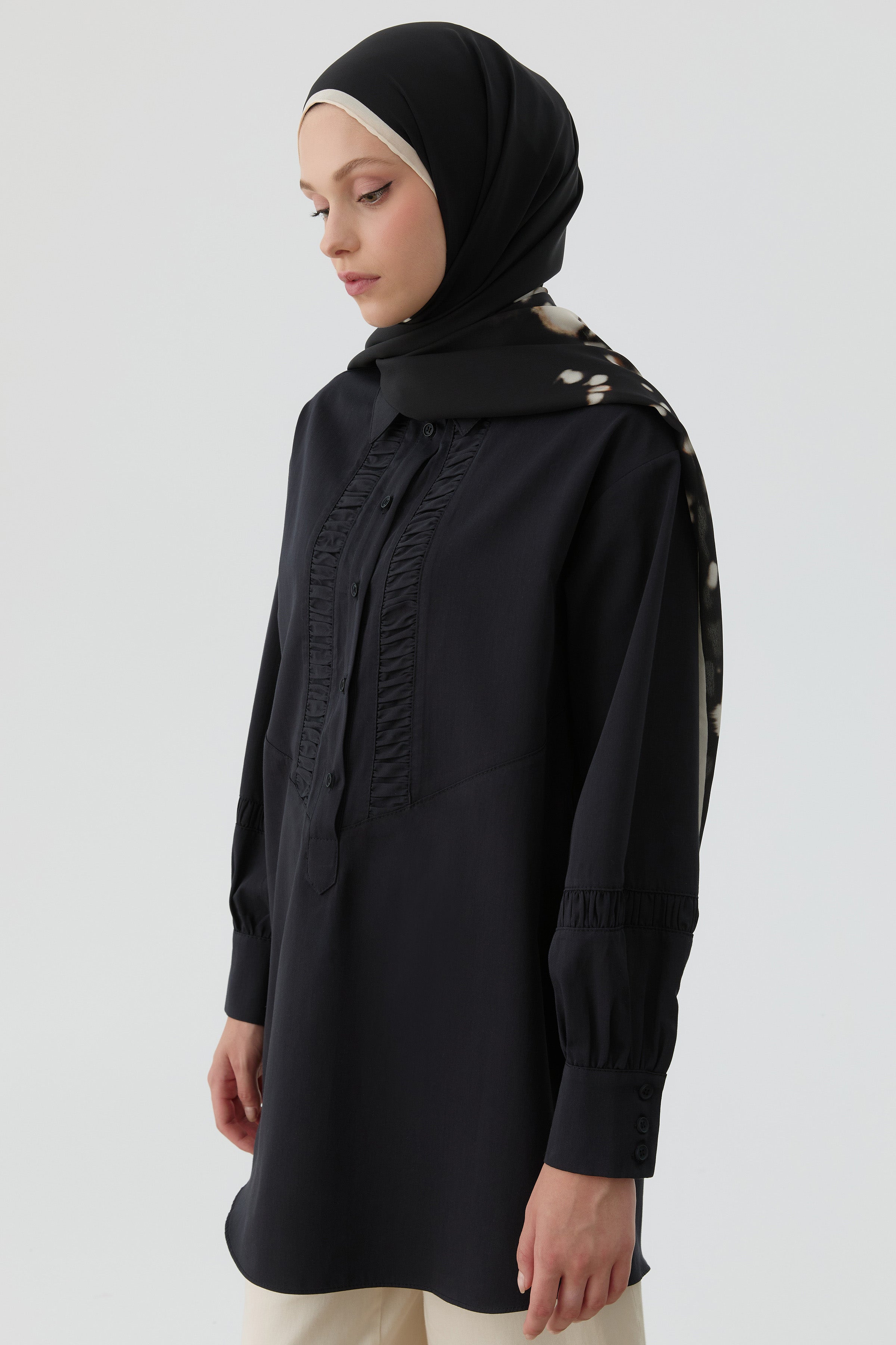 This tunic, which gains movement with its cut-out details and gathers around the shoulders and collar, adds a dynamic touch to the simple look.