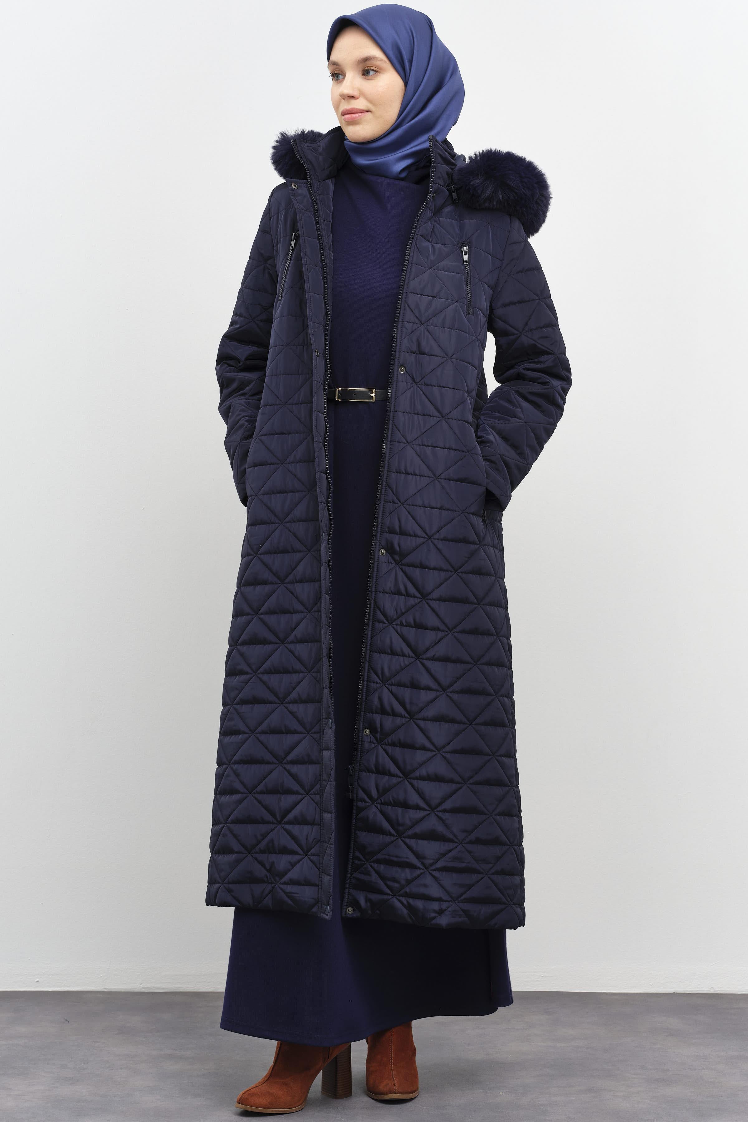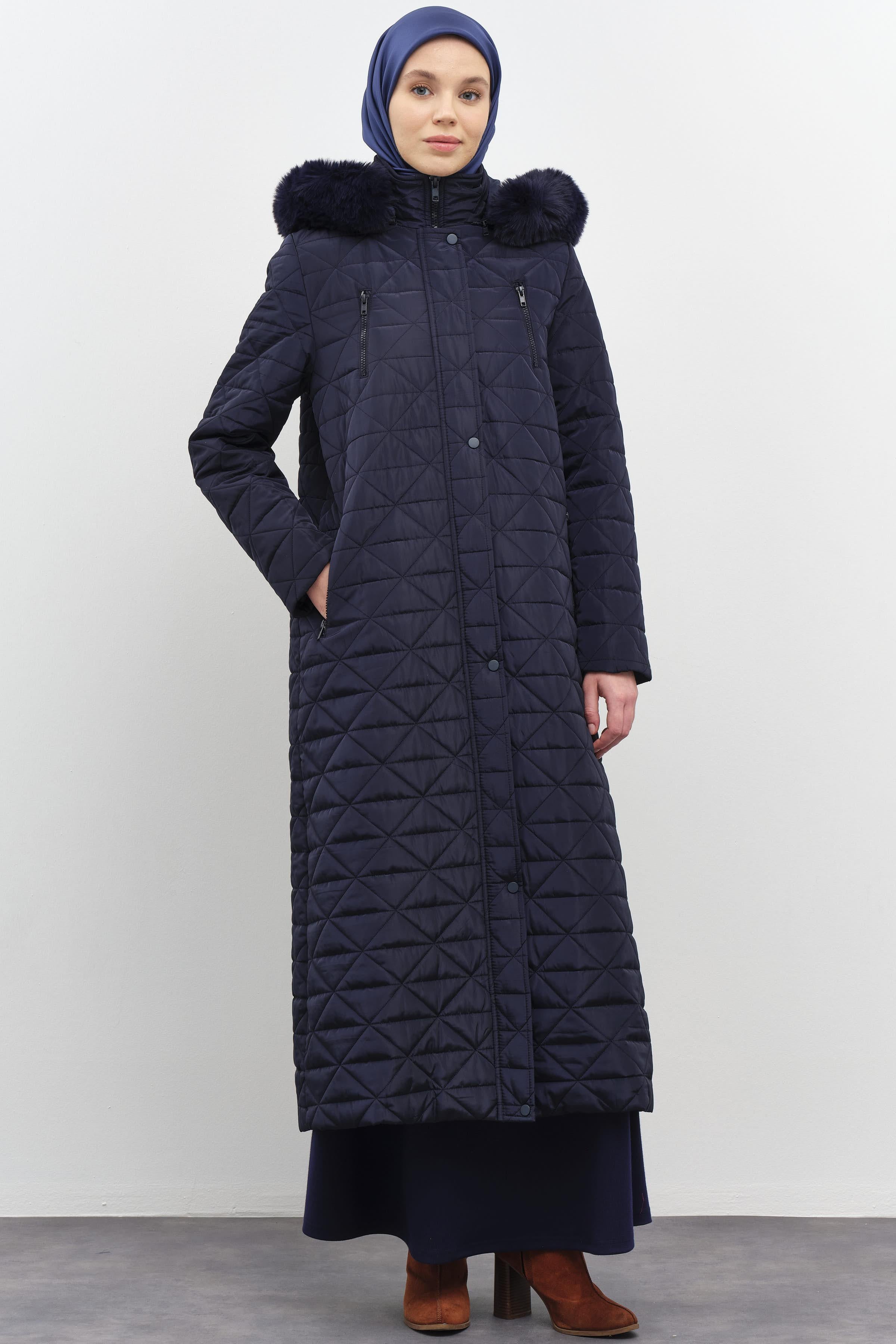 Zipper Pocket Detailed Hooded Quilted Coat - Indigo