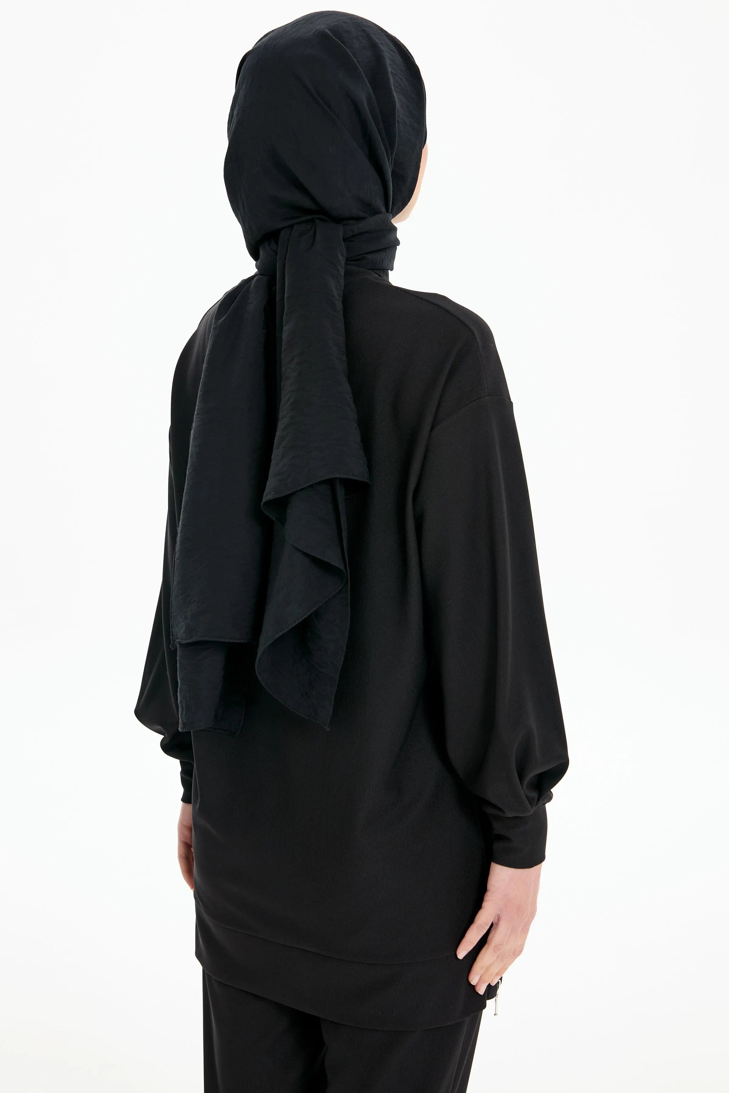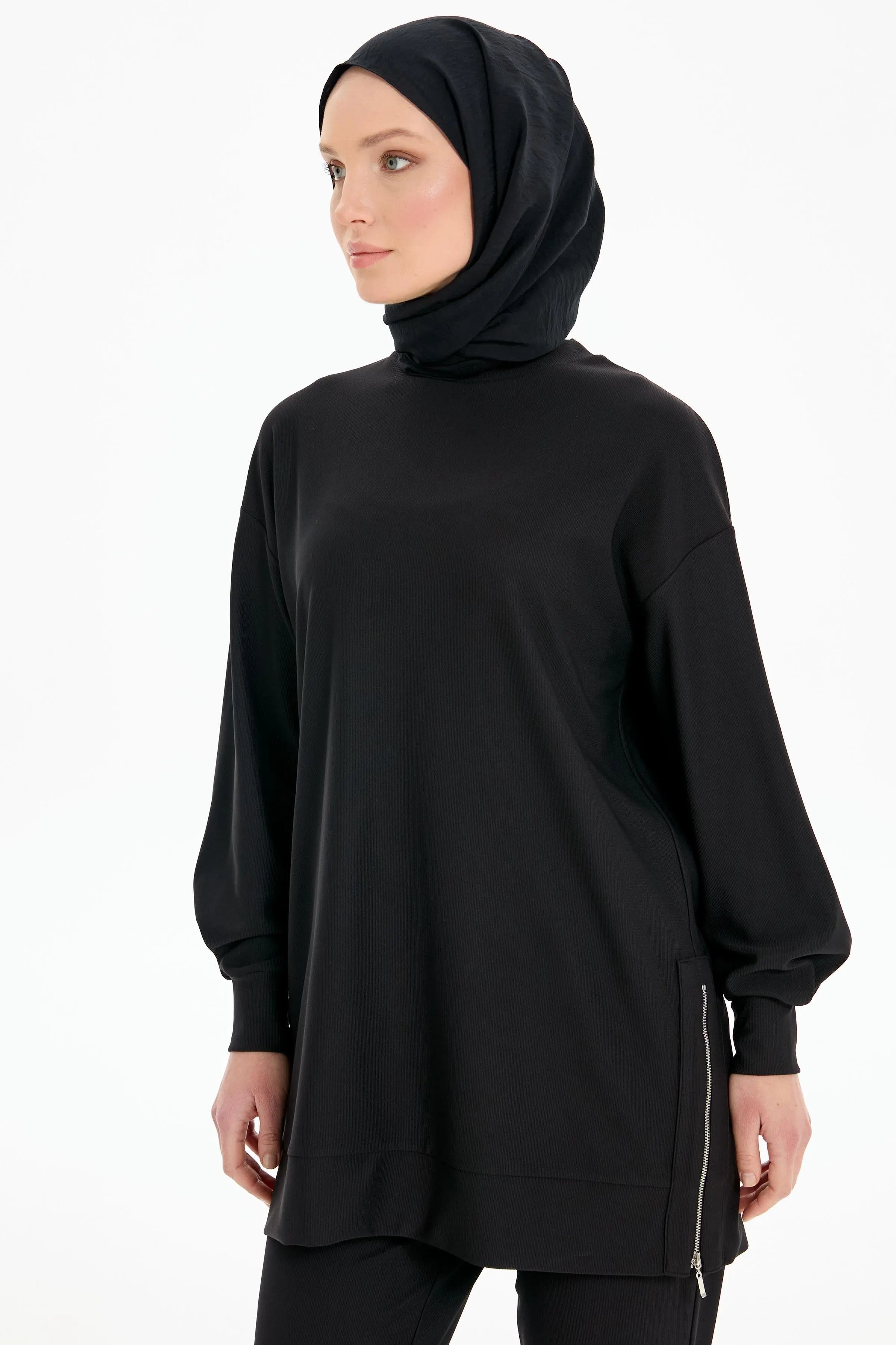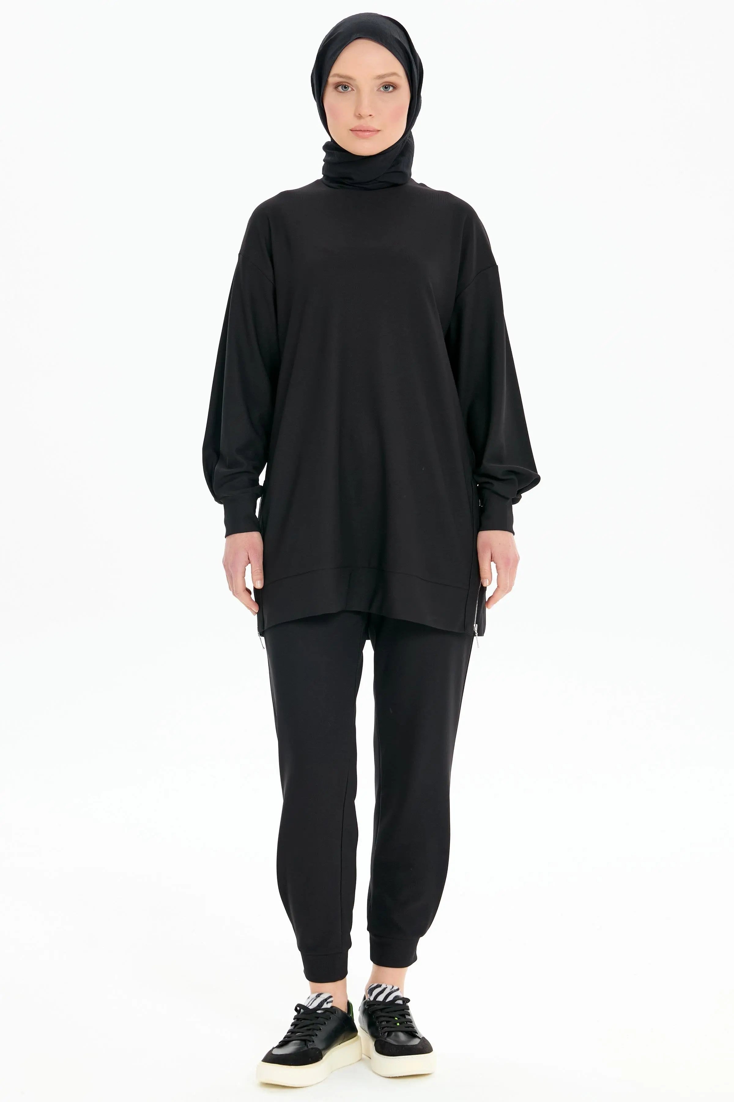 Zipper Slit Knitted Tunic Trouser Set - Black