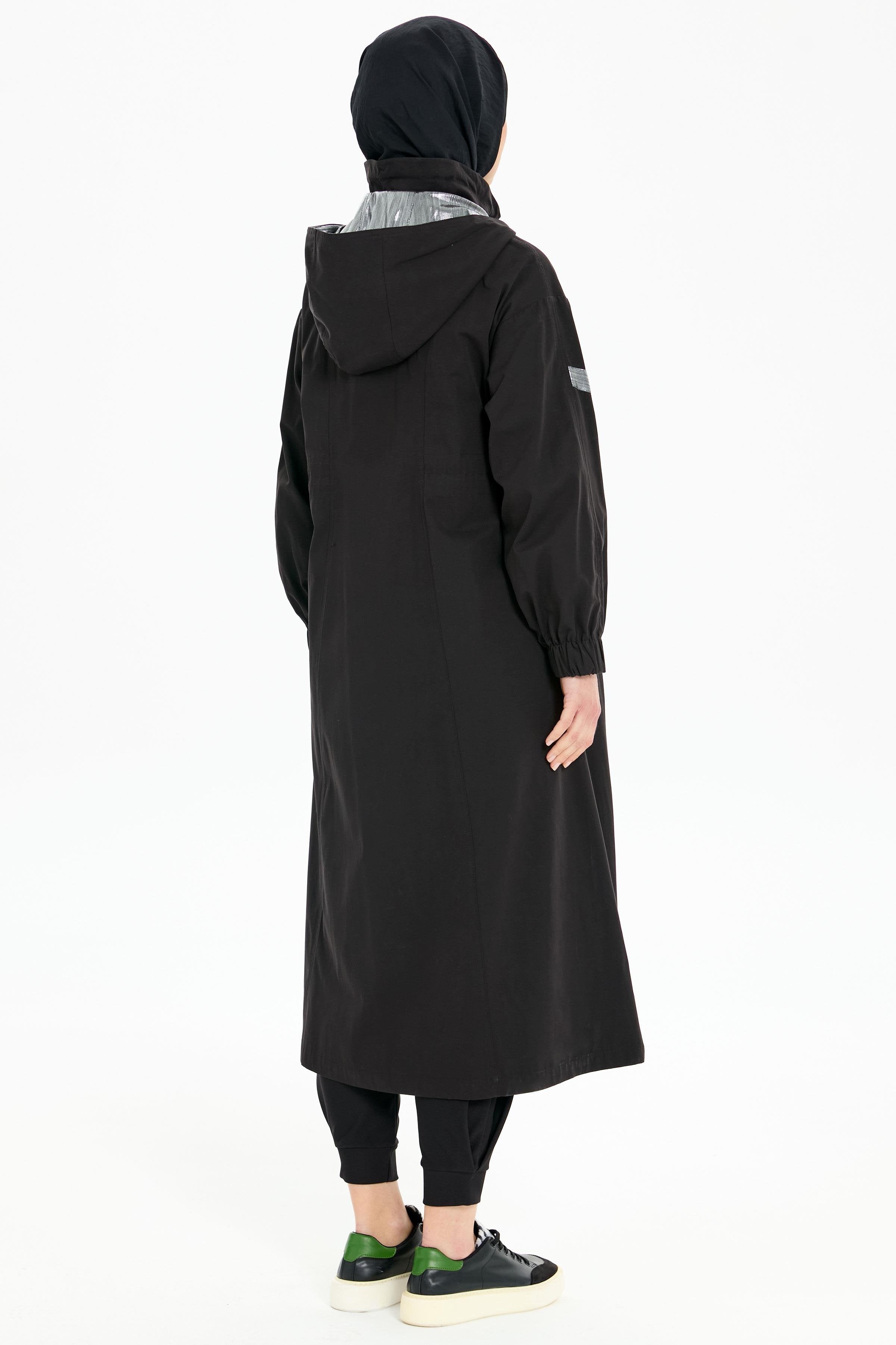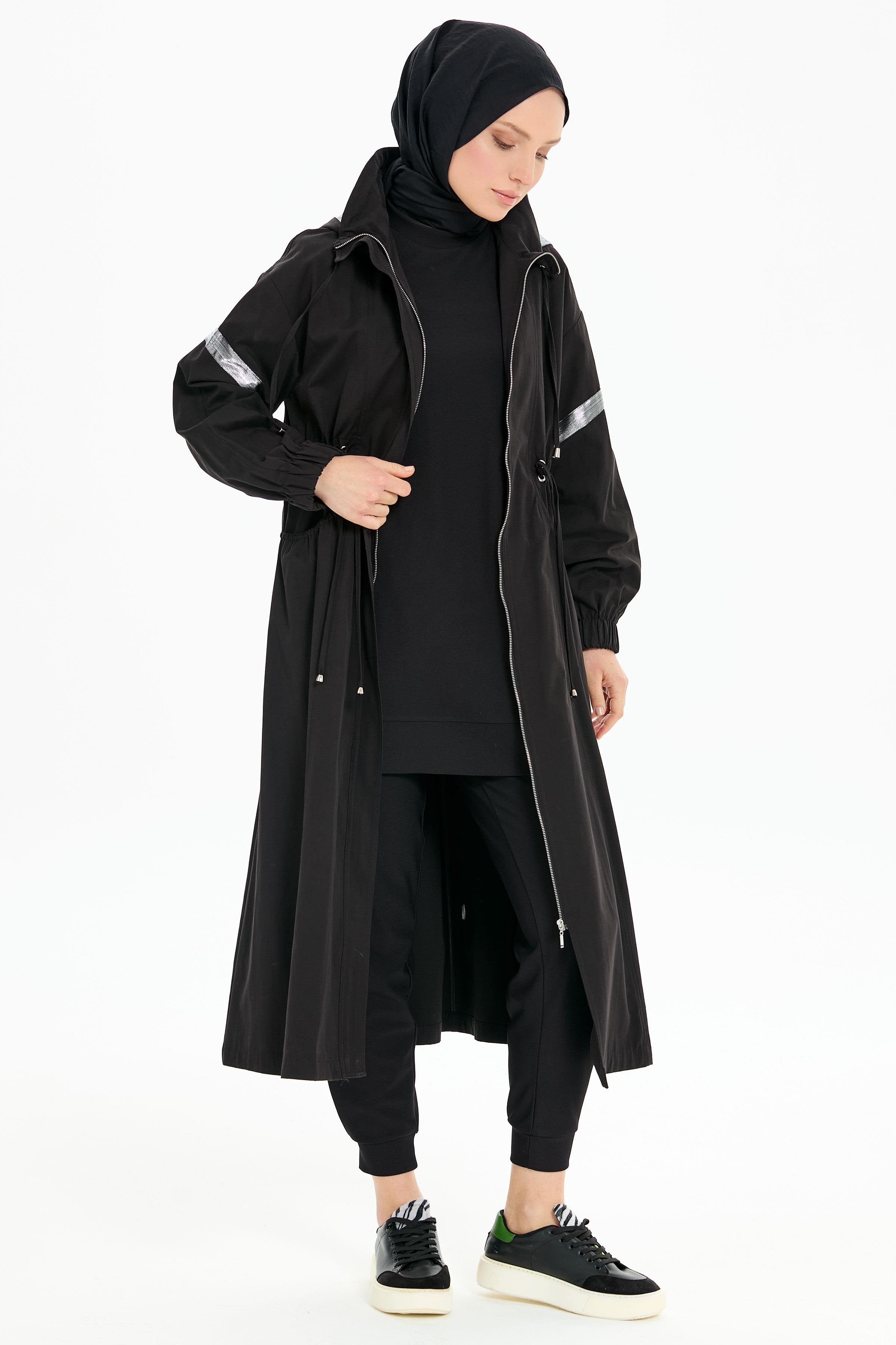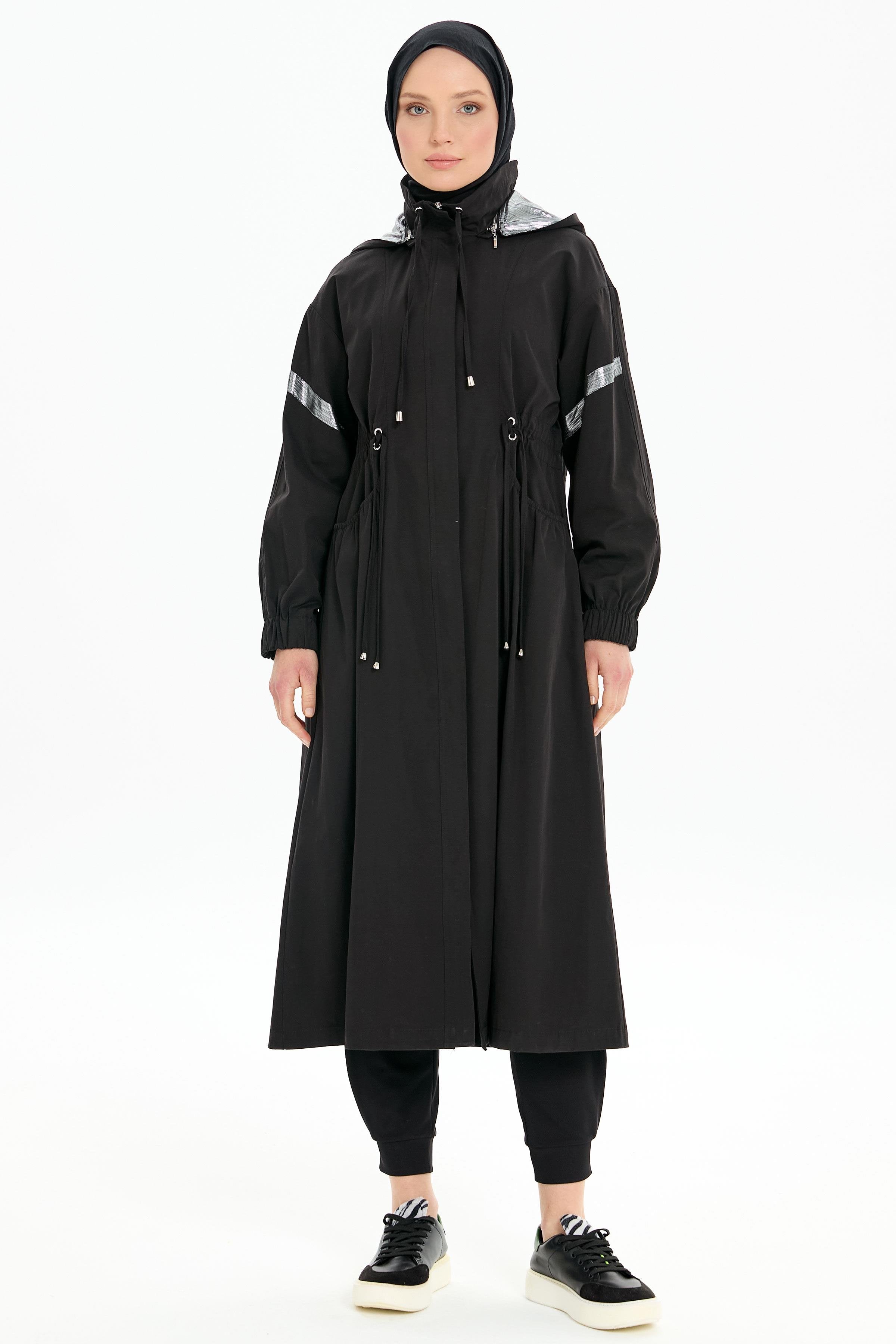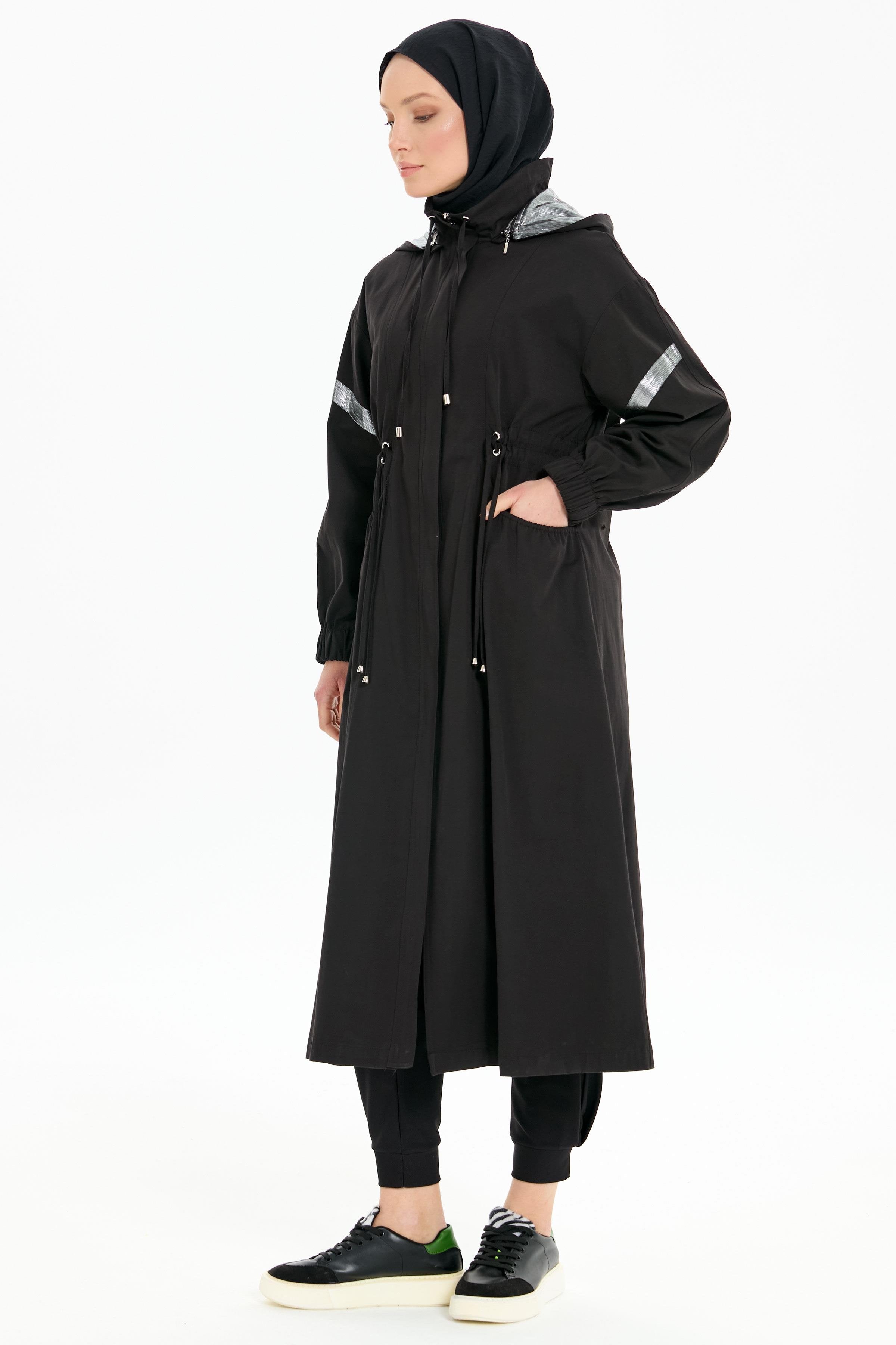 The Trimmed Elastic Waist Raincoat is both a functional and stylish outerwear piece.