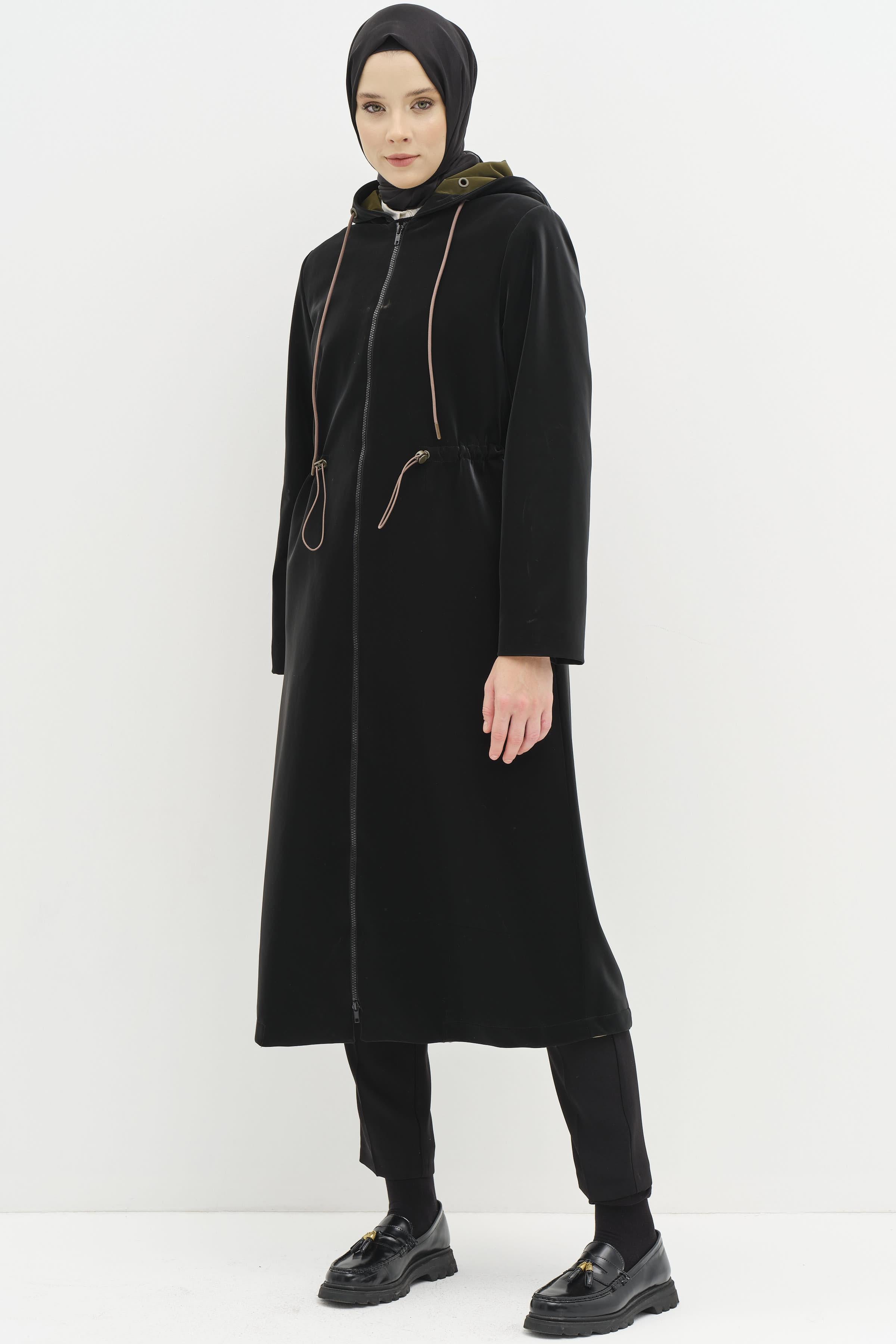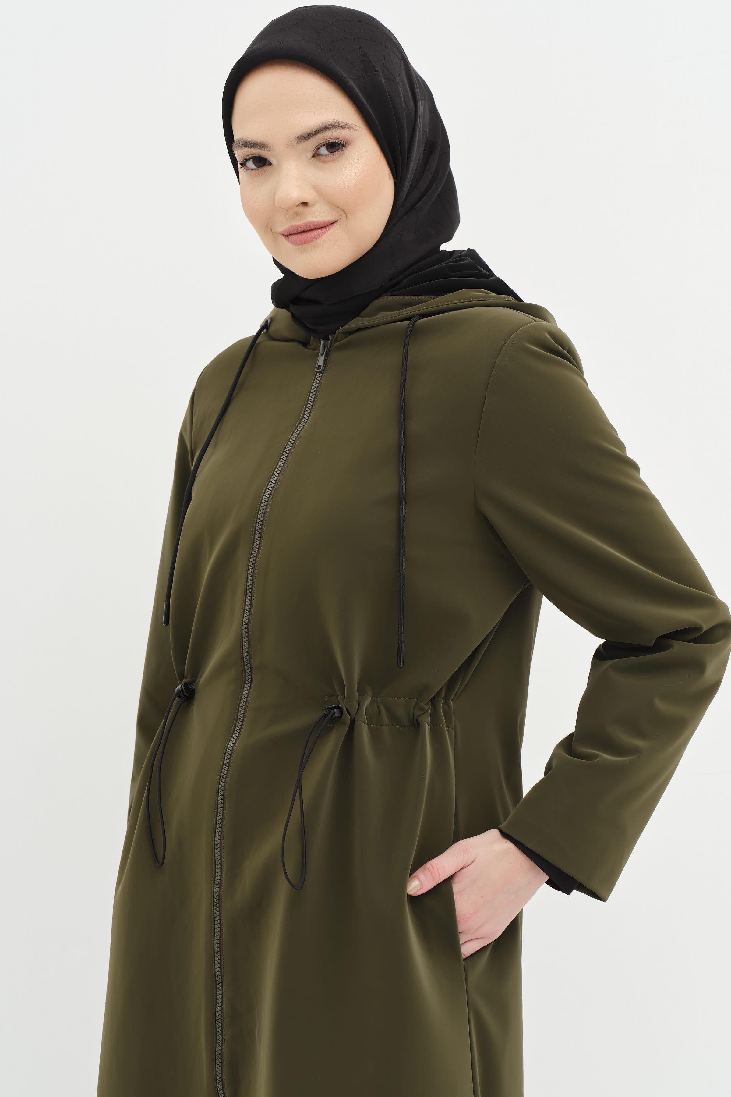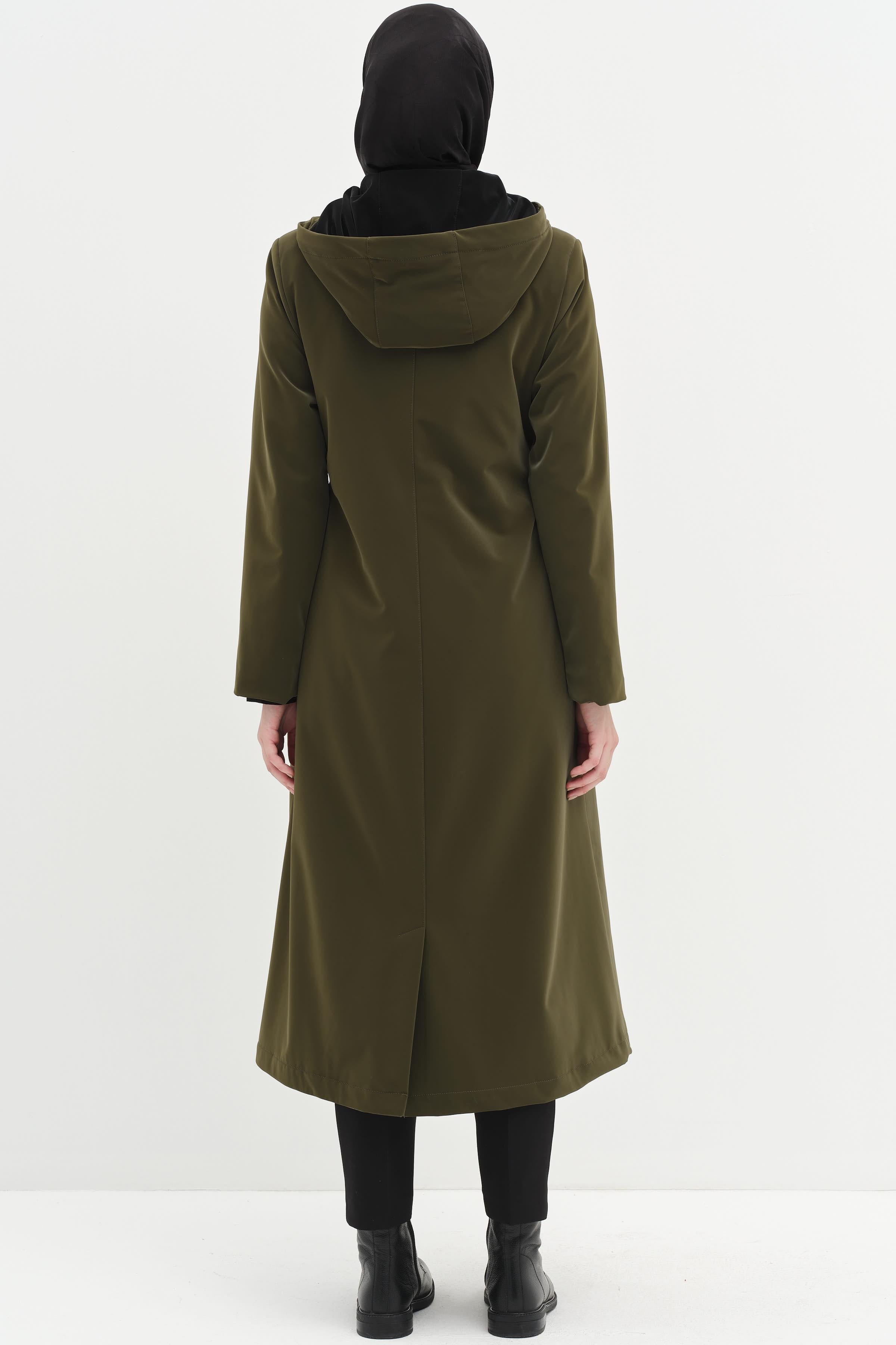The Trimmed Elastic Waist Raincoat is both a functional and stylish outerwear piece.