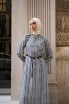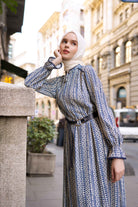 This dress, featuring a unique pattern and belted gathers, combines elegance and sophistication. The belt detail at the waist creates a flattering silhouette, while the gathers add a dynamic touch.