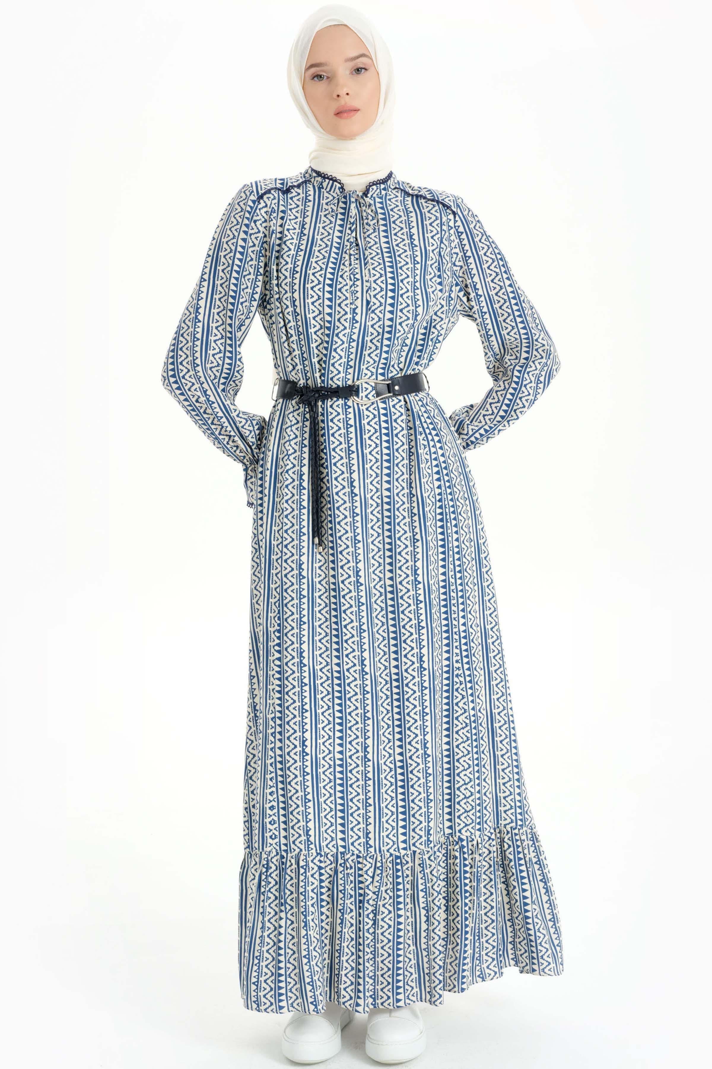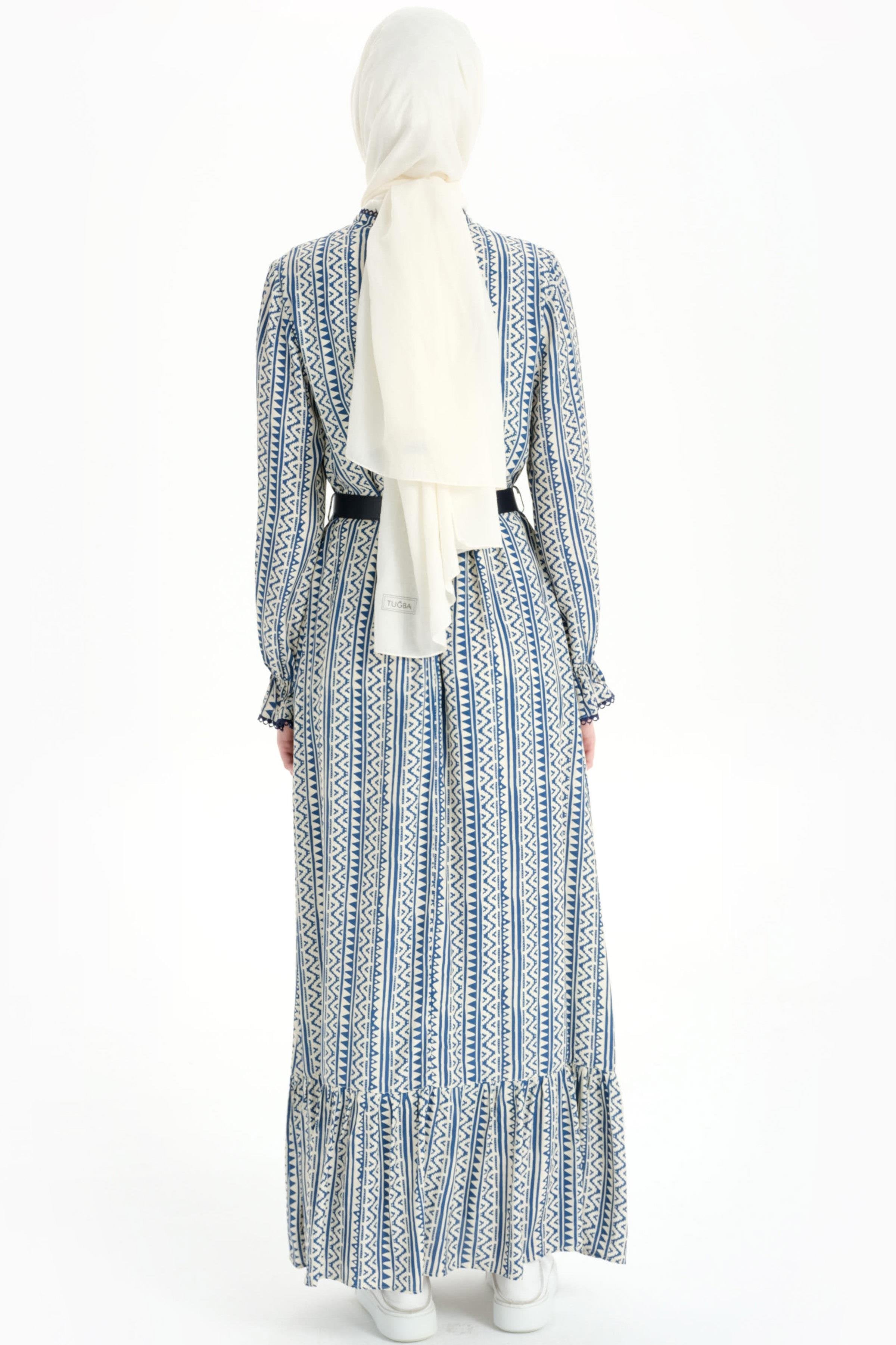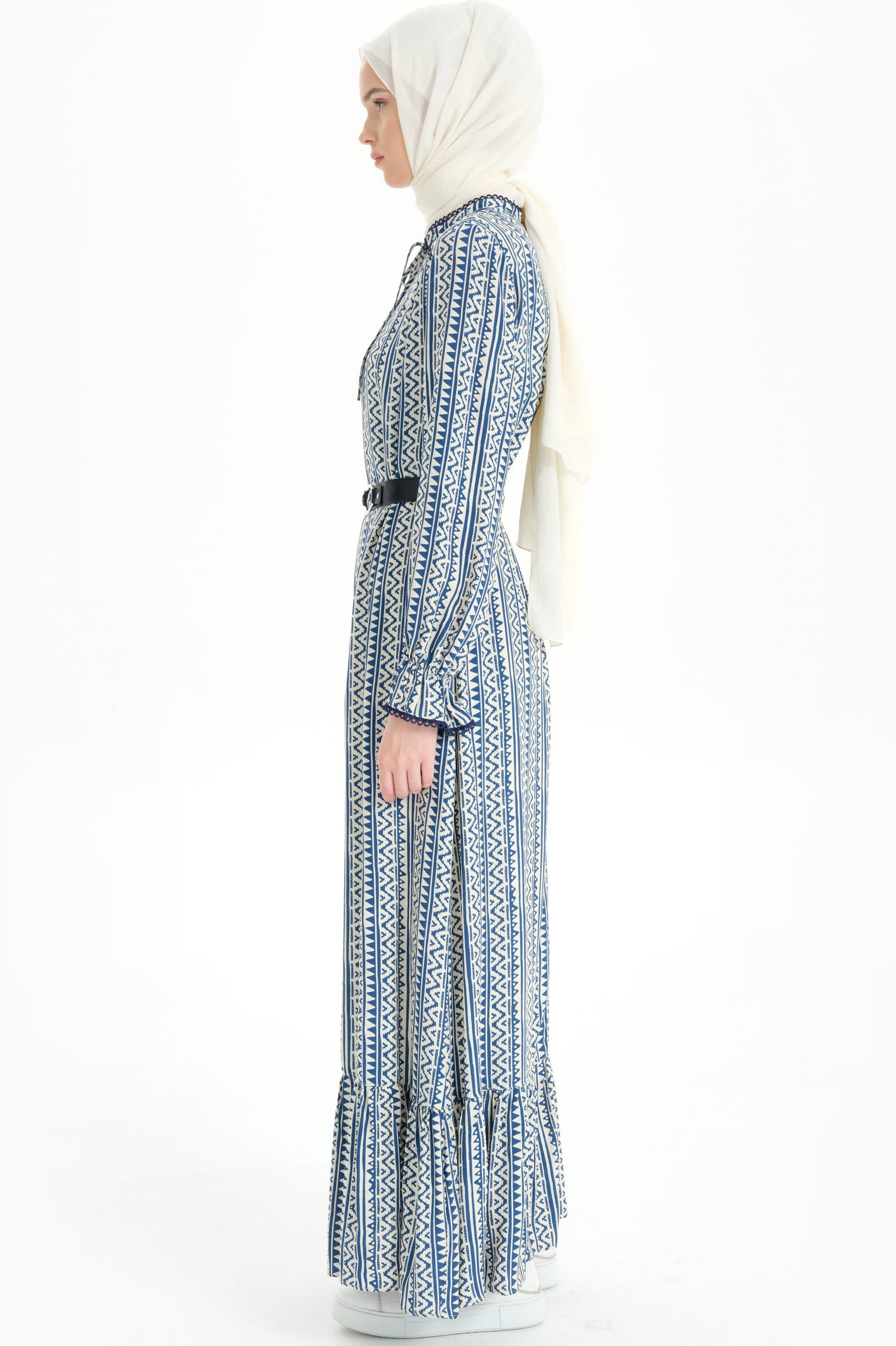 Belted Ruffle Detailed Patterned Dress - Indigo