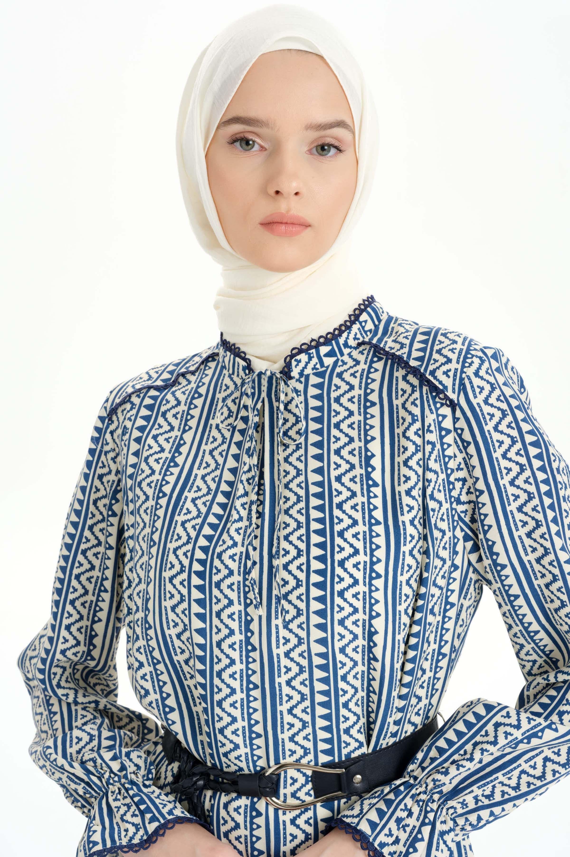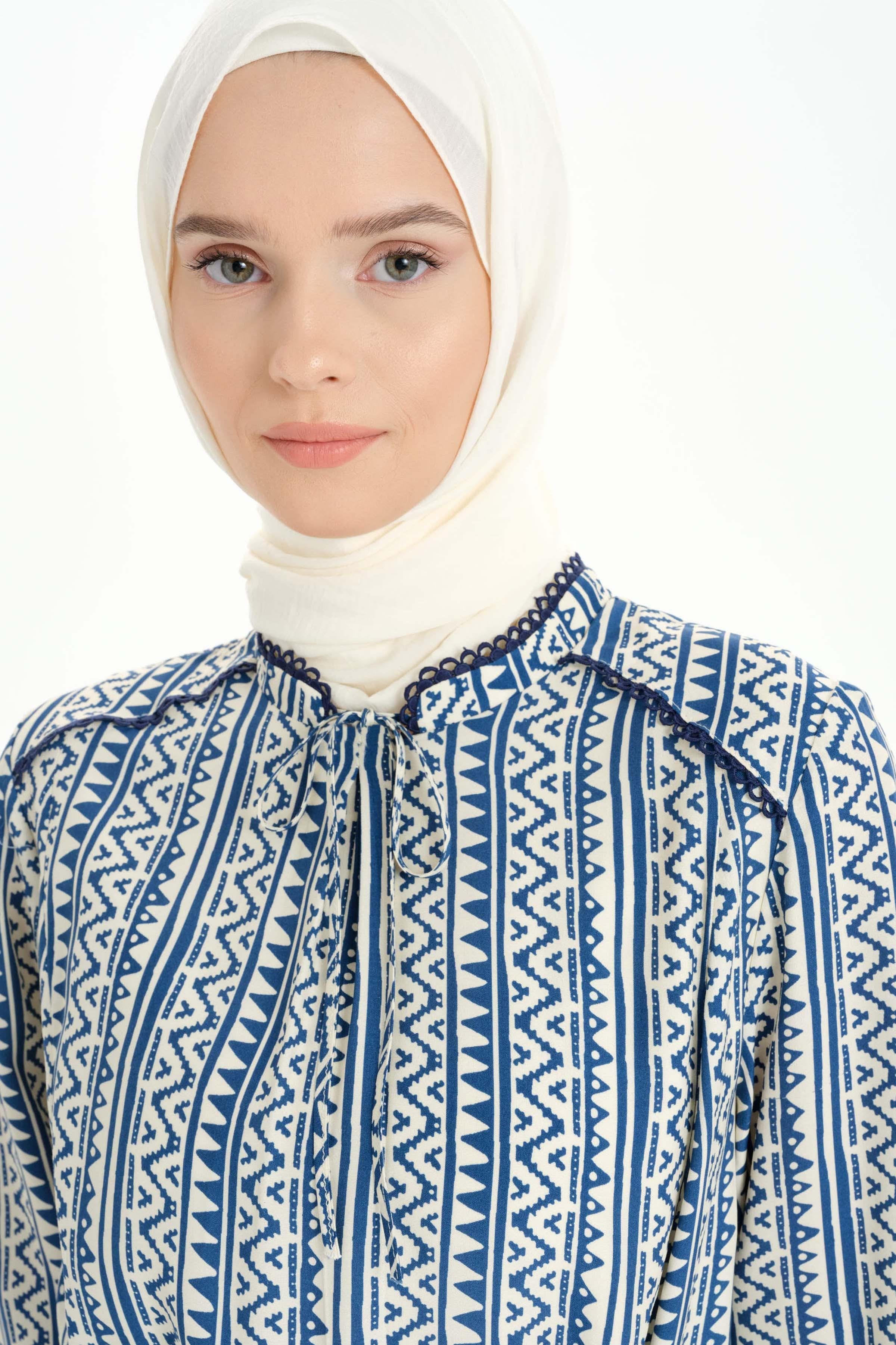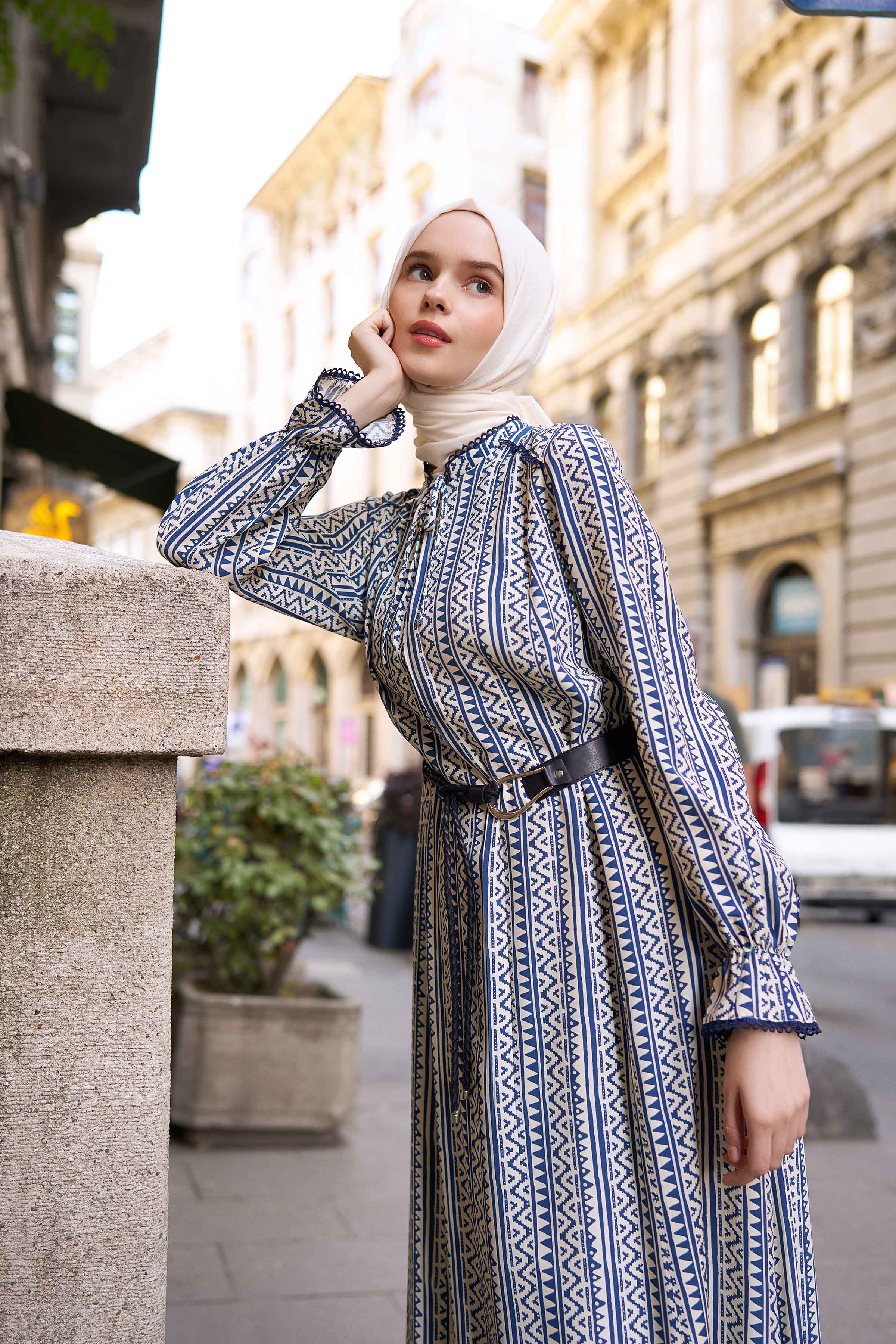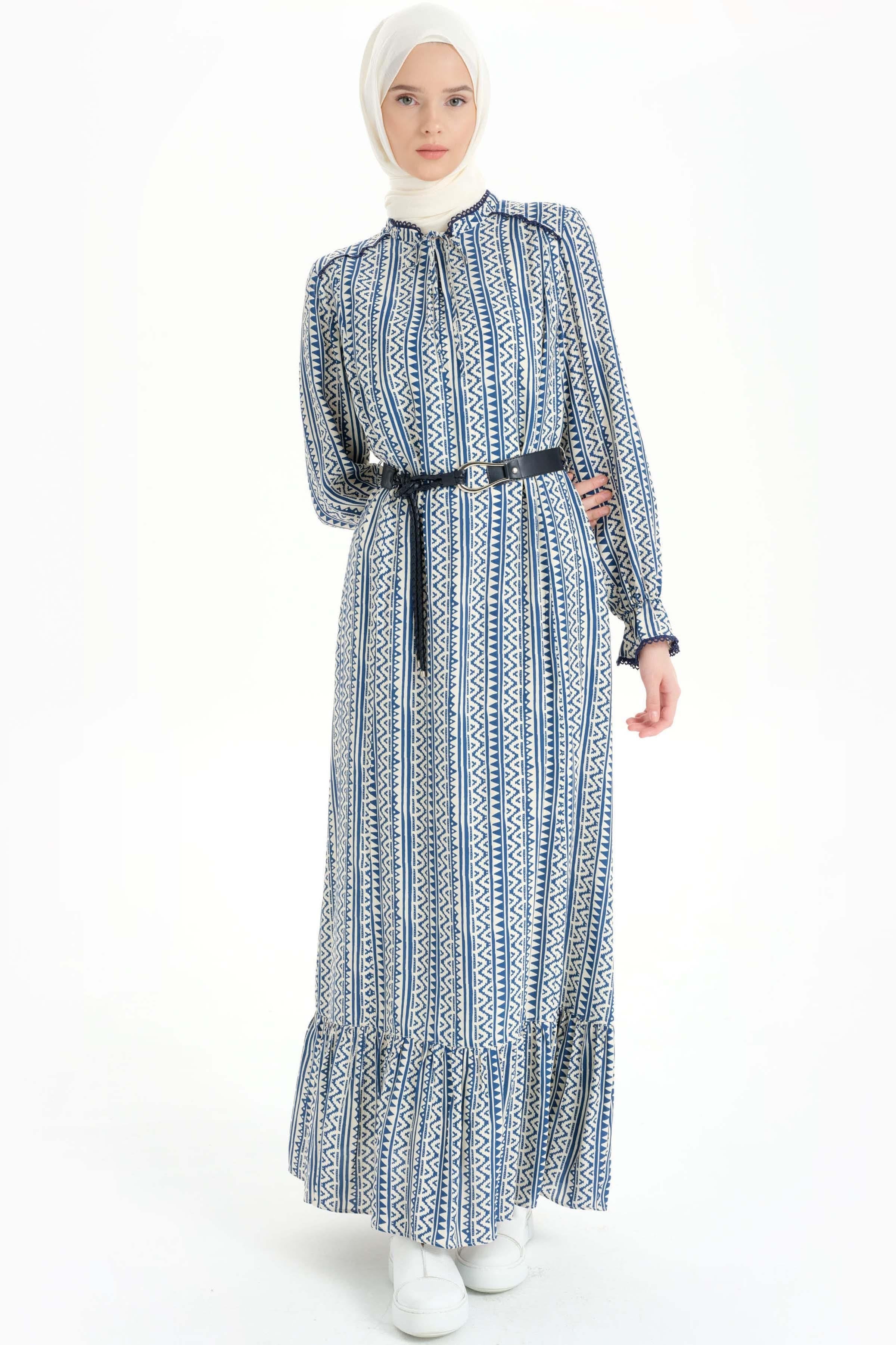 Belted Ruffle Detailed Patterned Dress - Indigo
