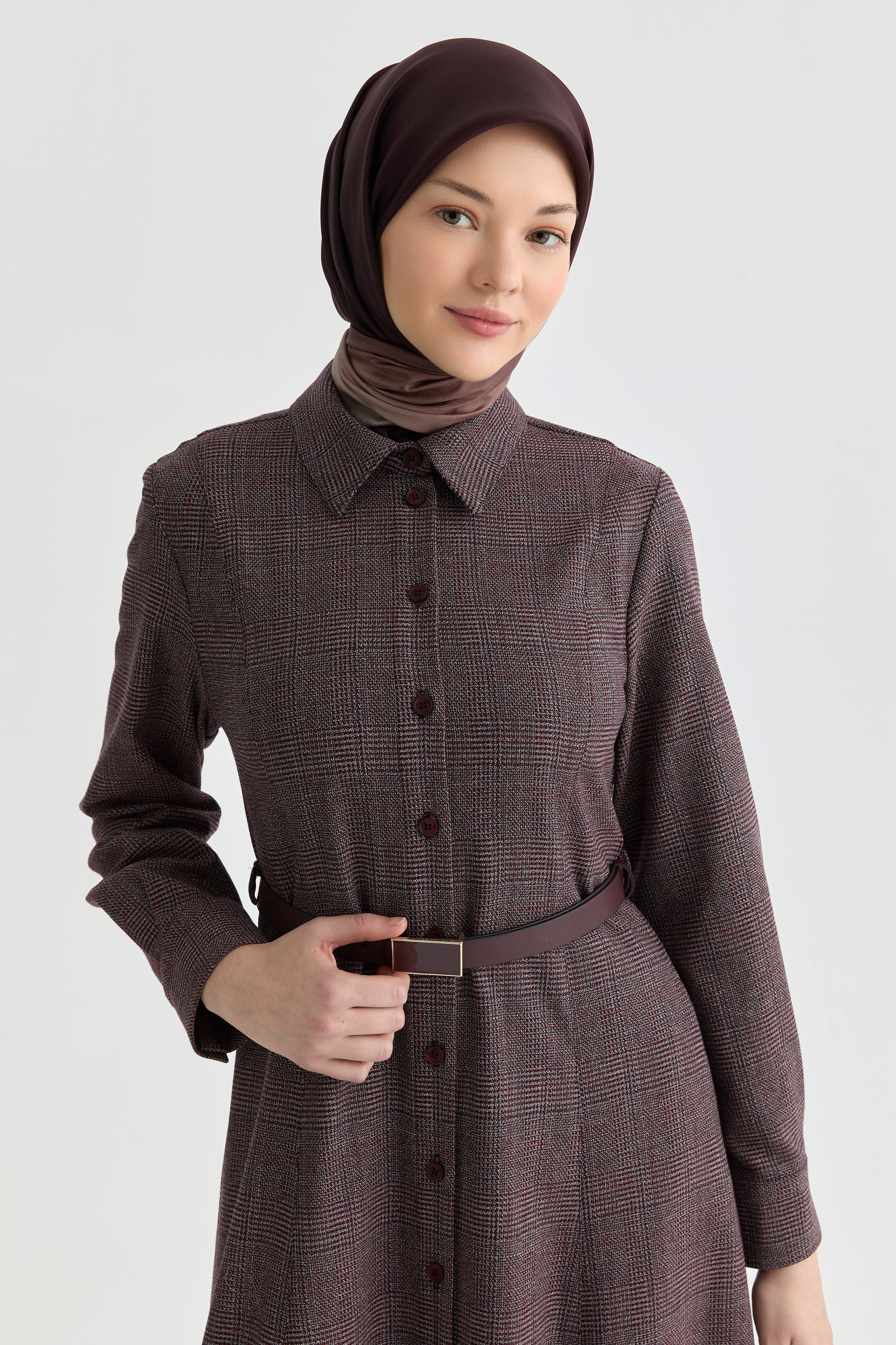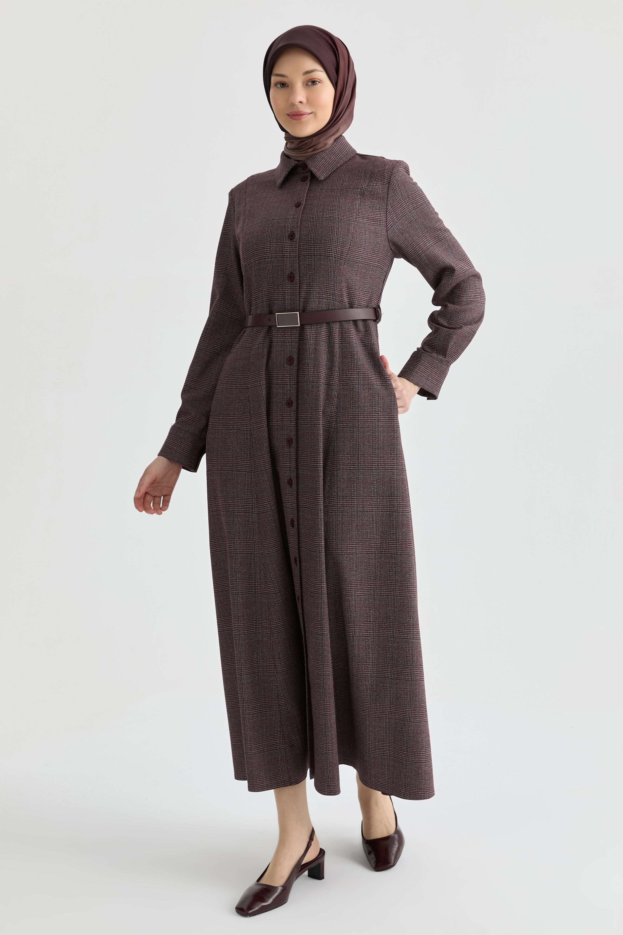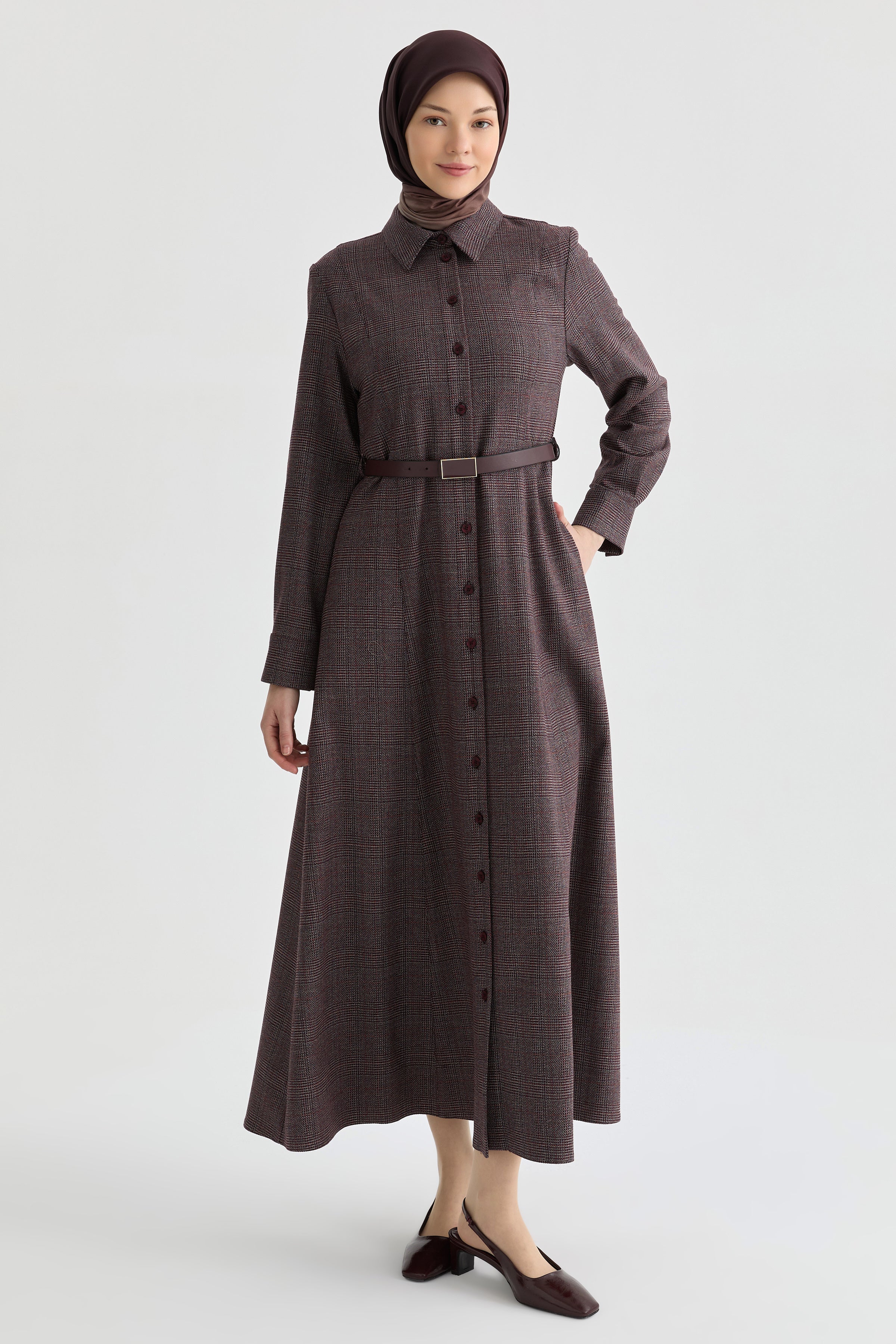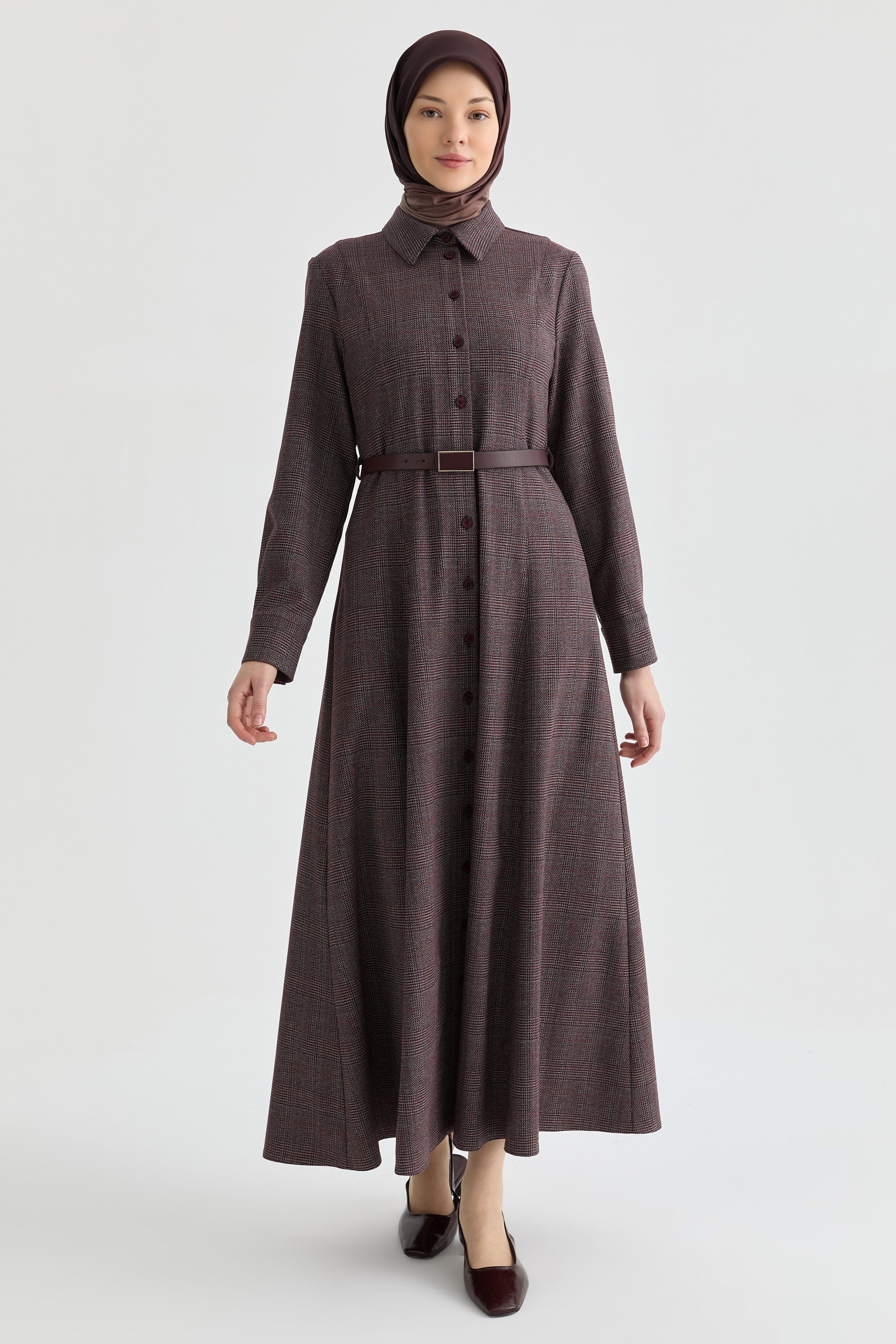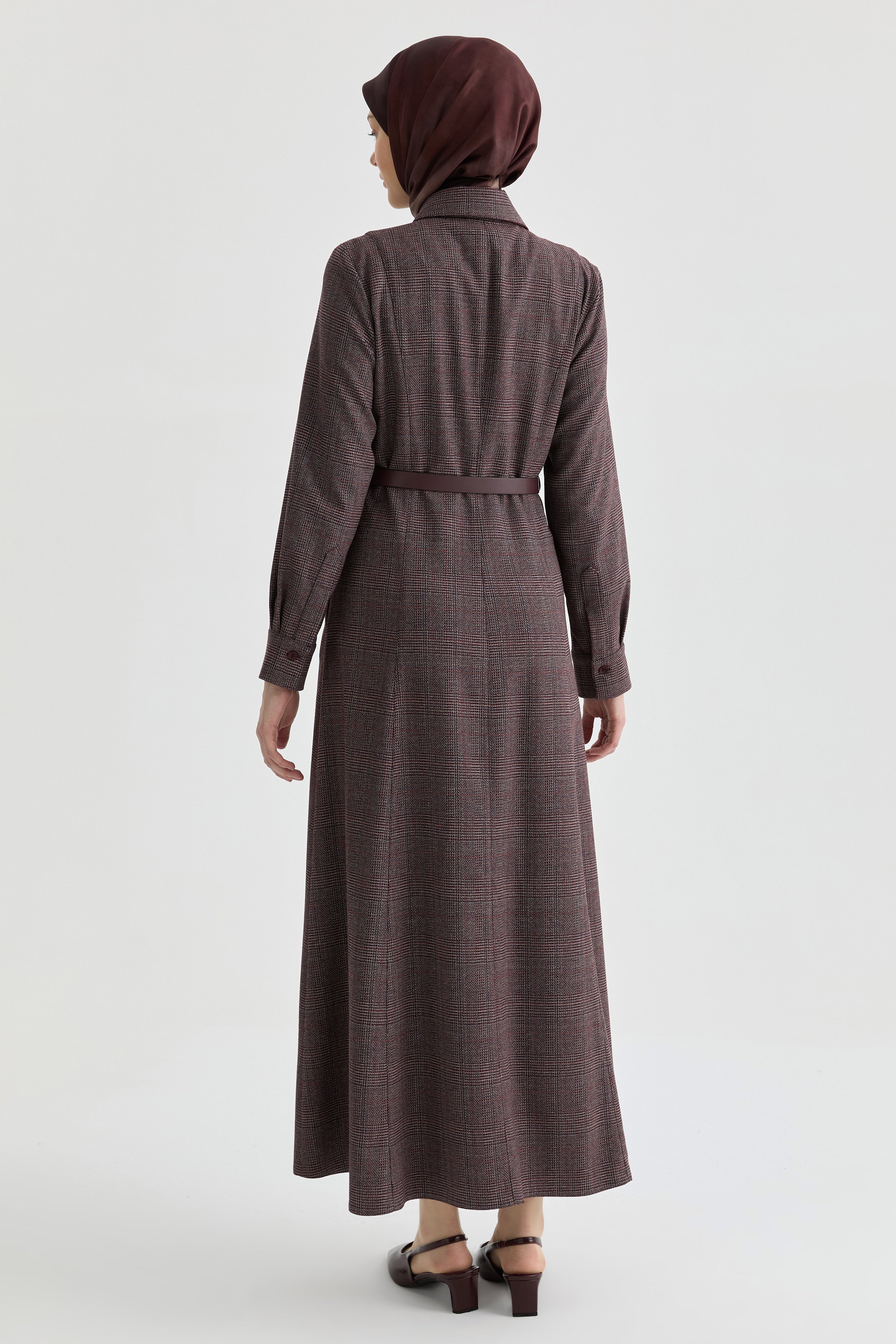 Kuplu Ekose Elbise - Bordo