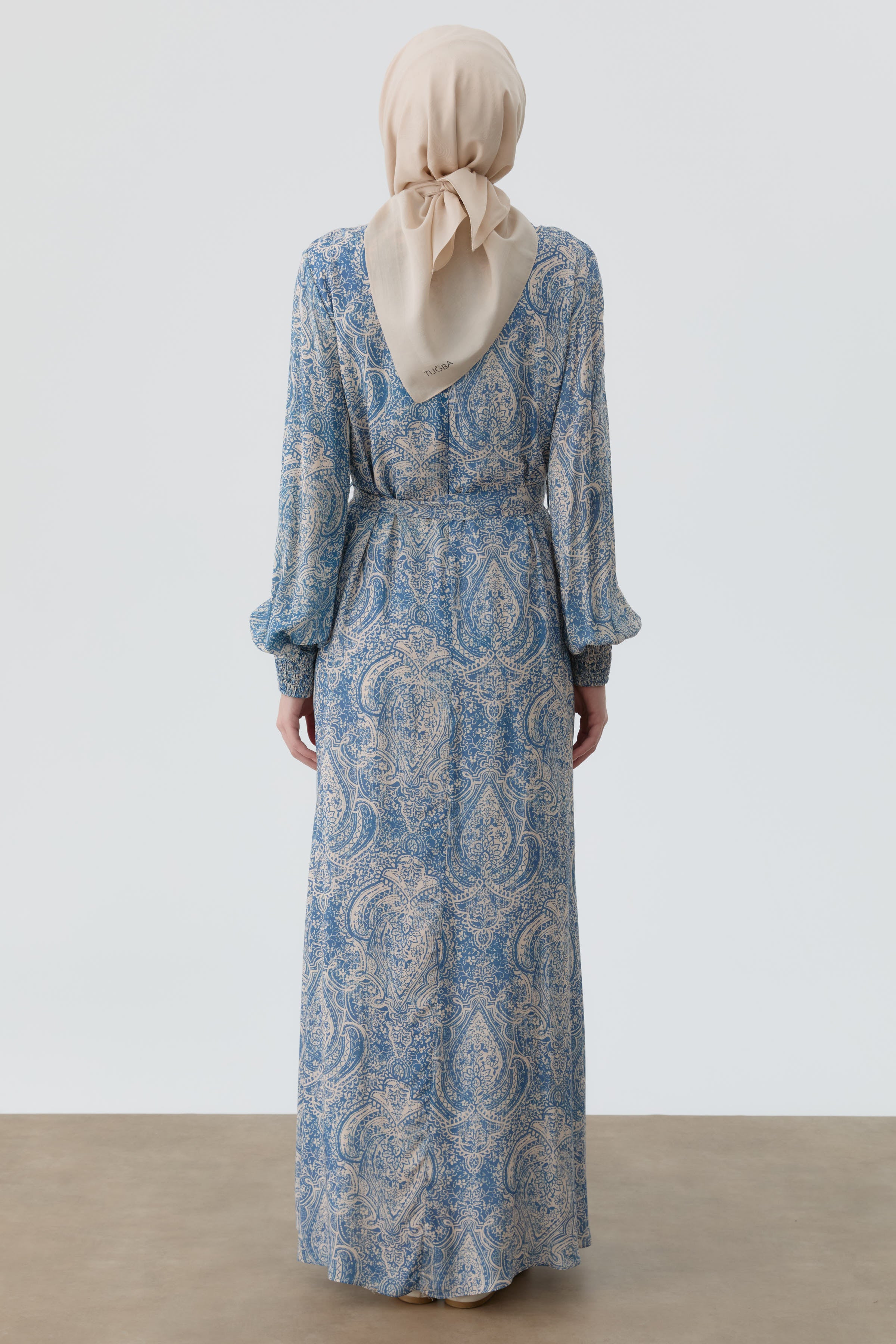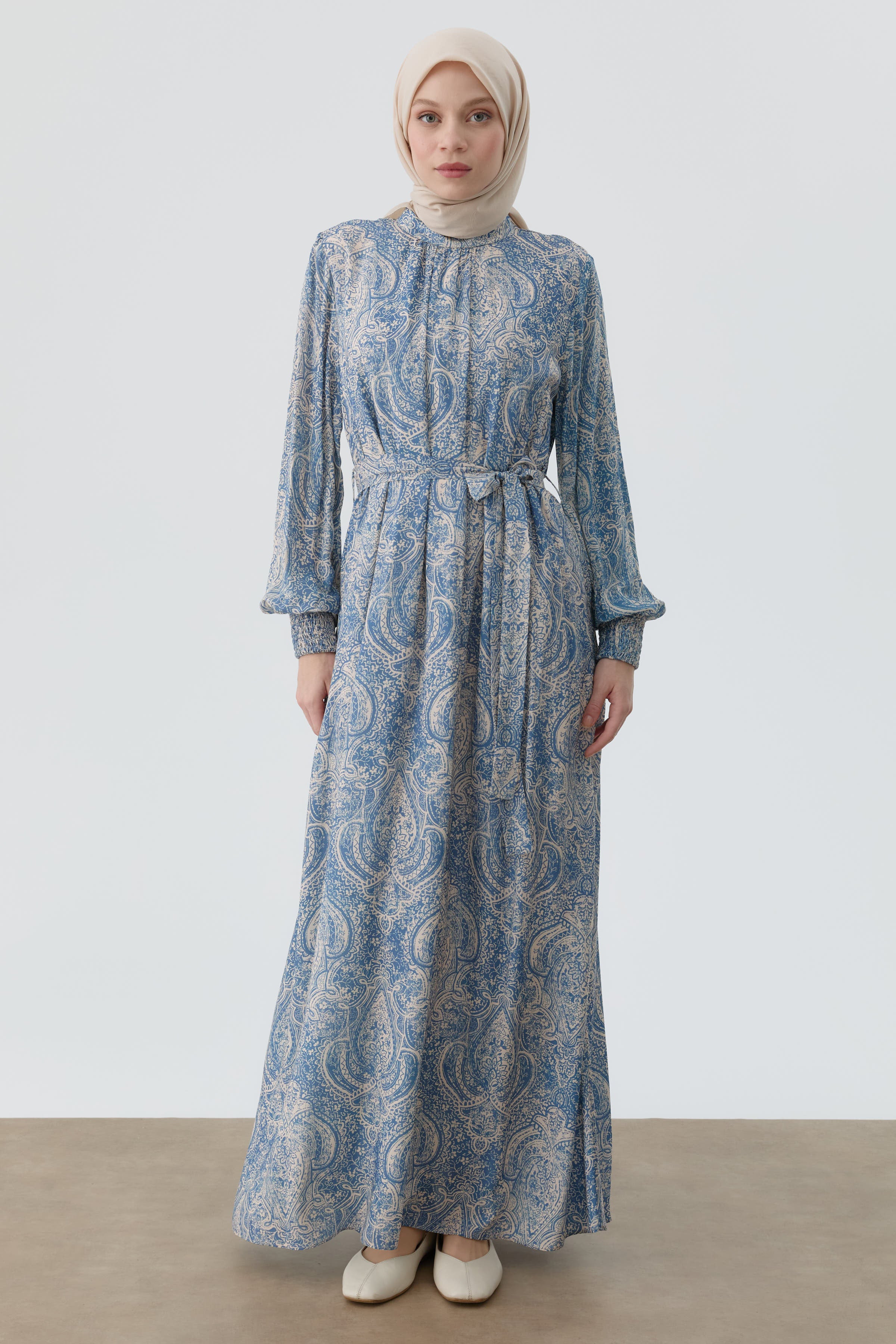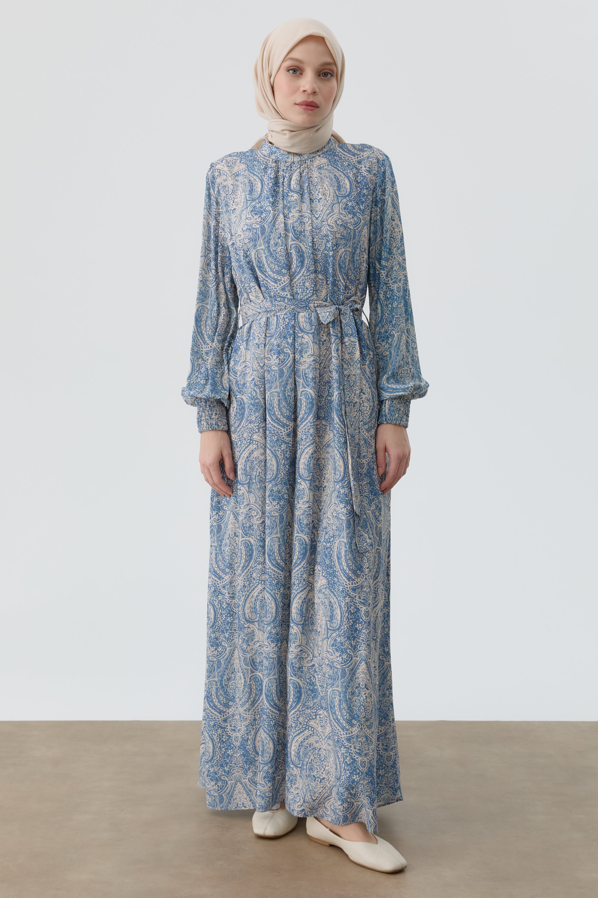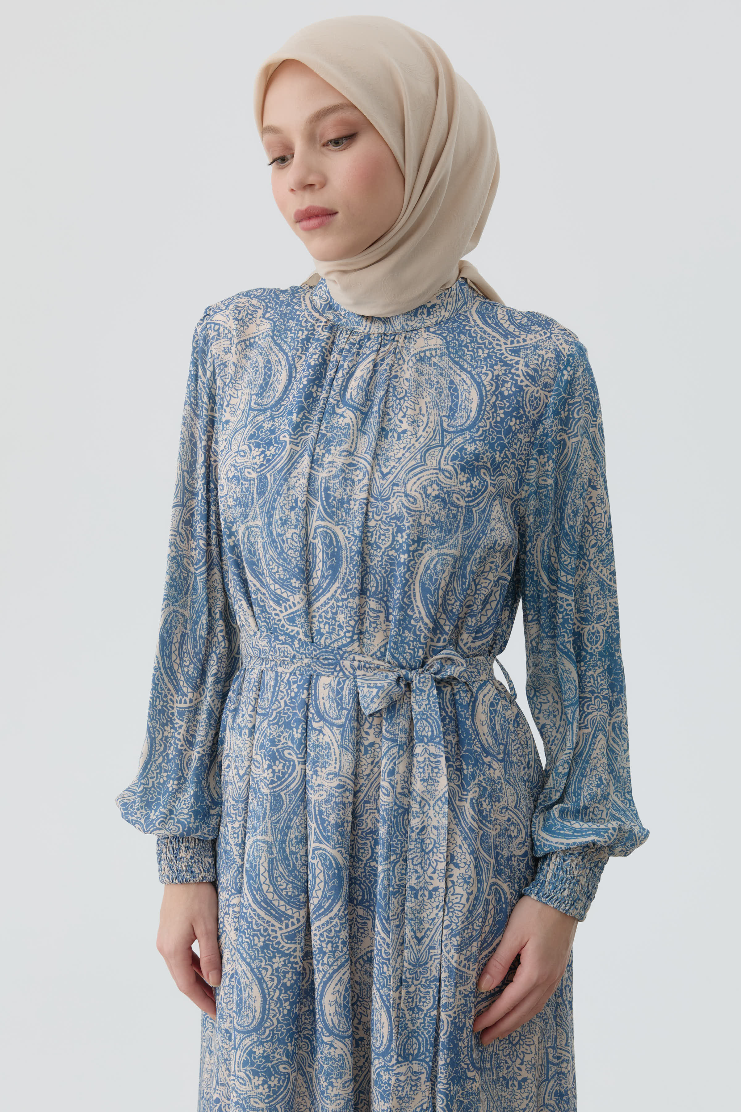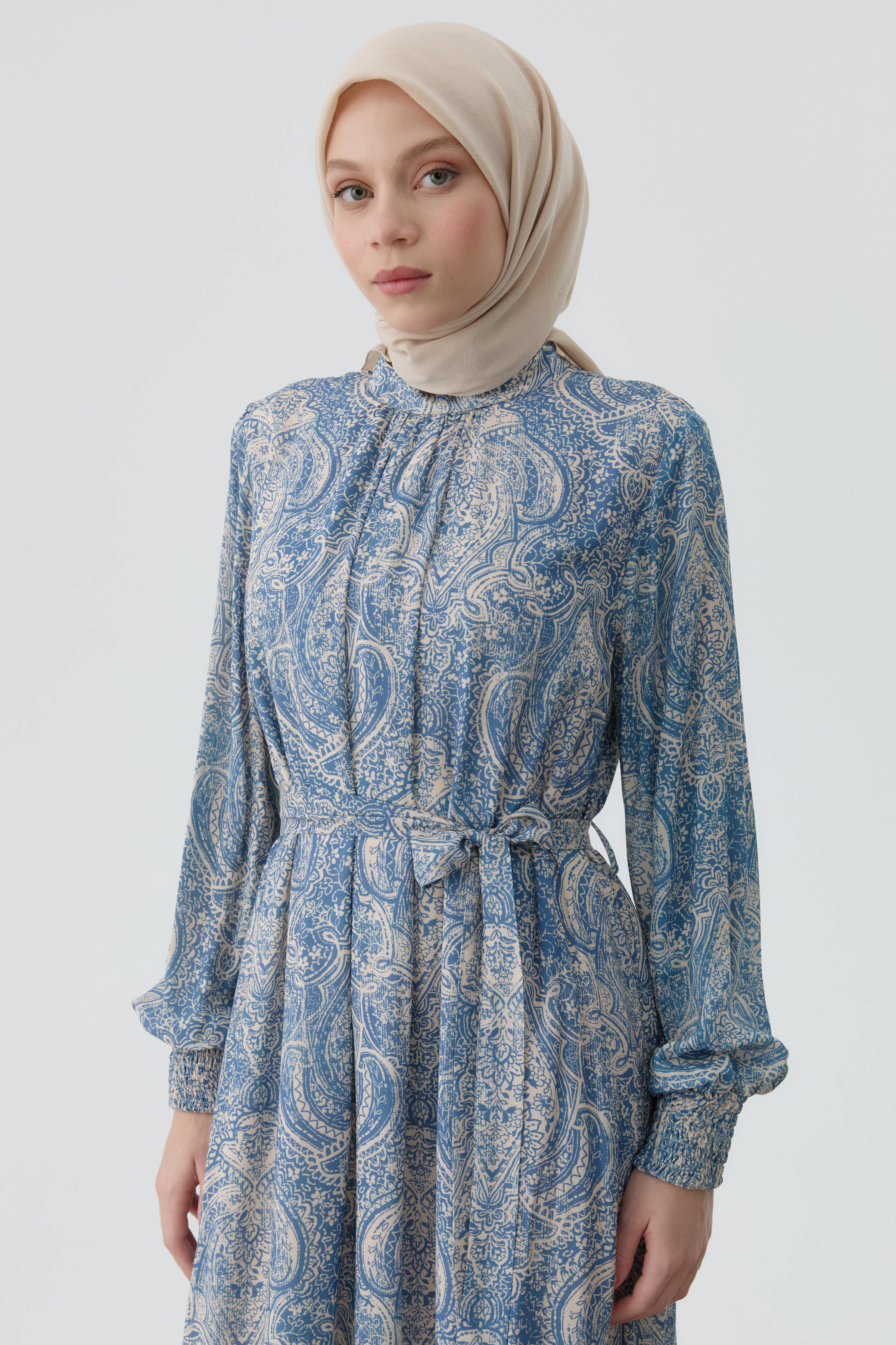 This dress, which draws attention with its eye-catching shawl patterns, offers an elegant stance by adapting to the body thanks to the belt detail at the waist.