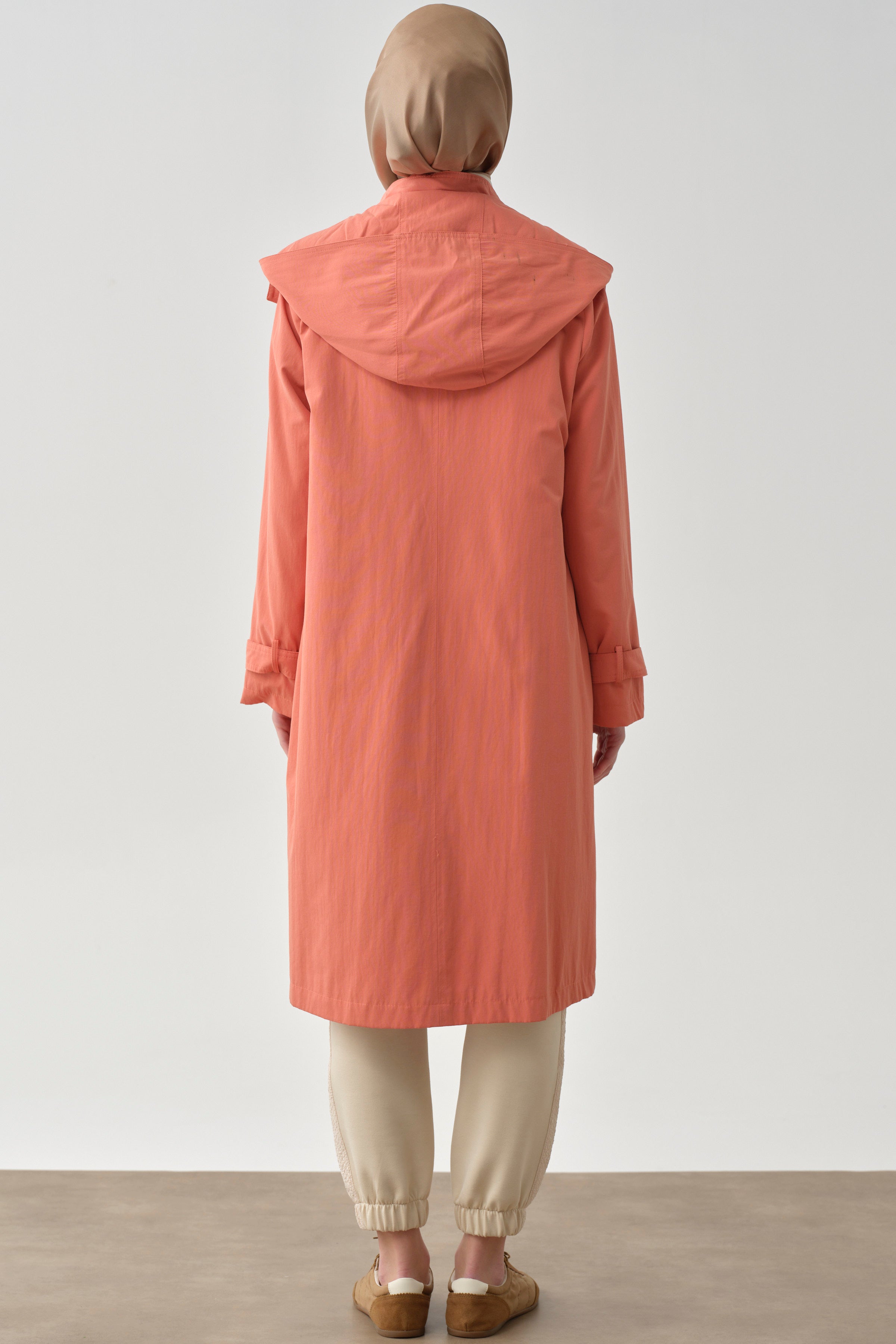 This hooded trench coat, which exhibits a modern stance with its T-sleeve cut and detailed piping, adds elegance to your style. It offers comfortable use thanks to its lightweight structure and relaxed cut, while the piping details add movement to the design.