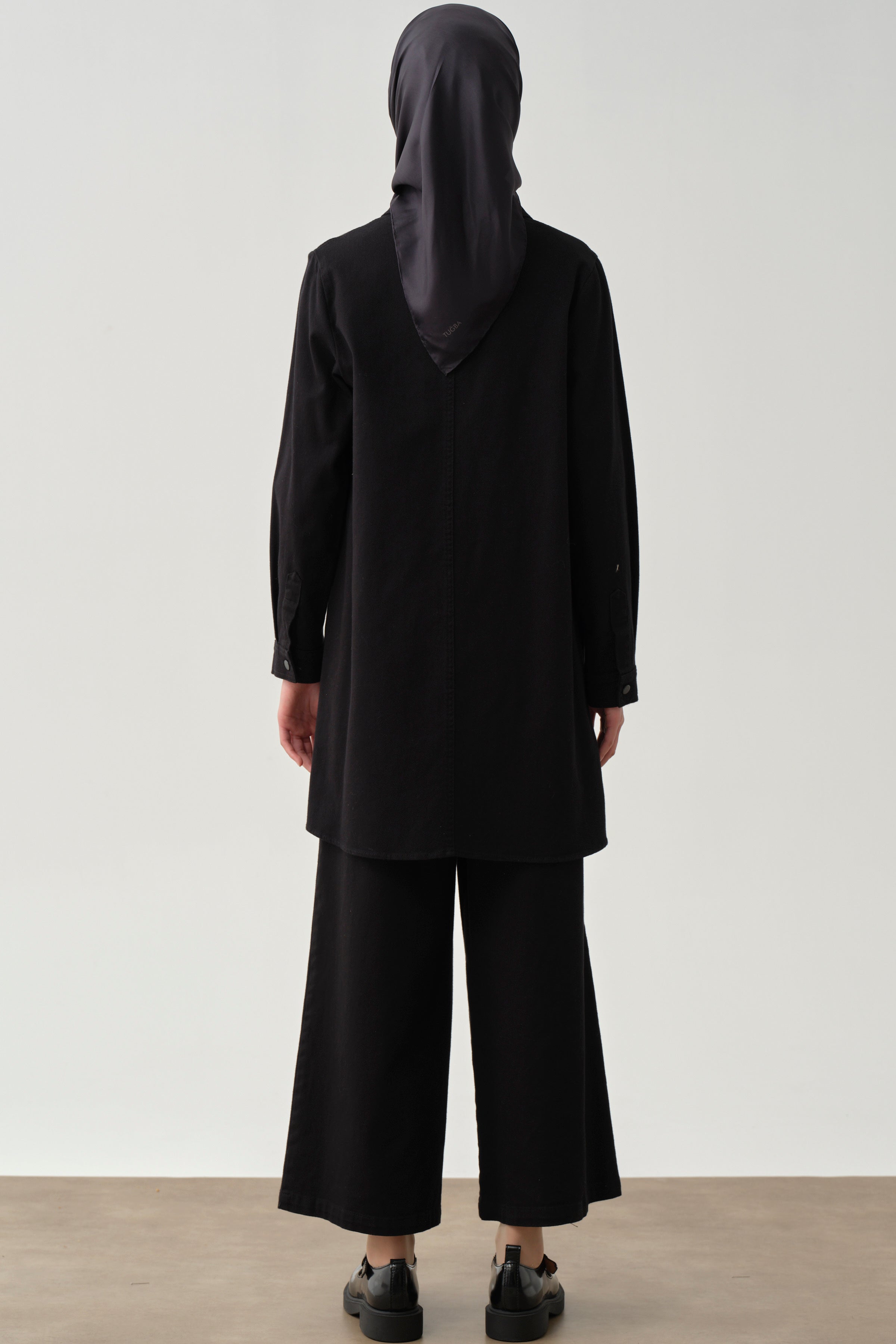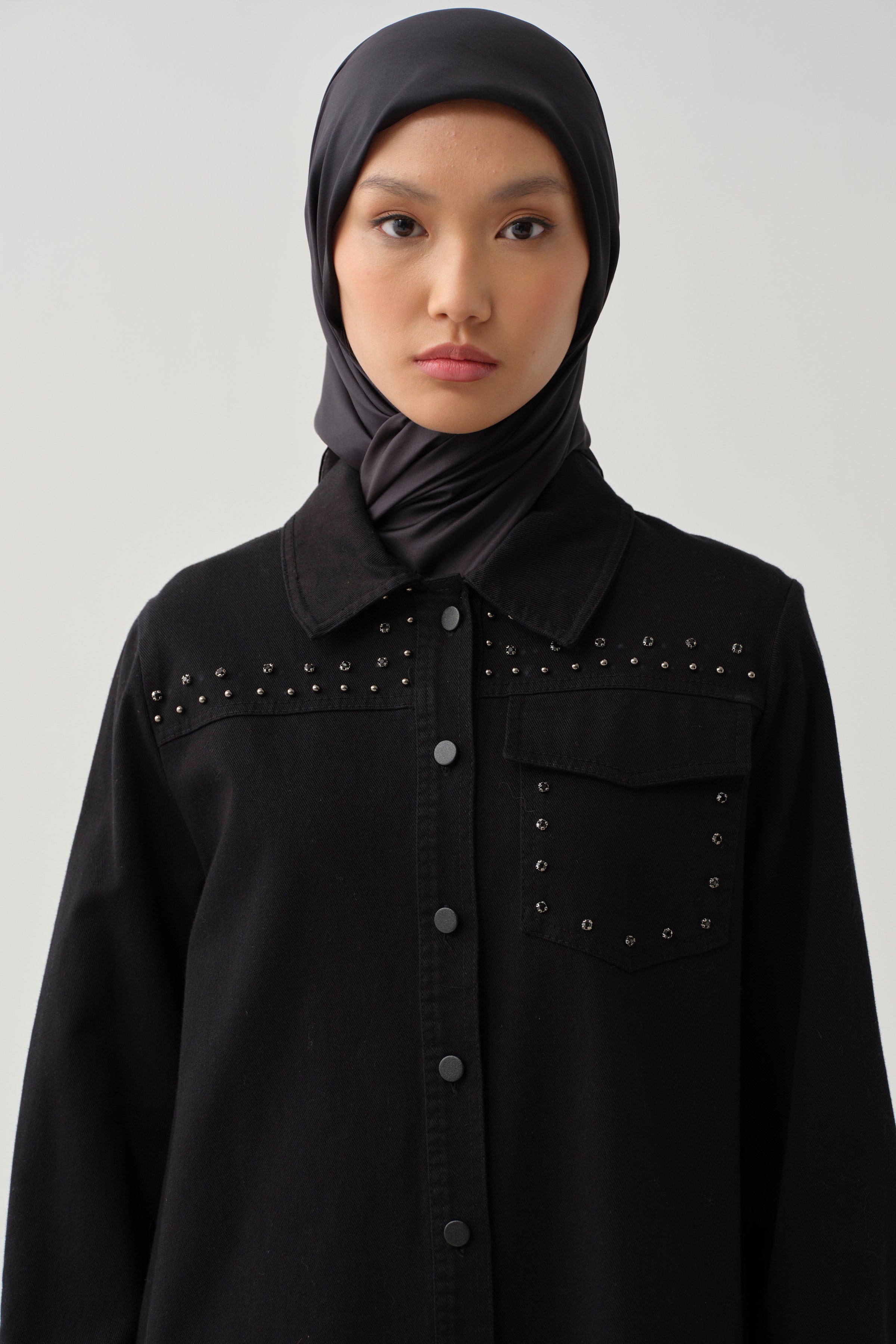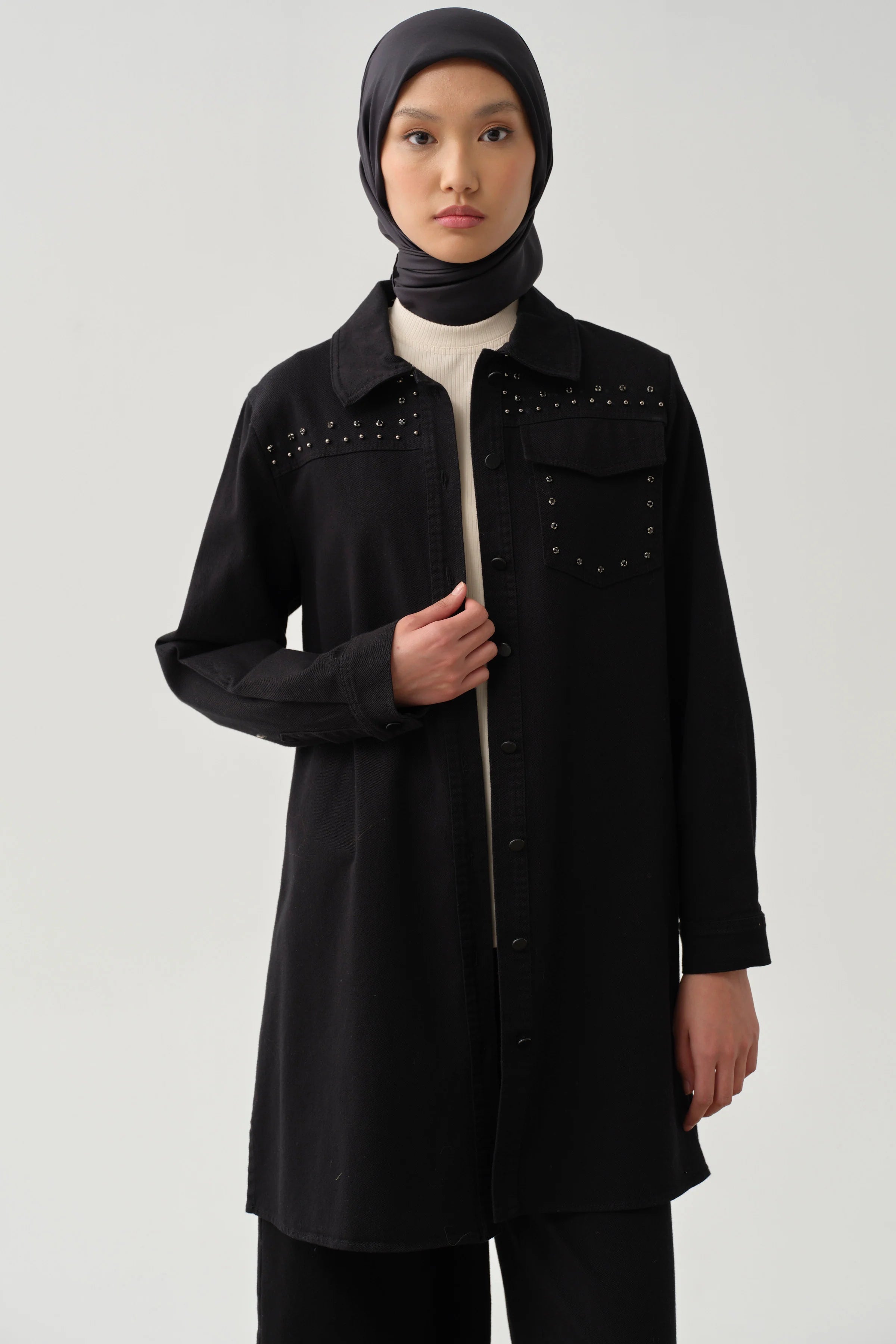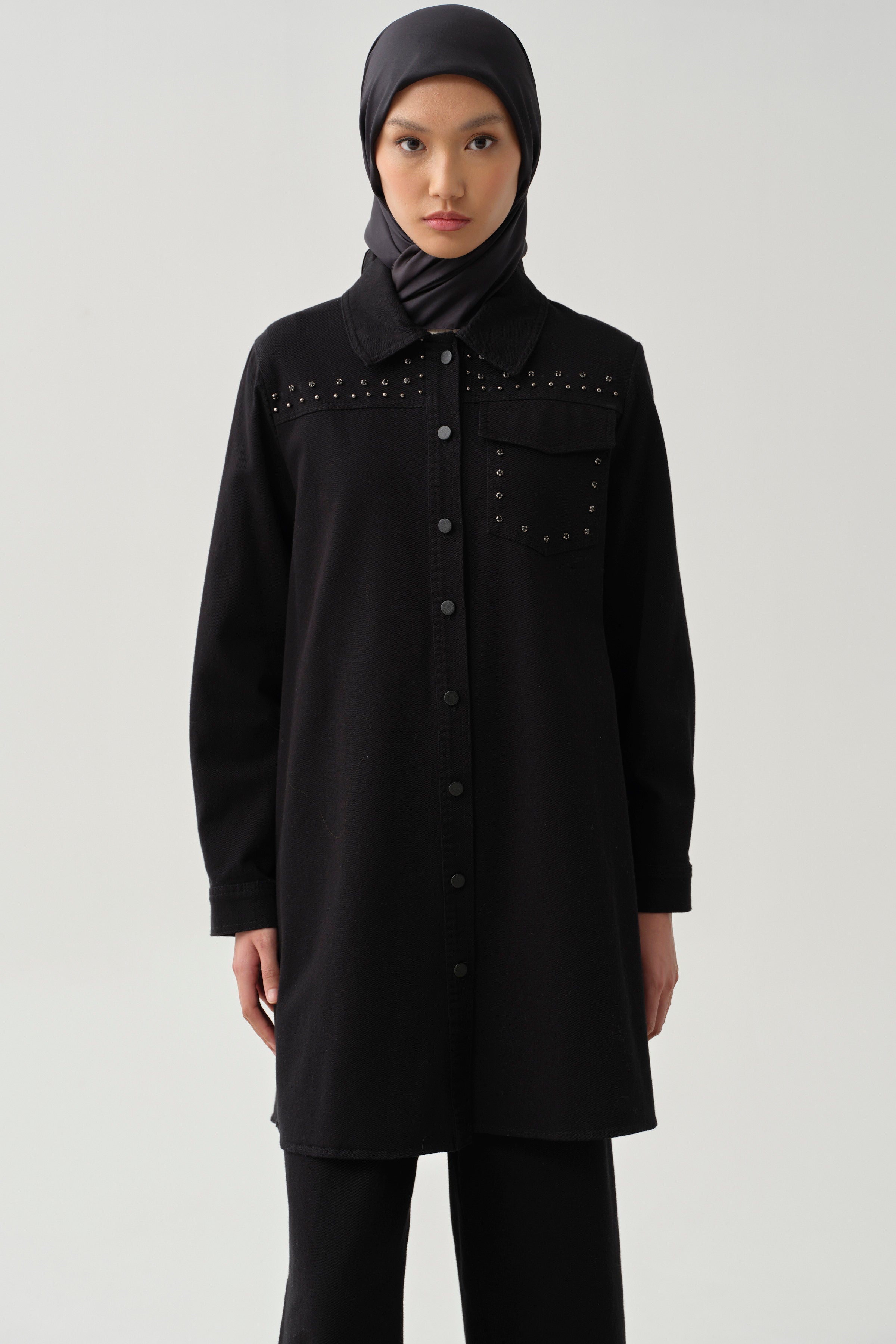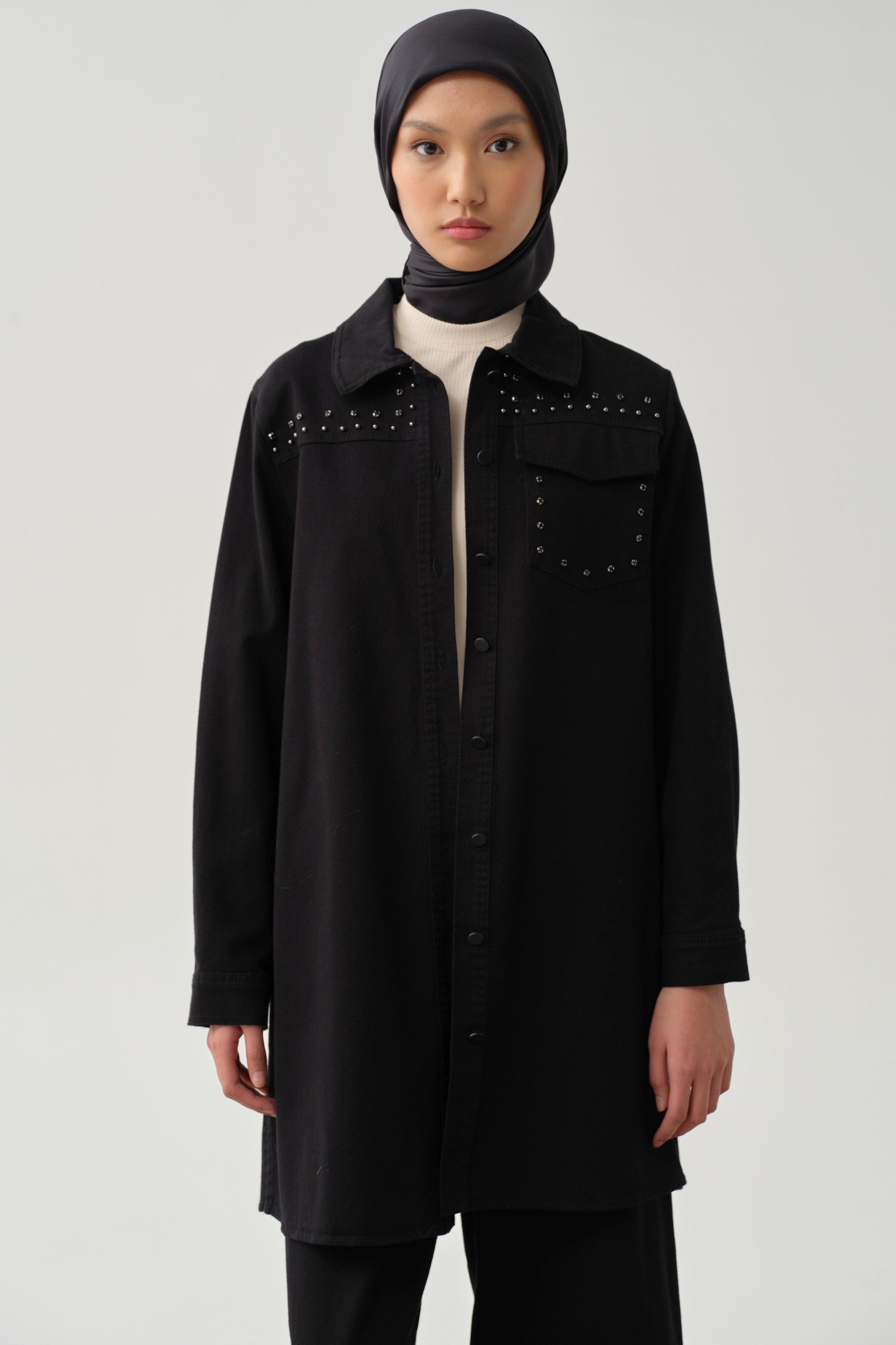 This canvas shirt, enhanced with sparkling stone-set details, offers a chic and modern style. The slit detail provides freedom of movement while drawing attention with its strong and sophisticated look.