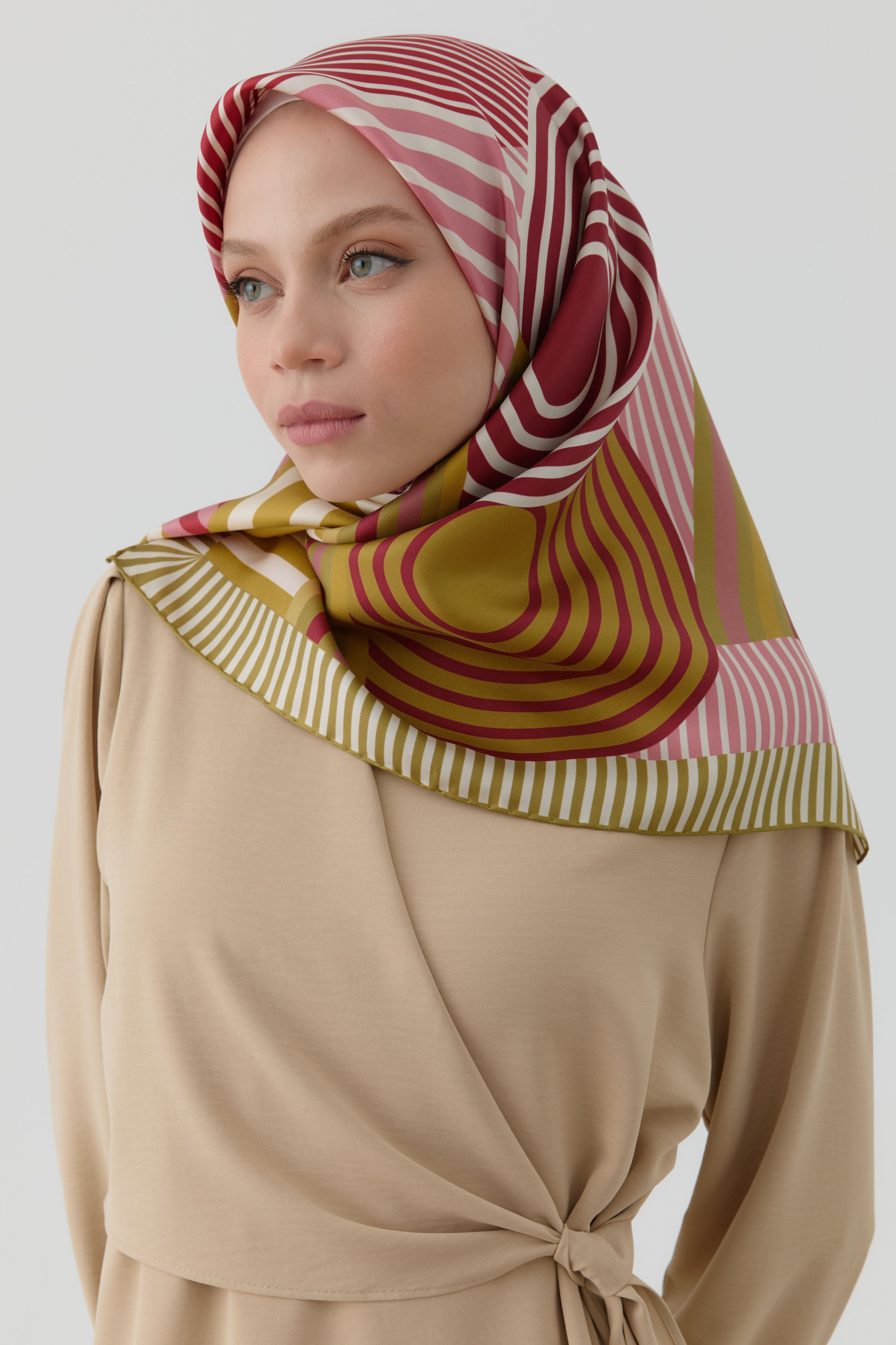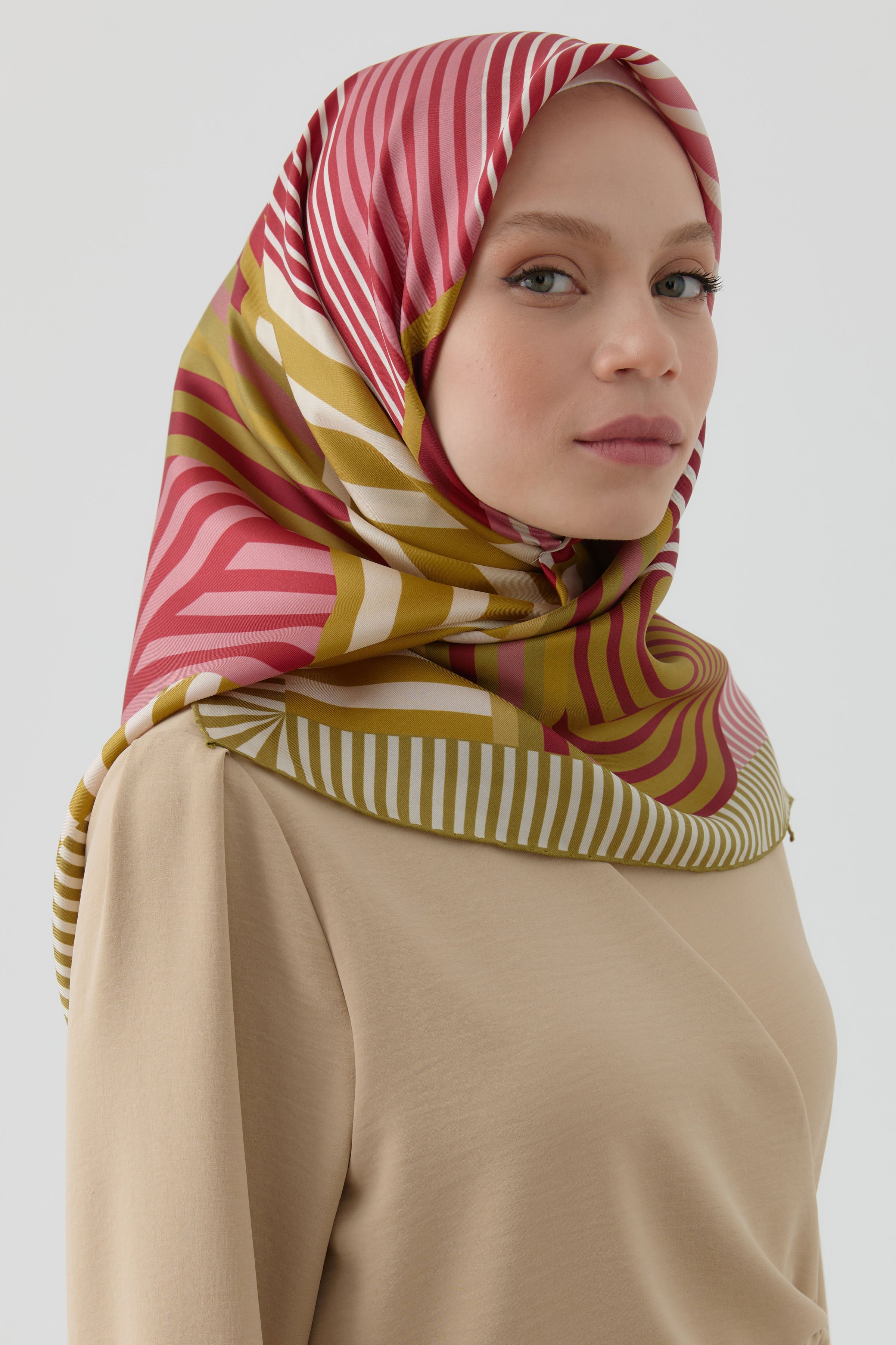 Offering a modern style with its geometric patterns, Tuğba Geo twill silk scarf maintains its form all day long with its solid structure. It adds dynamism to your combinations with its vibrant color transitions and stylish texture. It easily adapts to daily and classic looks.