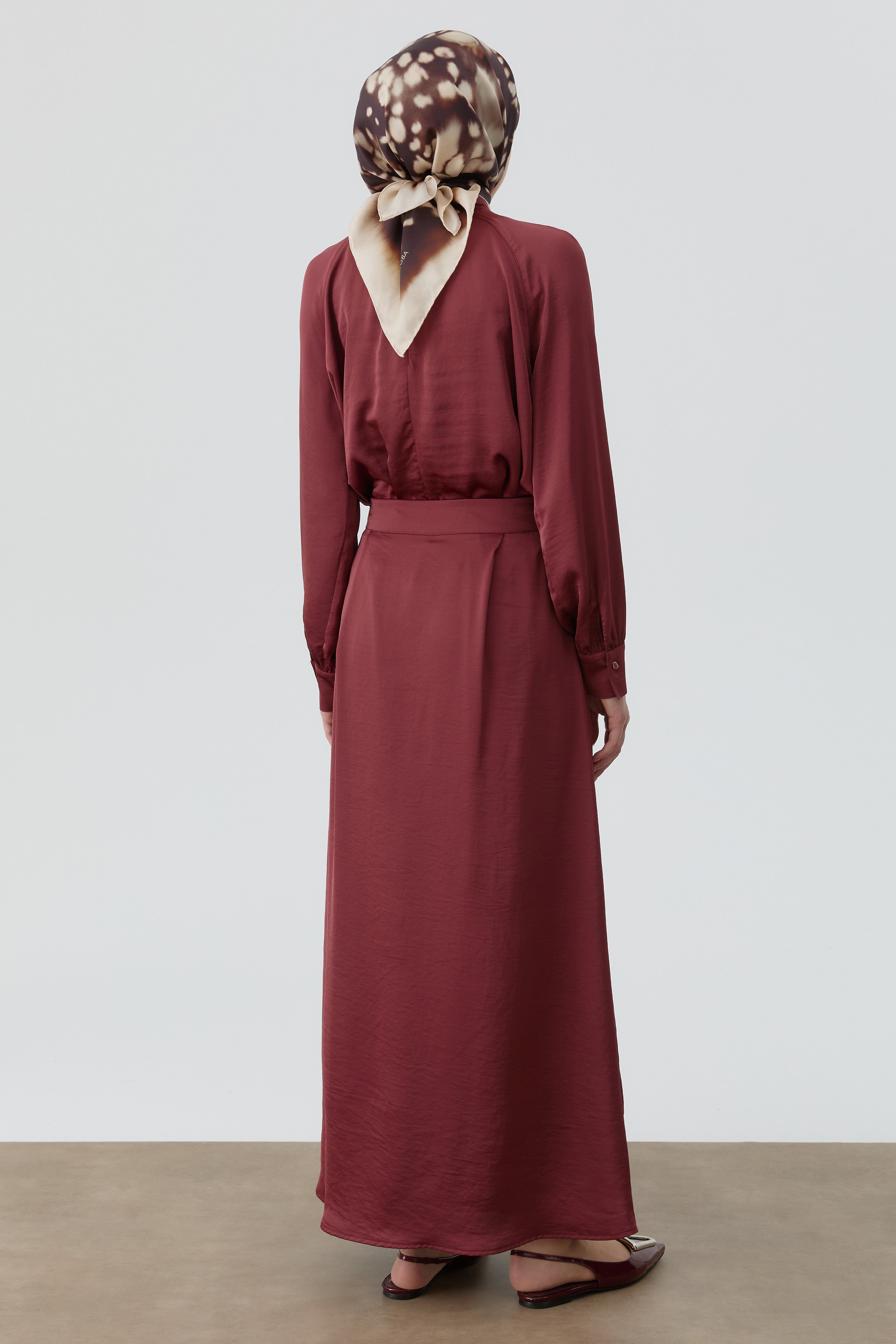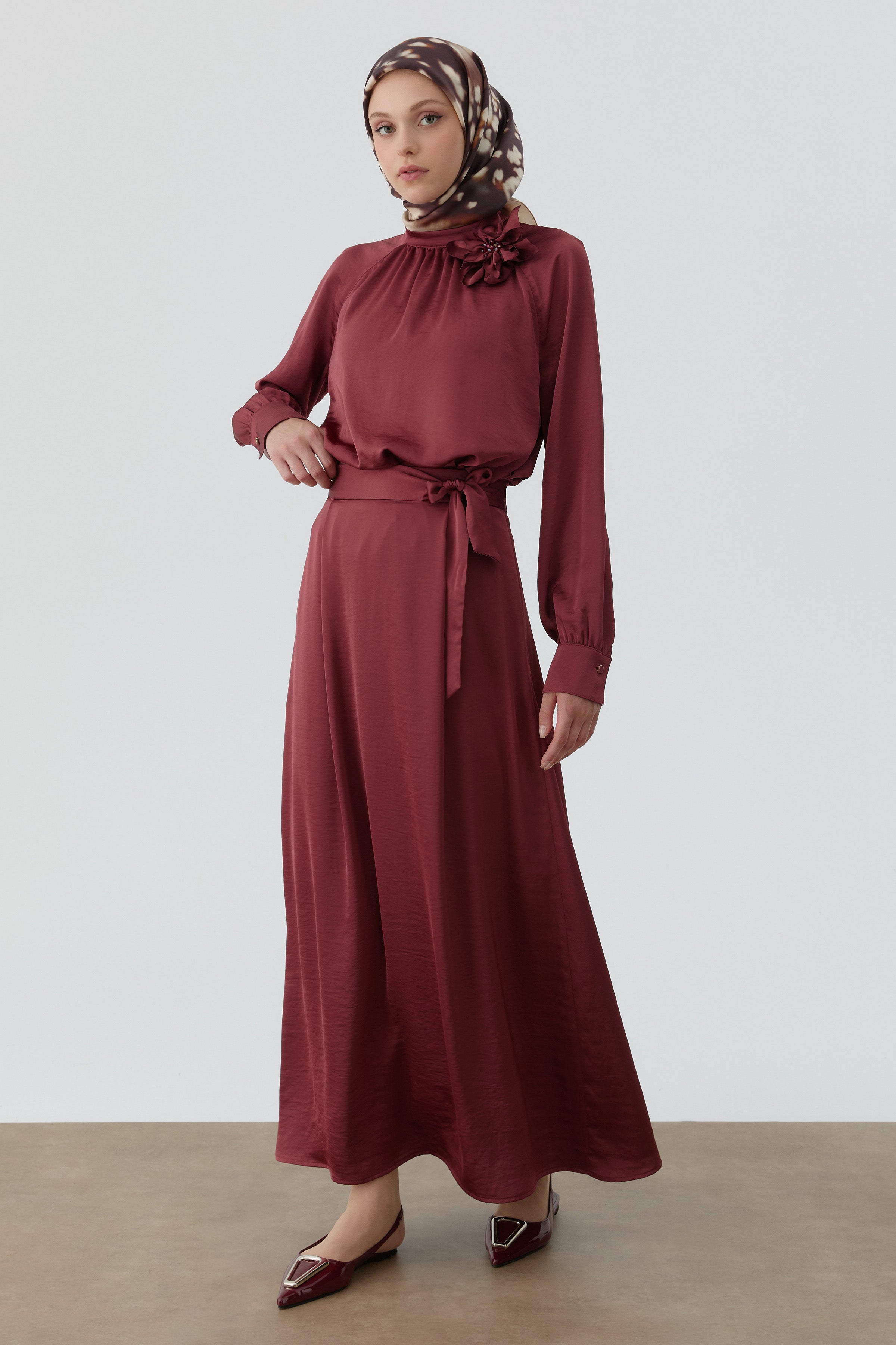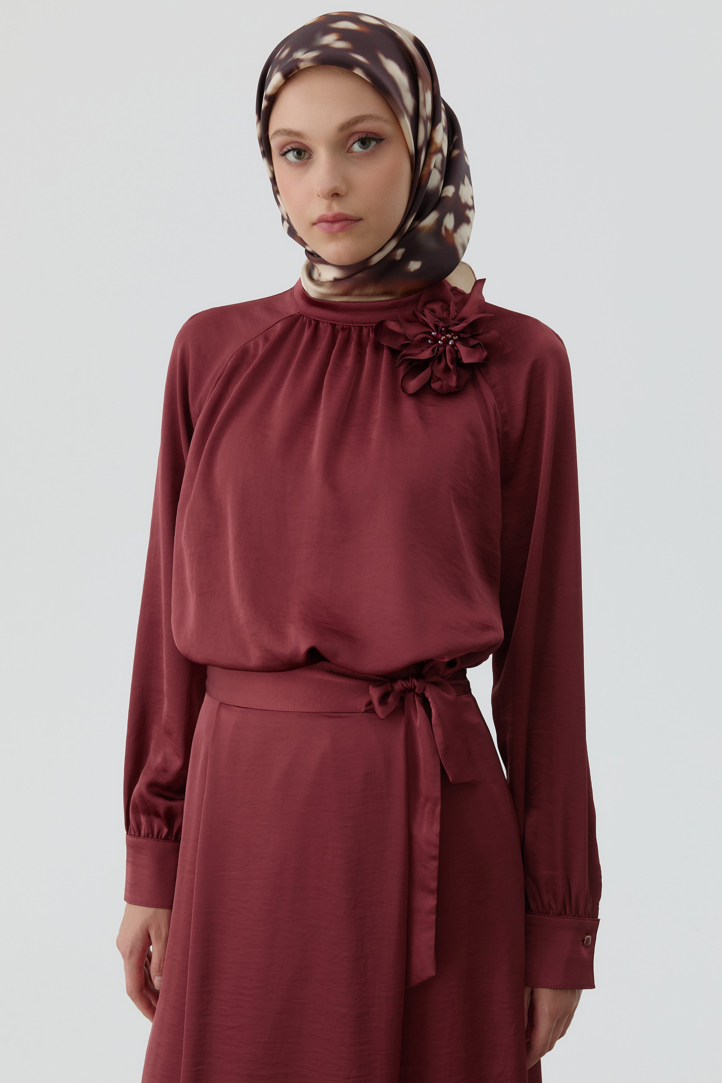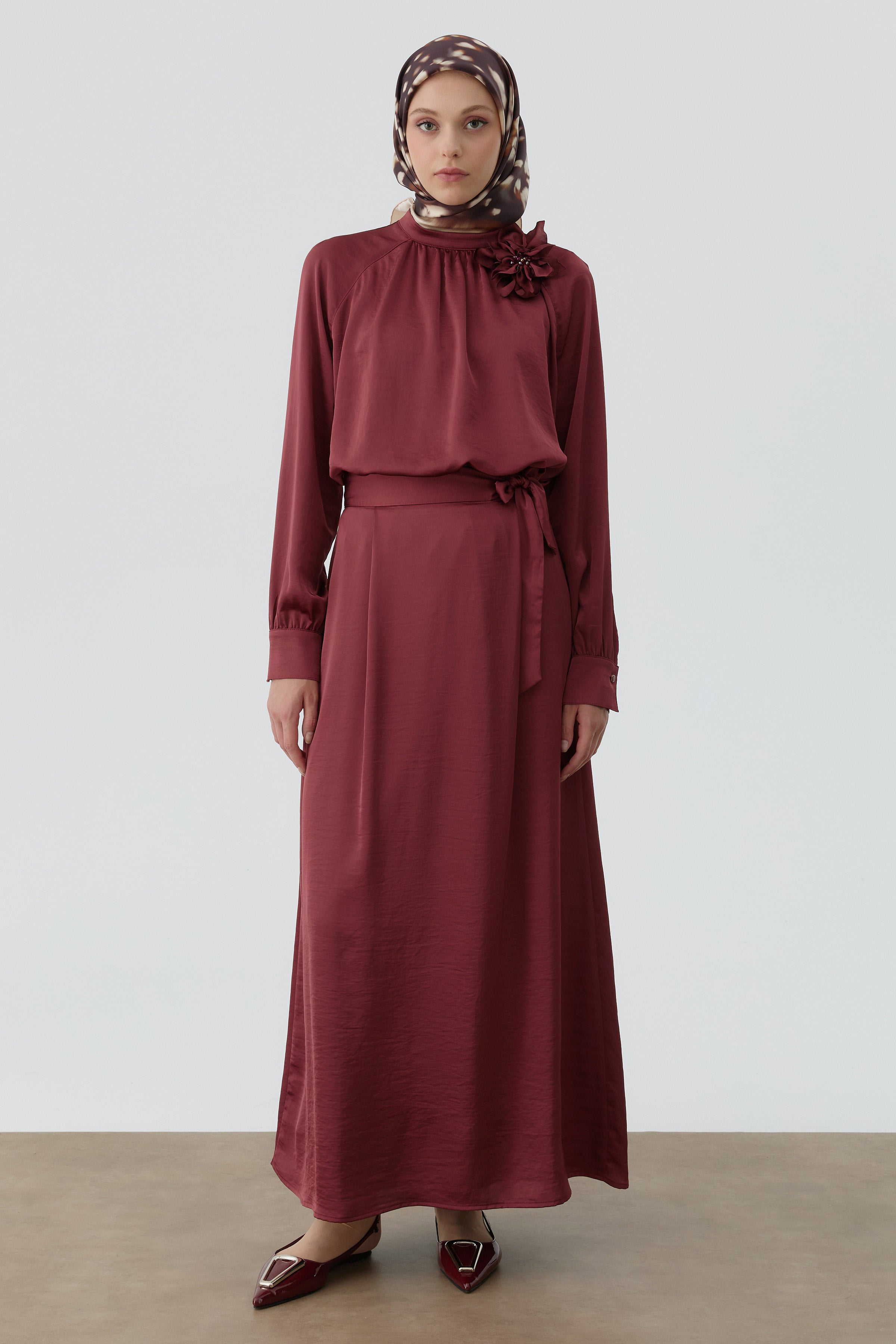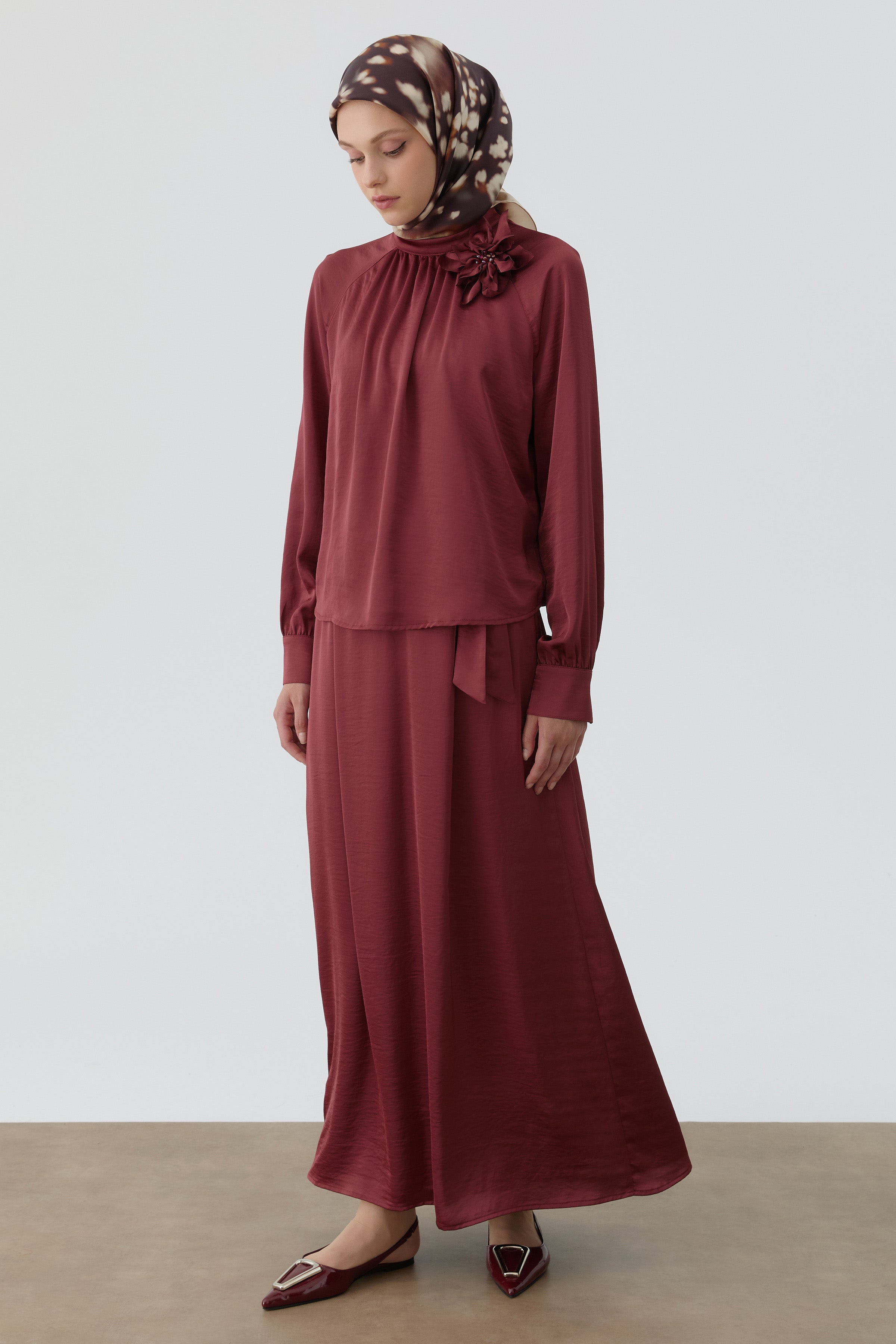 Brooch-Collar Blouse and Skirt Set - Claret Red