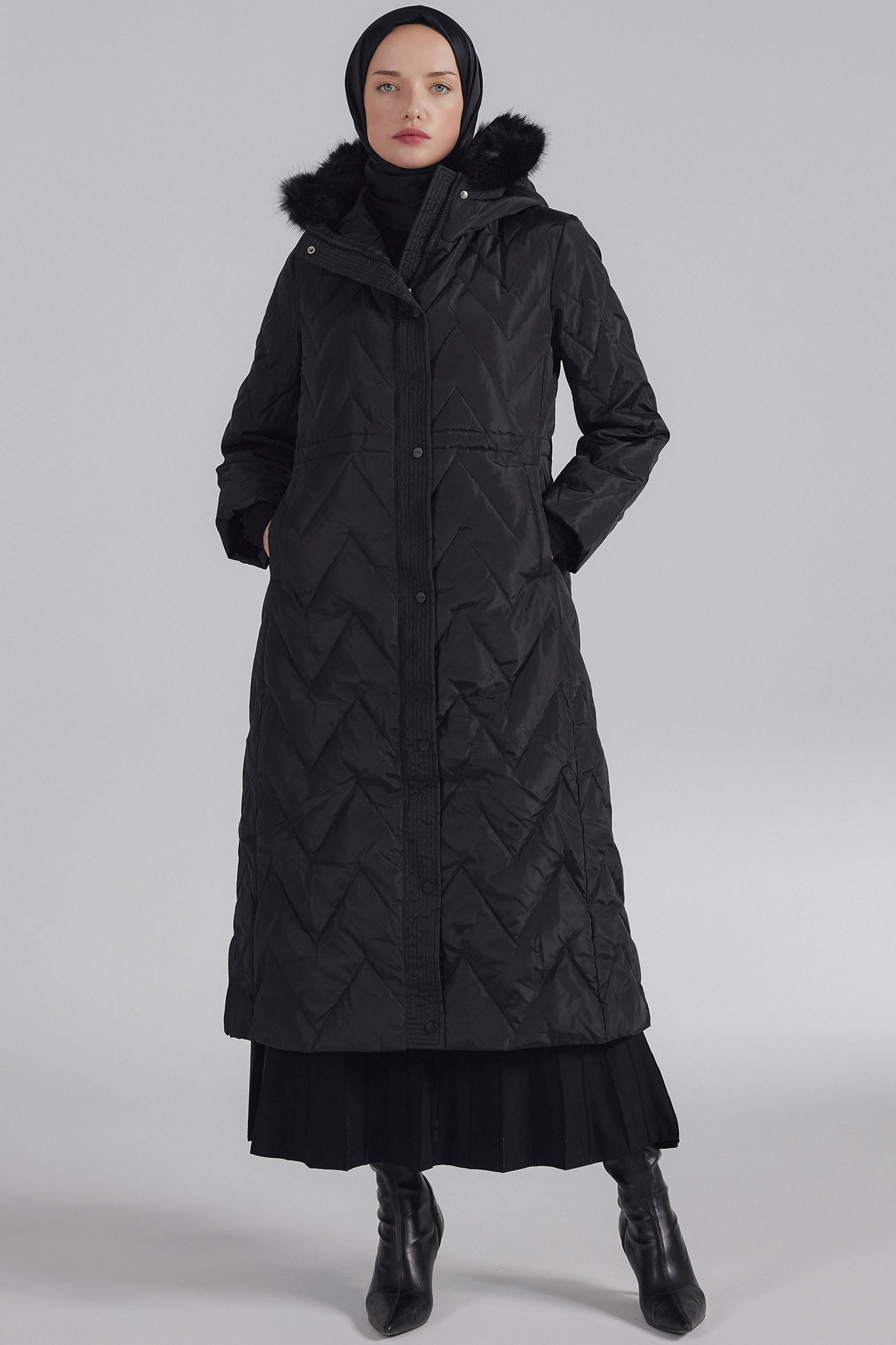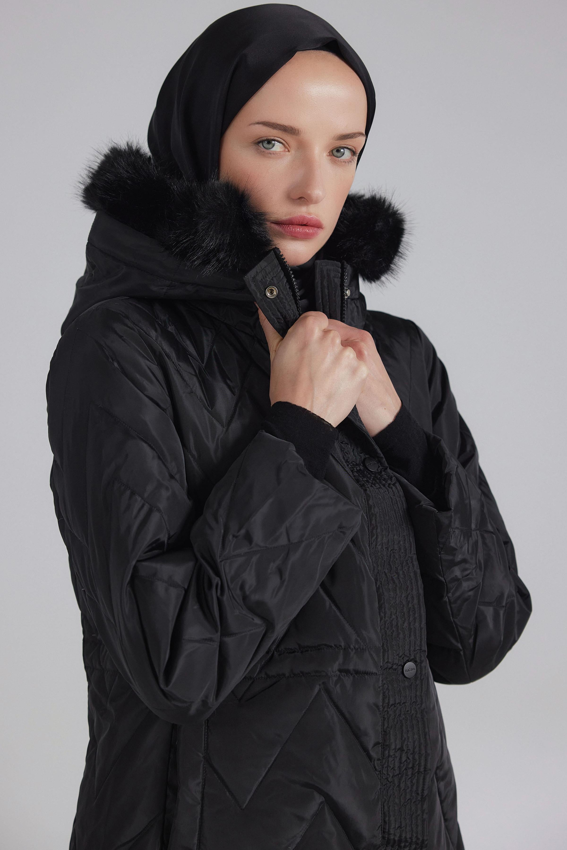 Zigzag Patterned Goose Down Coat - Black