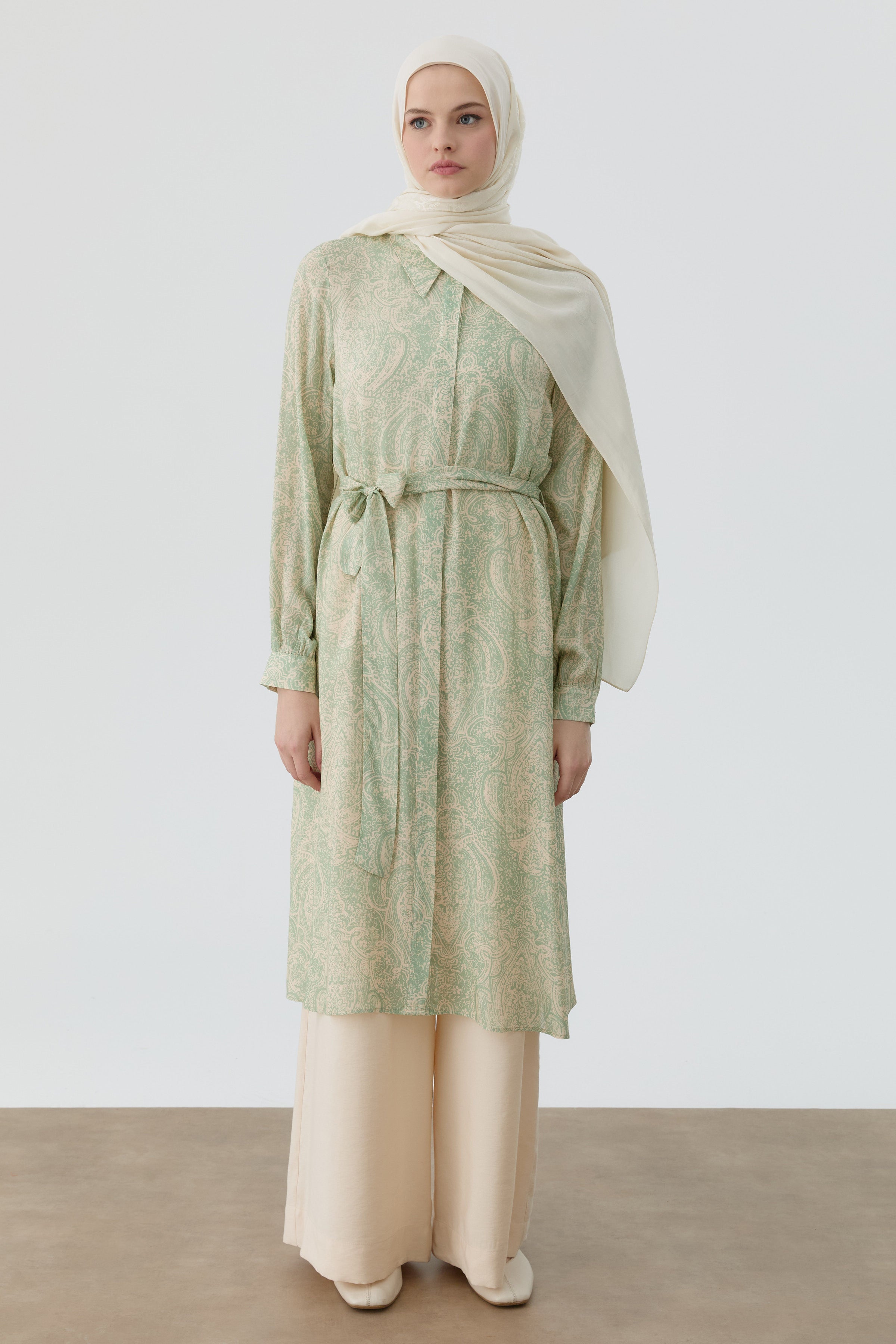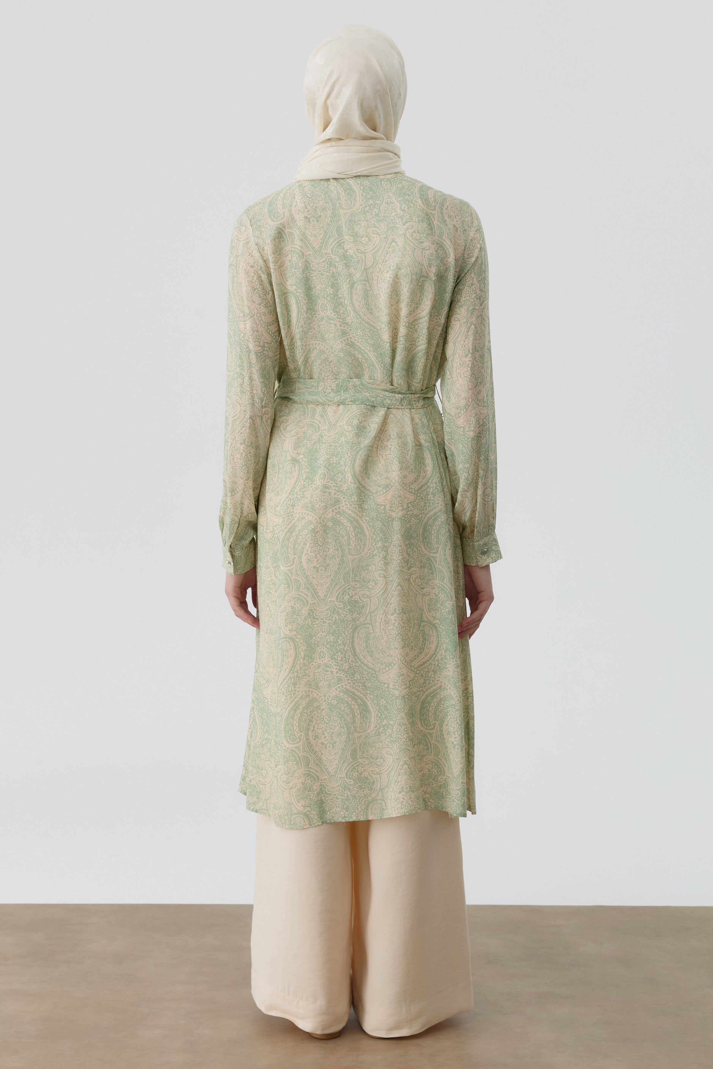 La túnica con cinturón y estampado paisley, que combina diseños clásicos con un corte moderno, aporta un toque único a tu estilo. Las elegantes transiciones del estampado paisley, junto con la silueta relajada de la túnica, crean una armonía entre elegancia y comodidad.