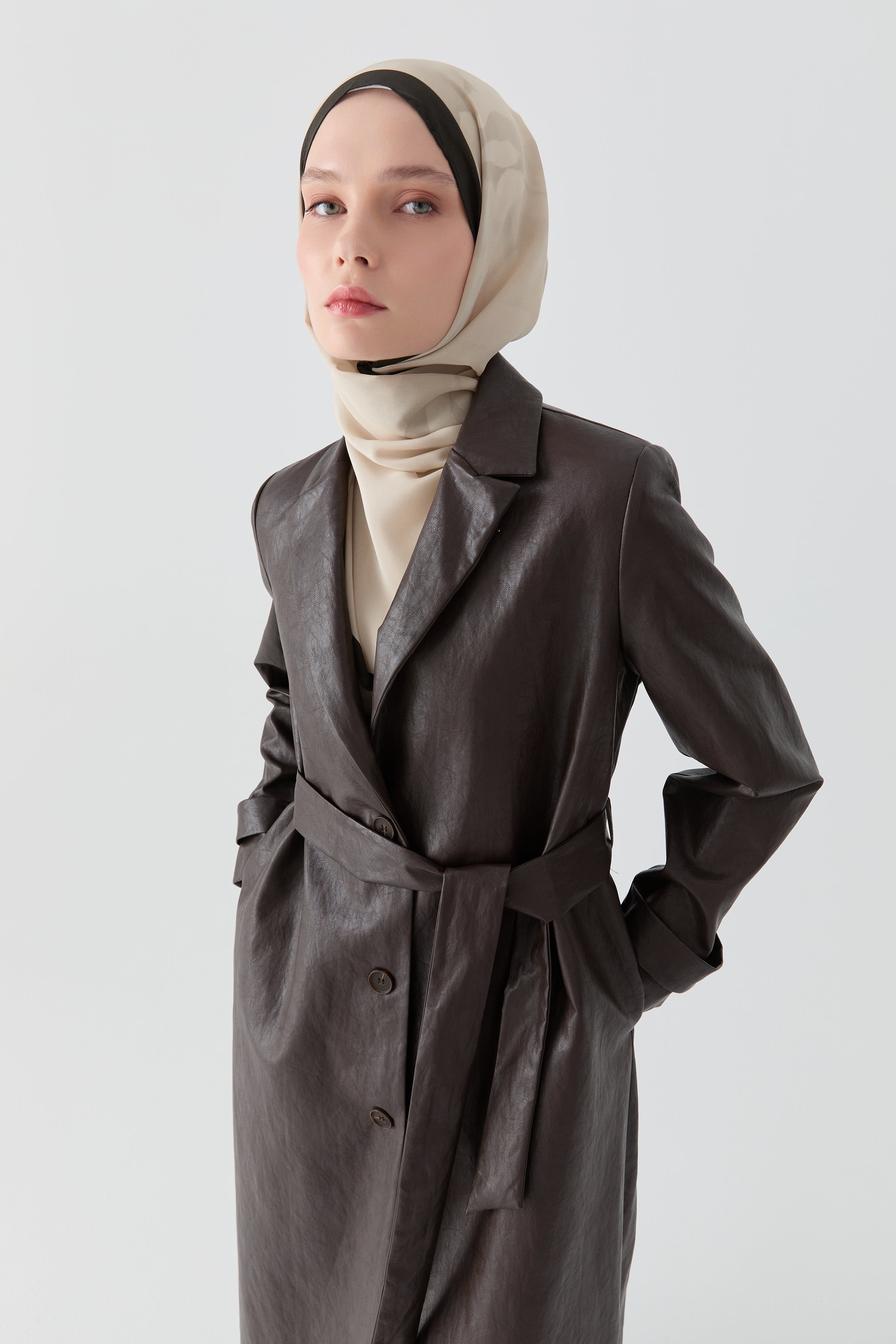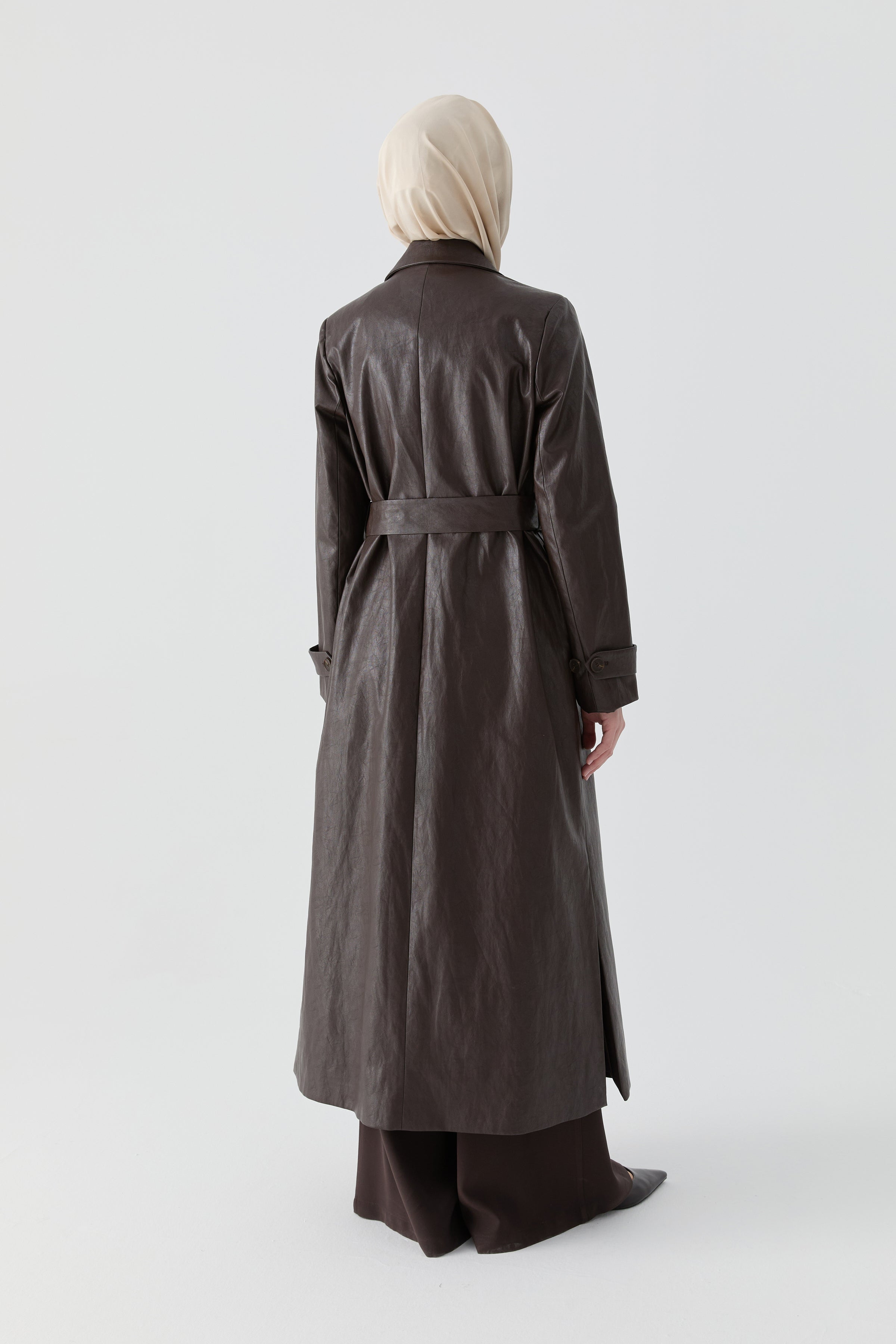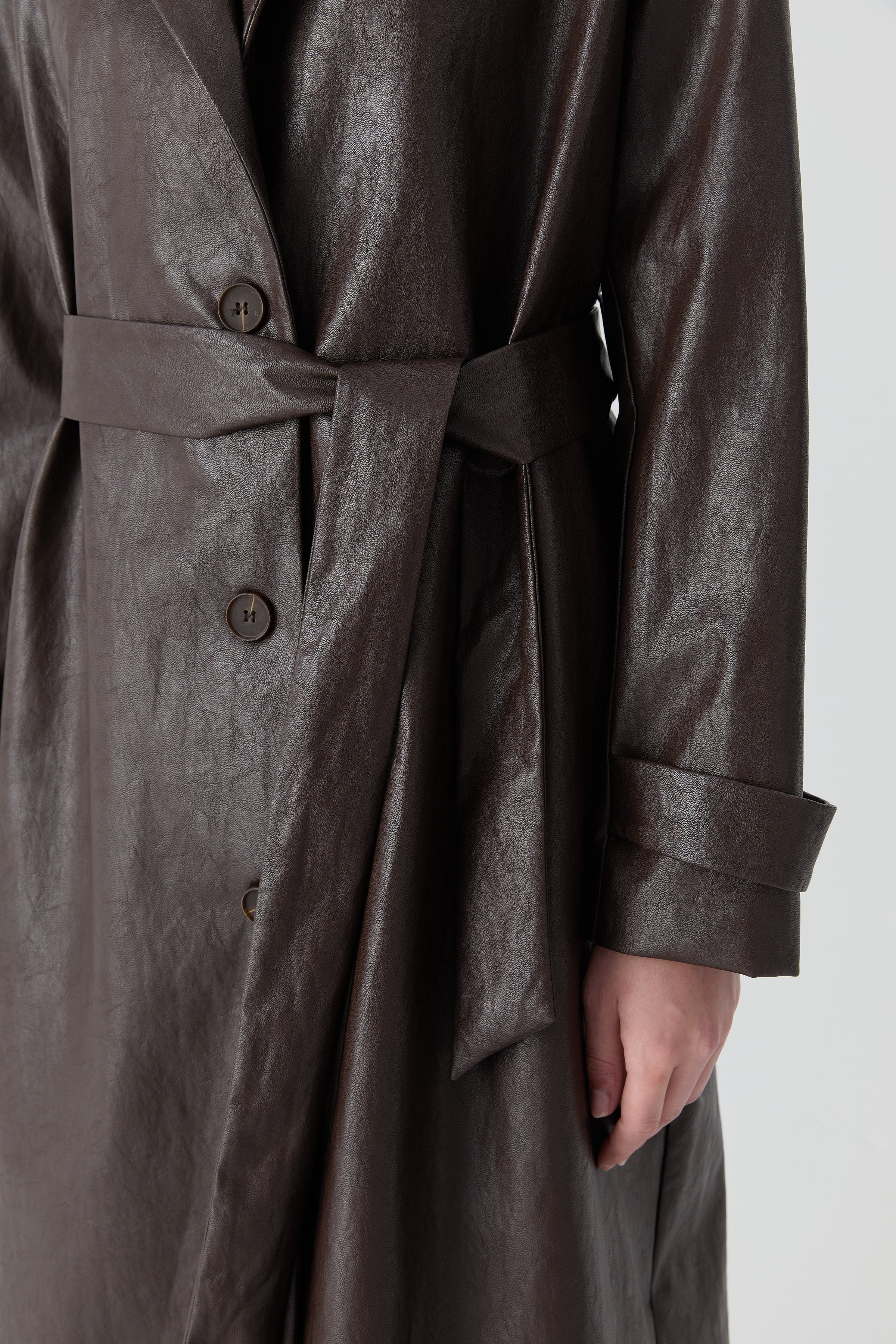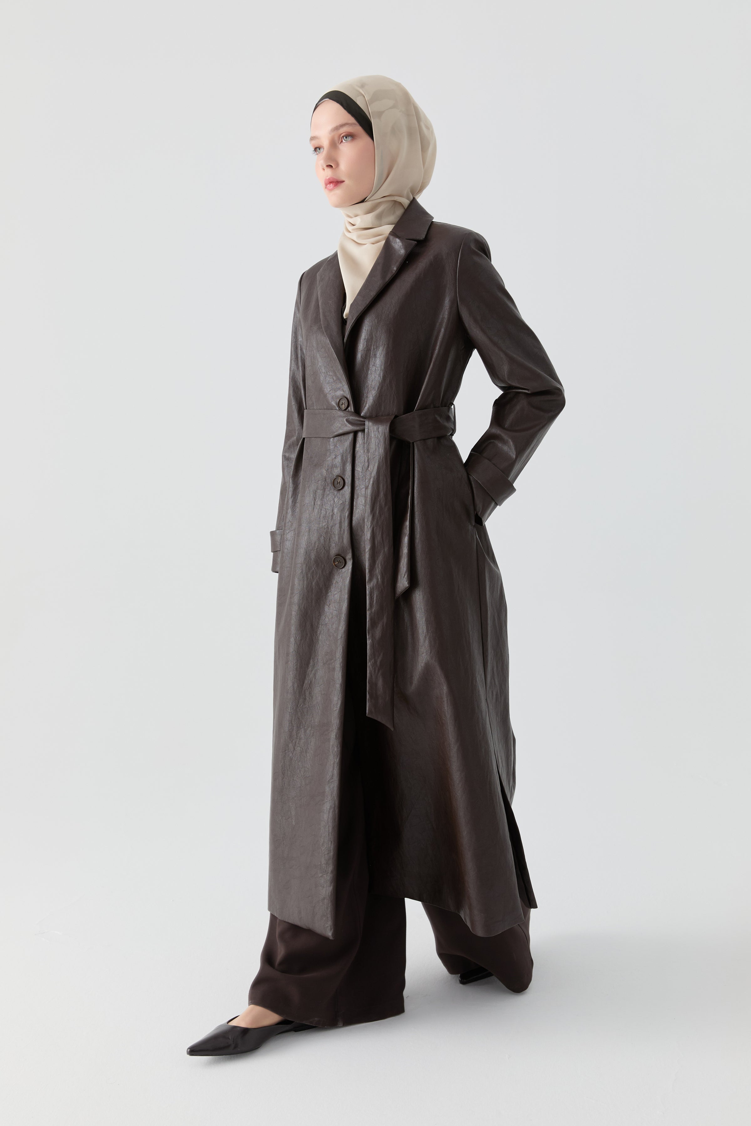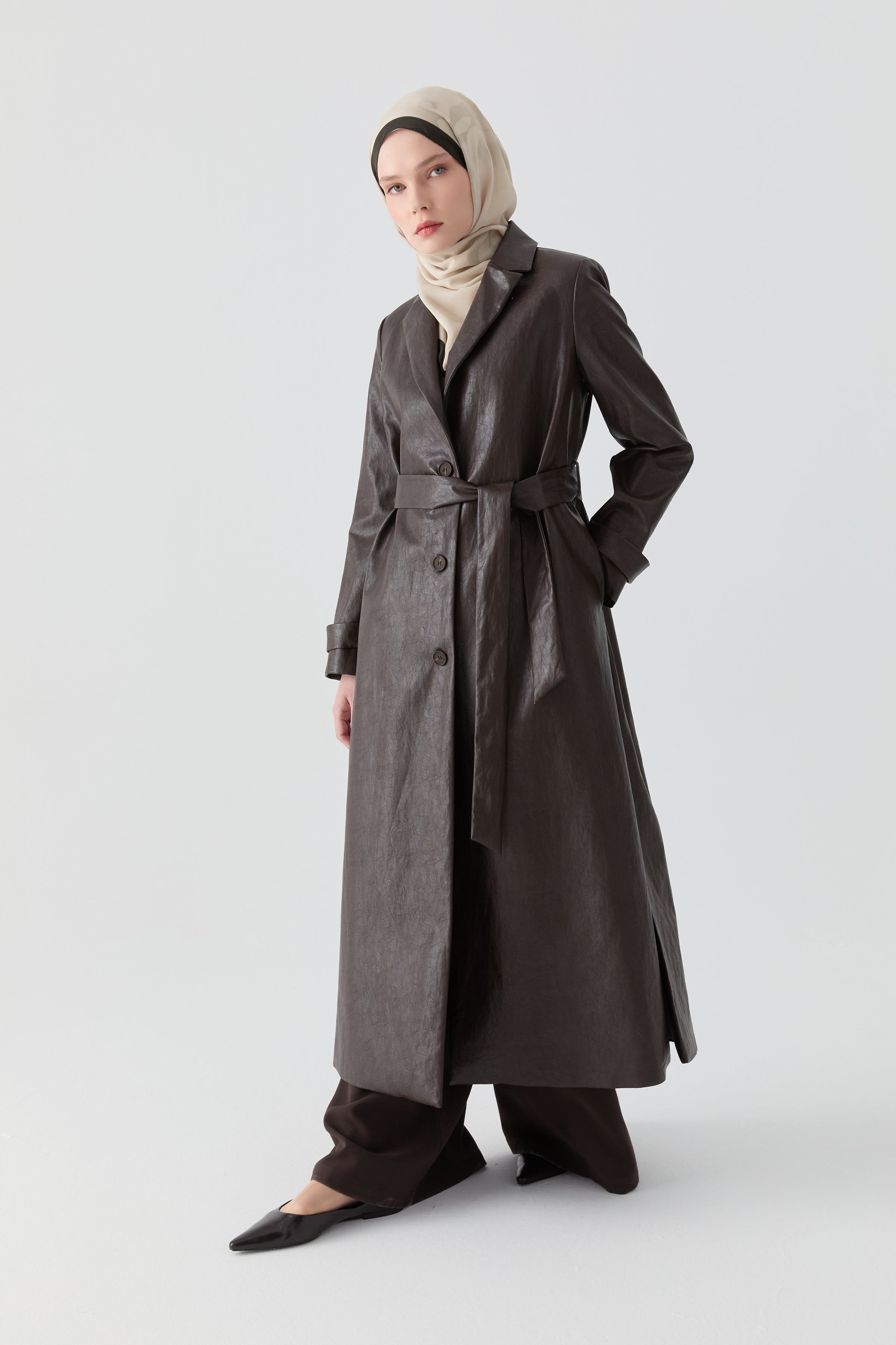 Esta prenda, que reinventa con fuerza la silueta clásica del trench coat, transforma la elegancia en un estilo audaz gracias a su textura de cuero. Su diseño atemporal crea un look impactante tanto para el día como para la noche.