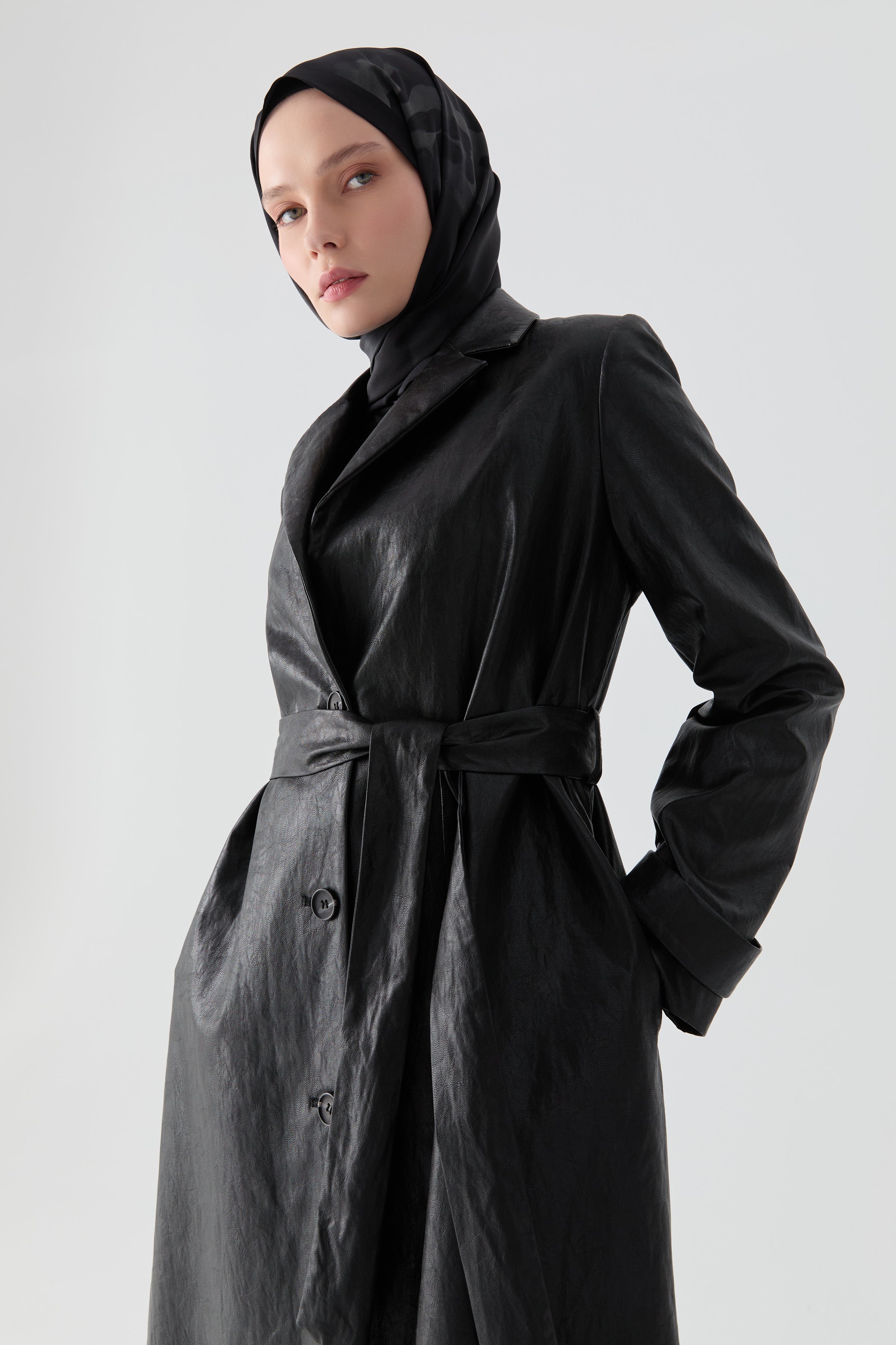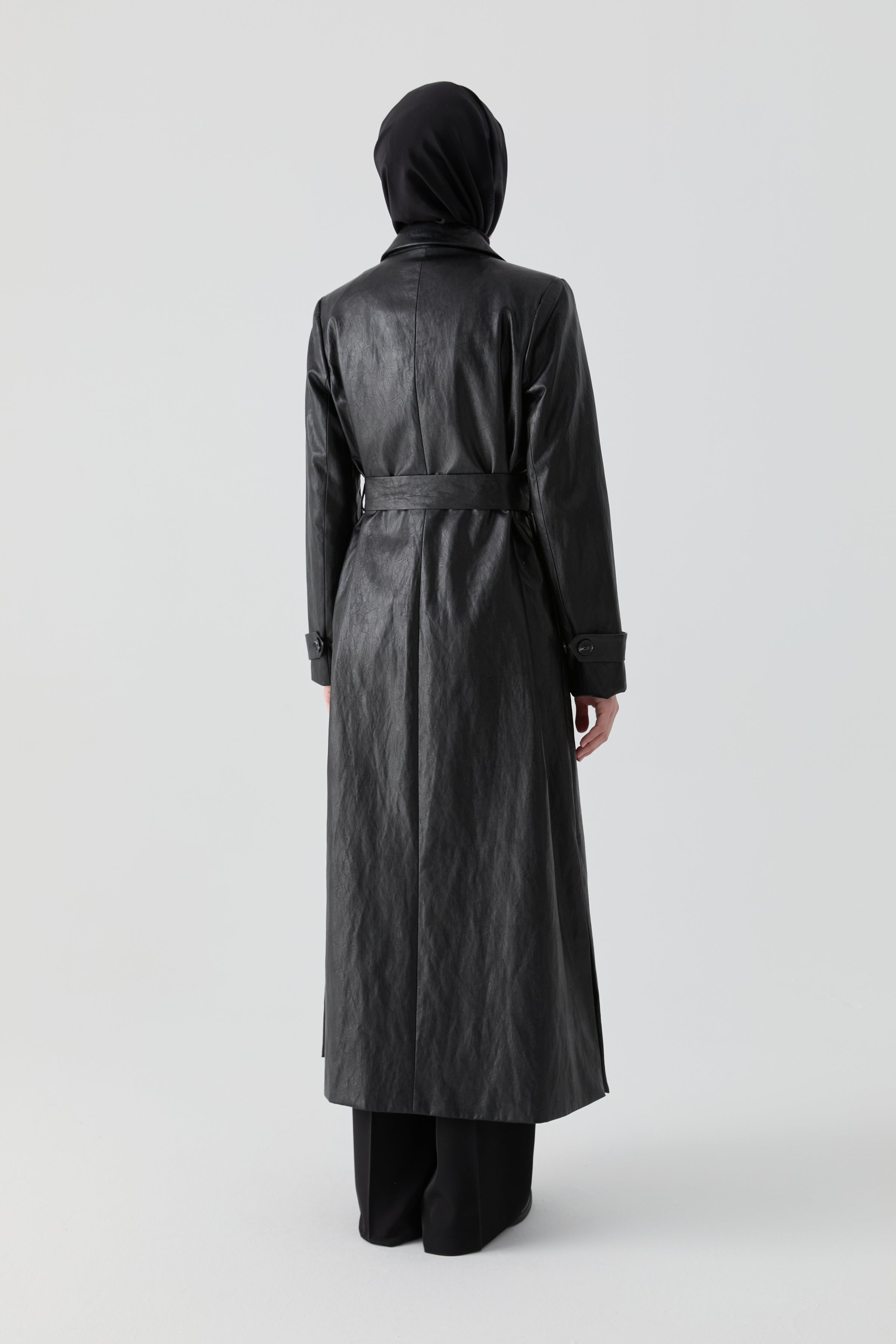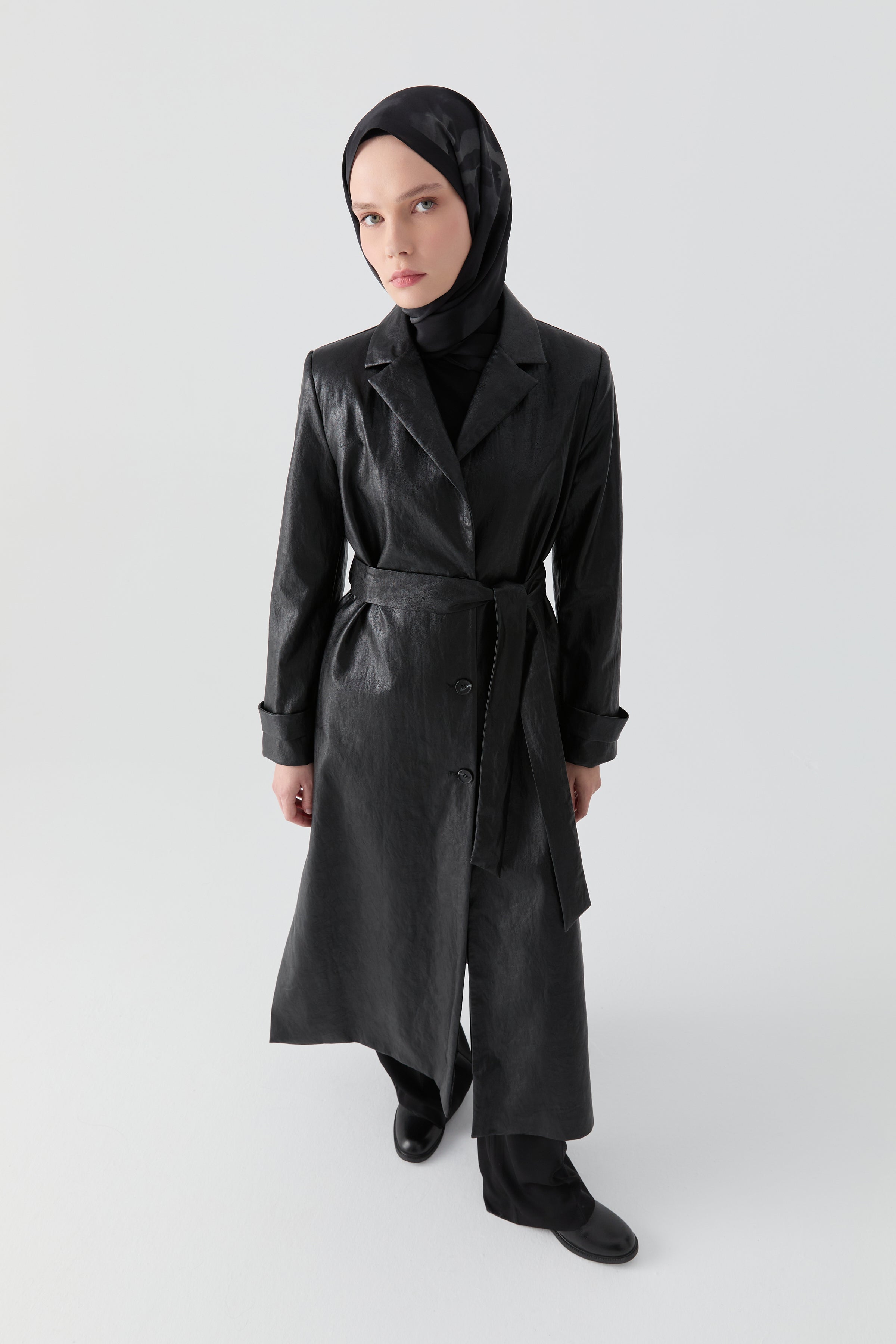 Esta prenda, que reinventa con fuerza la silueta clásica del trench coat, transforma la elegancia en un estilo audaz gracias a su textura de cuero. Su diseño atemporal crea un look impactante tanto para el día como para la noche.