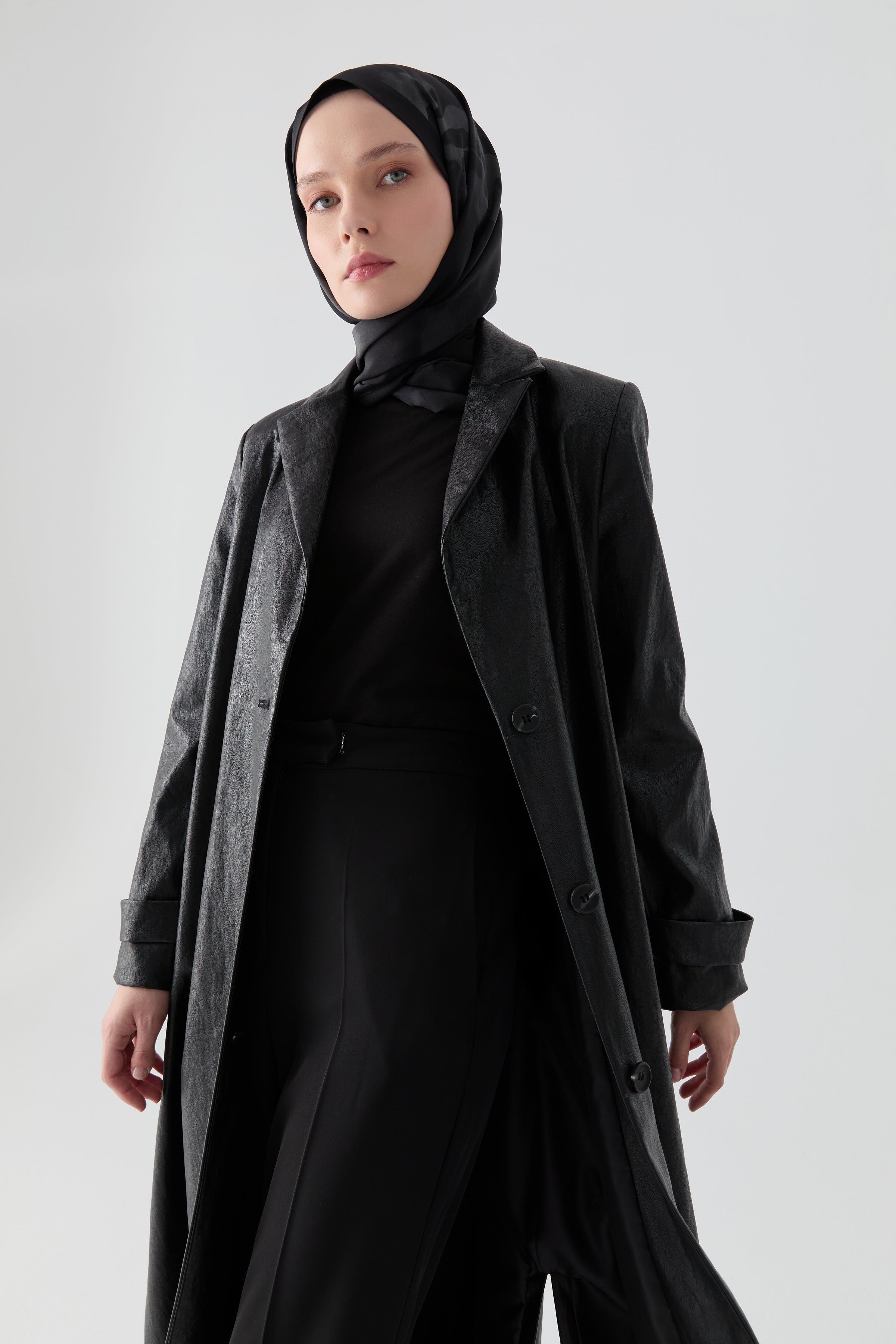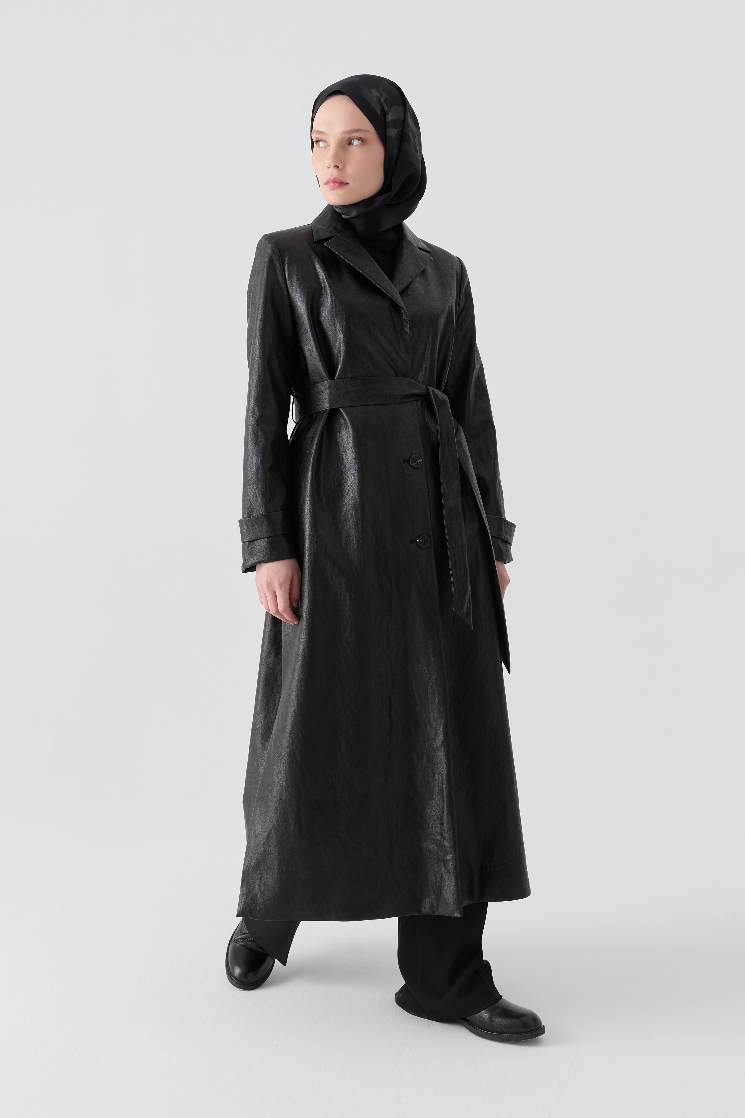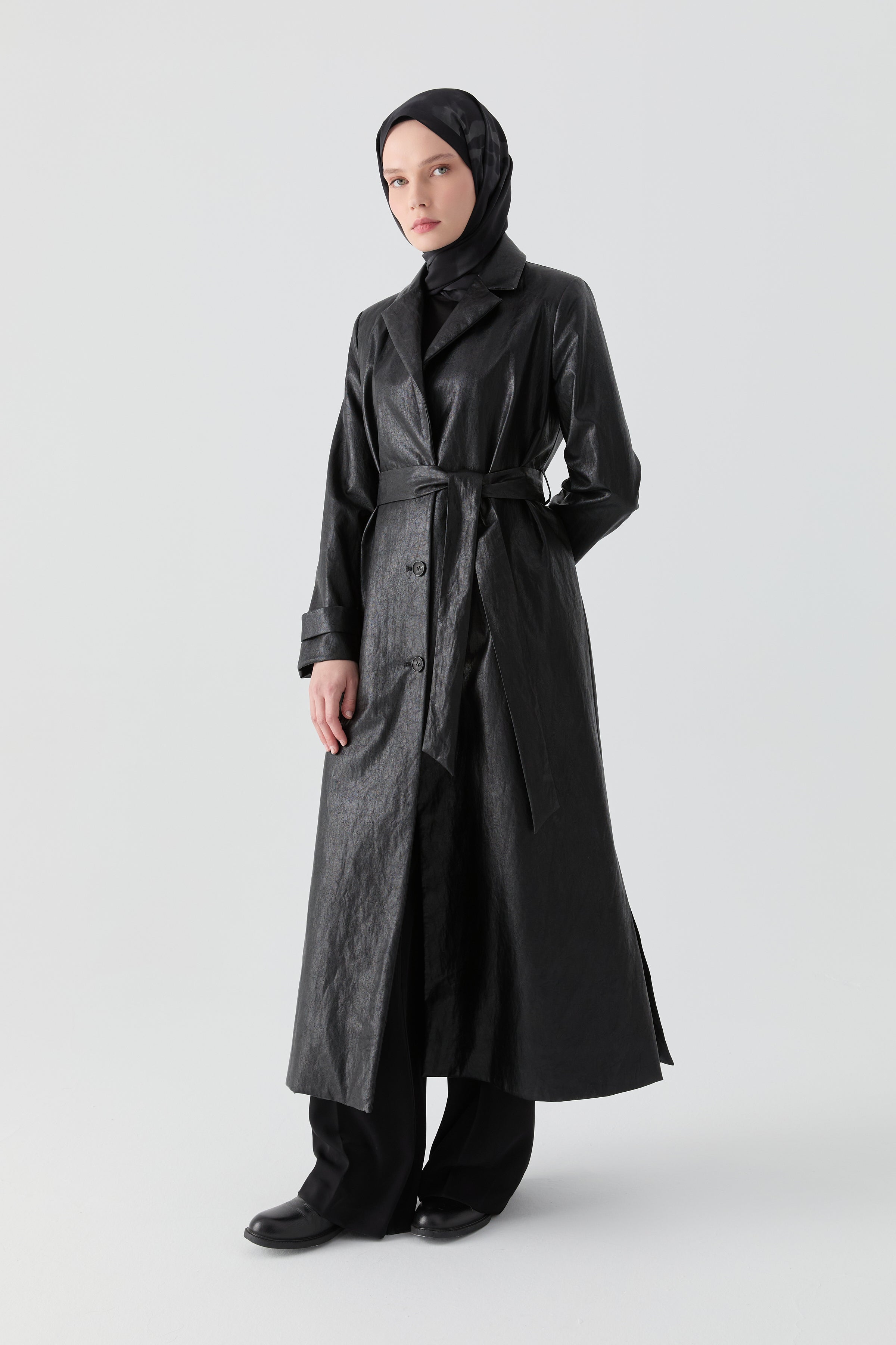 Esta prenda, que reinventa con fuerza la silueta clásica del trench coat, transforma la elegancia en un estilo audaz gracias a su textura de cuero. Su diseño atemporal crea un look impactante tanto para el día como para la noche.