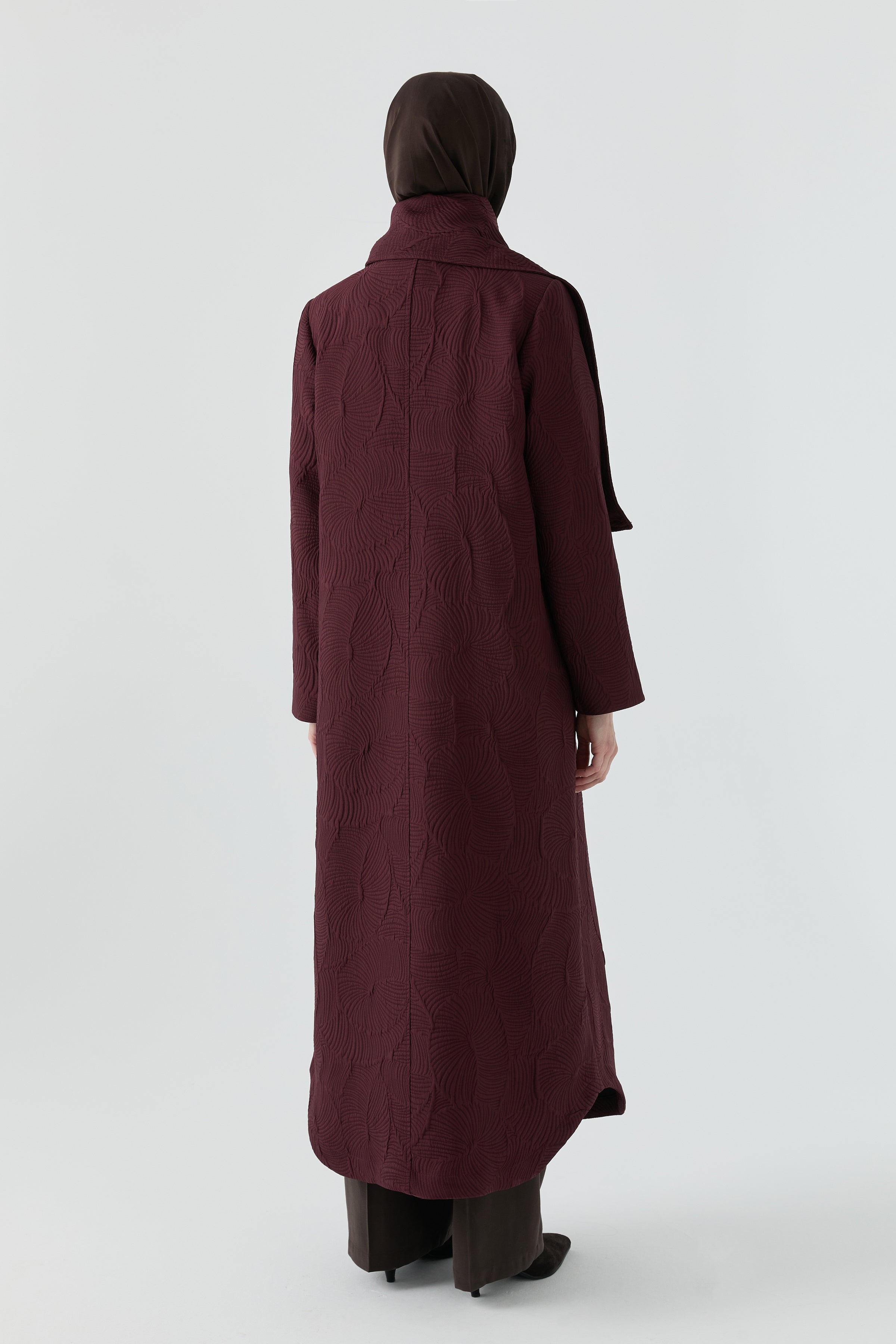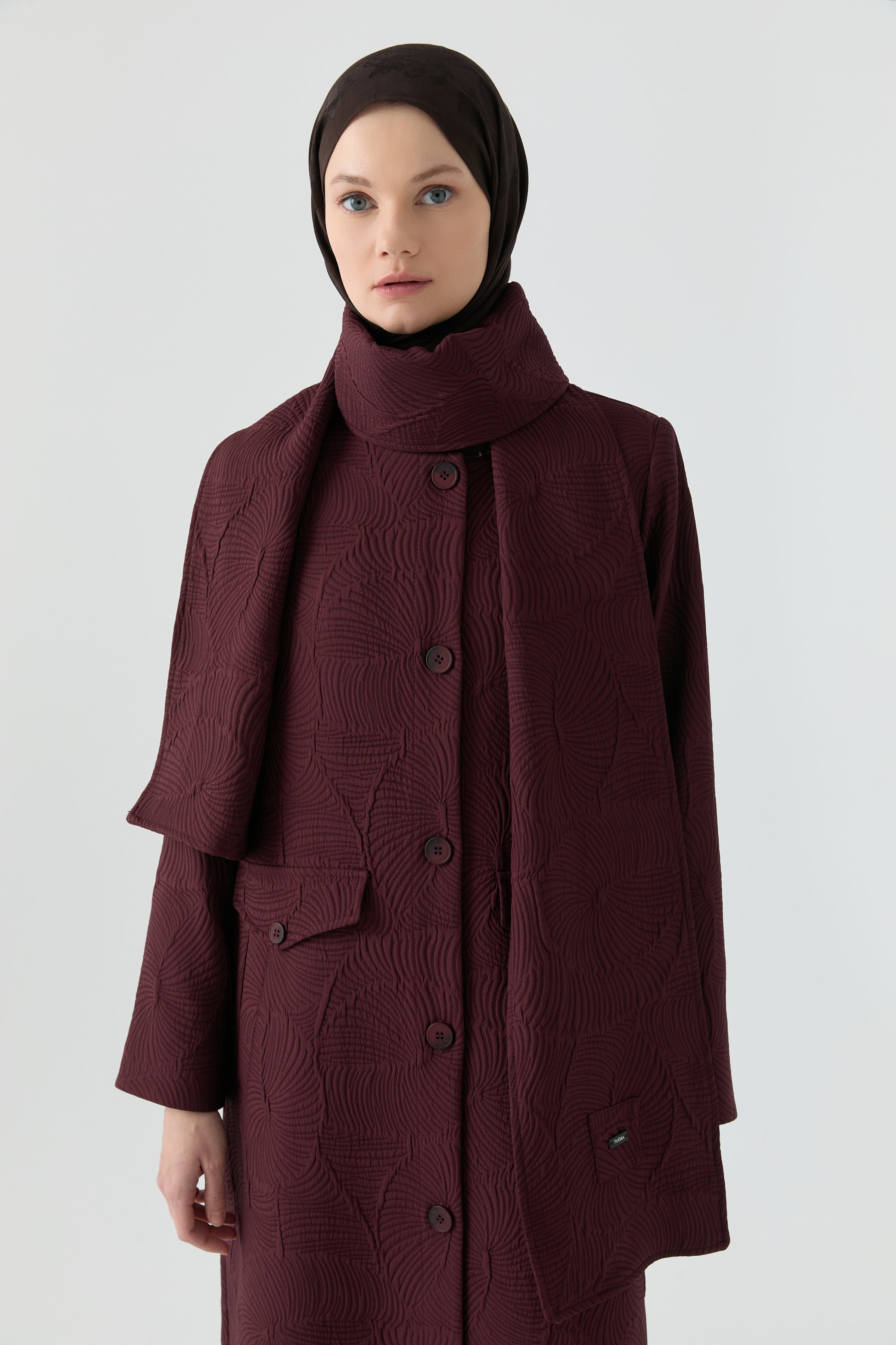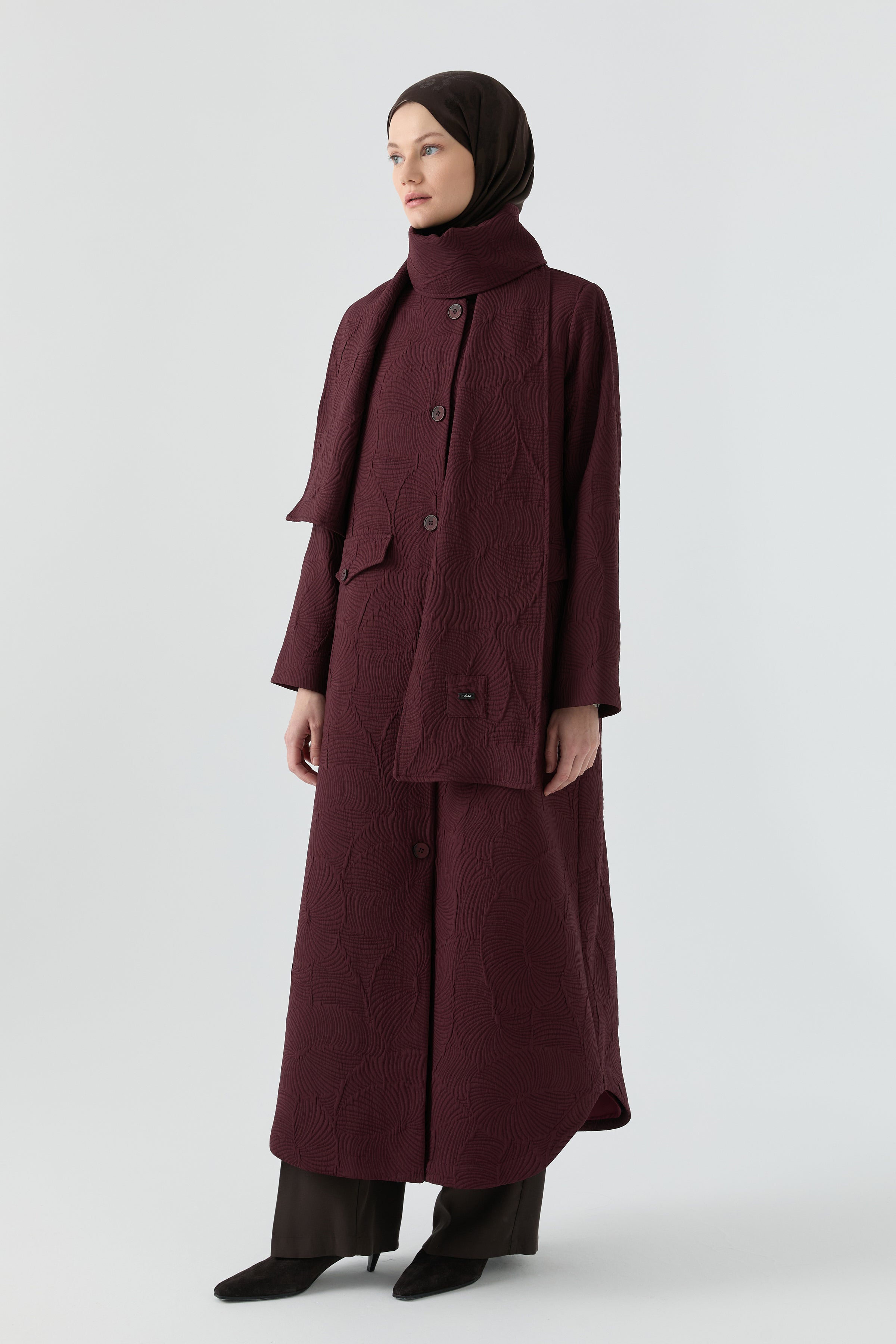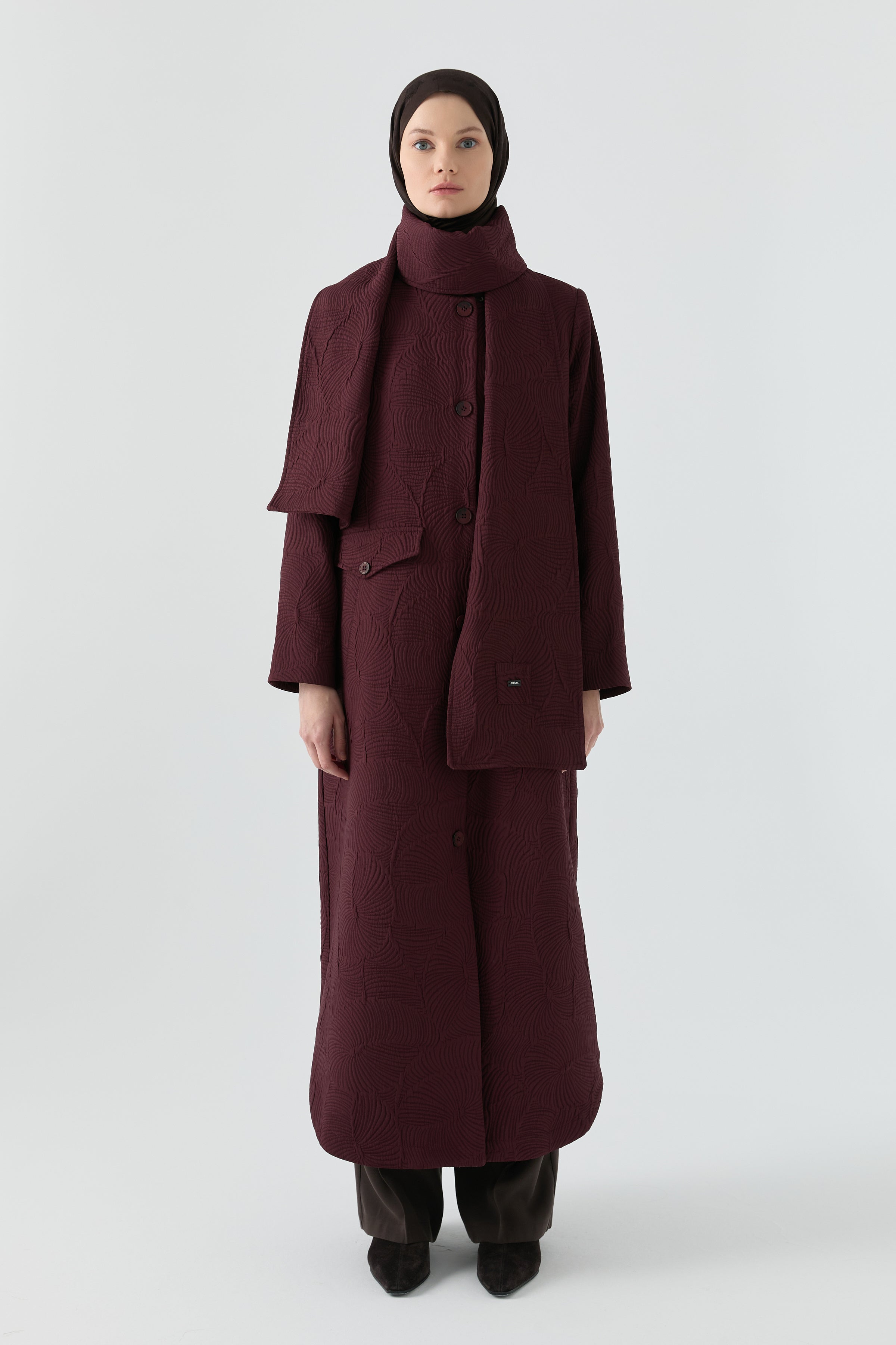 Su forma estructural aporta un toque moderno a la elegancia urbana, mientras que la combinación con la bufanda añade un aire sofisticado y armonioso. Su confección ligera proporciona calidez durante los cambios de estación, convirtiéndola en una prenda exterior práctica y elegante para el día a día.