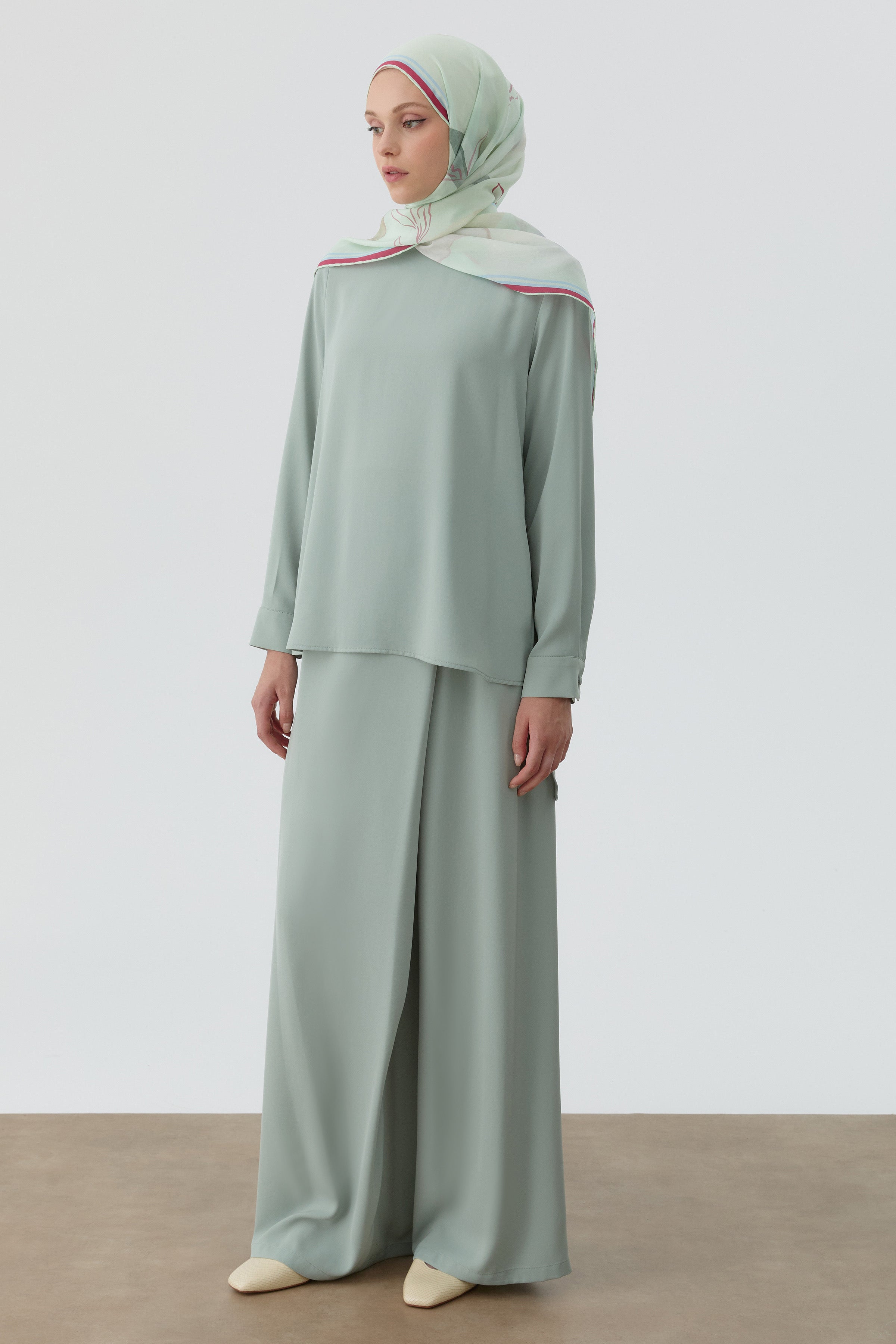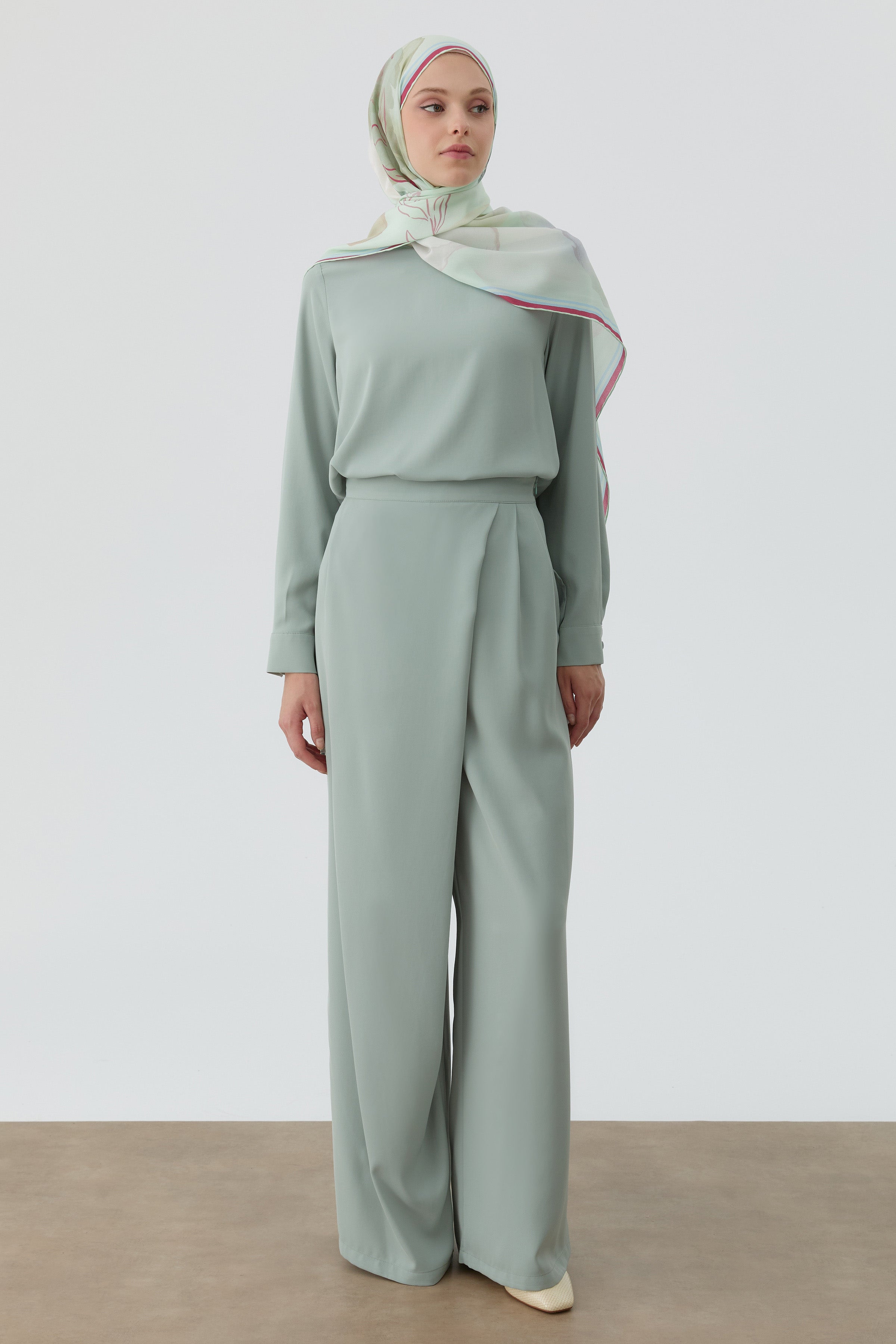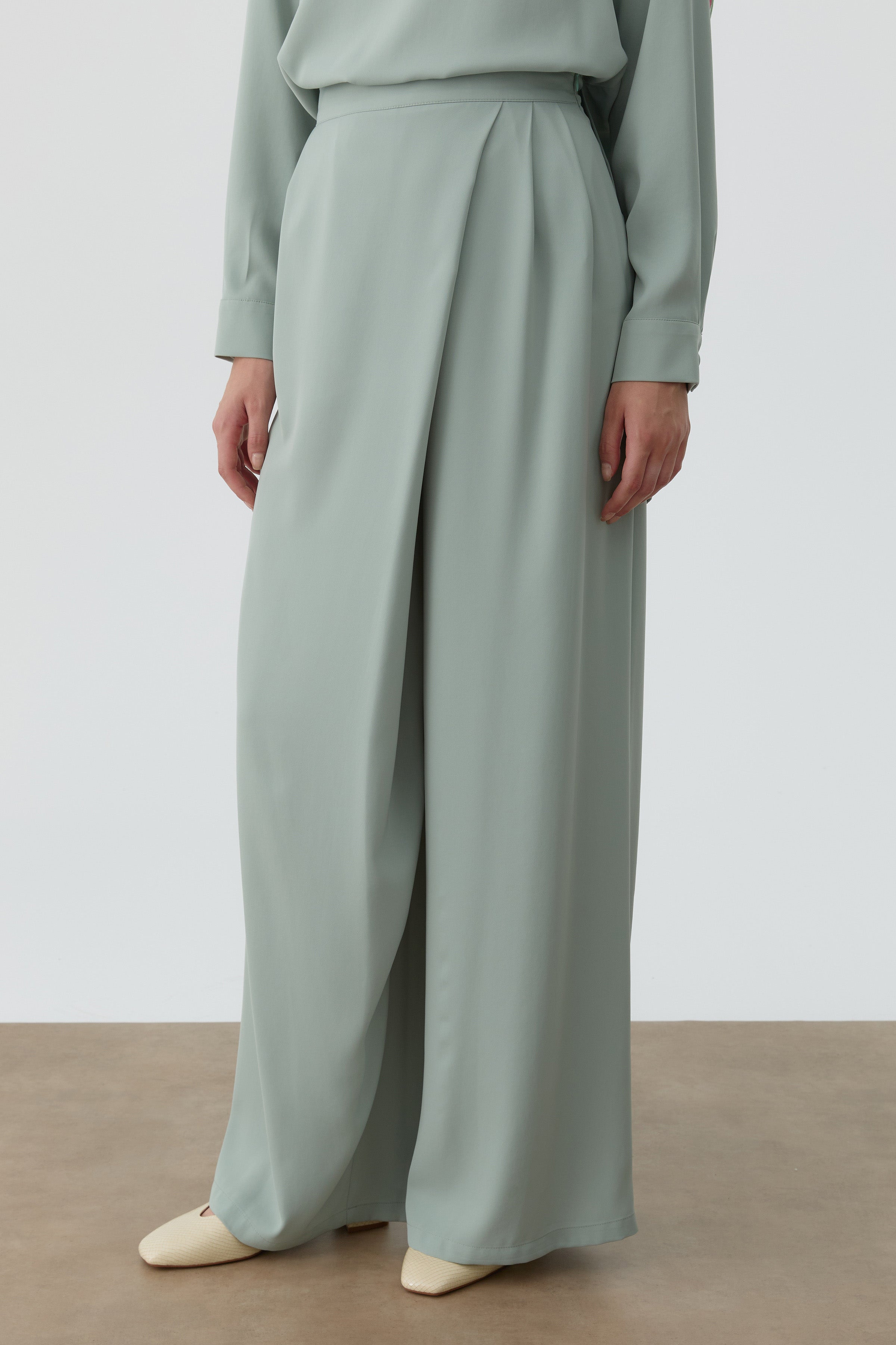 Con su corte cruzado que ofrece un efecto de capas, estos pantalones crean una silueta dinámica y fluida gracias a los detalles de pliegues.