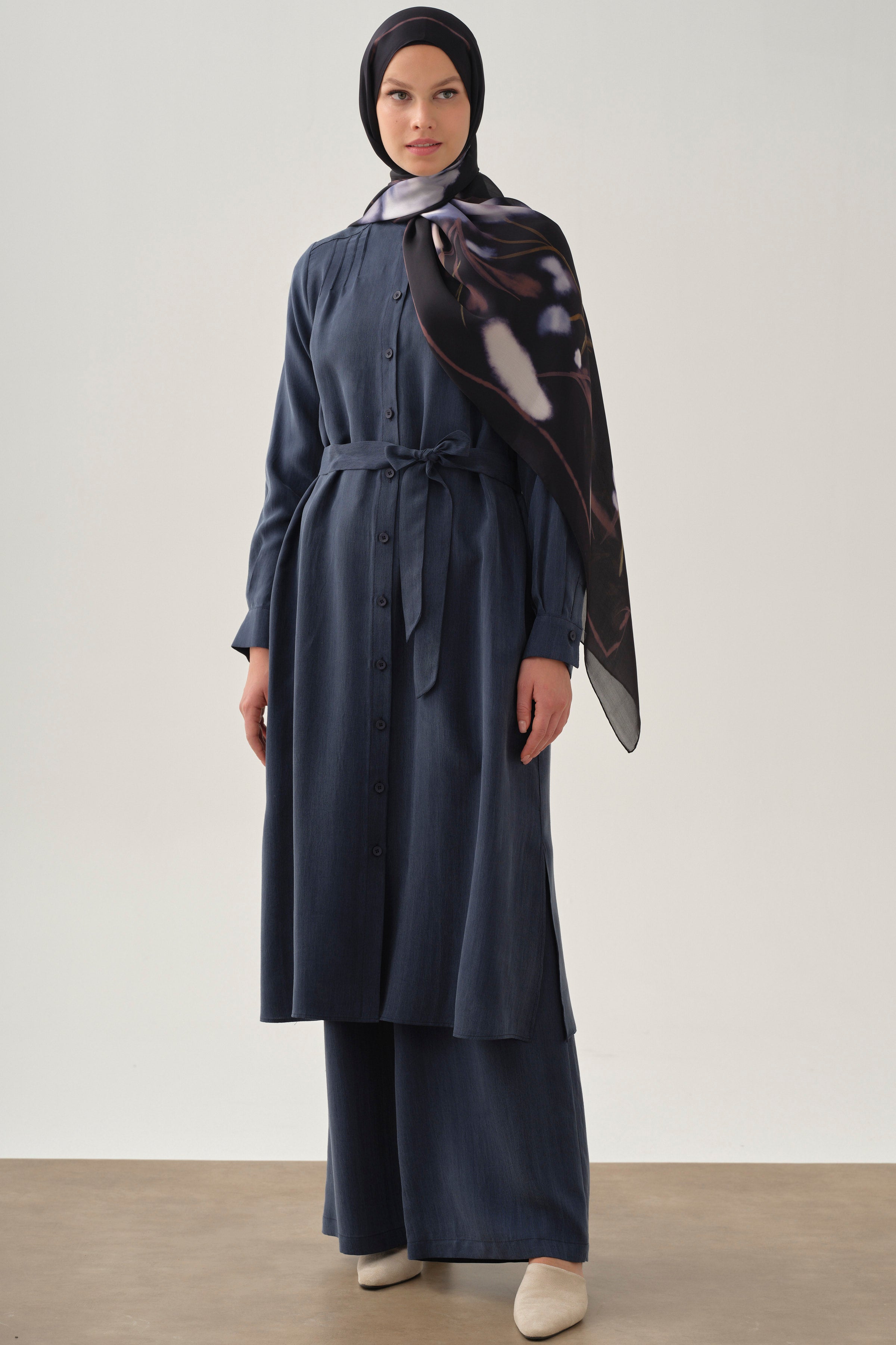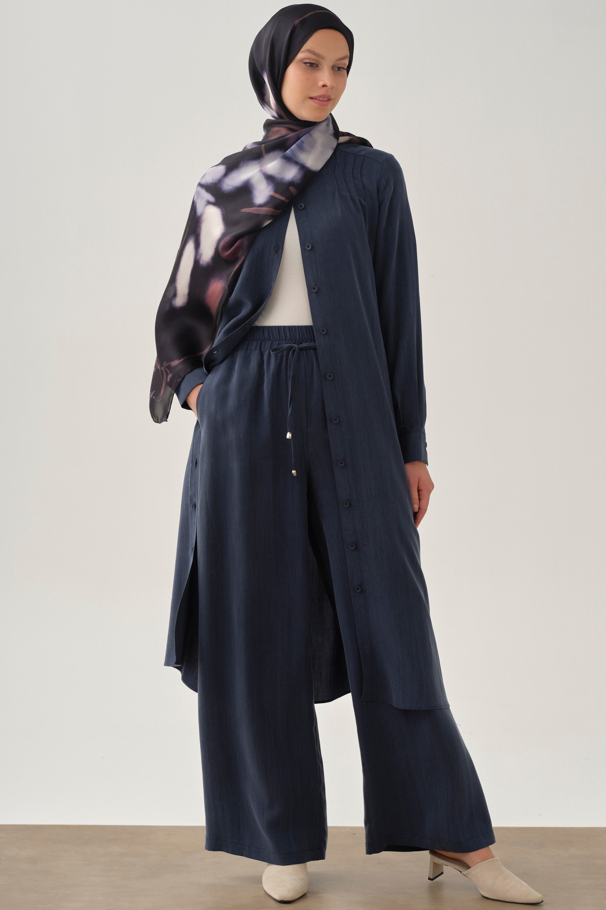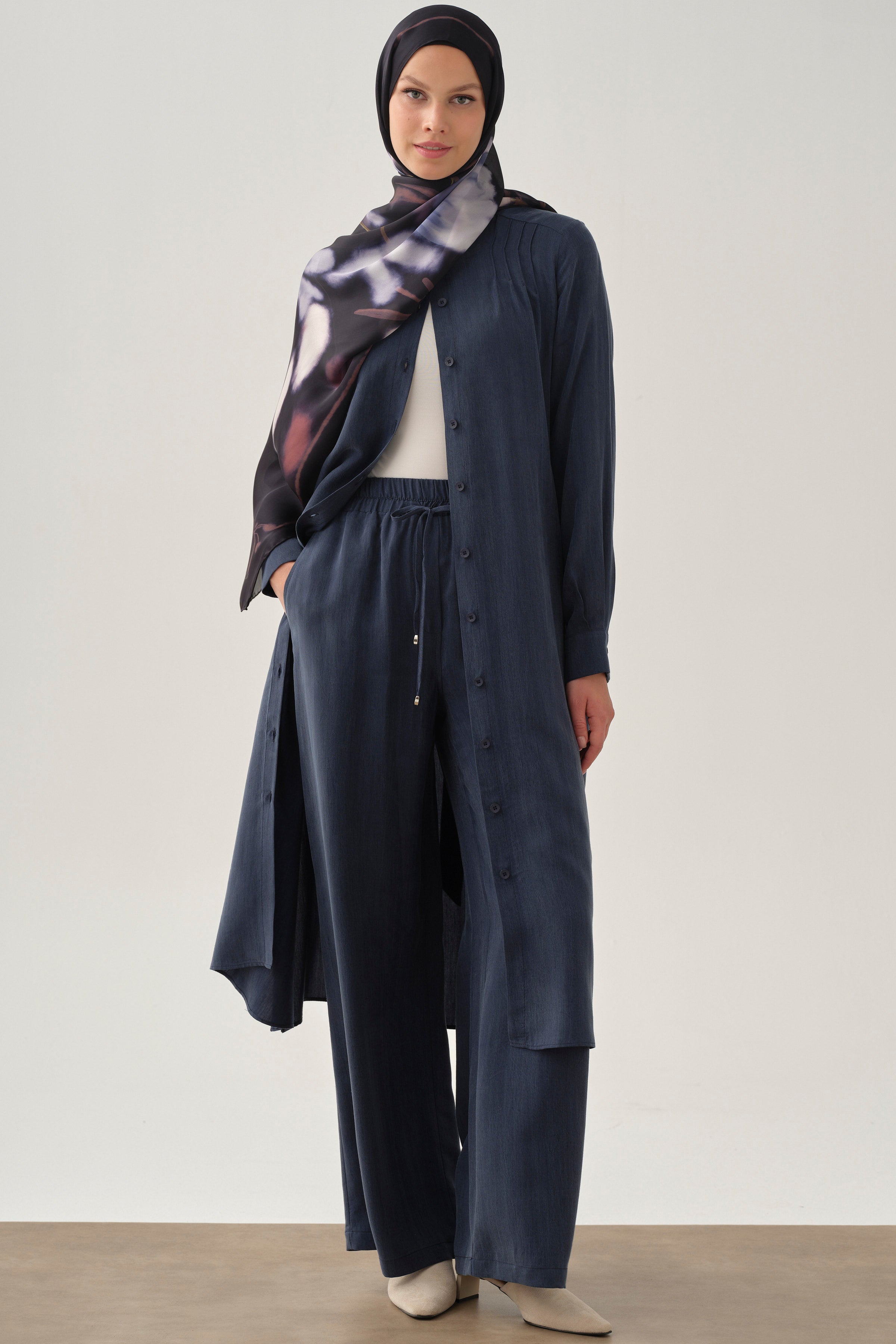 Pantalón azul marino con cintura elástica y detalle de lazo