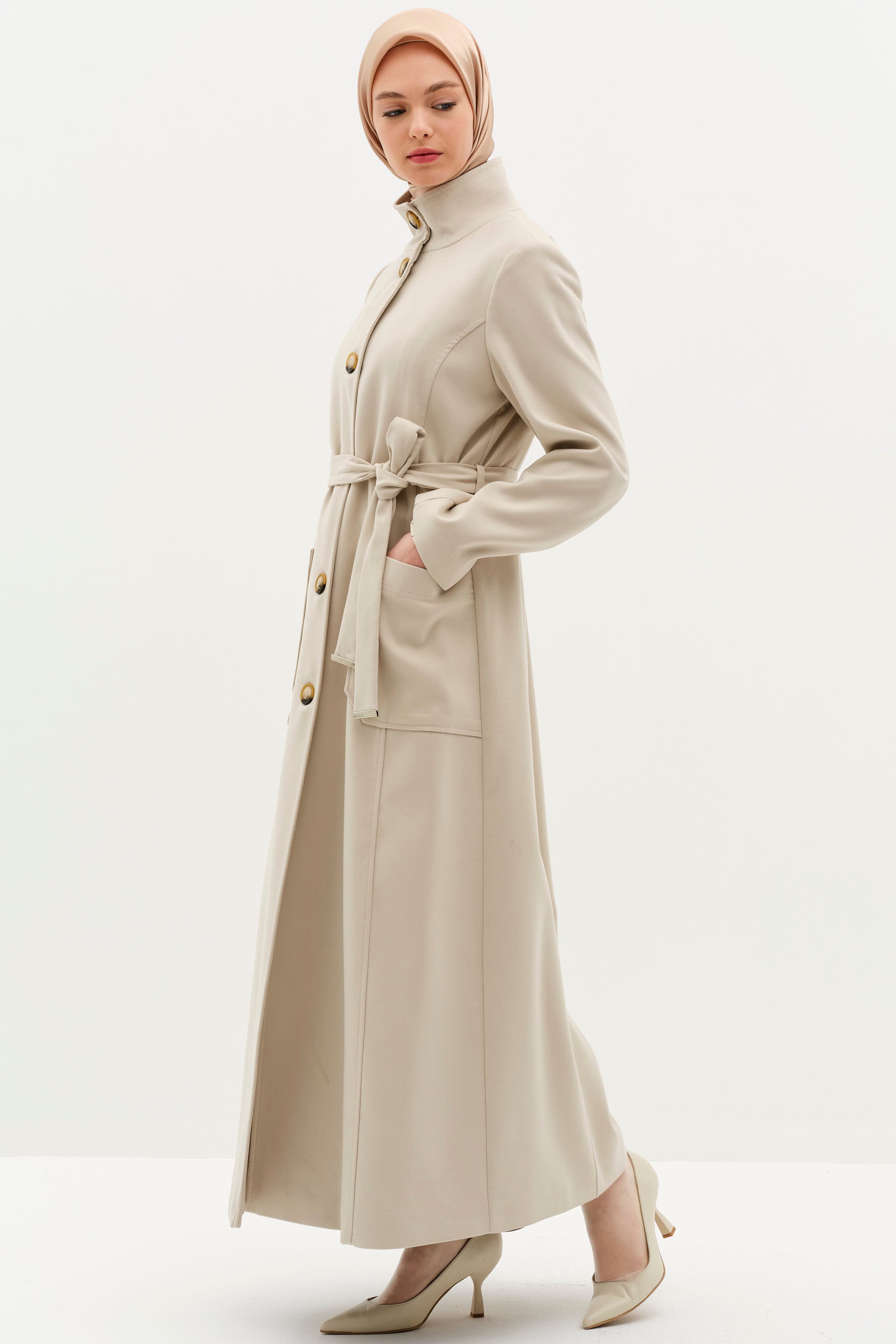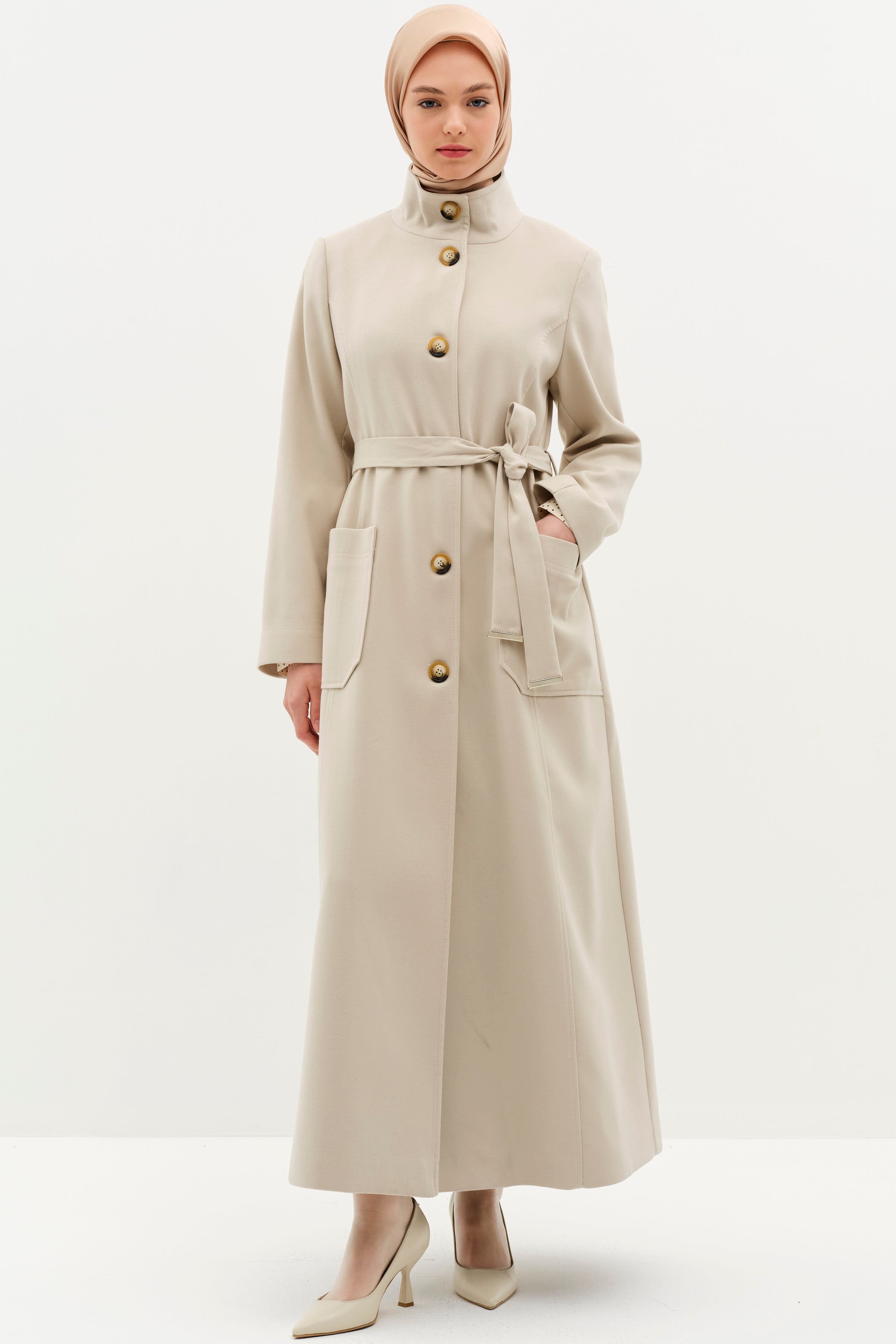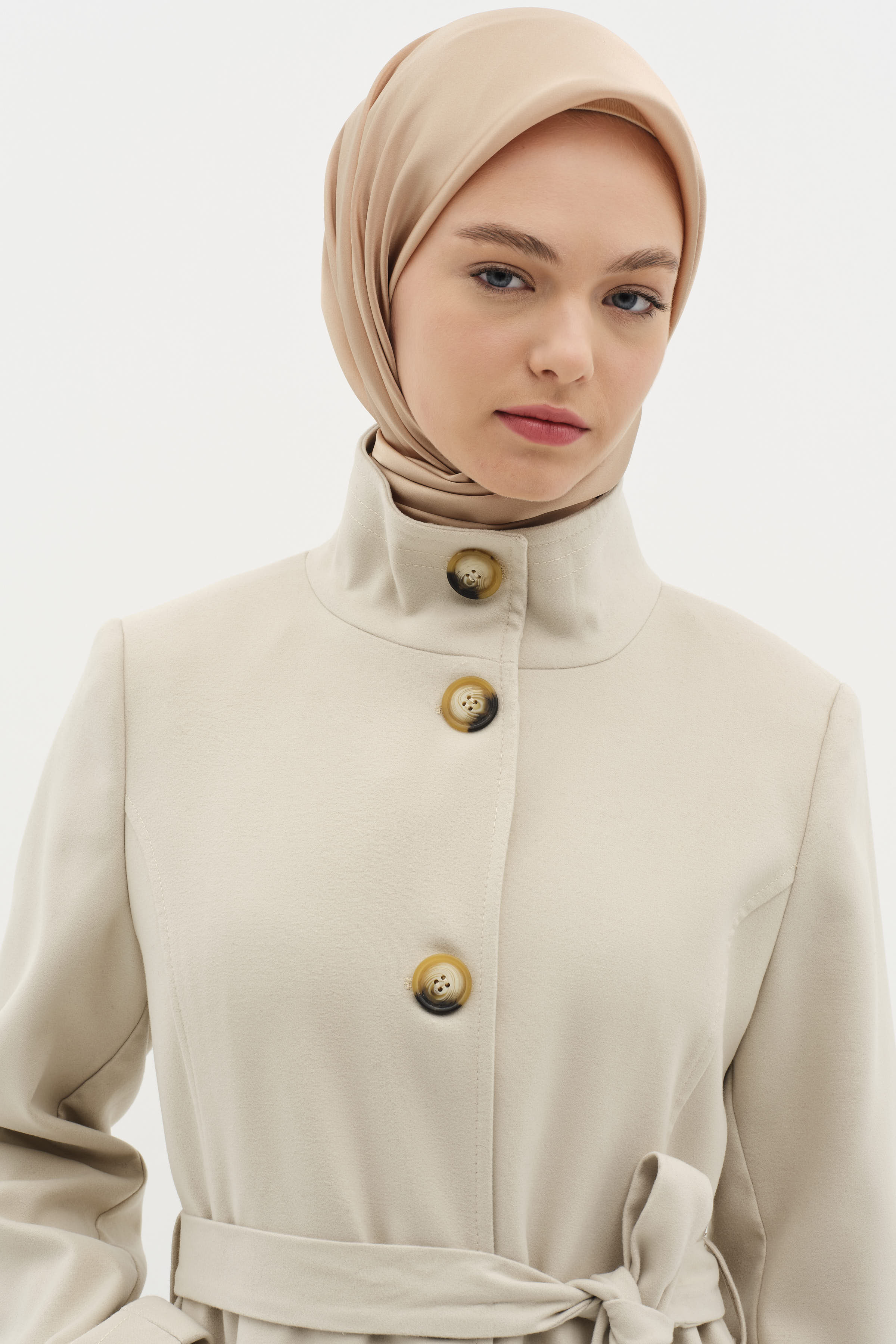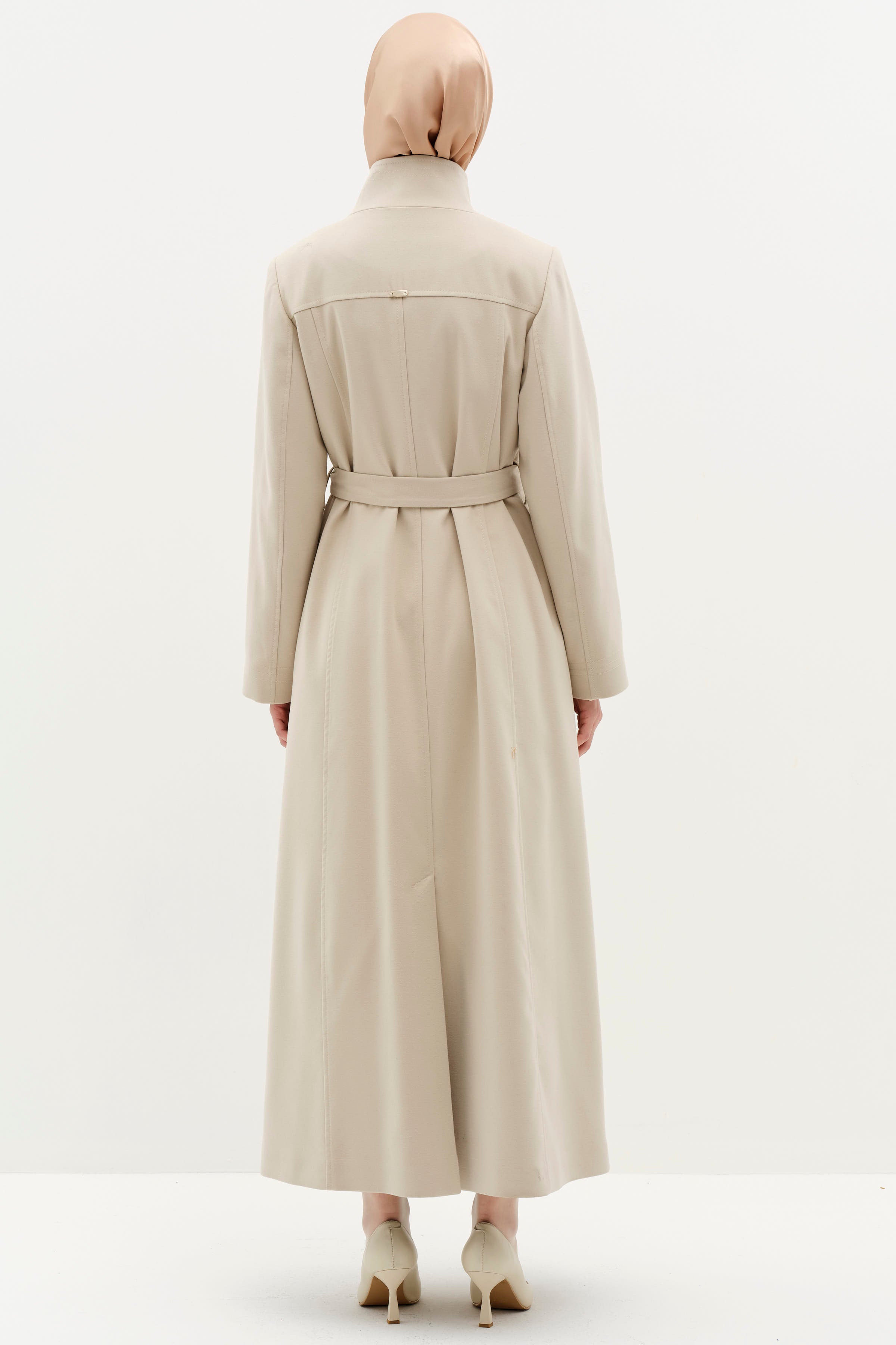 Ofreciendo una silueta elegante con su diseño de cuello alto y cintura con cinturón, este abrigo ofrece elegancia y funcionalidad a la vez. Su diseño, que enfatiza la cintura con un cinturón, resalta las líneas de tu cuerpo, mientras que su cuello alto añade un aire moderno y sofisticado.