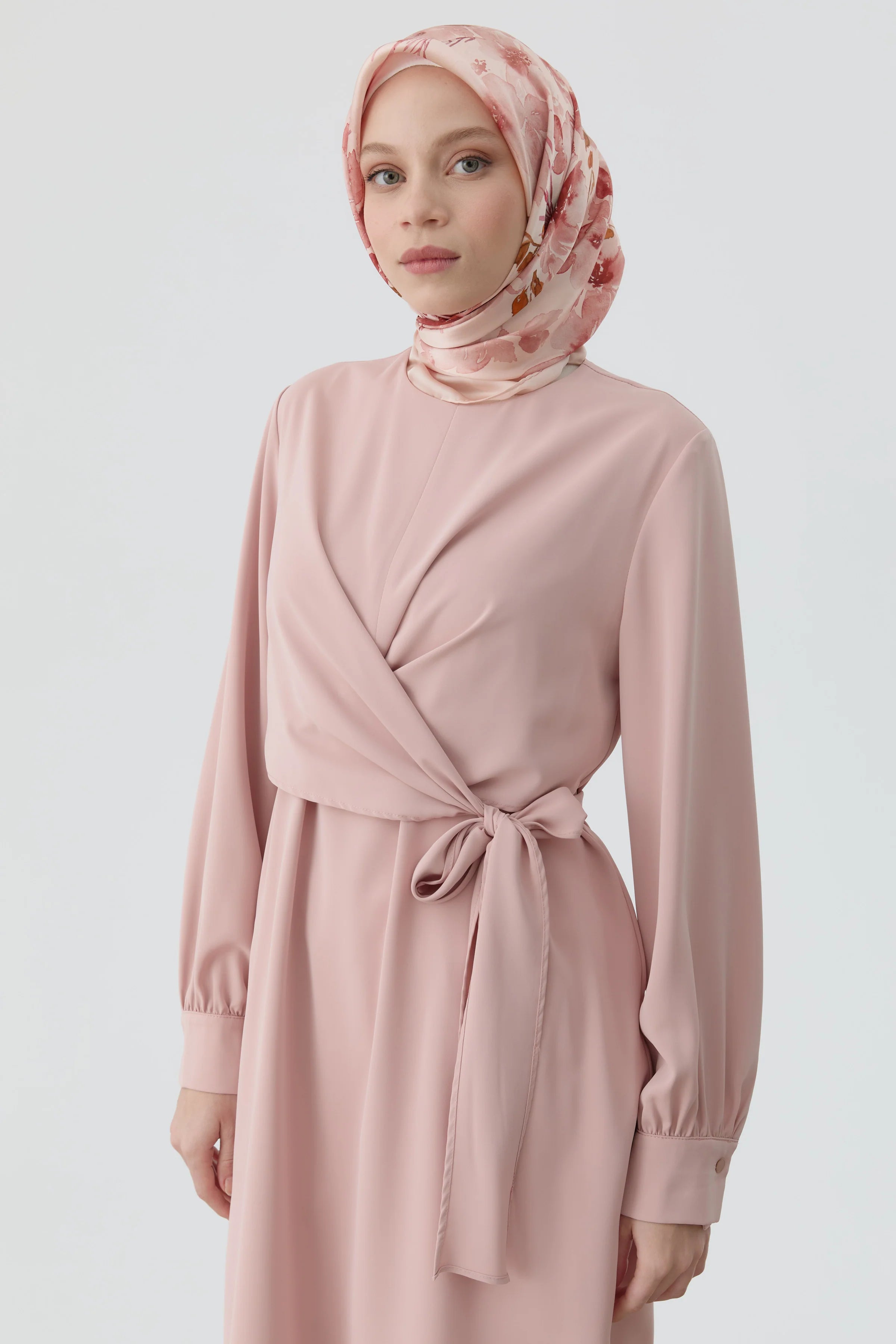 Esta túnica, que realza elegantemente la figura con su detalle de lazo en la cintura y su estructura drapeada, ofrece una presencia imponente a pesar de su apariencia minimalista.