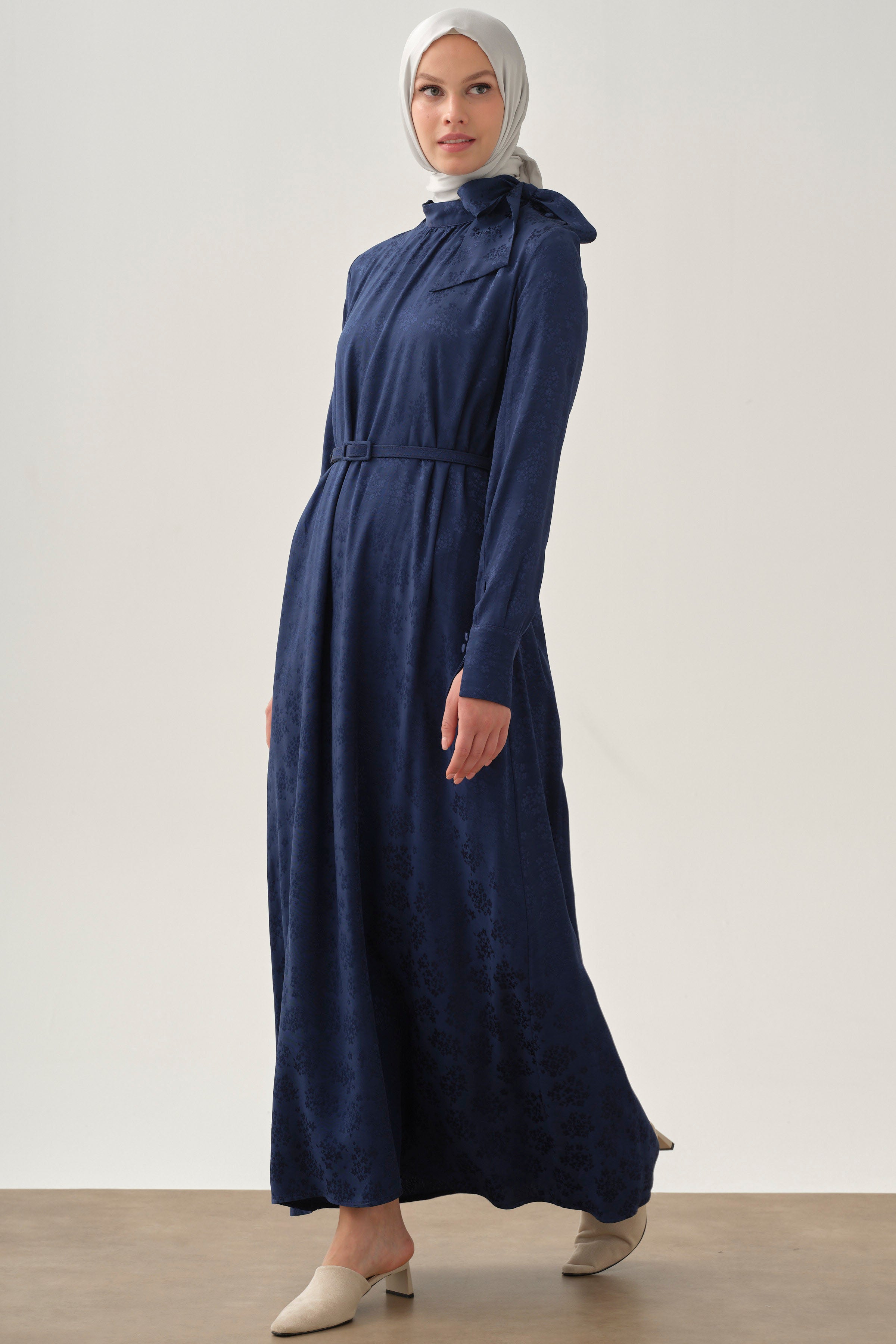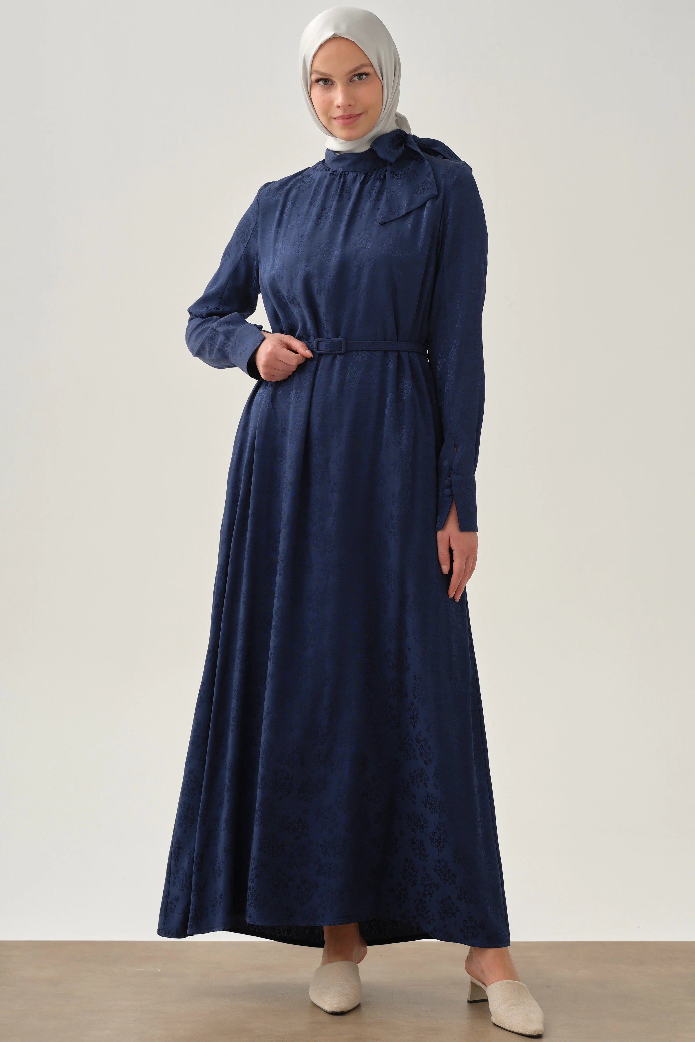 Con una elegante textura jacquard y un cinturón que realza la figura, este vestido ofrece un look chic y sofisticado para ocasiones especiales. Una pieza atemporal que destaca por su tejido texturizado.