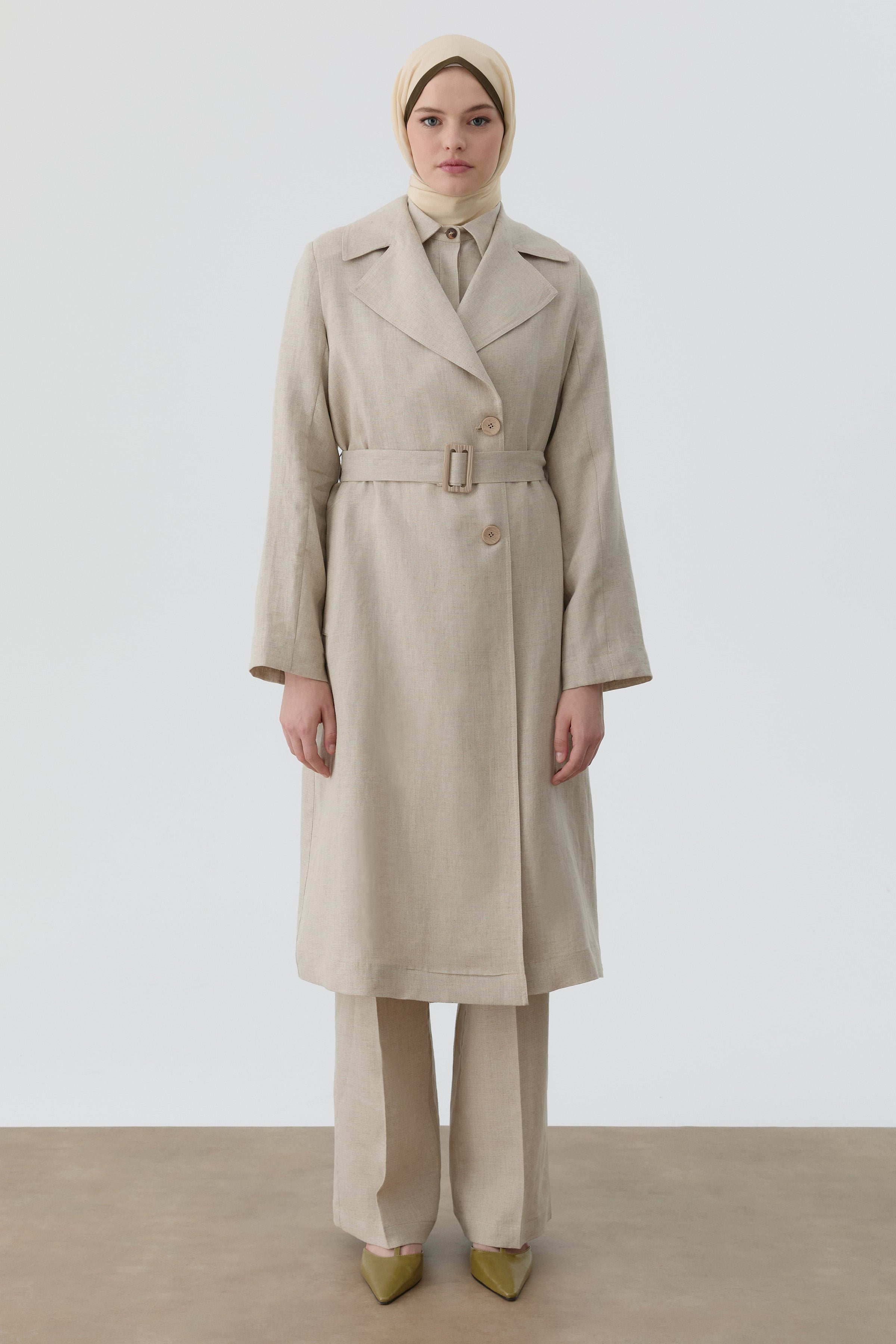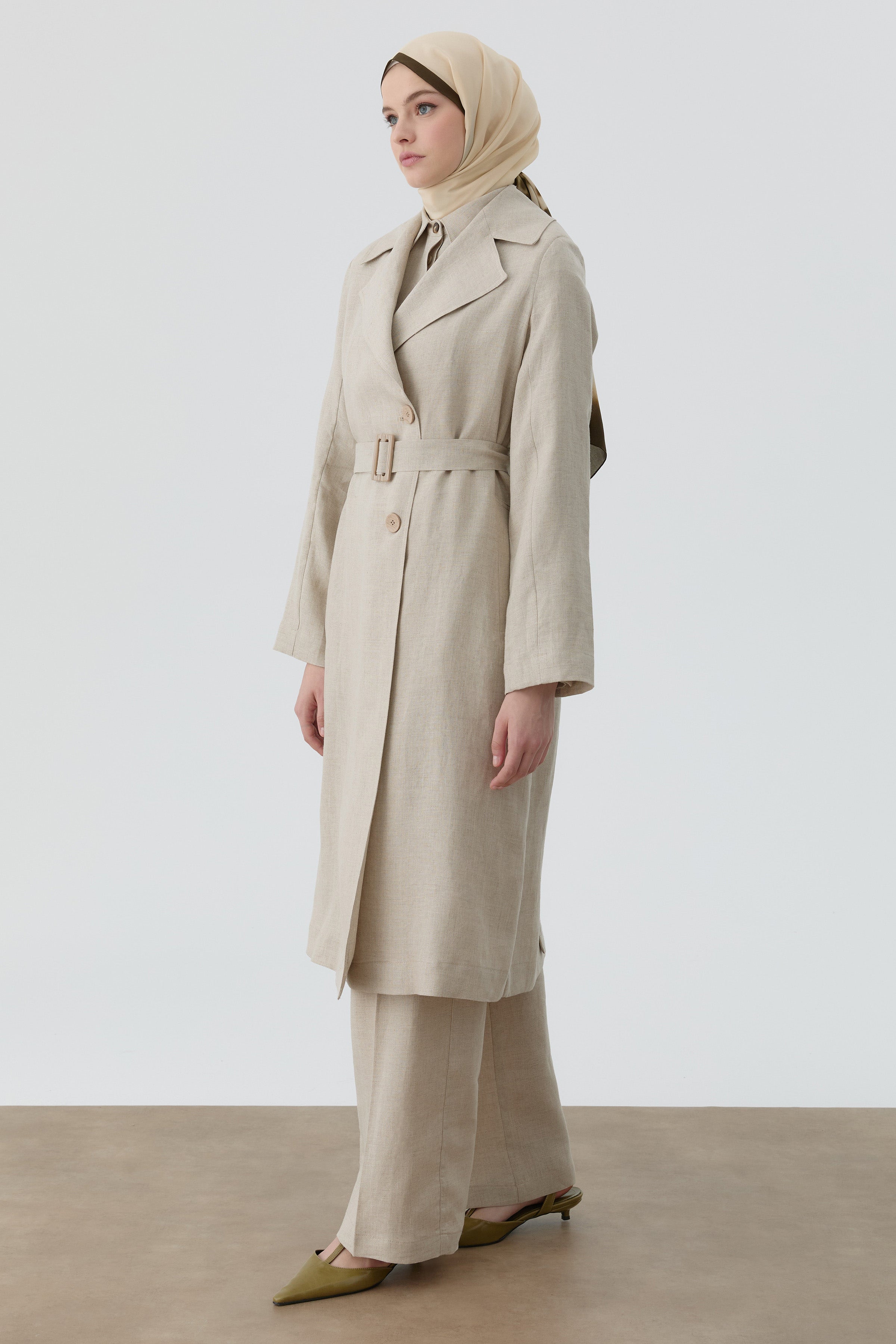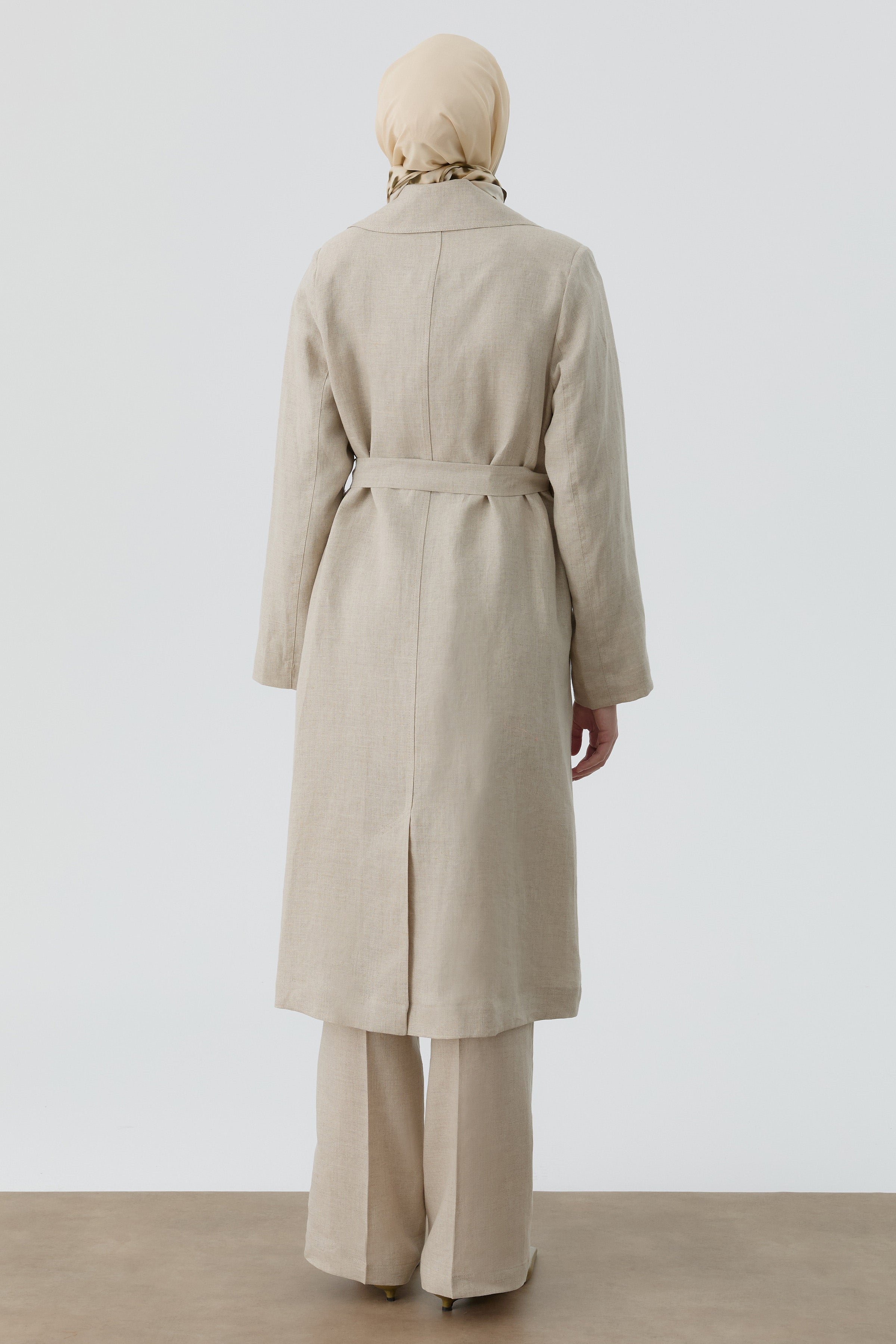 Este trench coat, confeccionado en lino transpirable, ofrece una alternativa ideal para las transiciones estacionales y realza elegantemente la silueta gracias a su cinturón en la cintura.