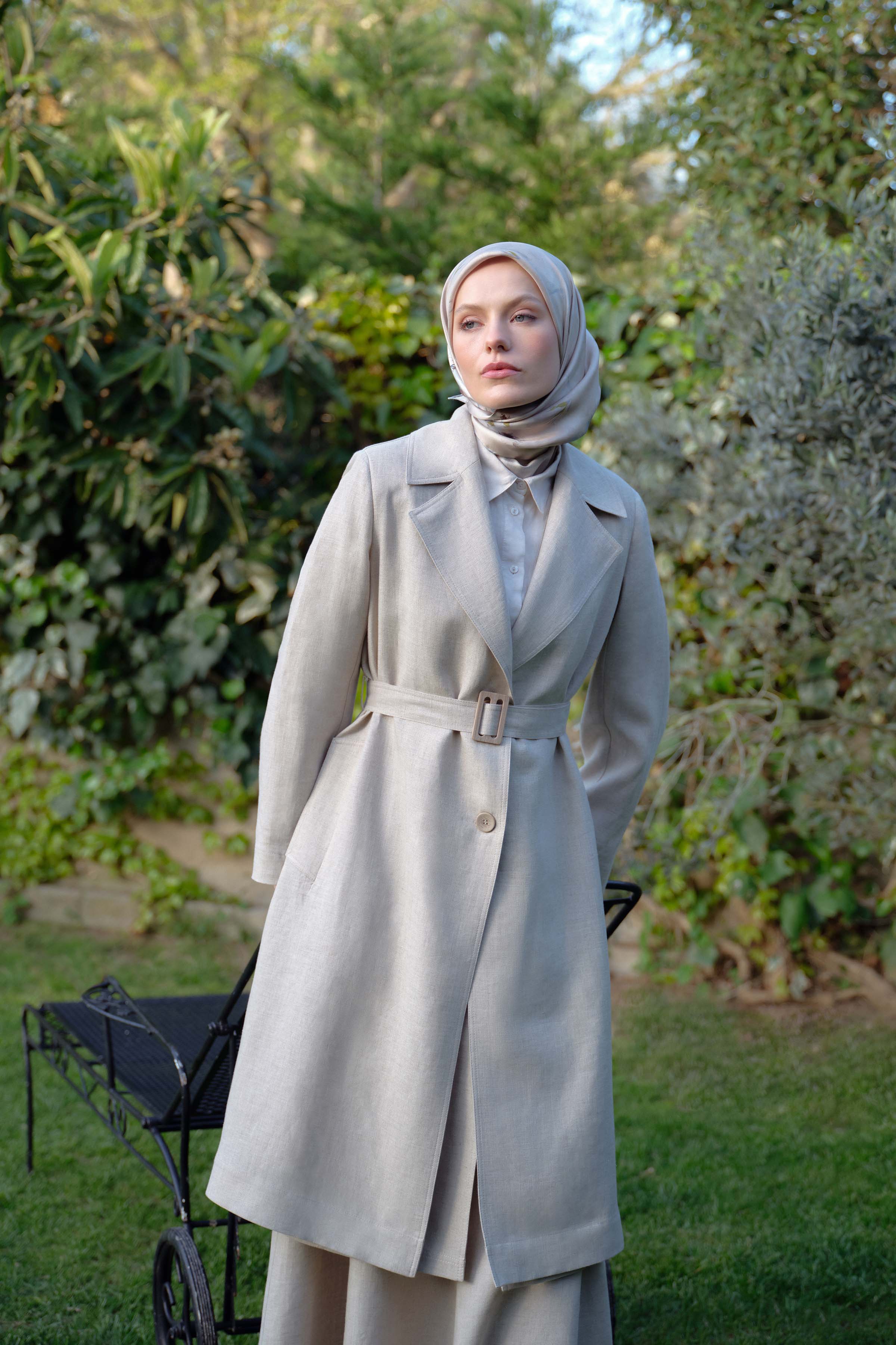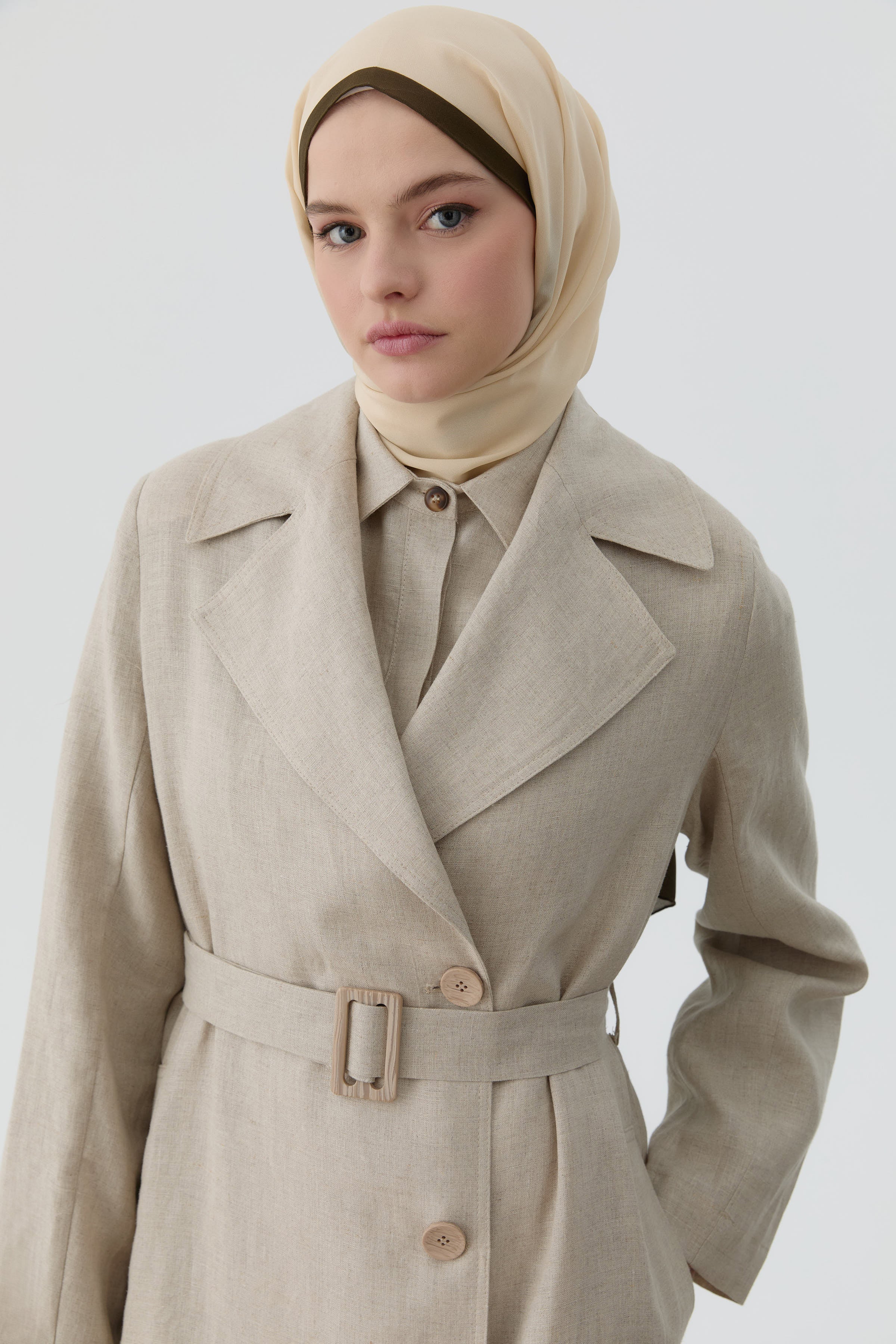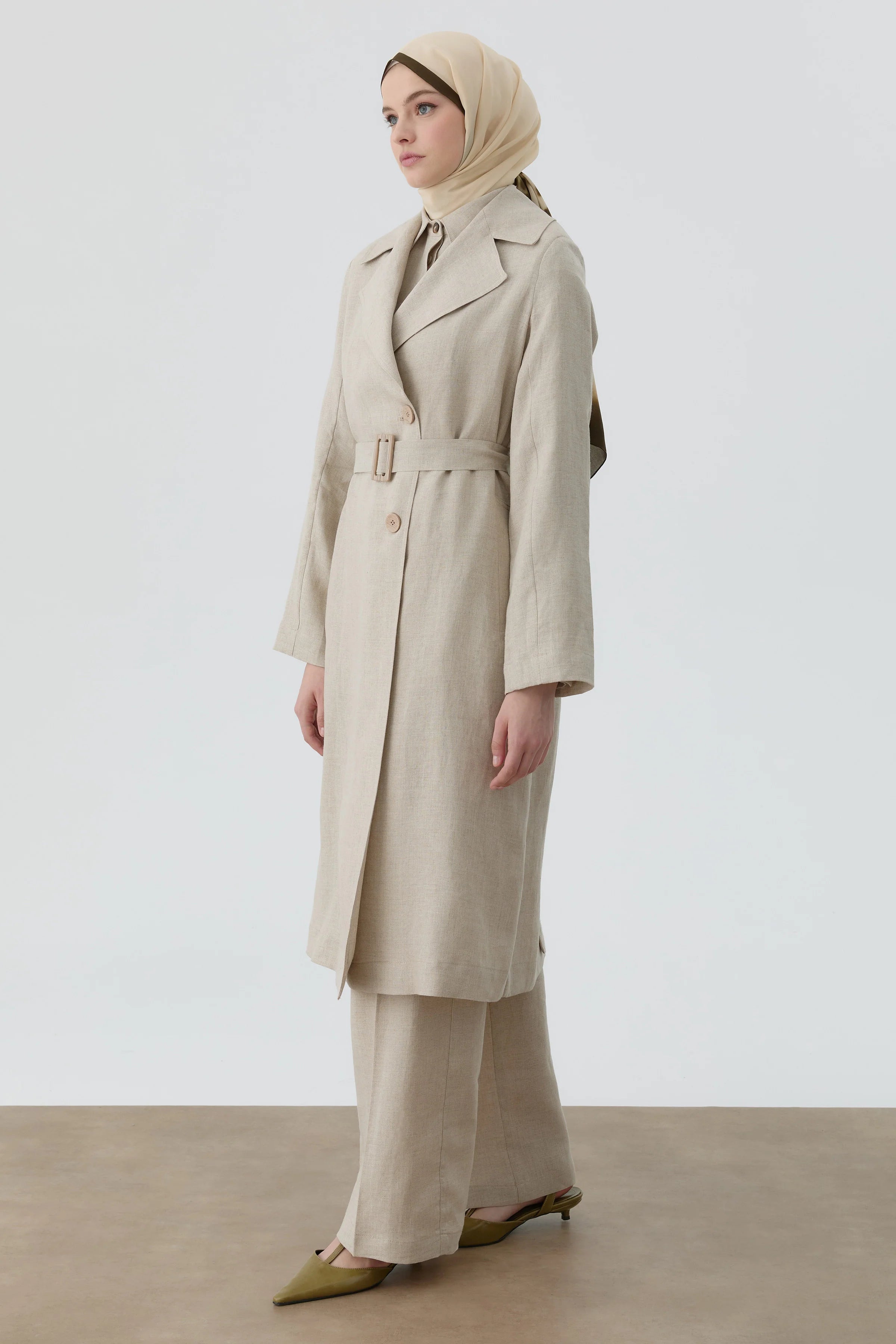 Este trench coat, confeccionado en lino transpirable, ofrece una alternativa ideal para las transiciones estacionales y realza elegantemente la silueta gracias a su cinturón en la cintura.