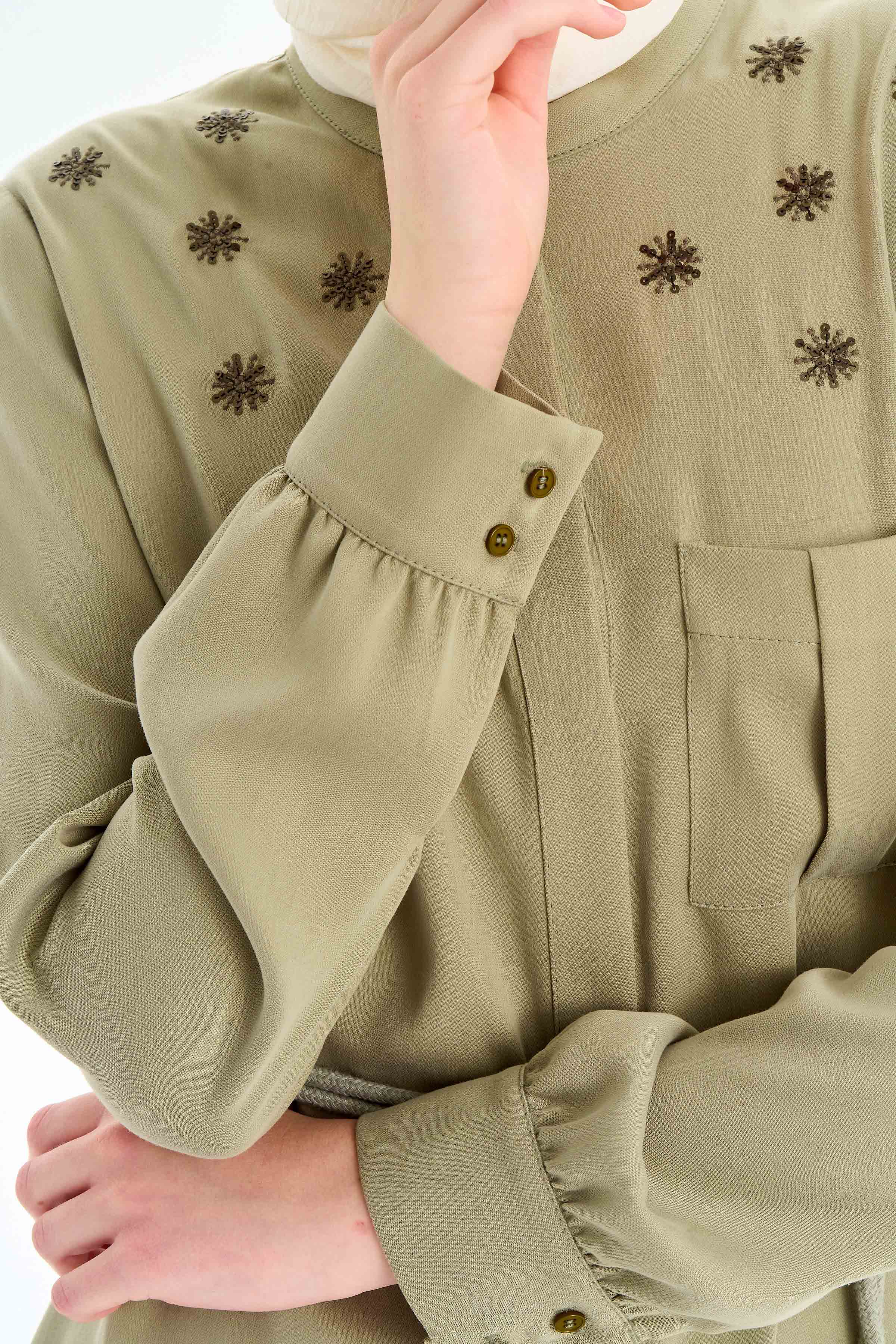 Esta túnica bordada con cinturón destaca por su elegante bordado y el sofisticado detalle del cinturón. Confeccionada con tela de alta calidad y una meticulosa elaboración, esta túnica crea una silueta ajustada al cuerpo gracias al cinturón en la cintura.