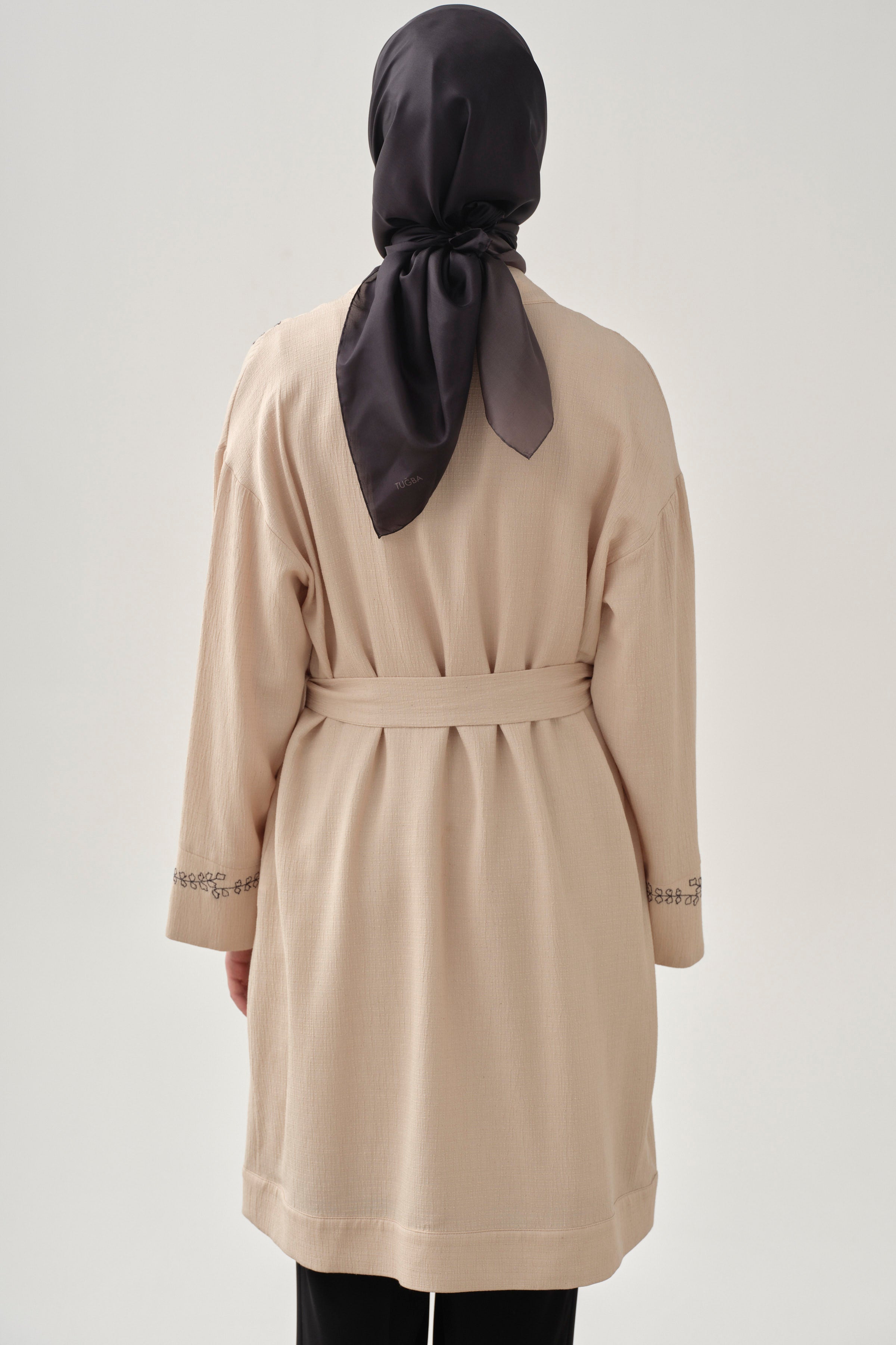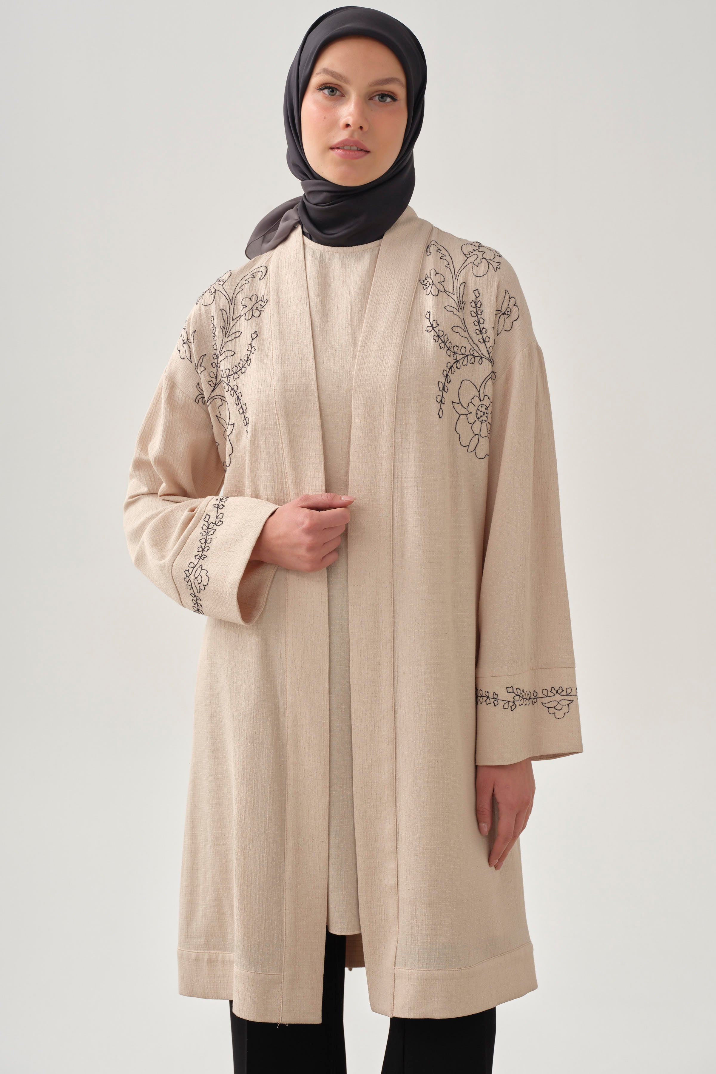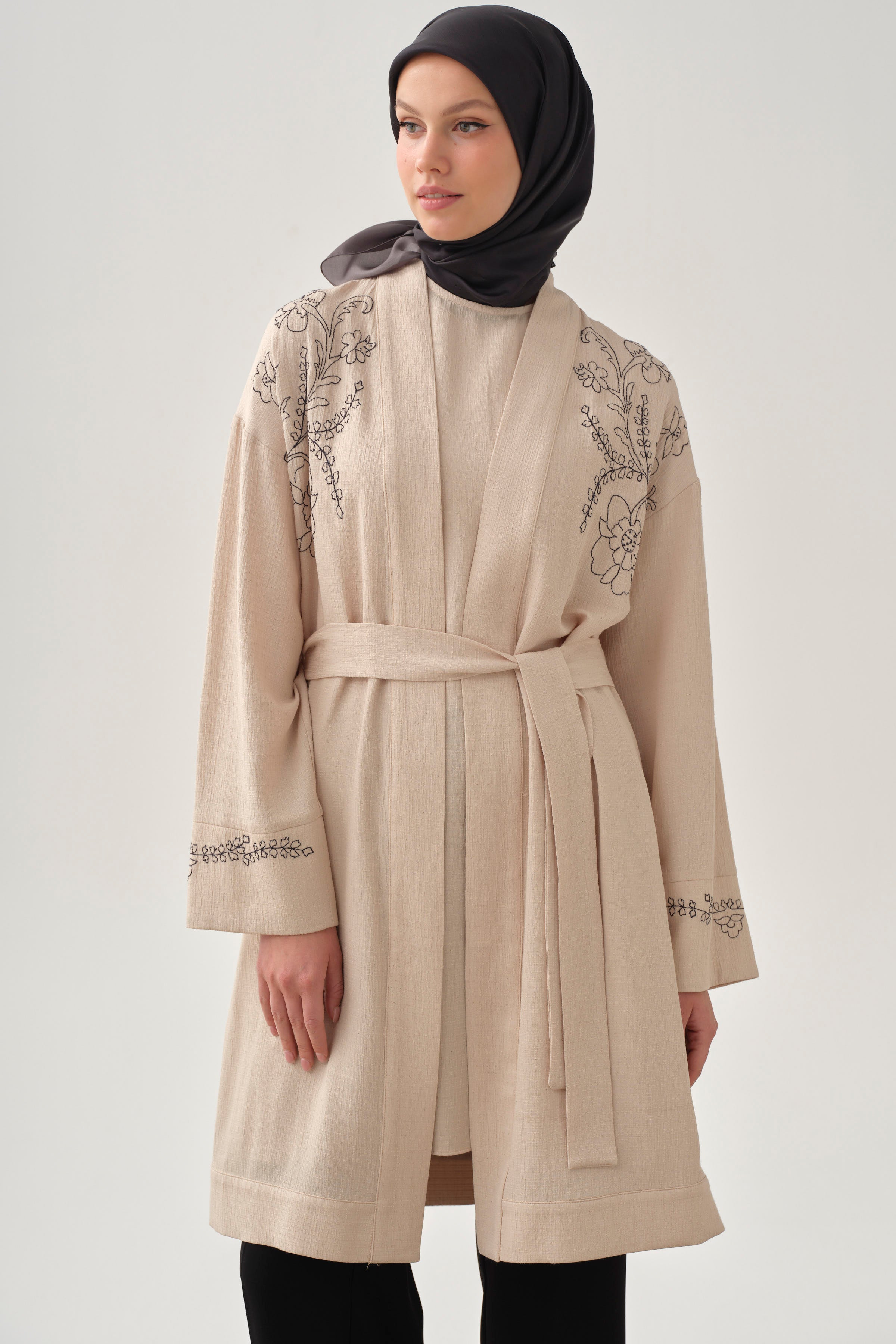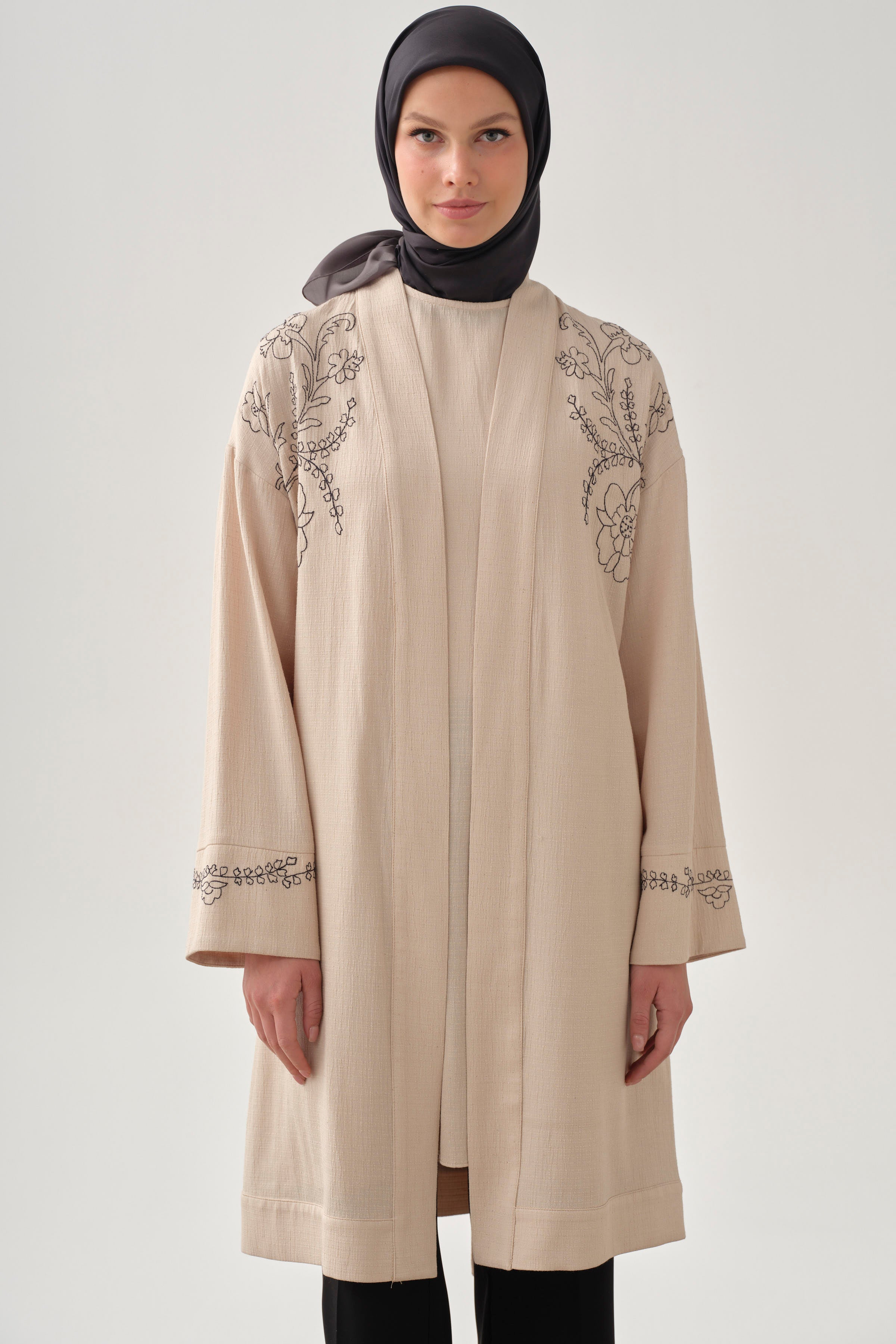 Este conjunto de chaqueta y blusa, adornado con delicados bordados, cautiva por su elegancia. Su corte armonioso crea un look sofisticado y natural. Es la opción ideal tanto para ocasiones especiales como para lucir elegante a diario.