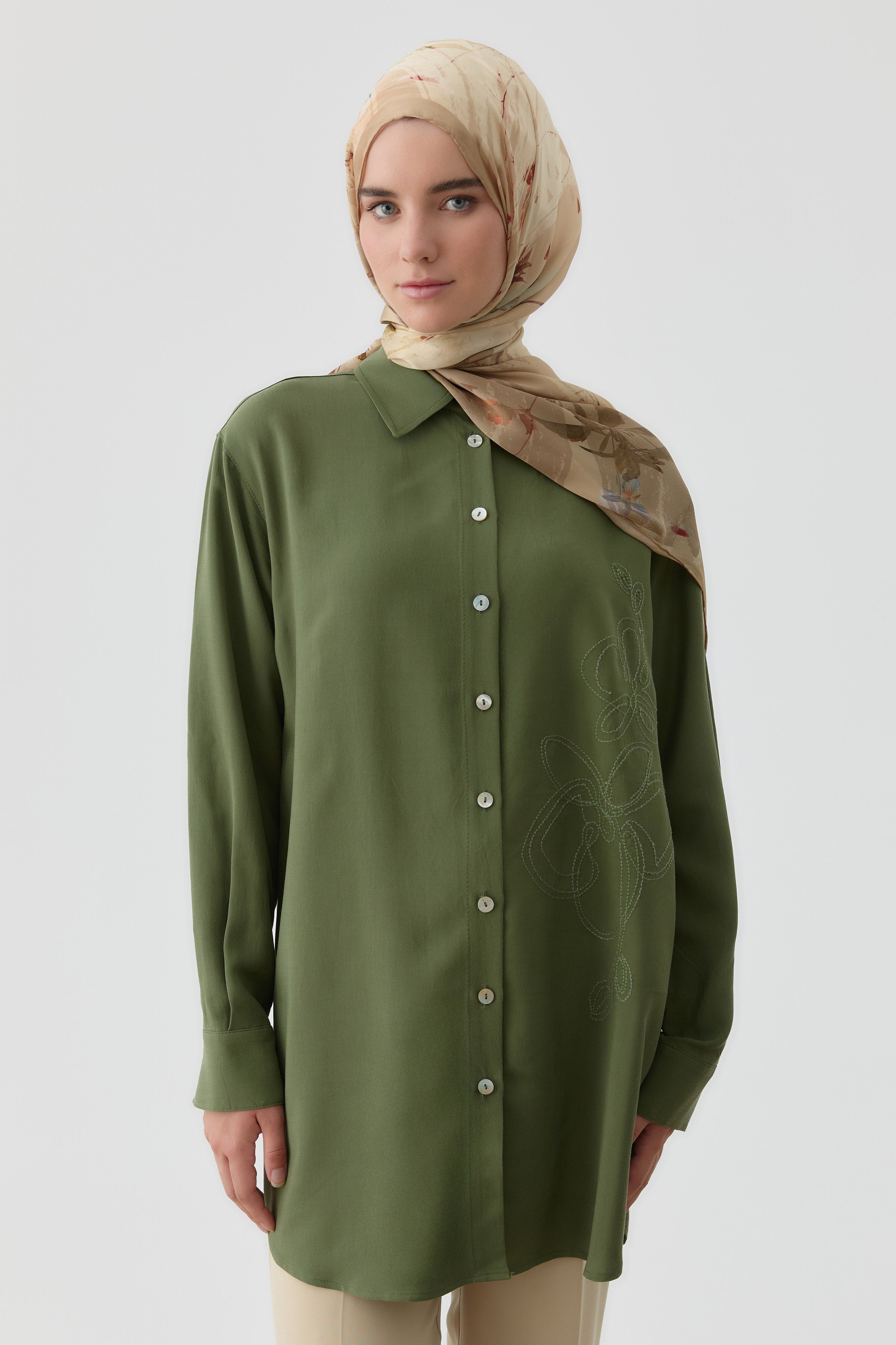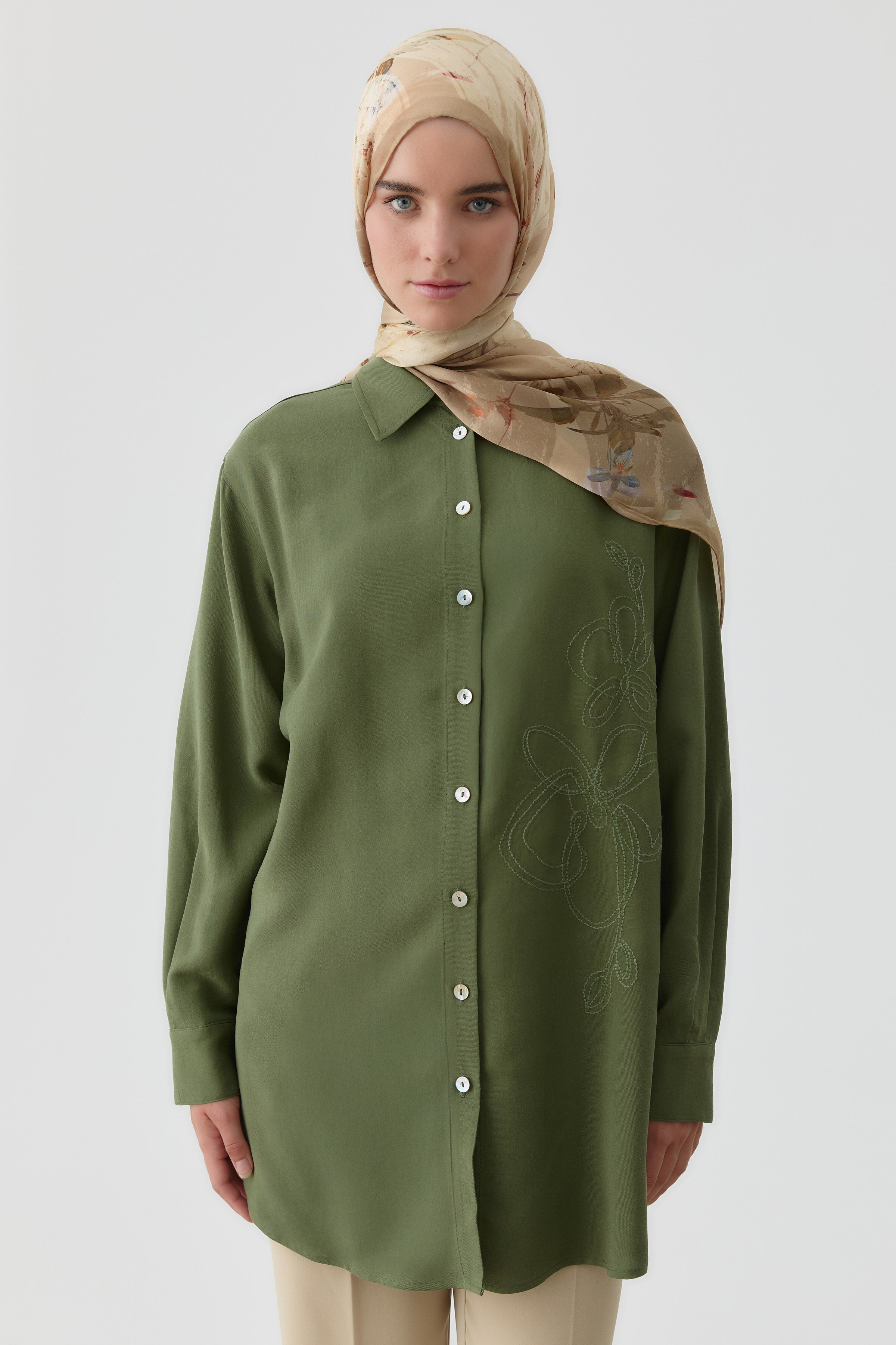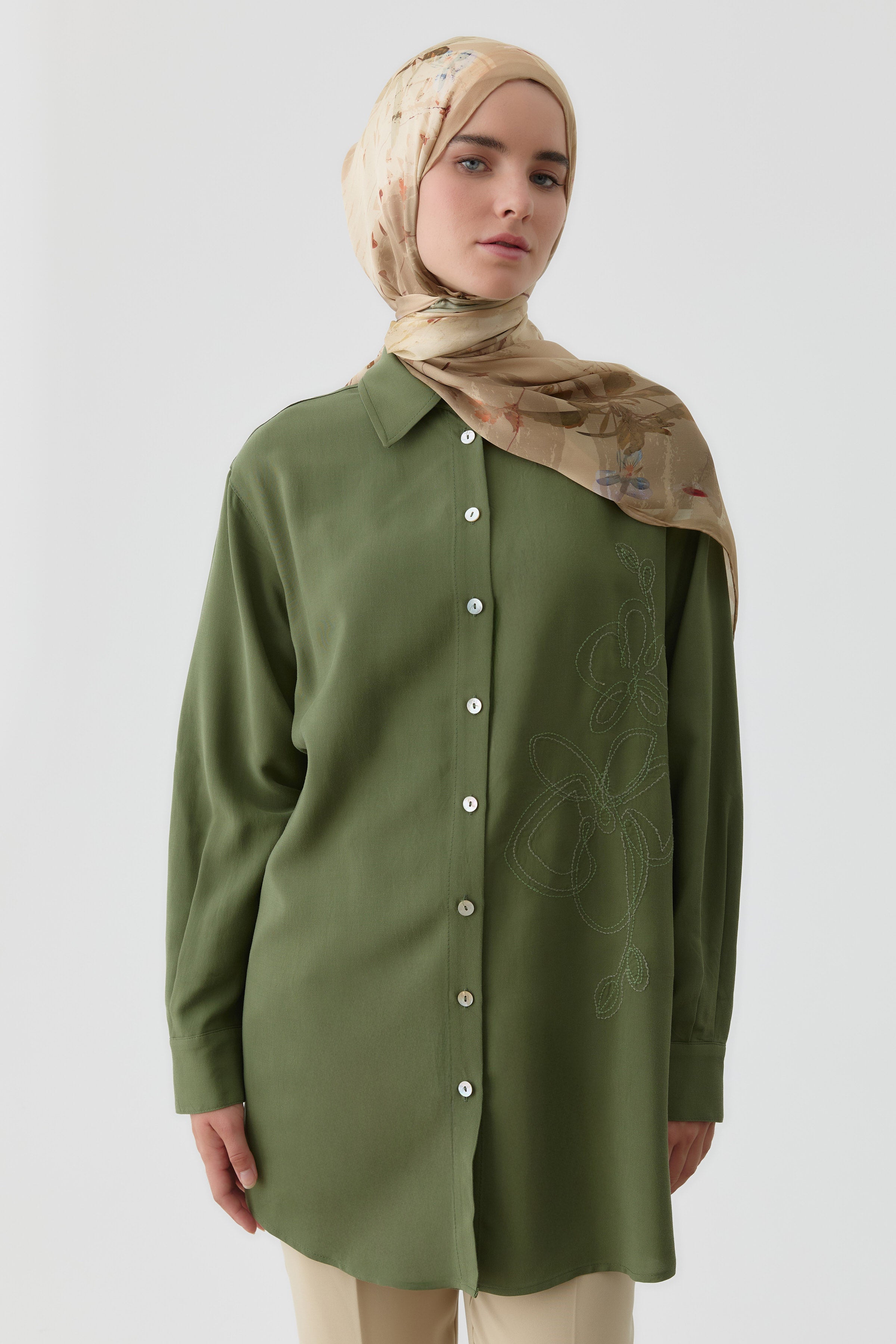 Si bien ofrece comodidad durante todo el día gracias a su tejido de textura suave y su corte informal, añade un toque artístico a la elegancia sencilla con sus detalles de bordado cuidadosamente elaborados.