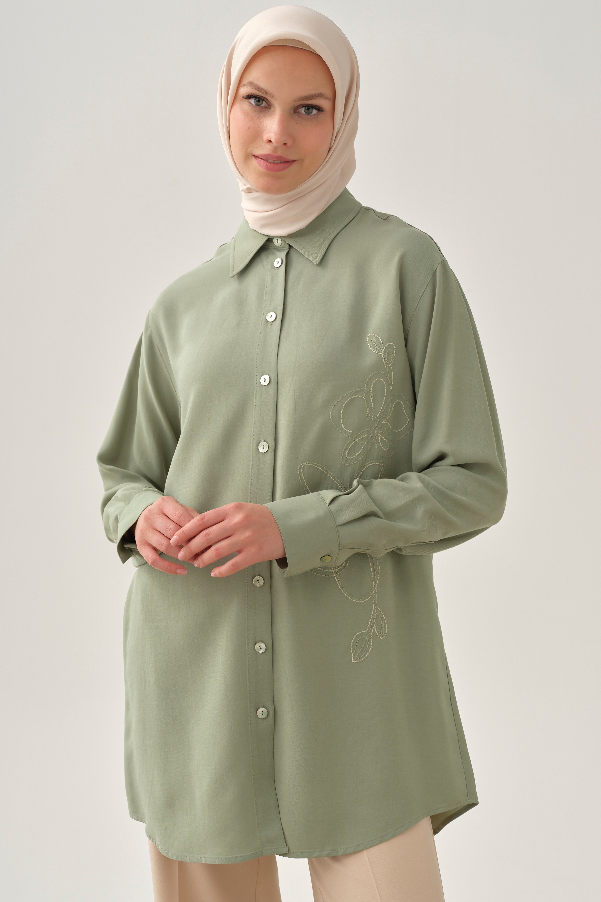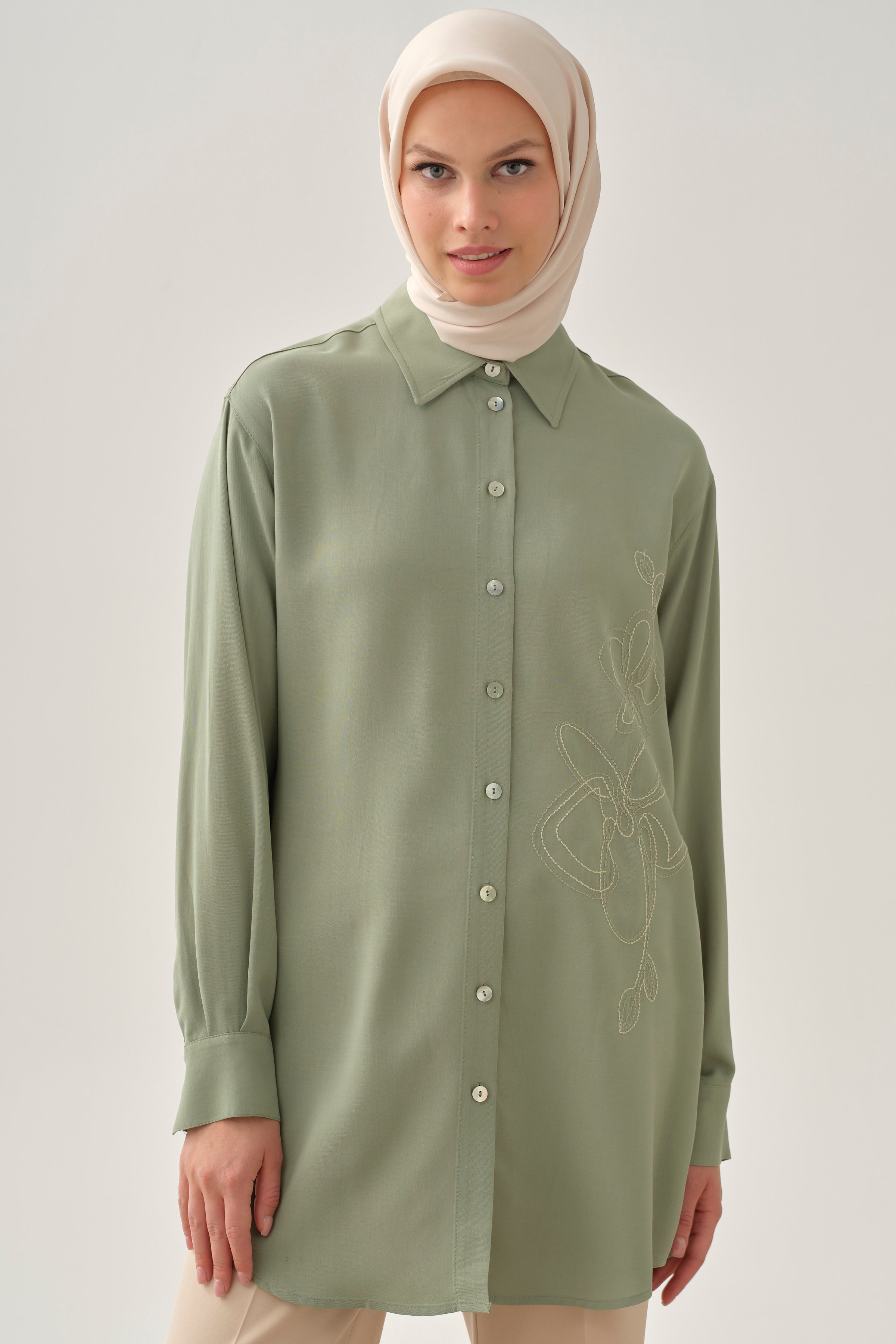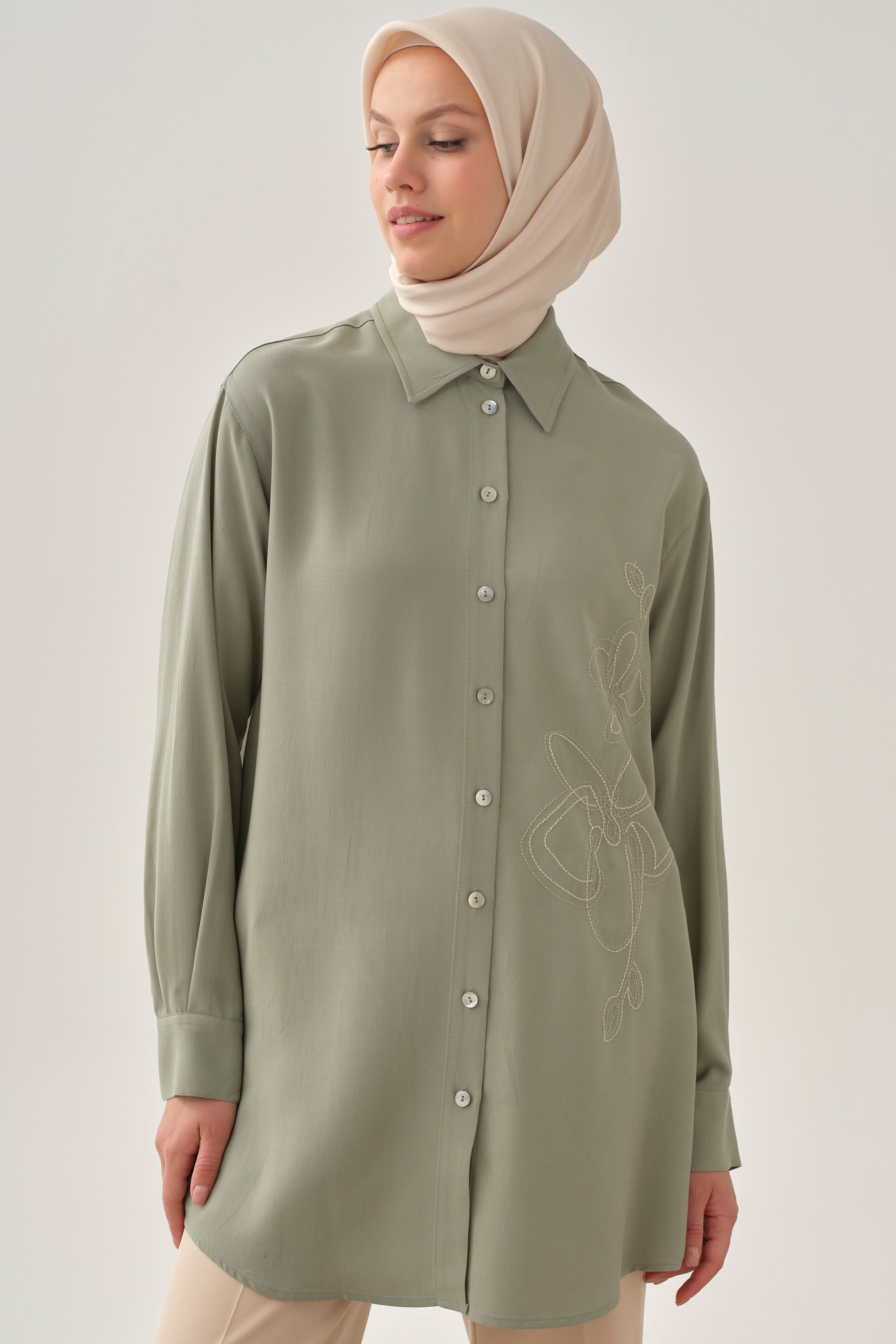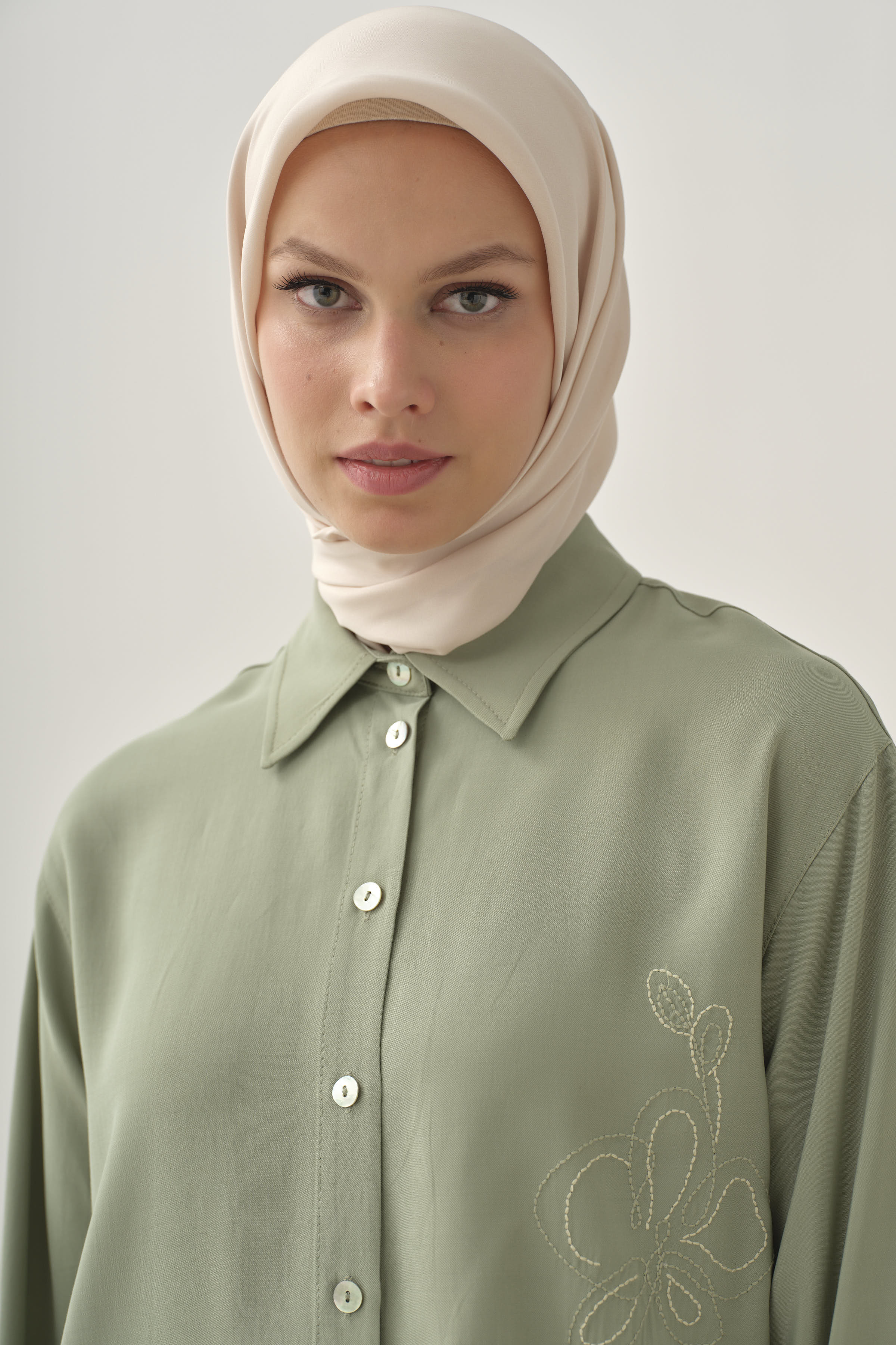 Si bien ofrece comodidad durante todo el día gracias a su tejido de textura suave y su corte informal, añade un toque artístico a la elegancia sencilla con sus detalles de bordado cuidadosamente elaborados.