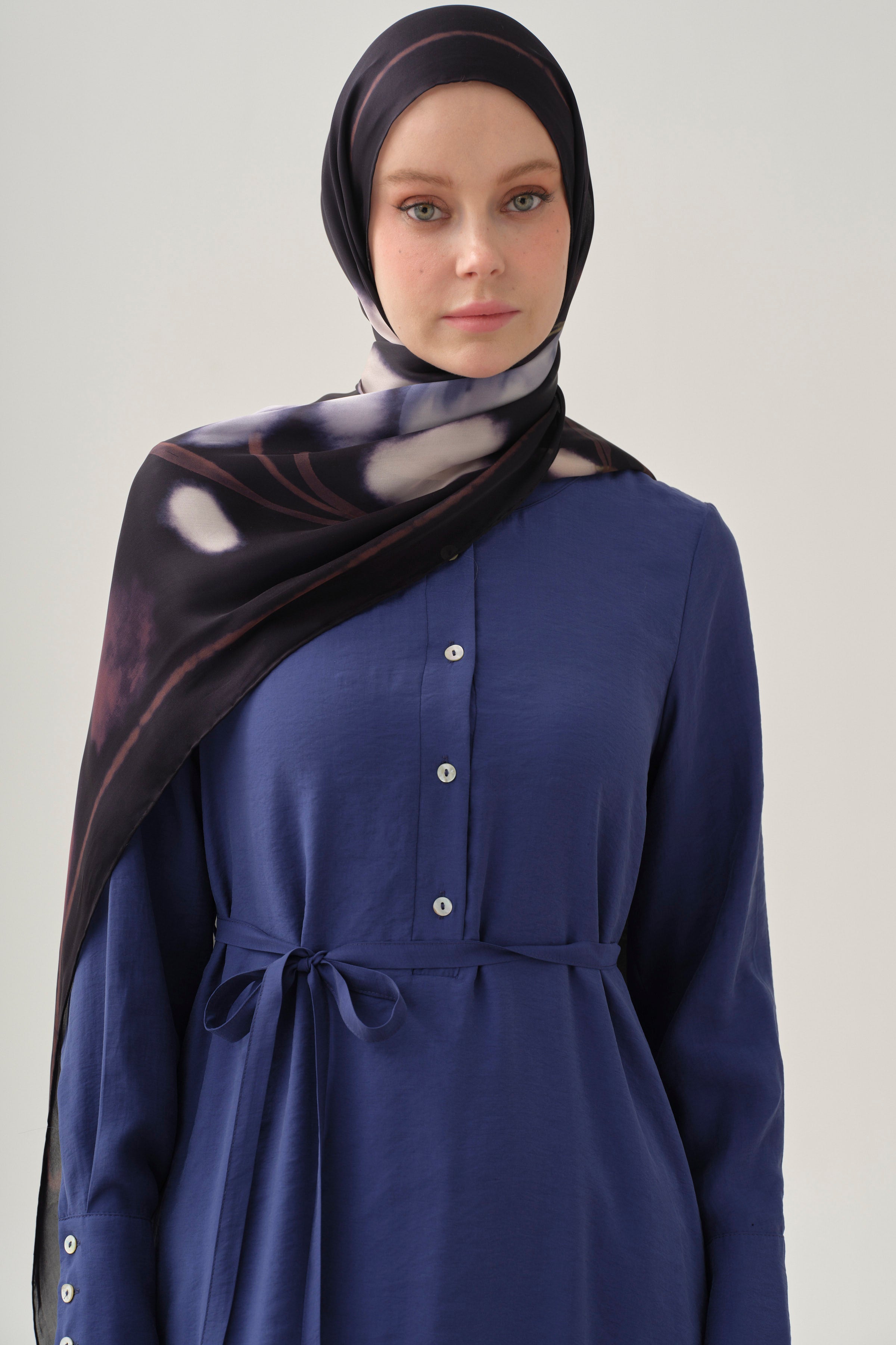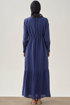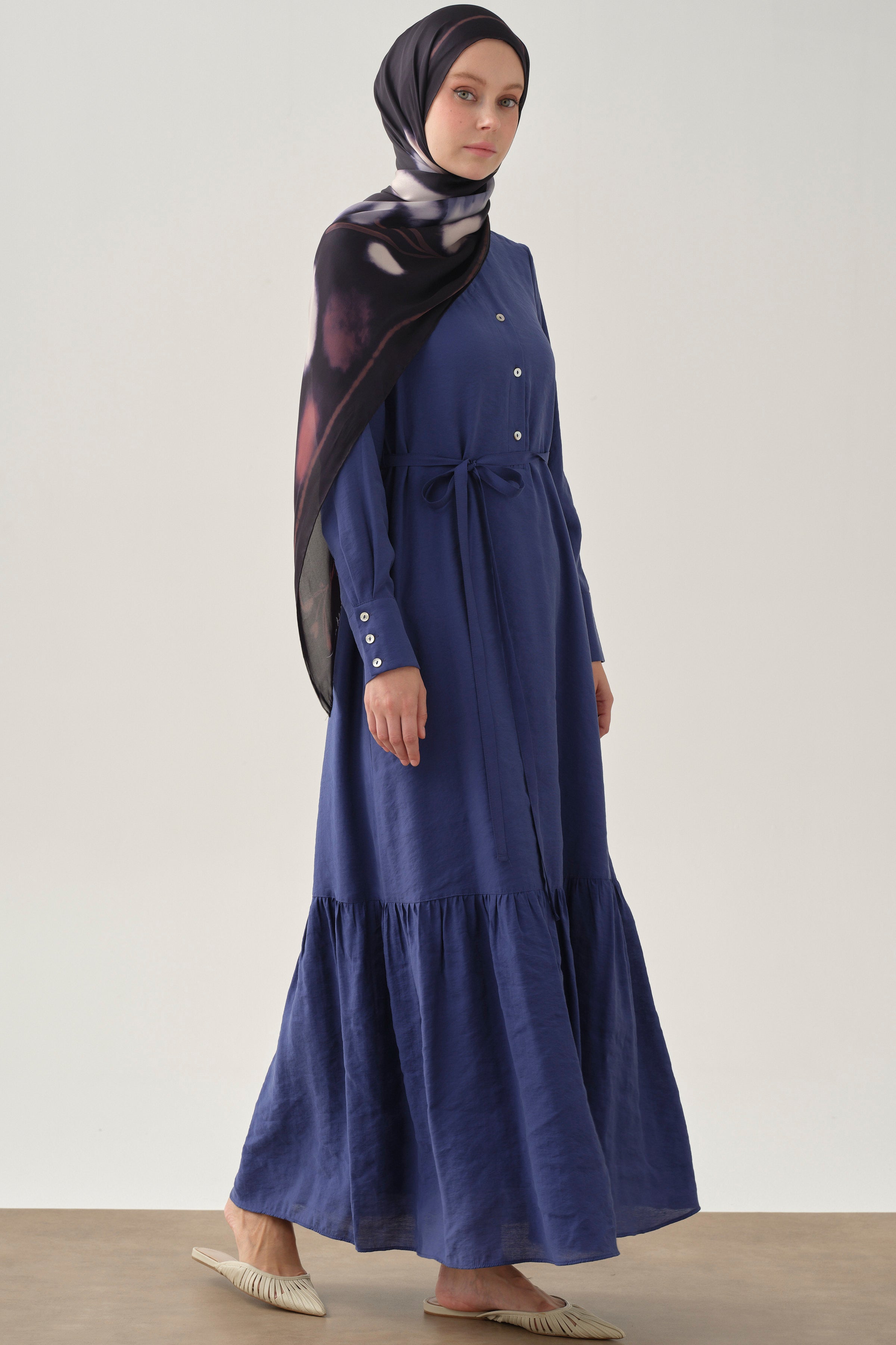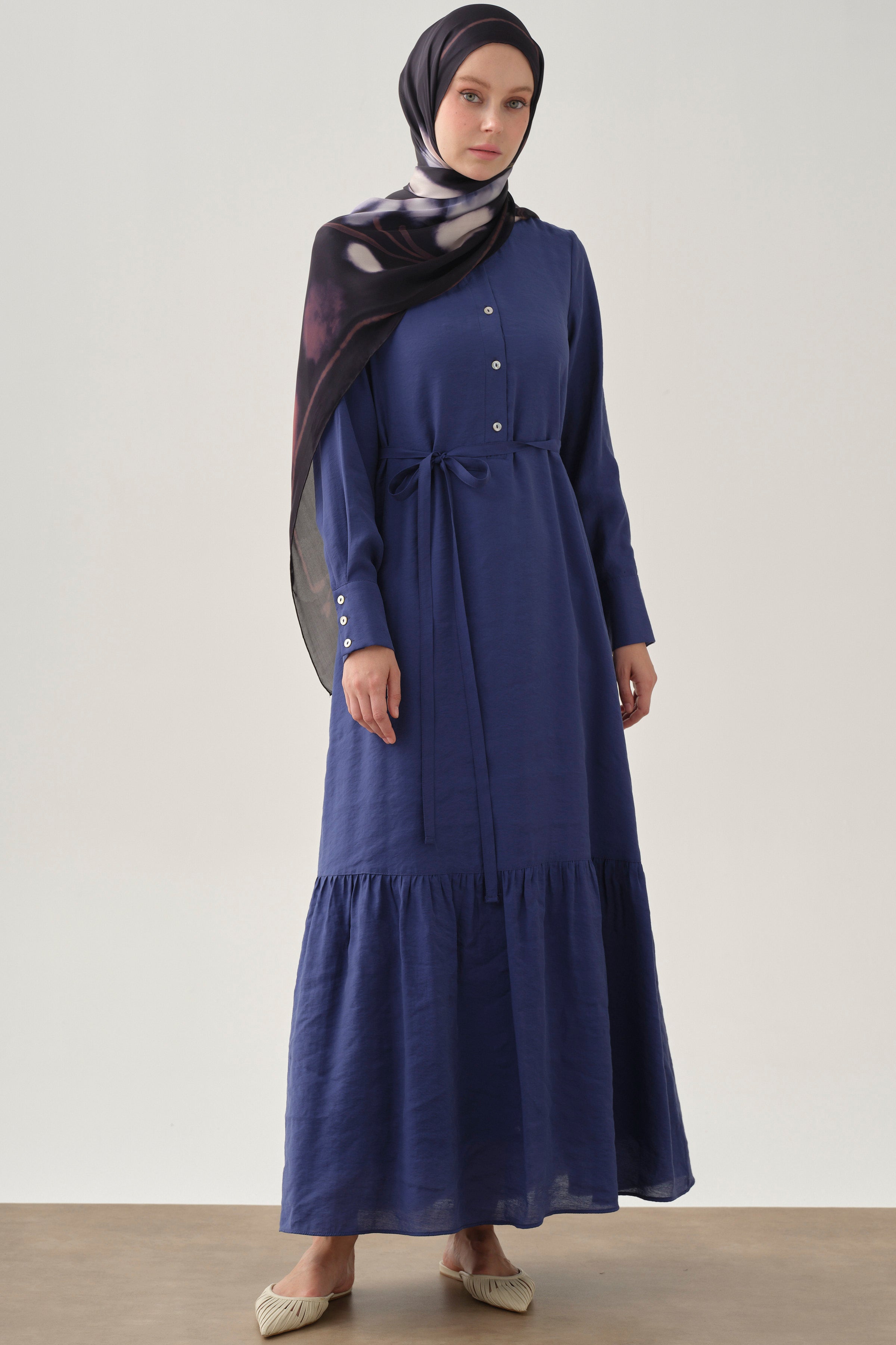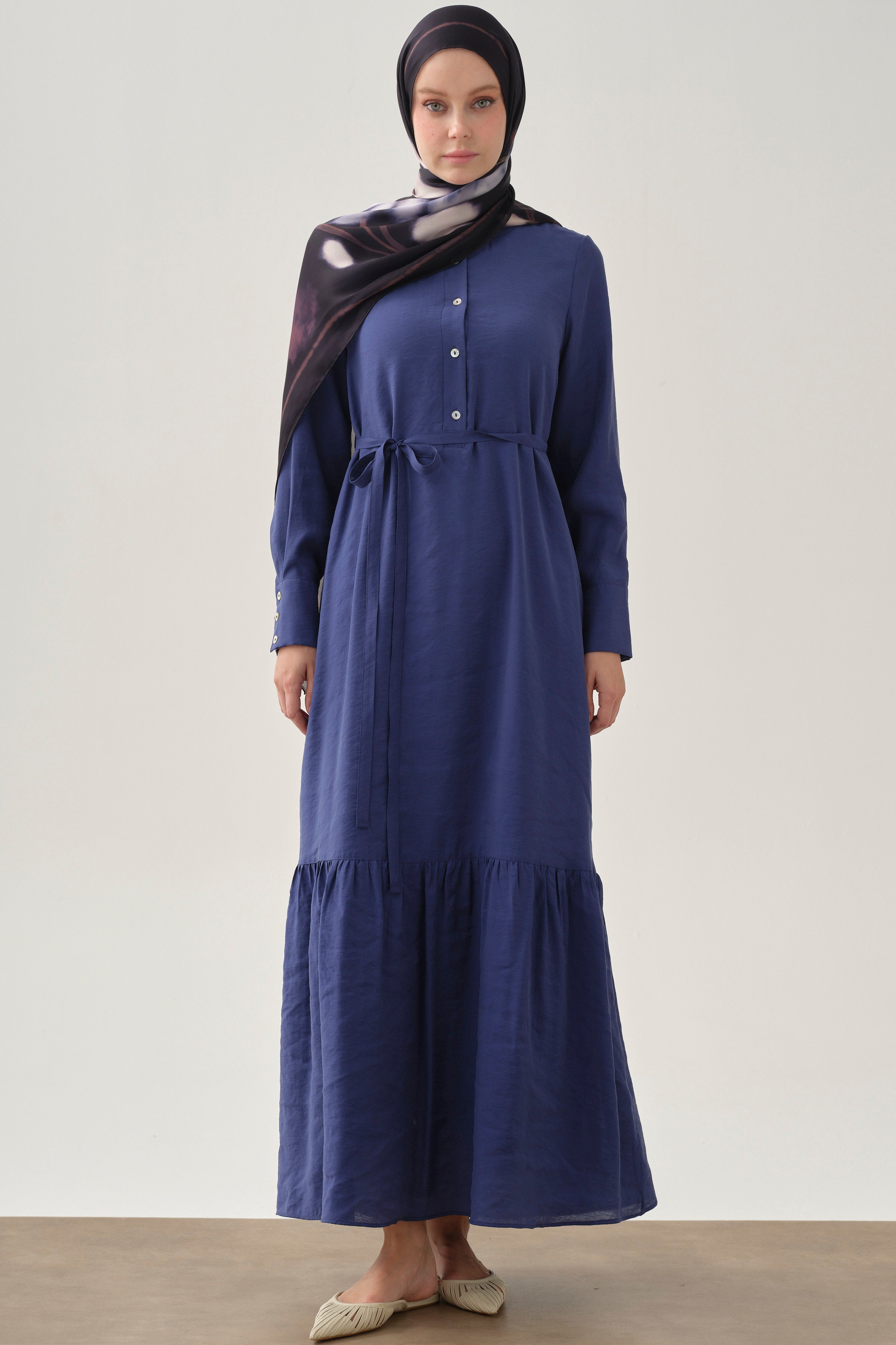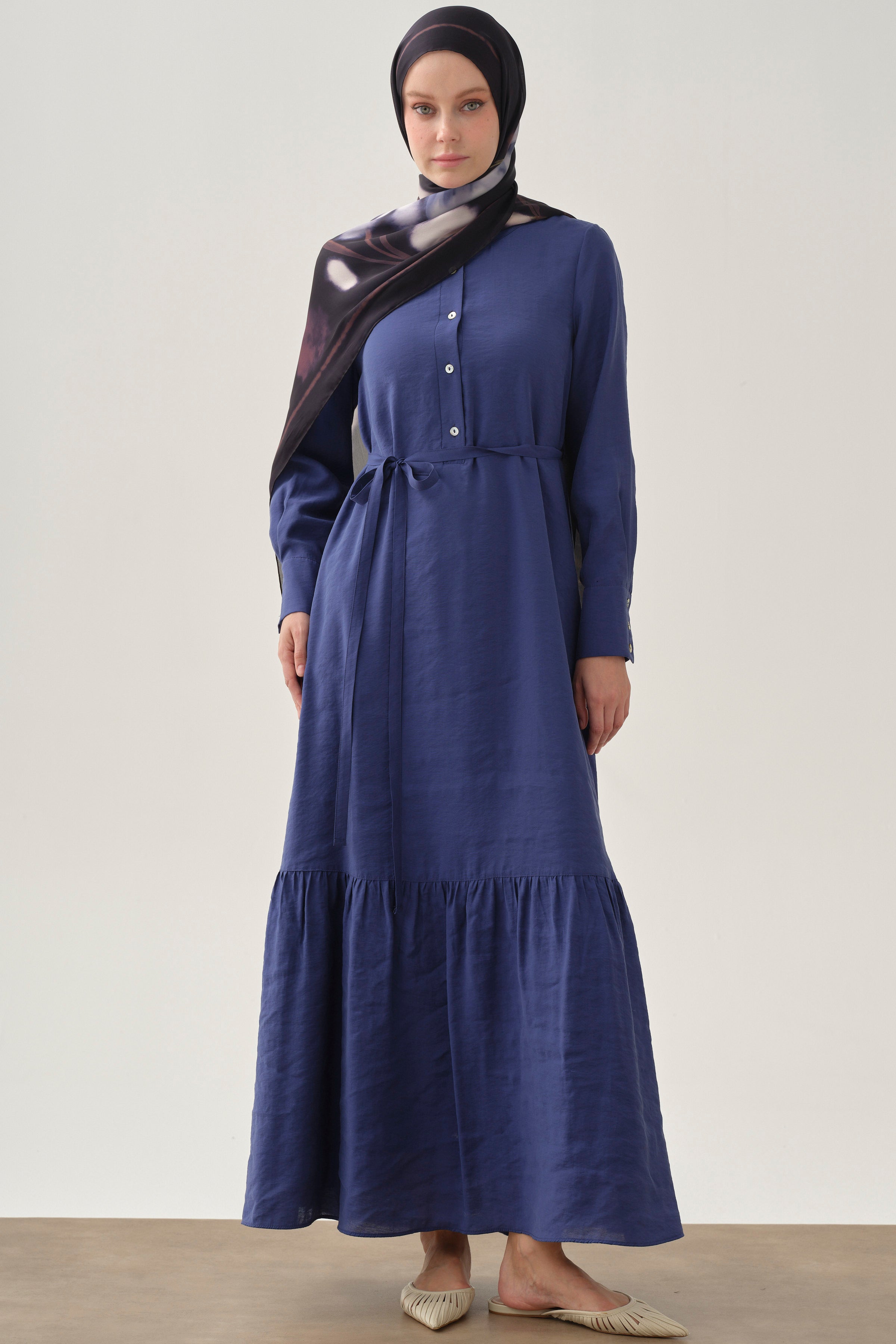 Una silueta femenina realzada por detalles elegantes: el vestido con media tapeta y falda fruncida ofrece una opción elegante y cómoda para acompañarte en cada momento del día.
